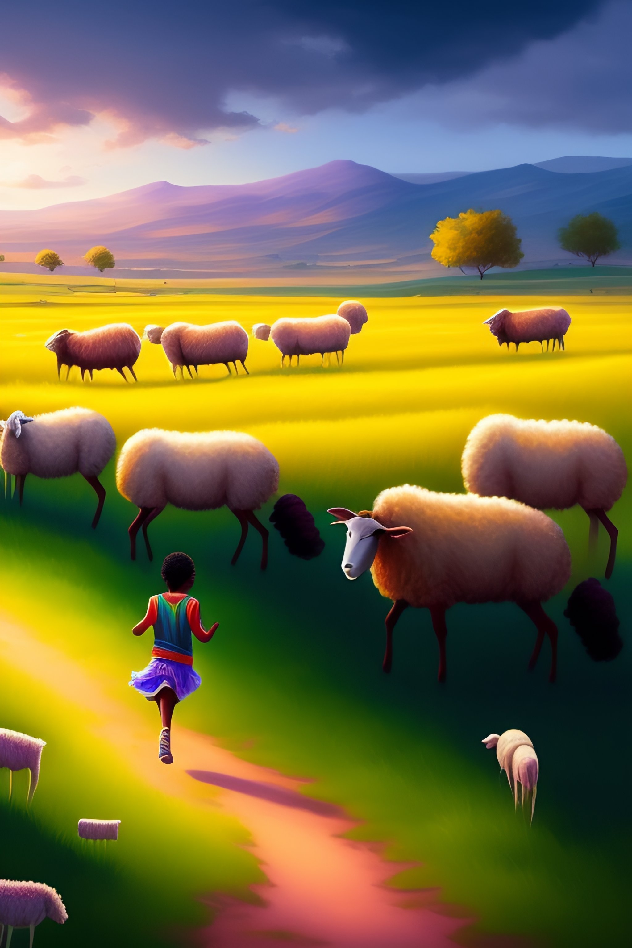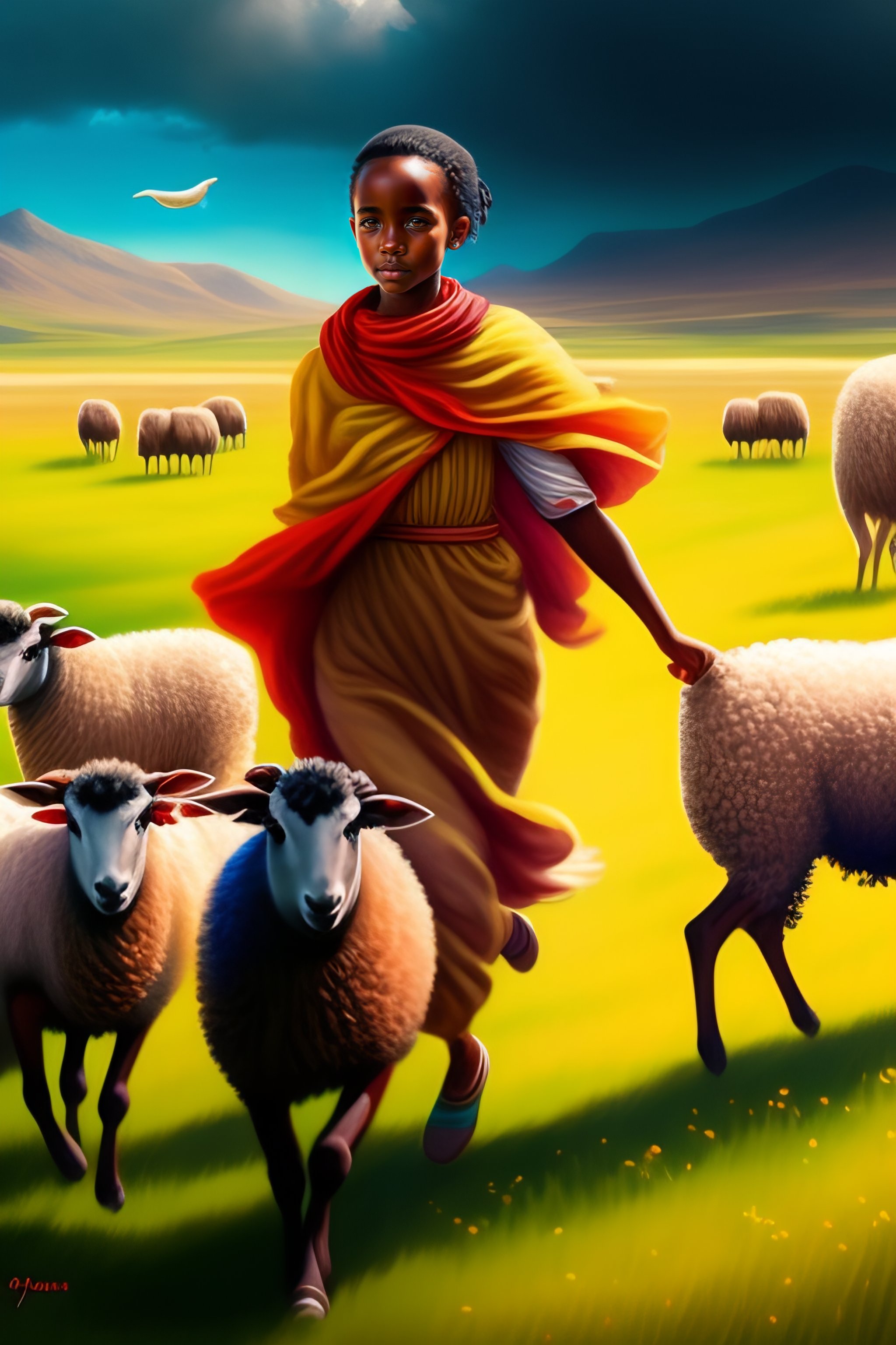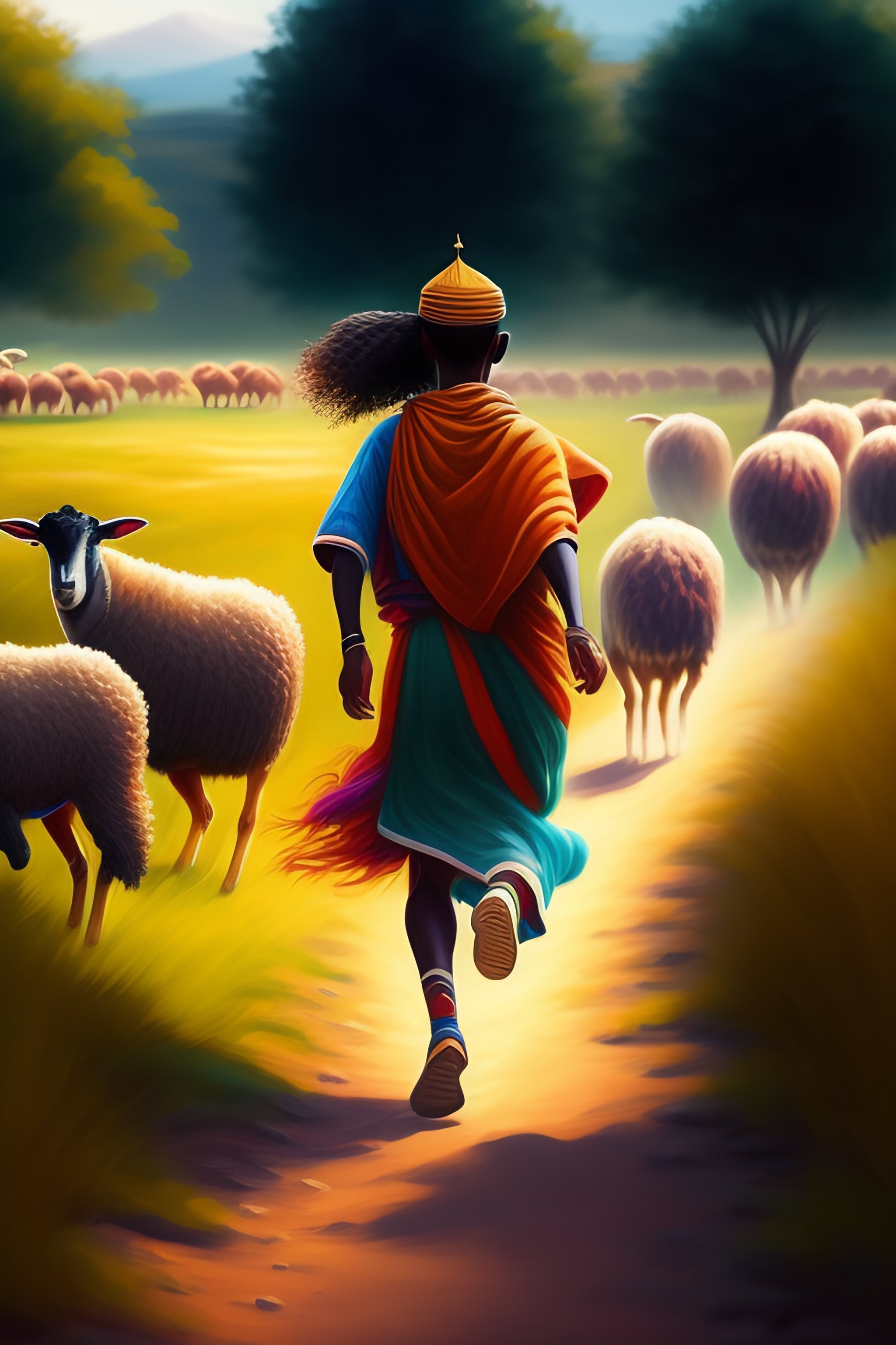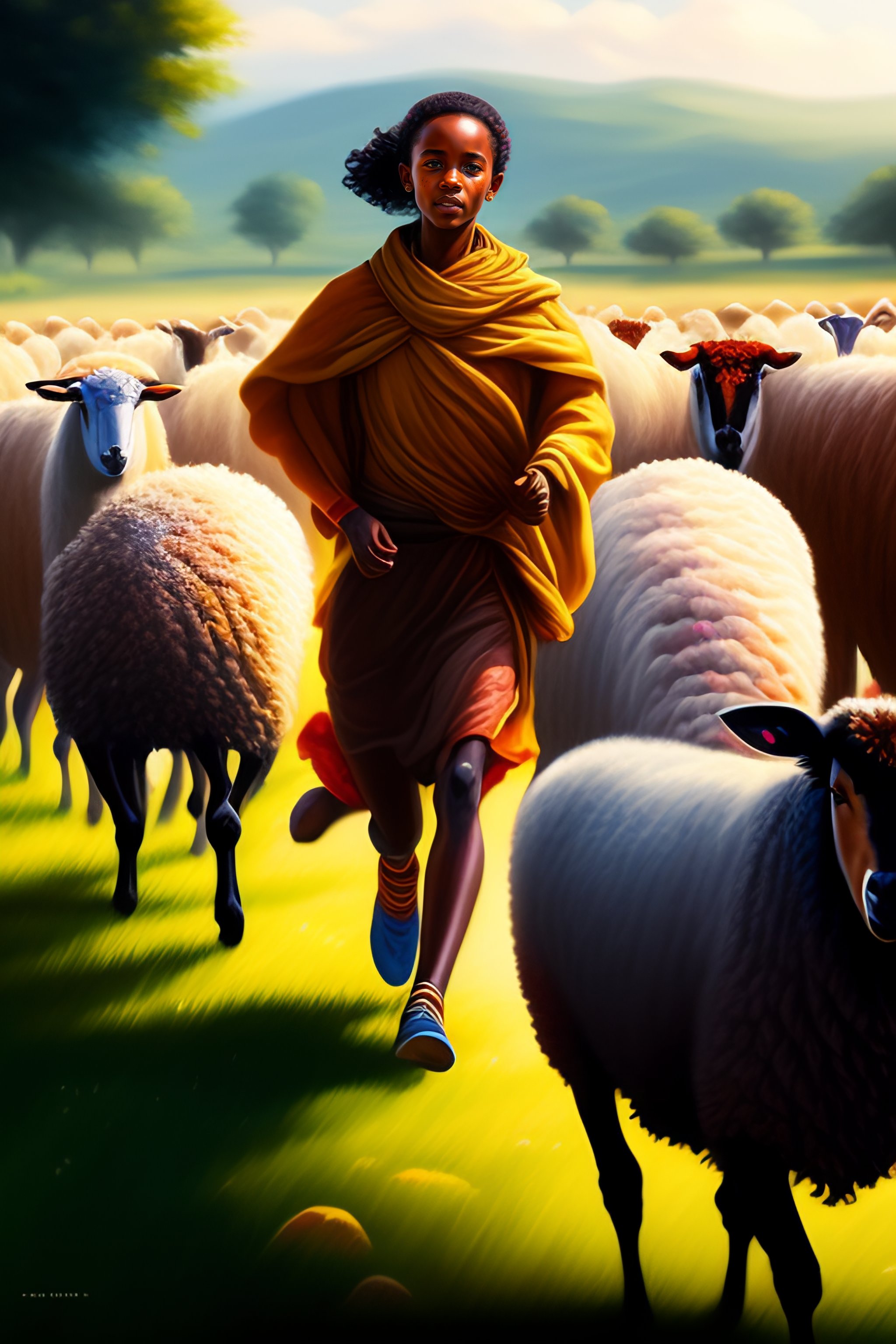 Young ethiopian shepard running with group of sheep, grazing fields, summer camp, highly detailed, artstation, digital painting, vibrant colors, by alena aleani