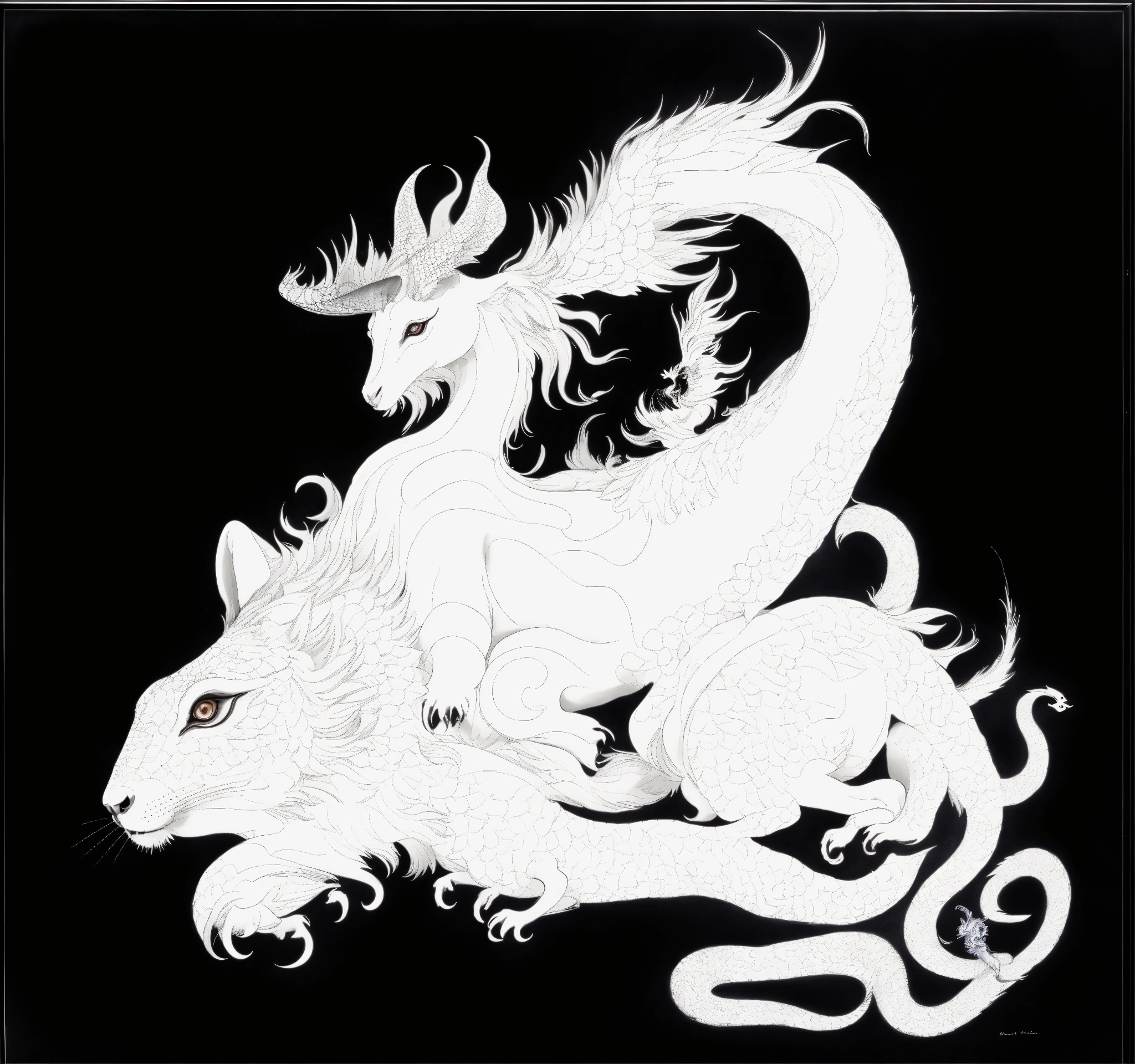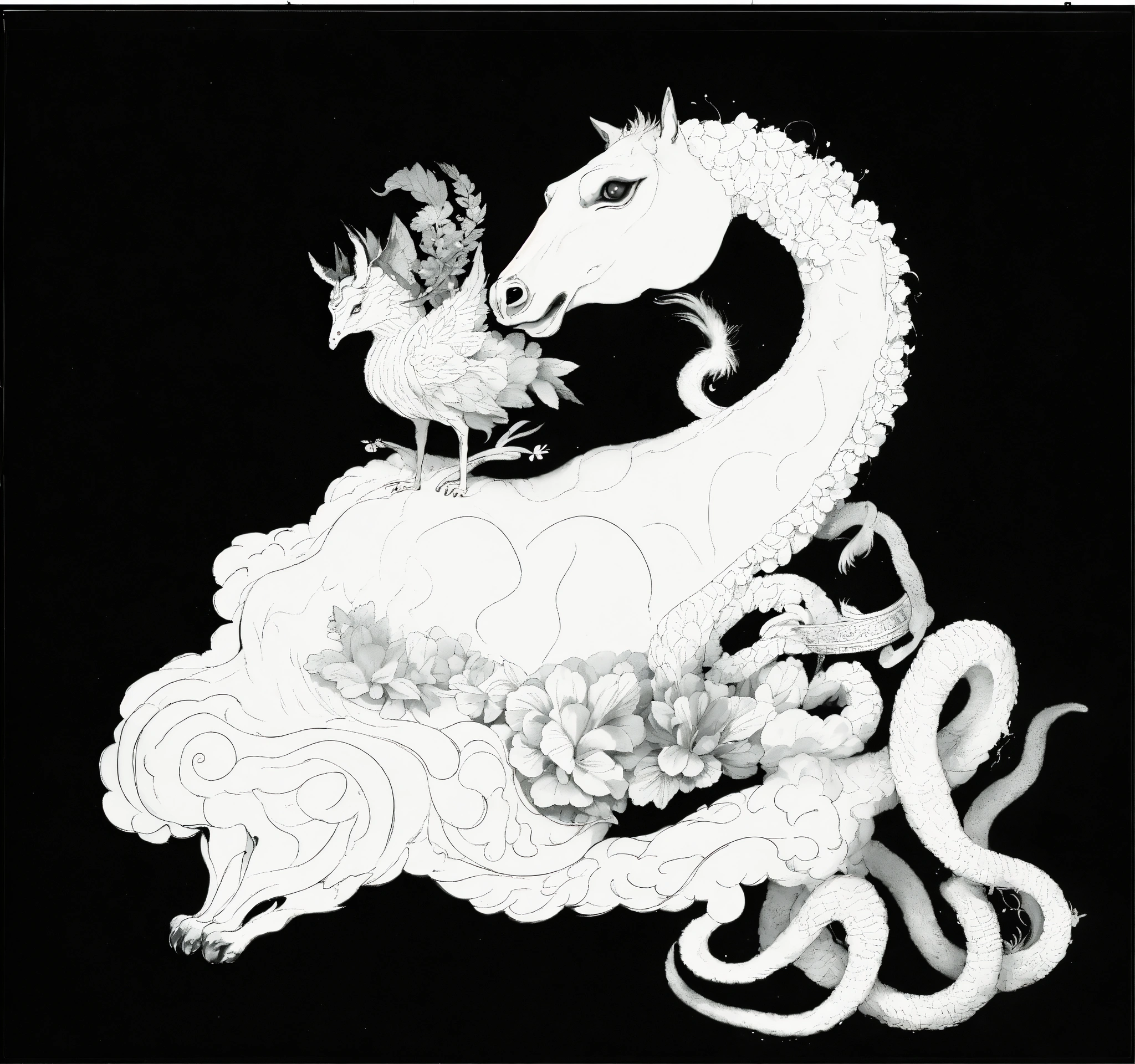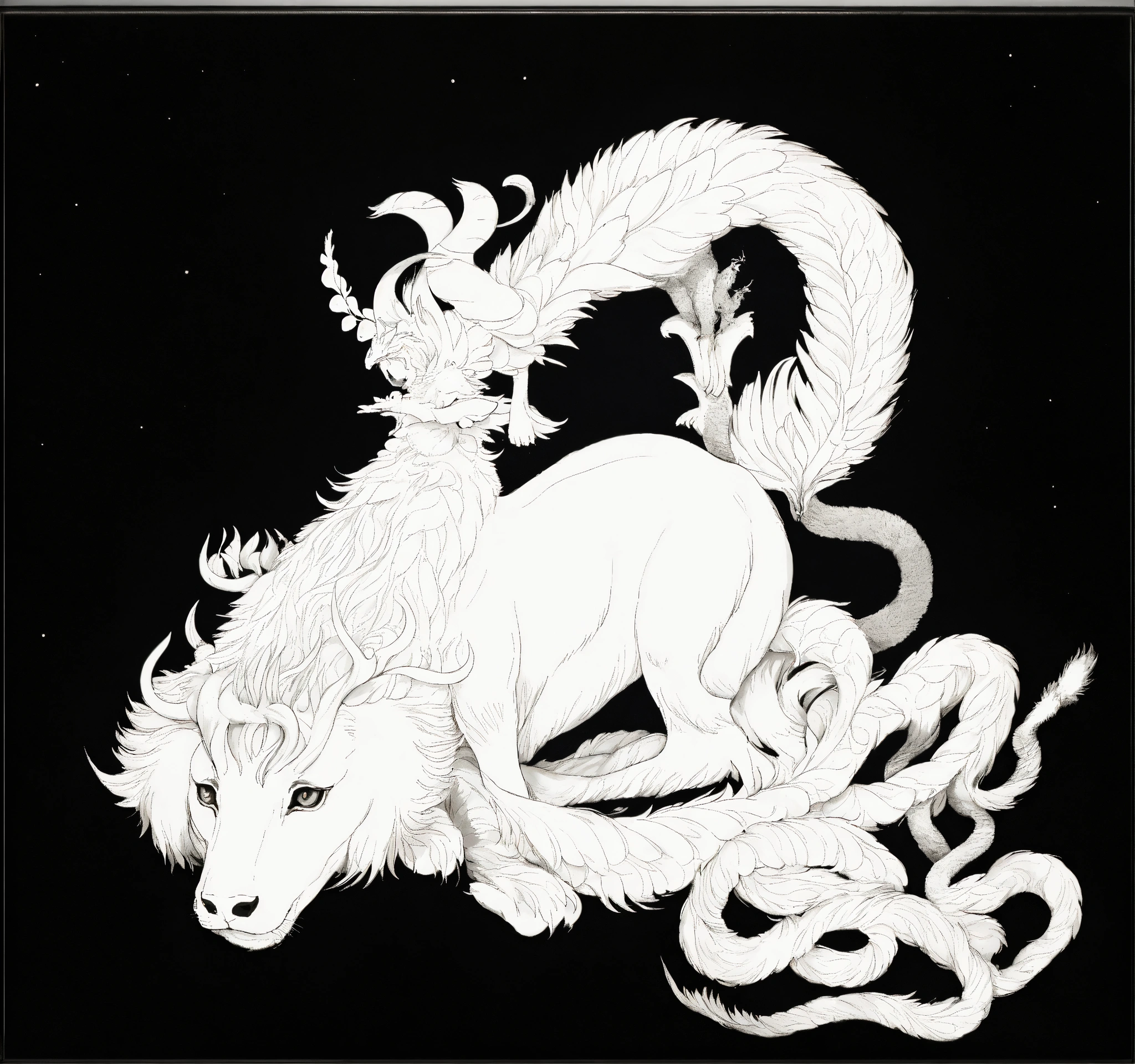 A surrealistic mythical creature assembled from different animal components, dwelling in a fusion of reality and surrealism.
