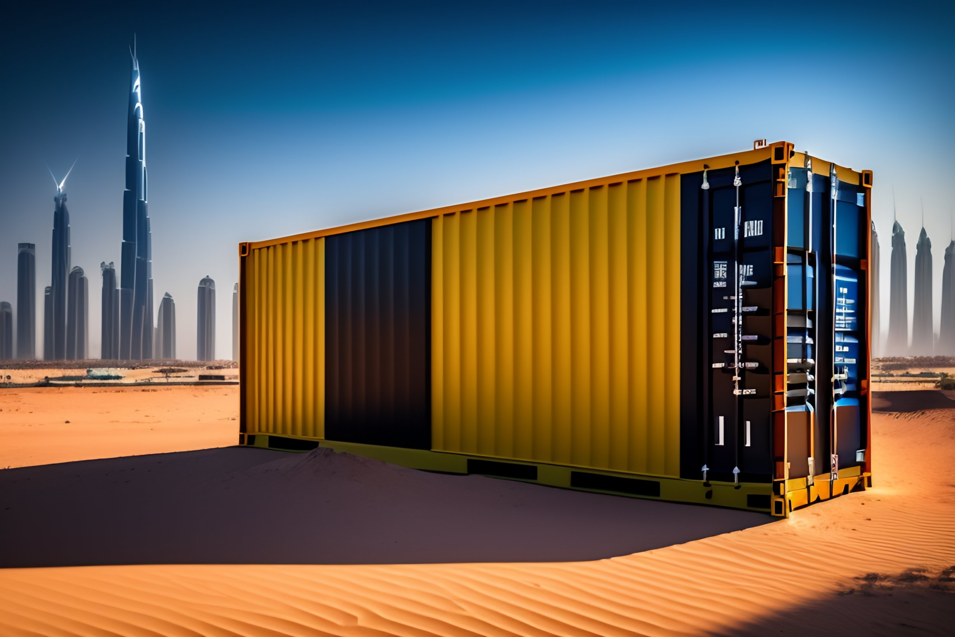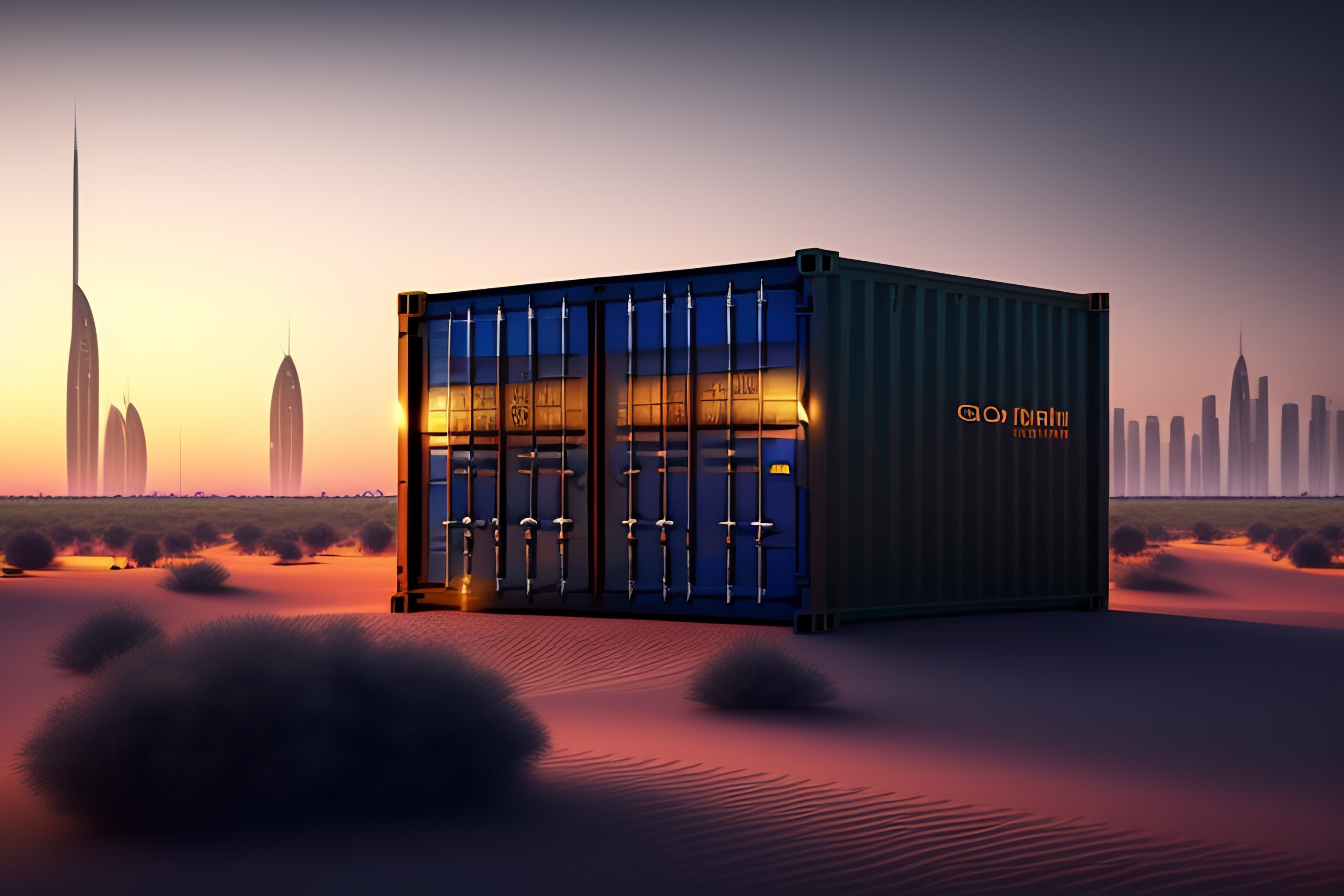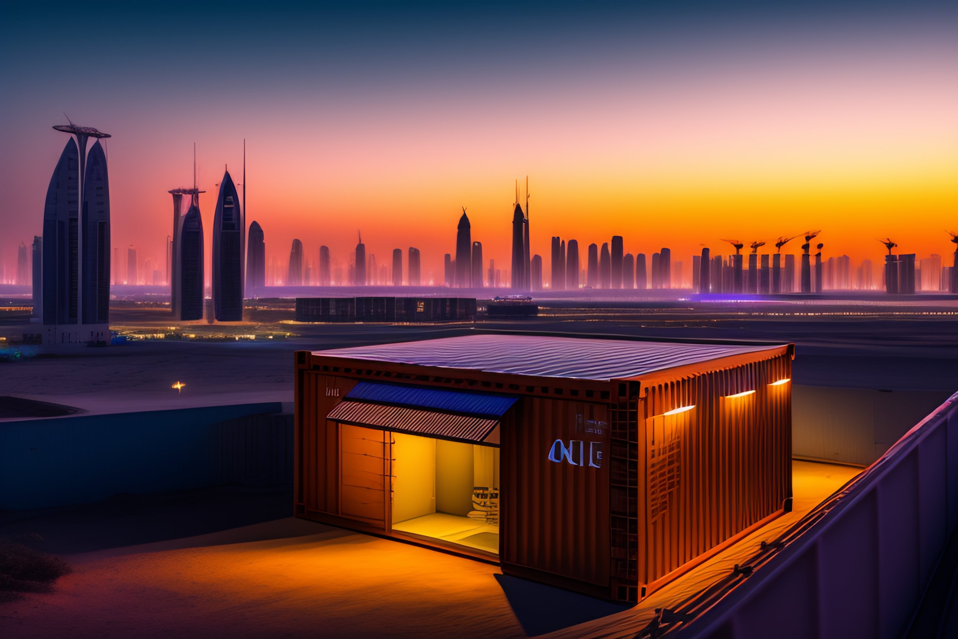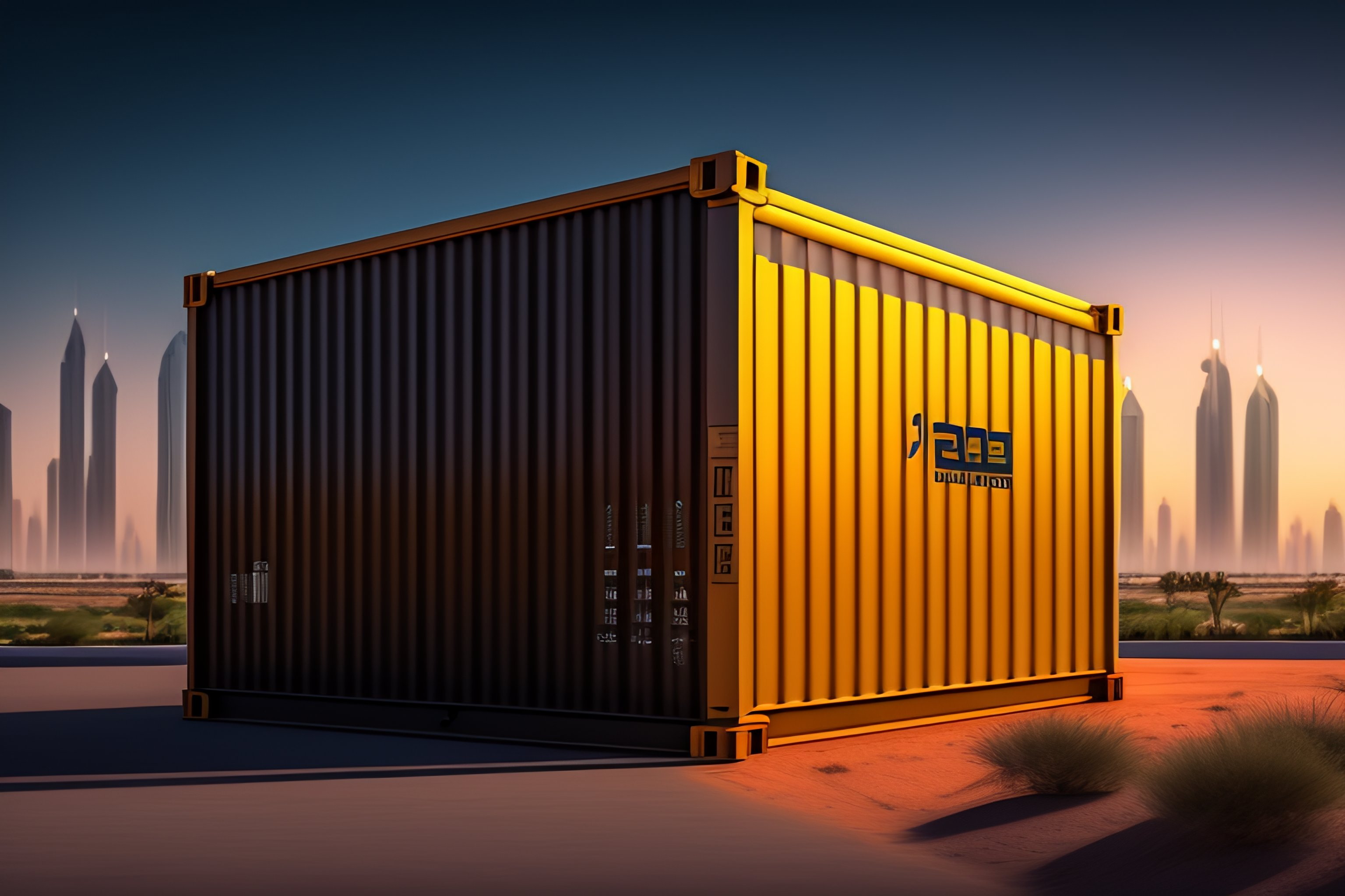 A scifi container with power cables coming out of it, beside a modern residential complex in dubai, golden lighting, in style of isaac zuren, 4k