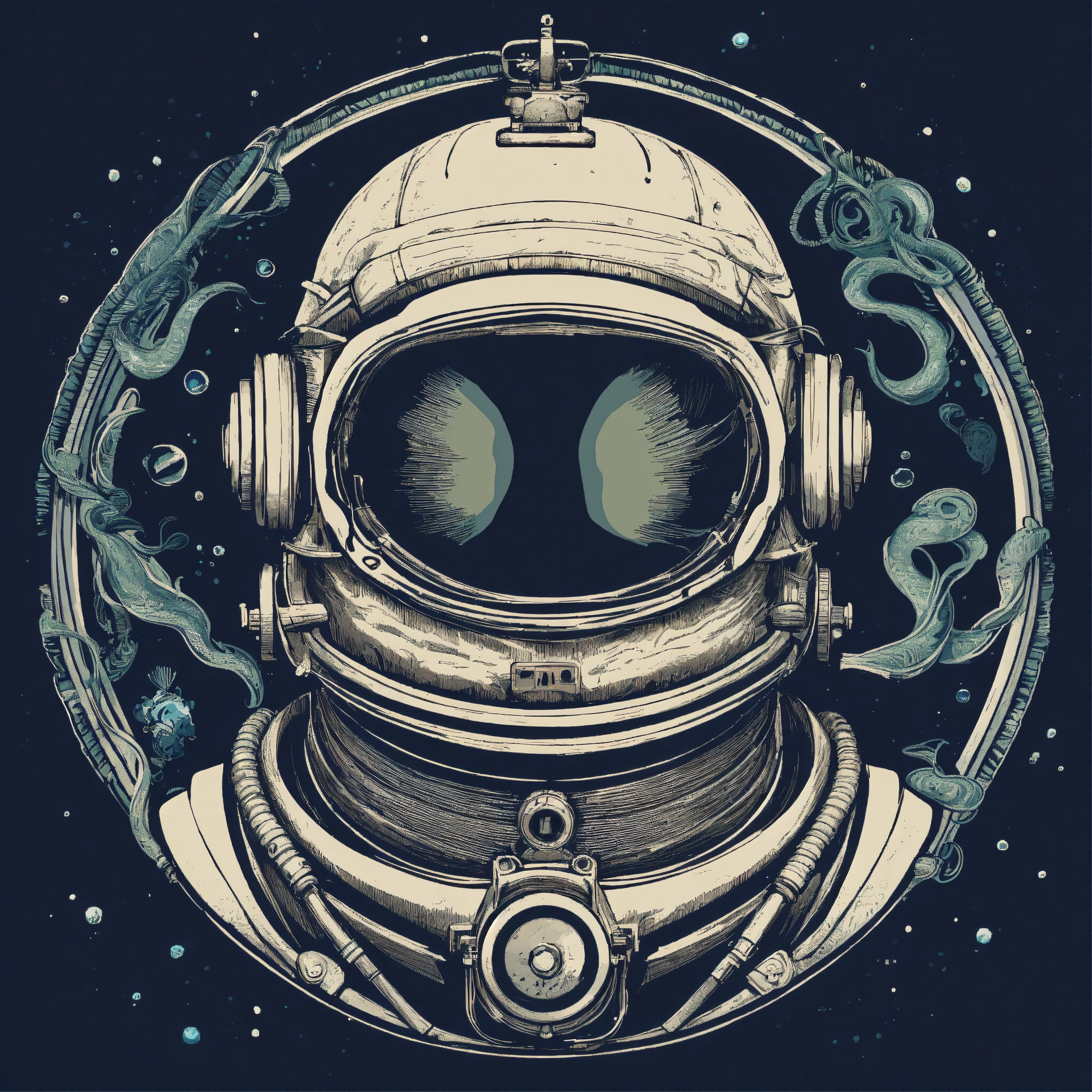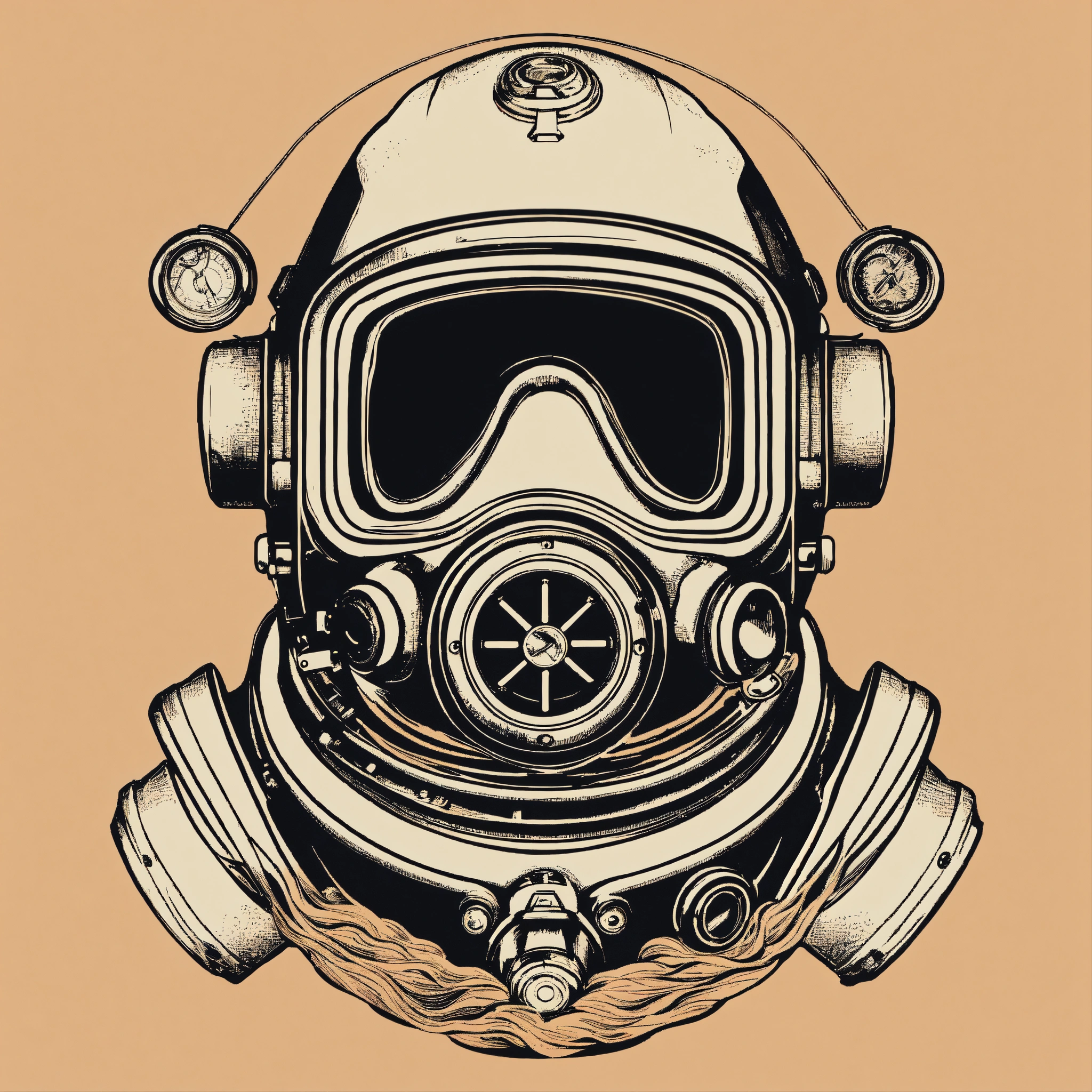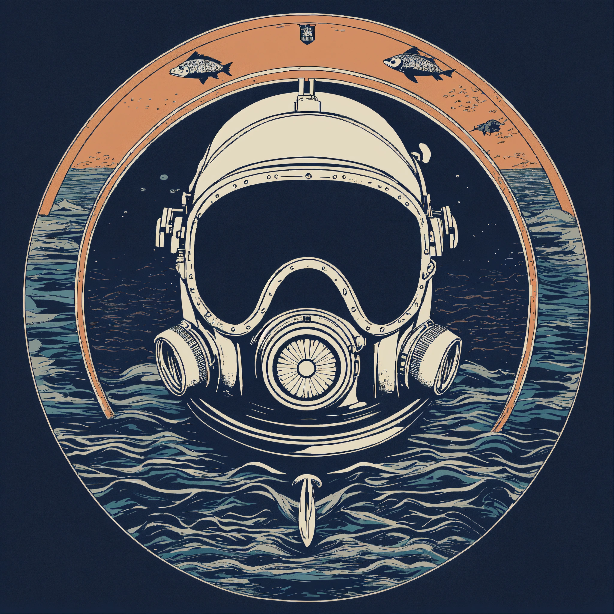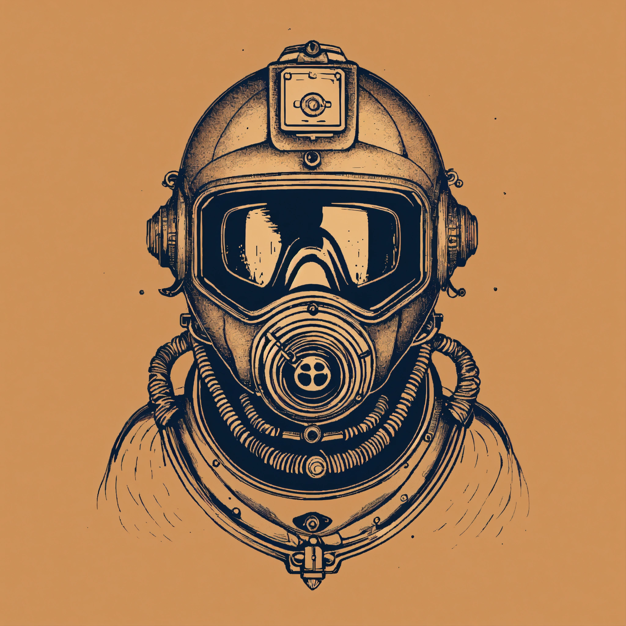 T-shirt vector illustration, centered design of a minimalist diver's helmet, meticulously detailed, evoking the mysteries, wonders, and silent beauty of deep-sea exploration. the design captures both history and adventure beneath the waves. simplistic, centered vector illustration, solid background color.