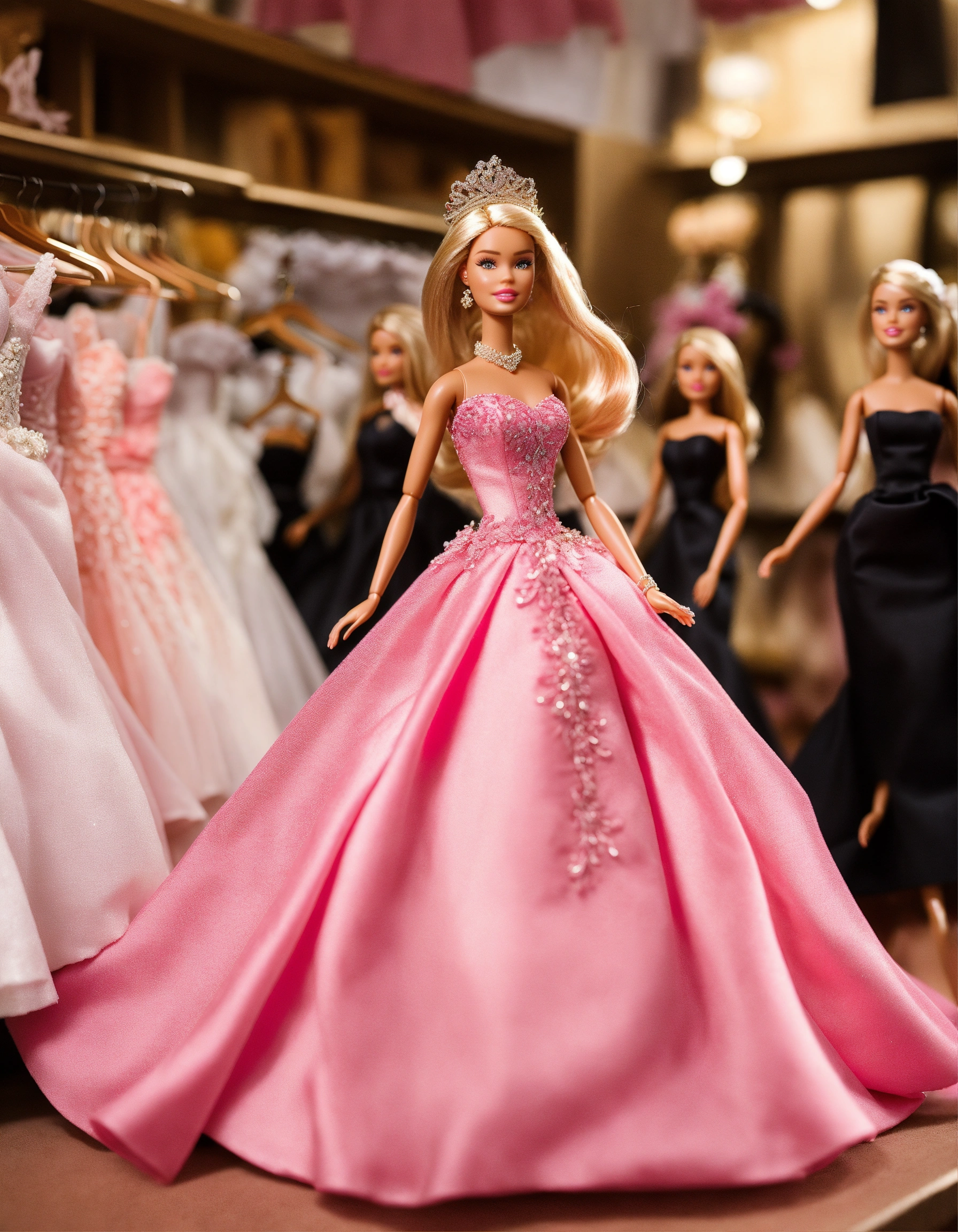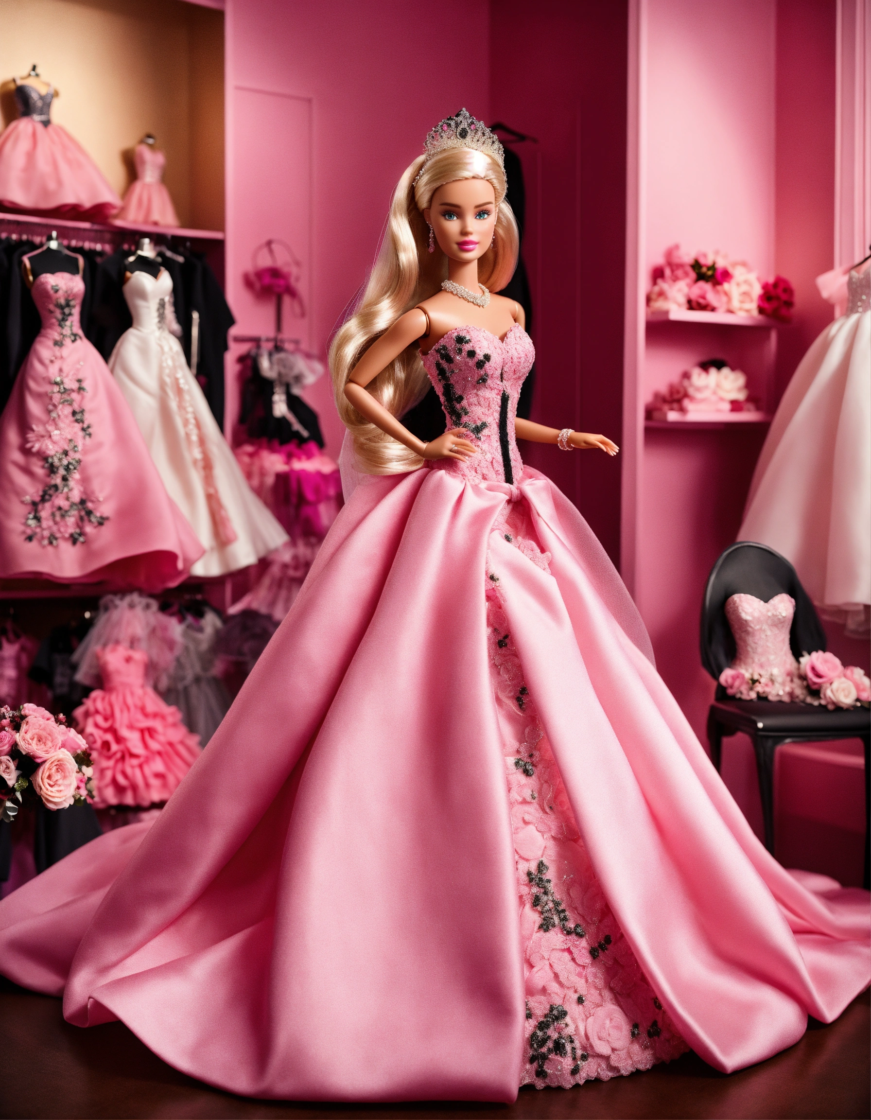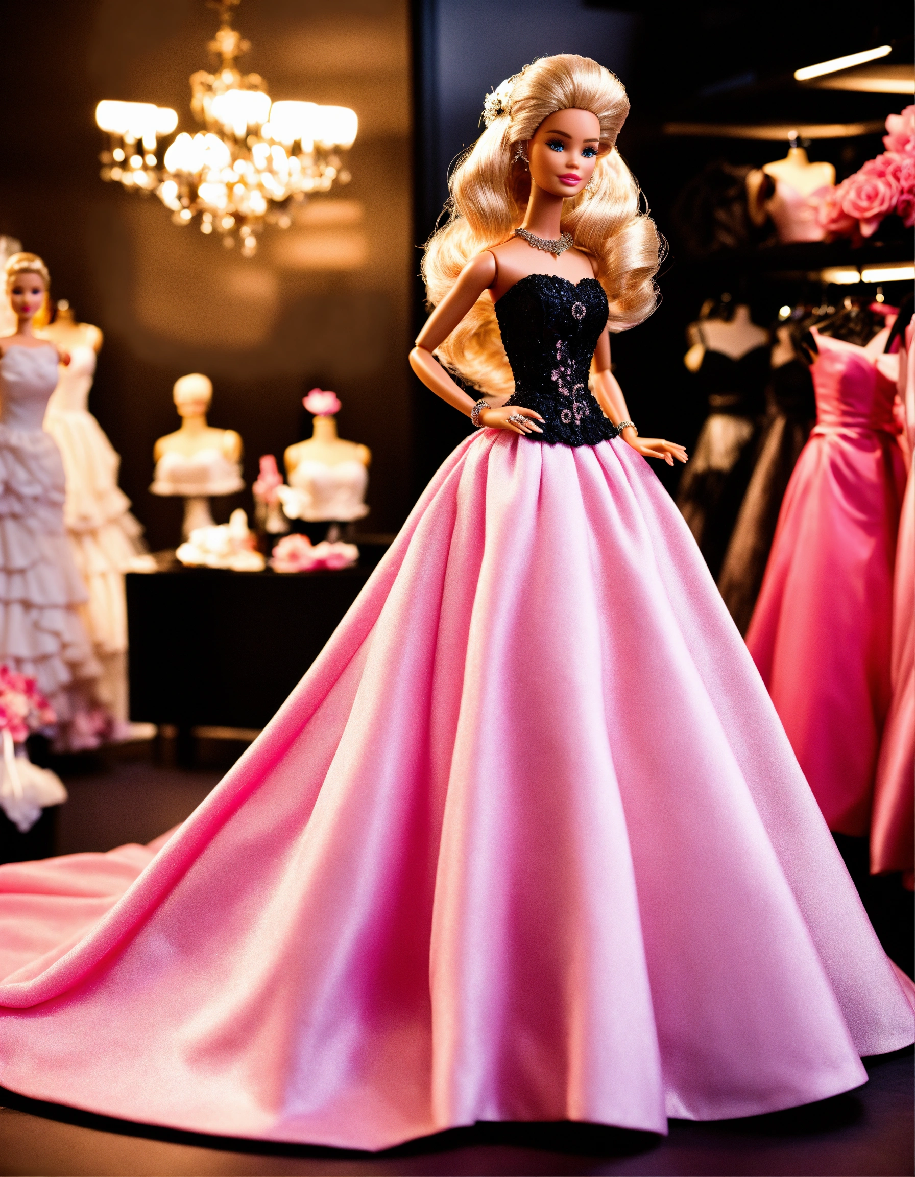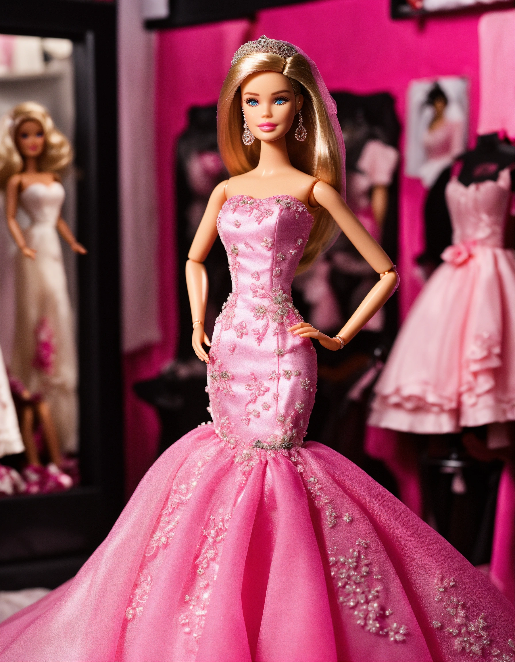 Barbie dolls, career as a wedding dress designer, pink, and black fashionable, gorgeous, working in her wedding dress shop