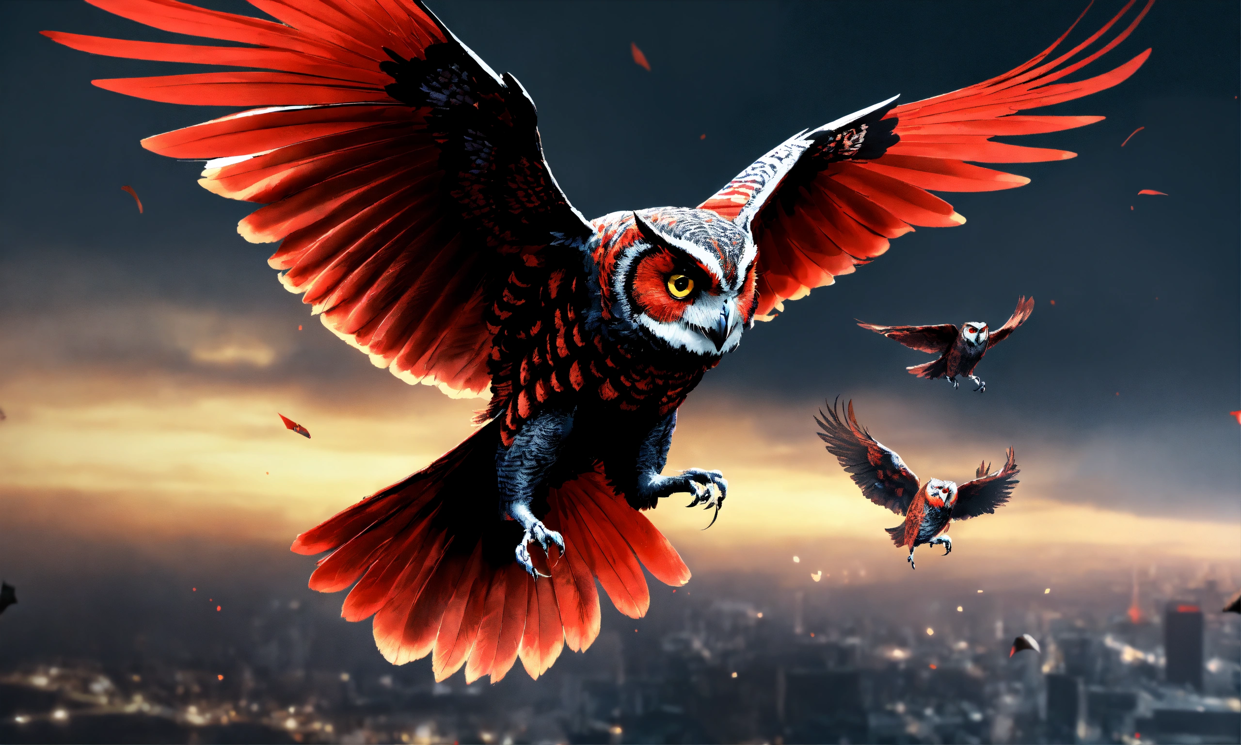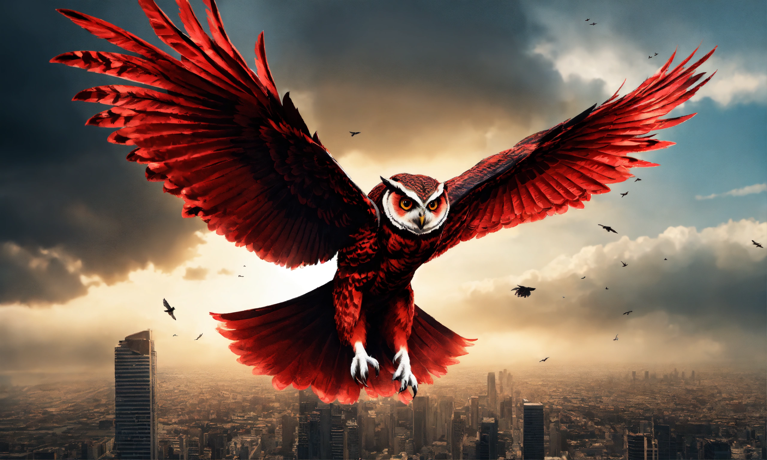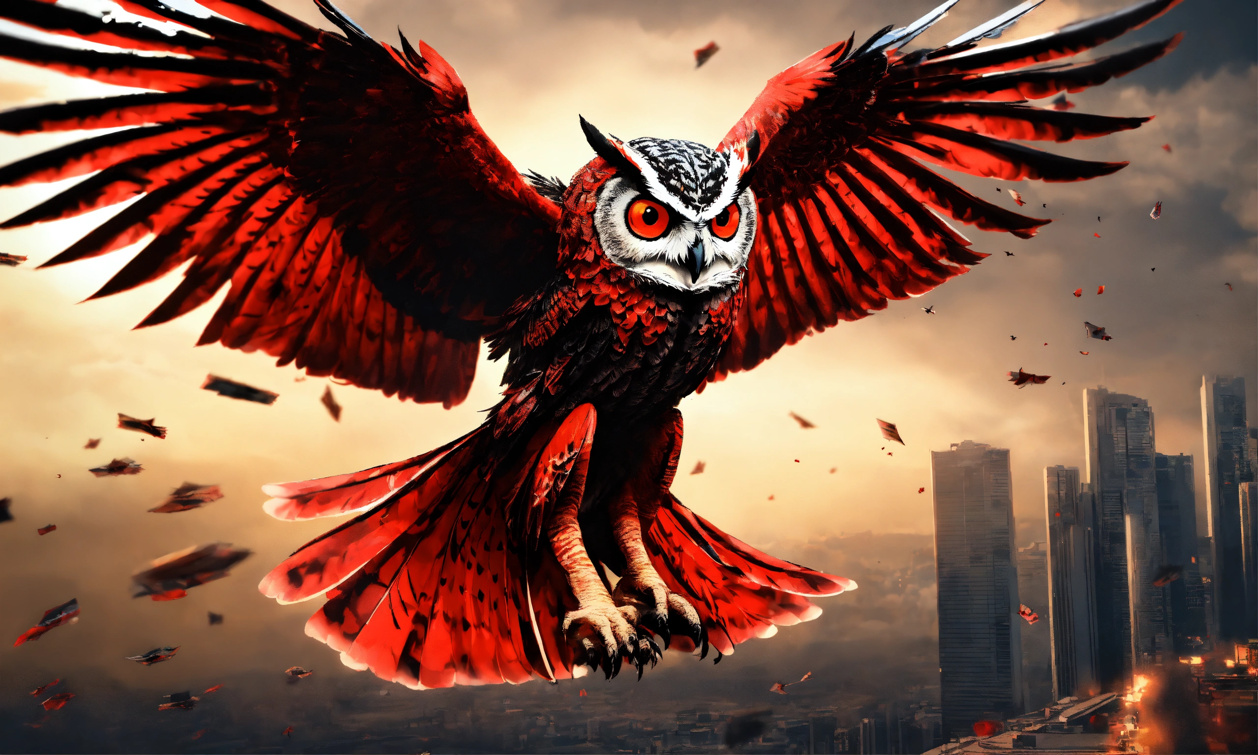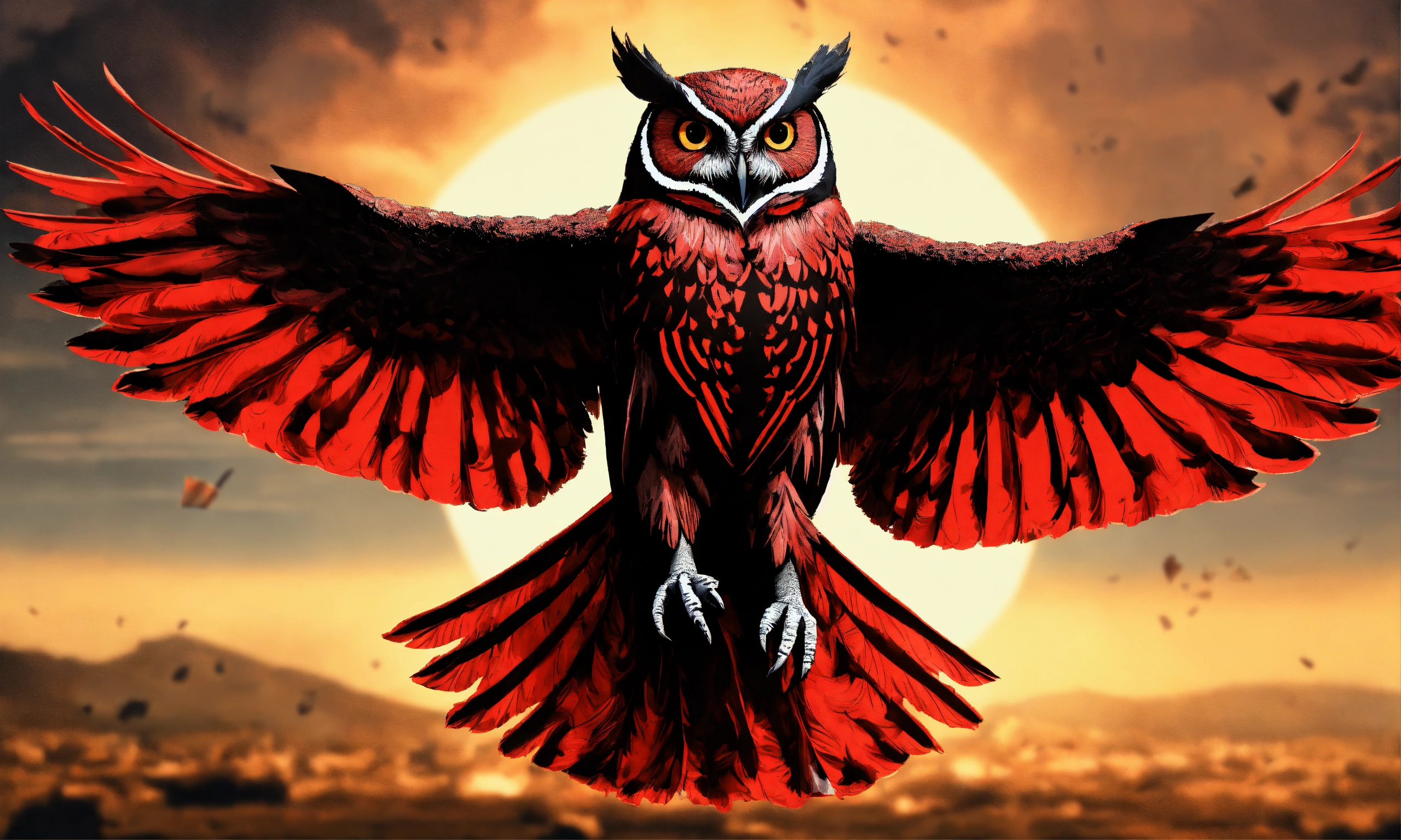 Evil demonic israeli owl dropping leaflets from the sky, extremely creative and unique, red and black owl, advance design, highly detailed and realistic, inspired by apollyon, futuristic, amazing design, highly advanced, ominous, cast in red and black, owl dropping flyers and leaflets