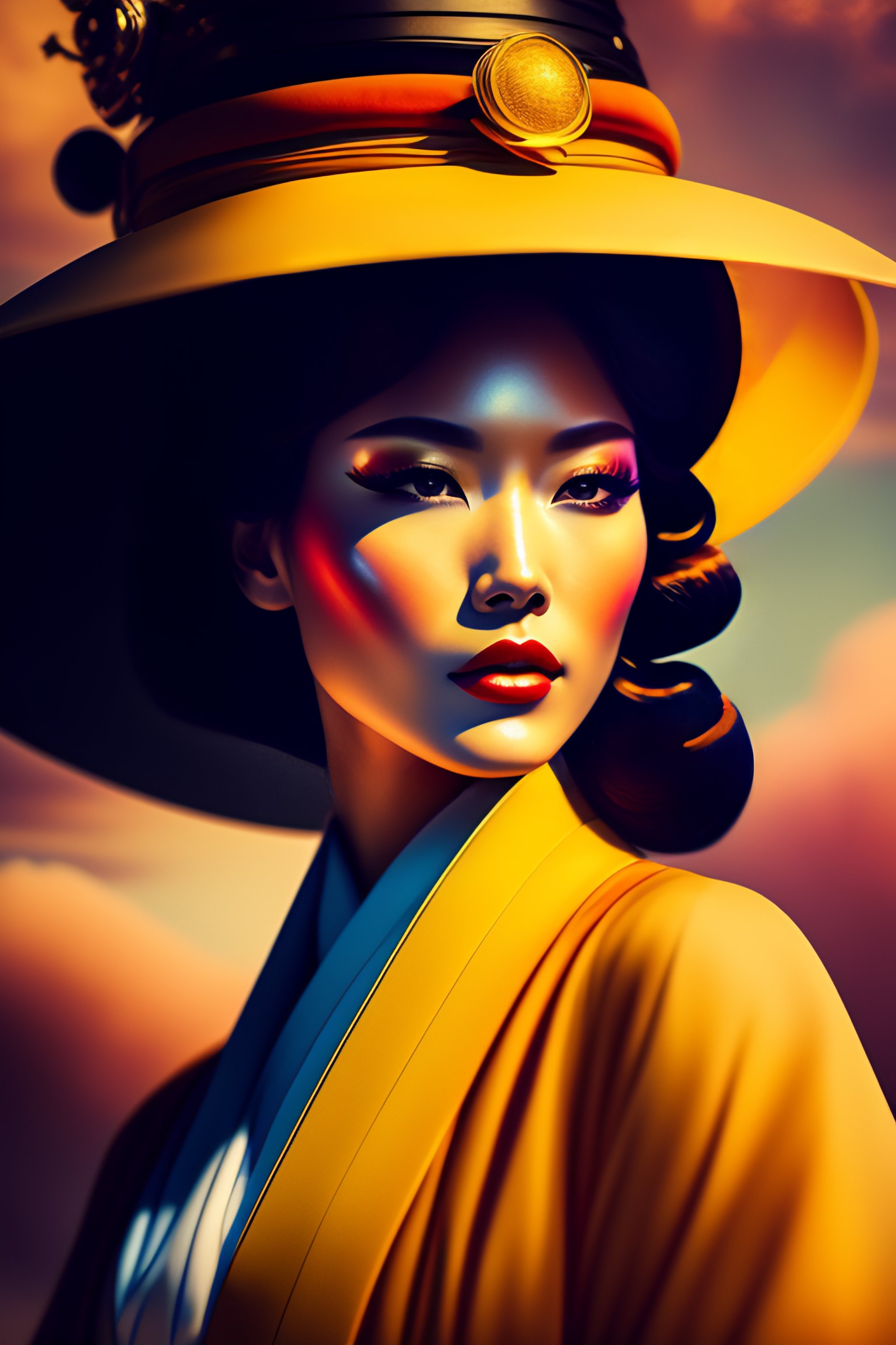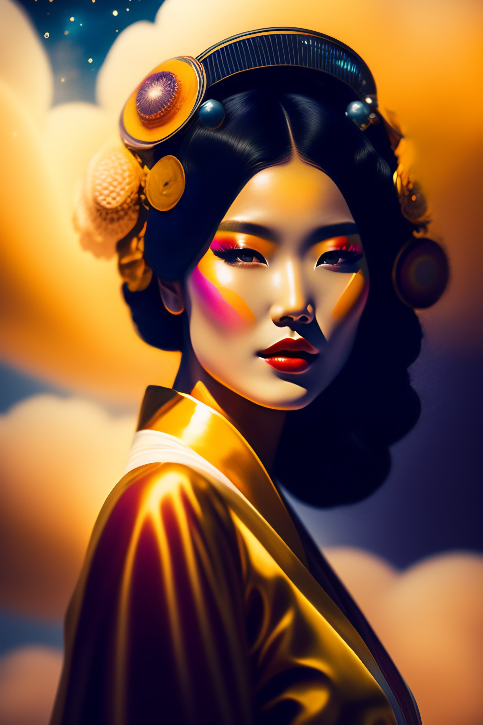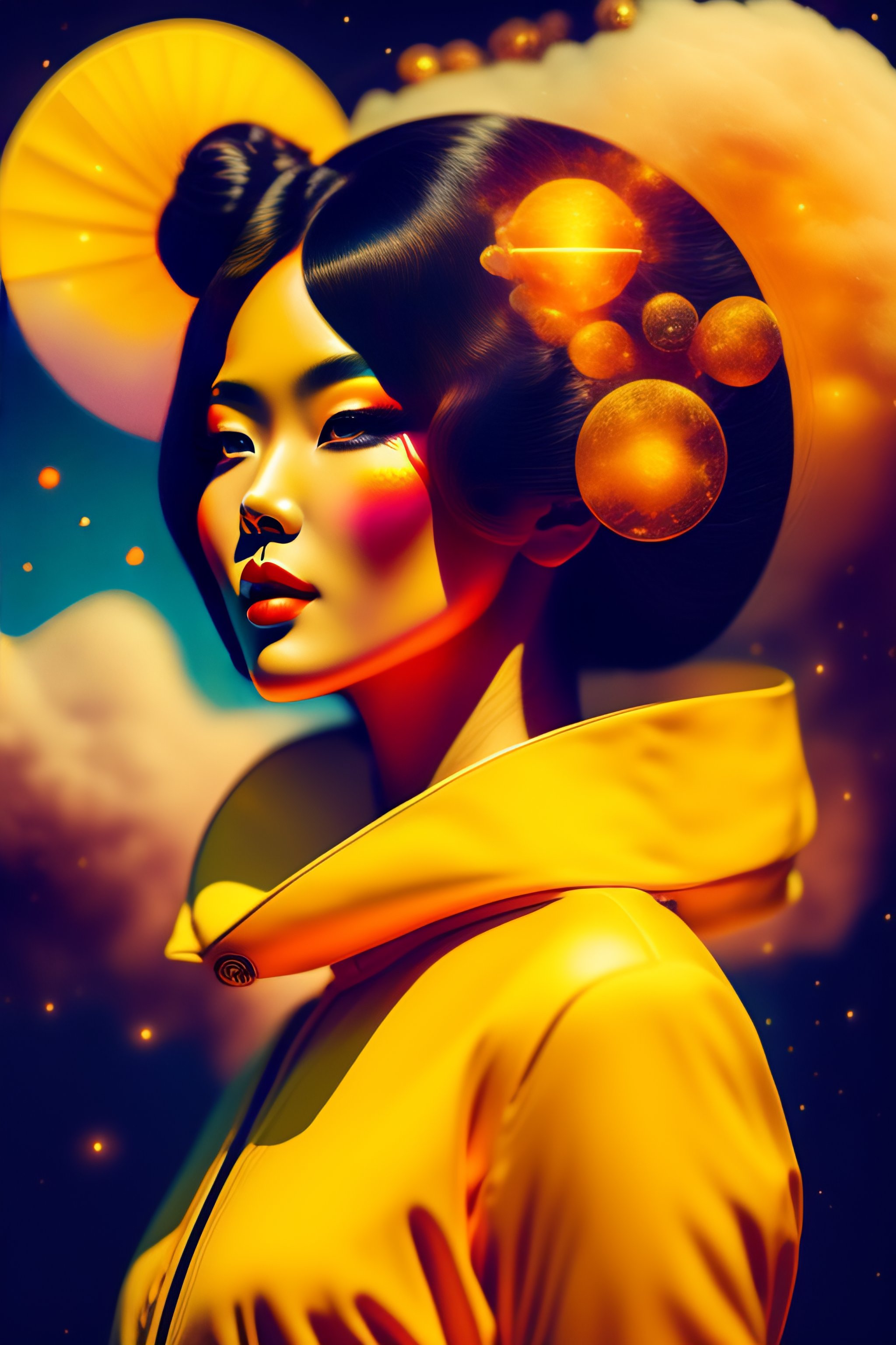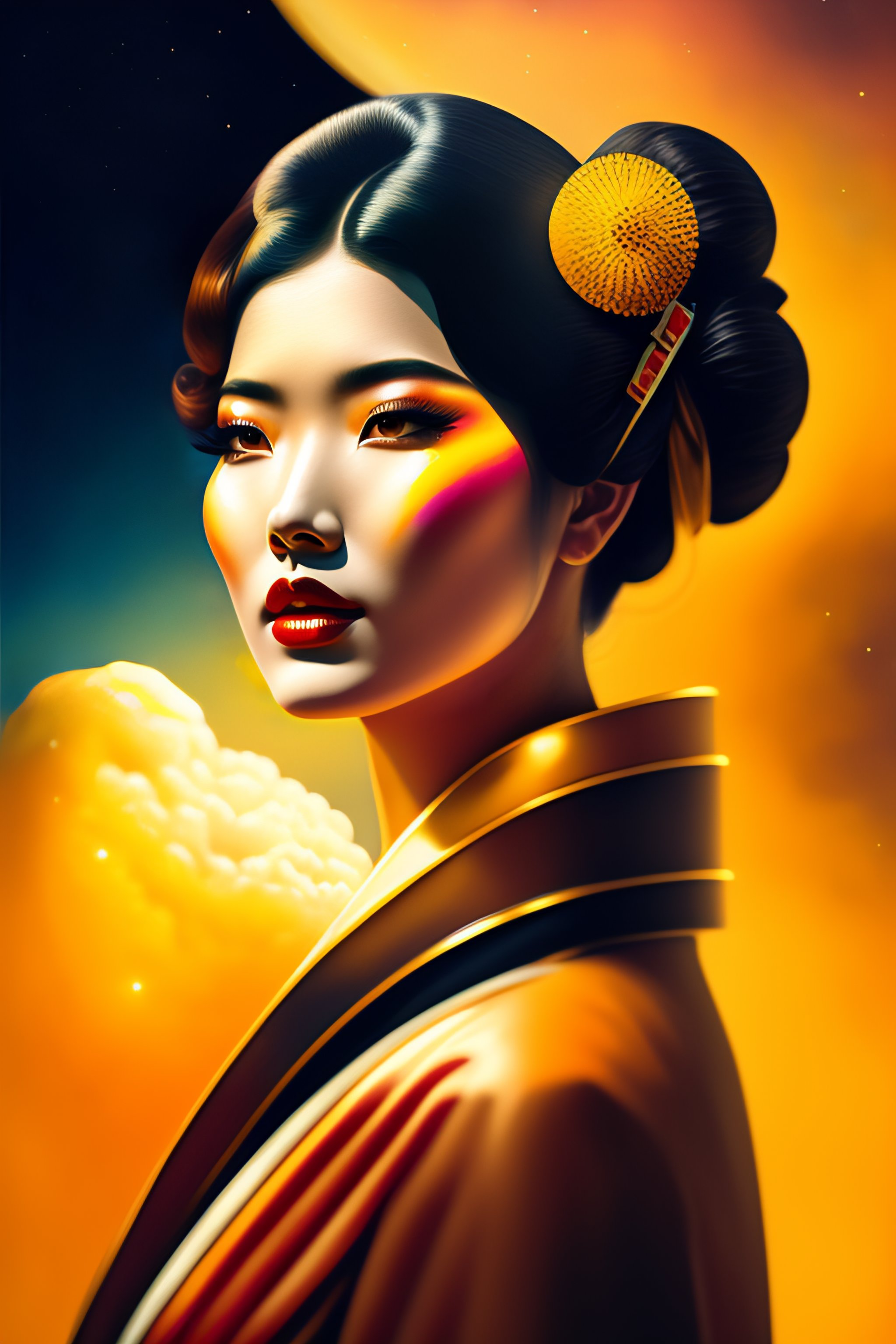 Vintage ilustration, geisha face using a space suite, lensflares, backlight, waterpaint, yellow clouds
