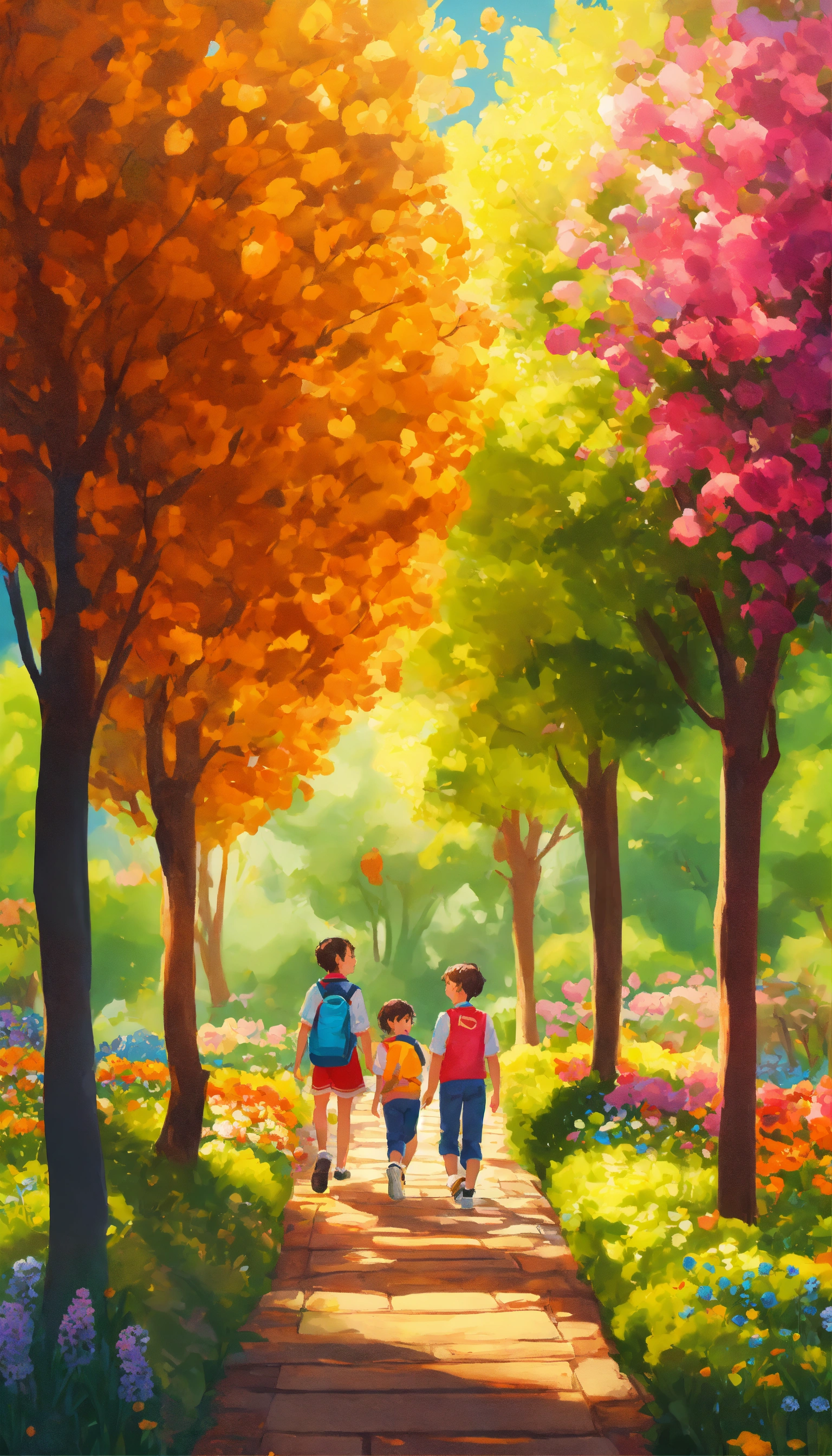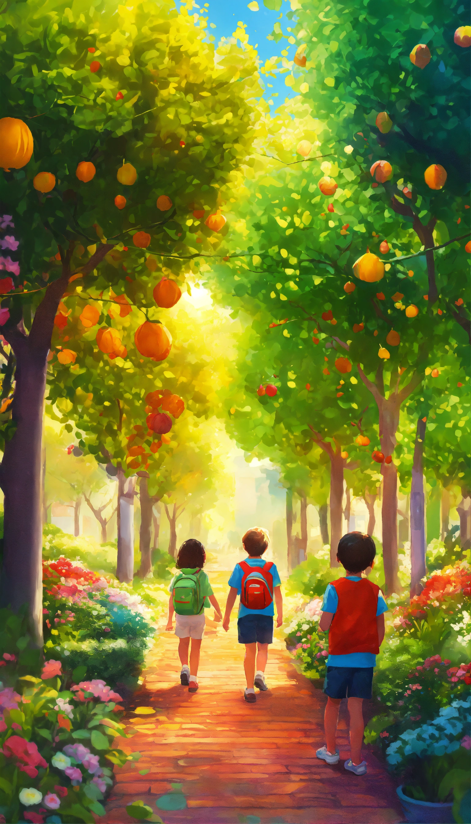 Crea una escena en la que varios niños plantan árboles en un jardín comunitario. sus caras reflejan la alegría y la esperanza mientras cuidan de las plántulas, 8k vibrante de colores, detailed, painted.
