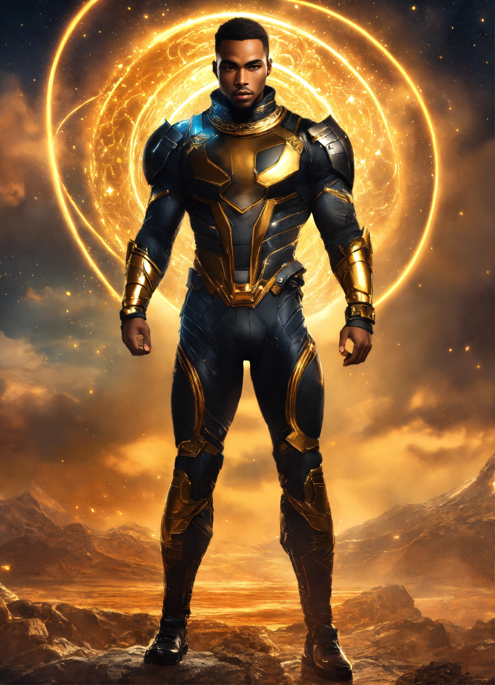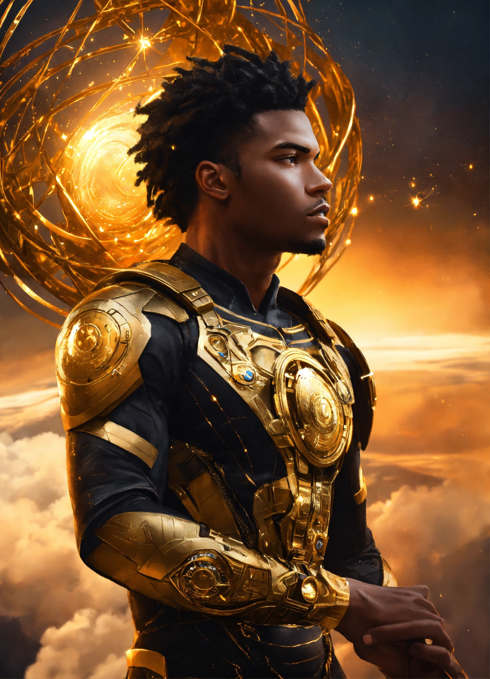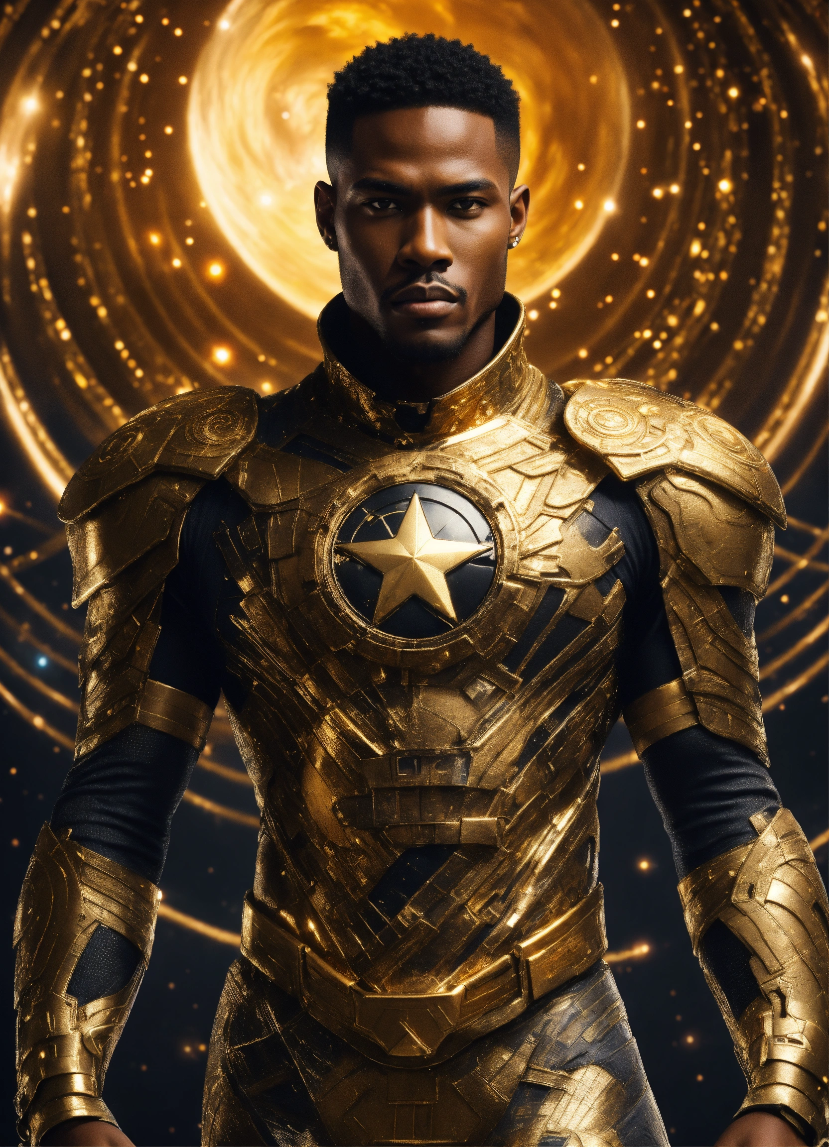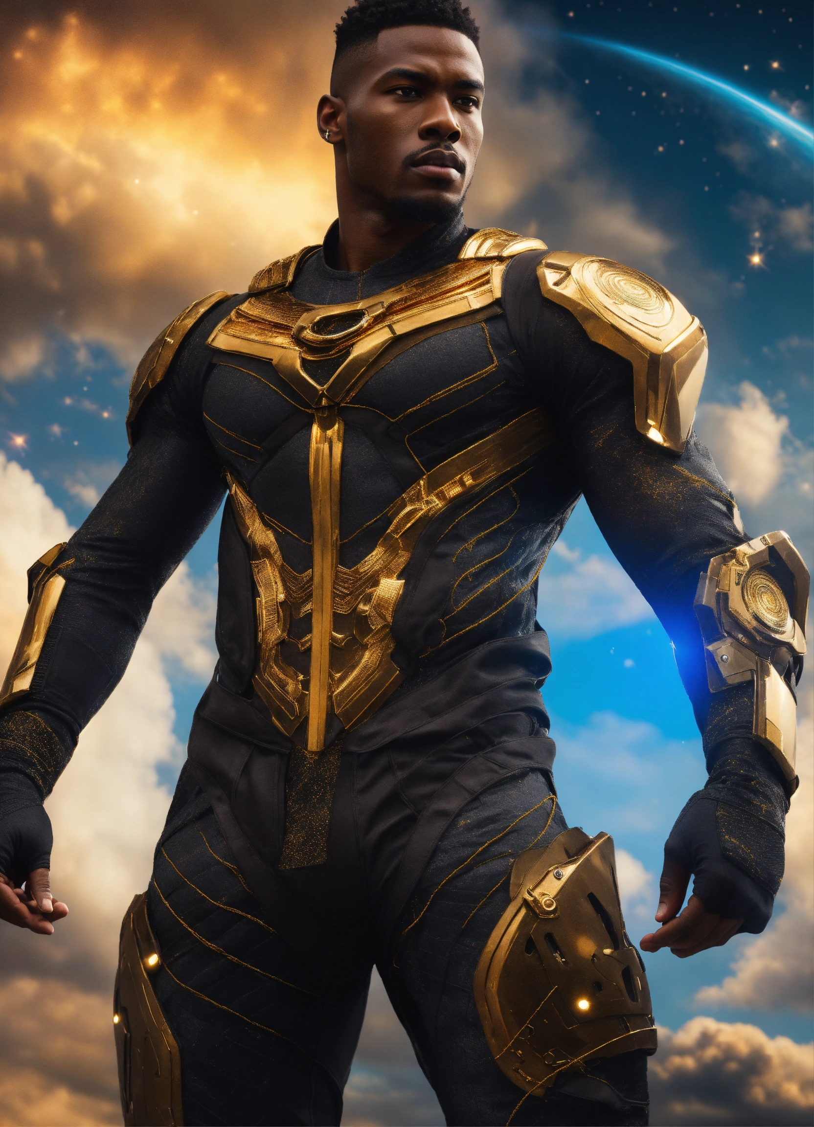 Black futuristic warrior entangled in a spiral of cosmic golden energy, a strong handsome young black futuristic warrior man dark brown skin, handsome strong face with short hair entangled in a spiral of cosmic golden energy, strong athletic build wearing a black super spy stealth suit with stars on his chest floating in the sky with clouds behind him, fantasy, high detail, realistic photo, high detail, digital painting, cinematic, stunning, hyper-realistic, sharp focus, high resolution 8k, insanely detailed