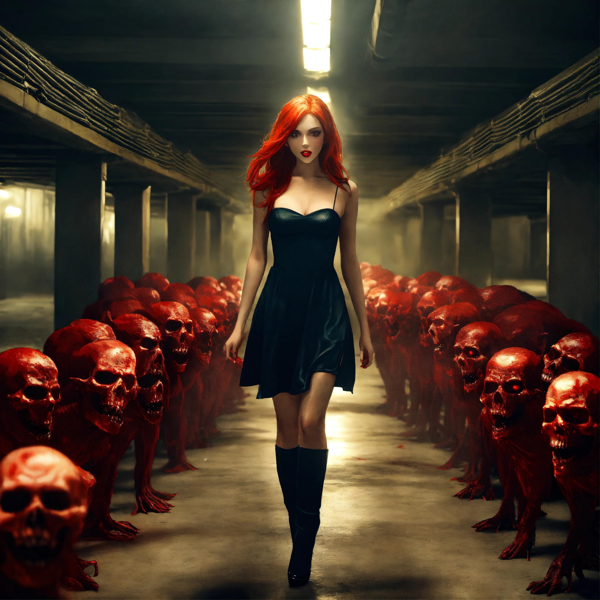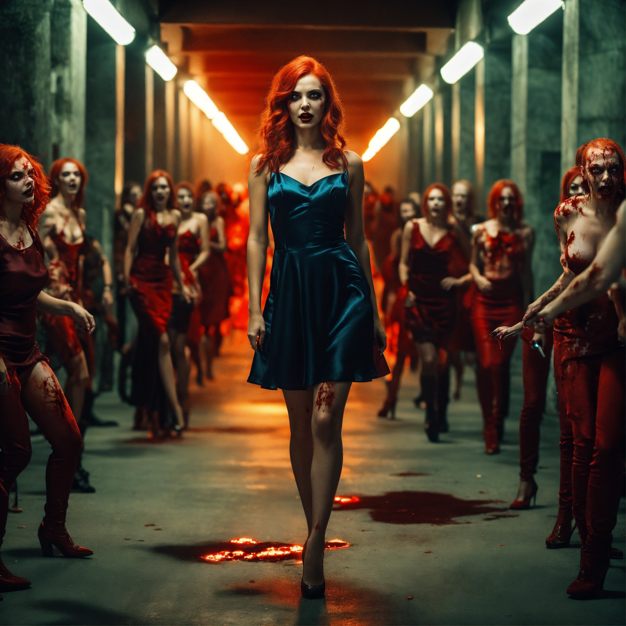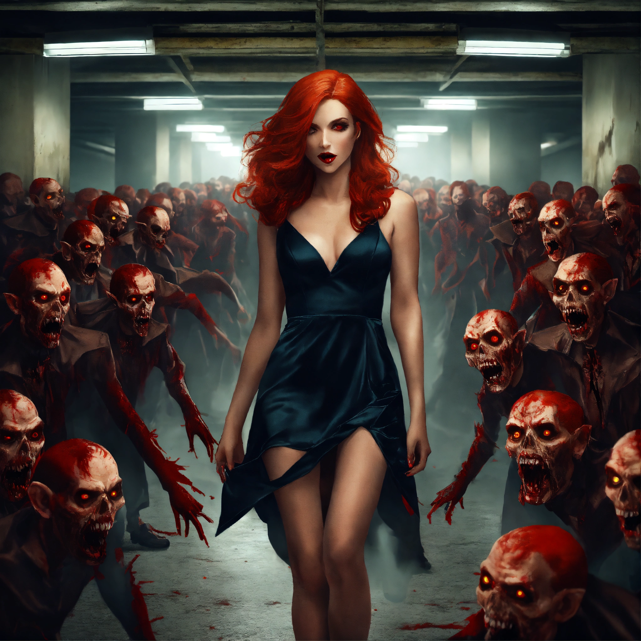 A beautiful red haired vampire woman, in a short silk dress and wearing high heels, leading a horde of zombie-vampires with red glowing eyes, in an underground parking garage, surrealism, focused on the woman