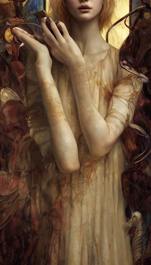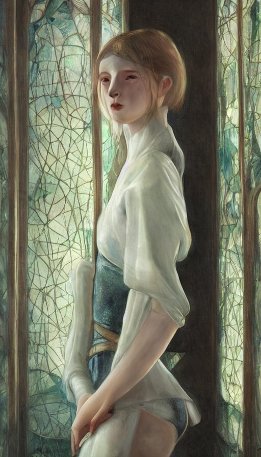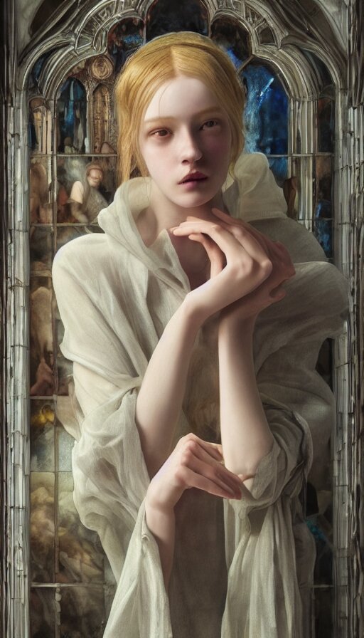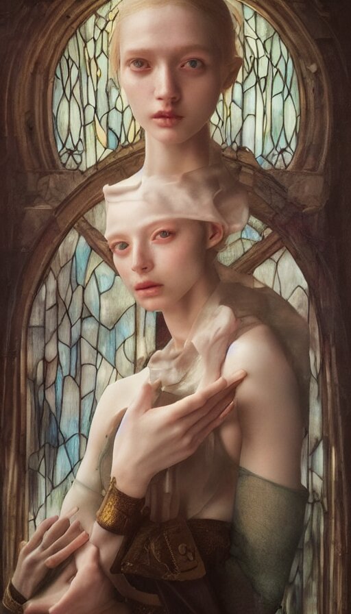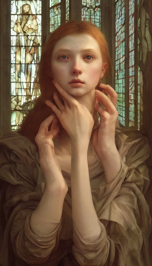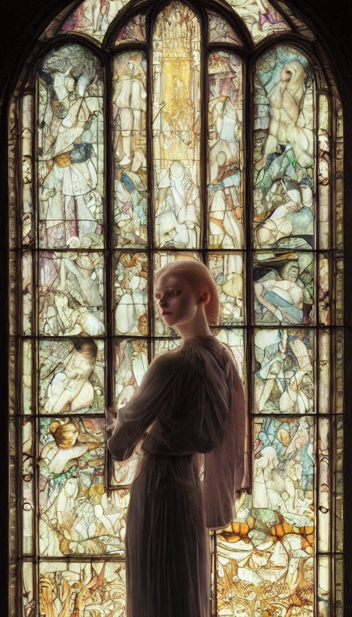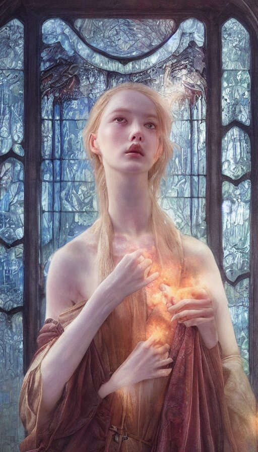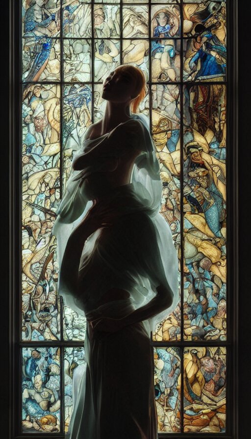 Epic masterpiece daria milky behind a stained glass, sweaty skin, hyperrealistic, octane render, cinematic, beautiful face and flawless skin, perfect hands, 5 fingers, by edgar maxence and ross tran and michael whelan, legends of runeterra