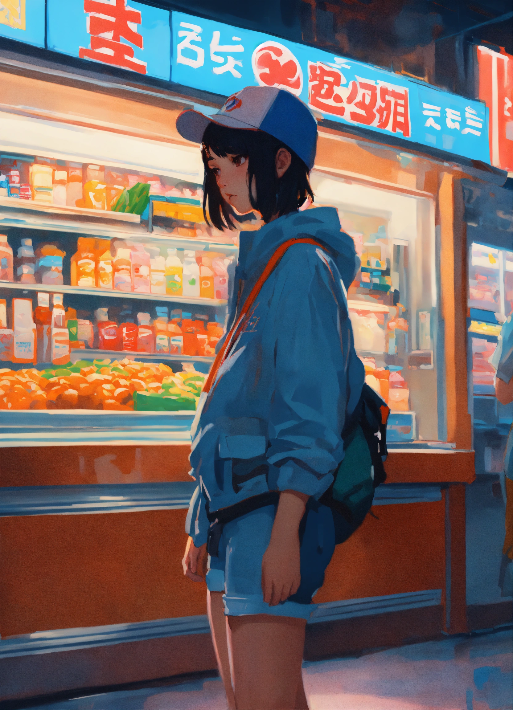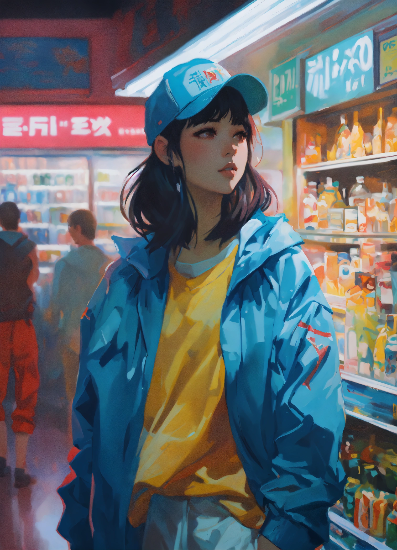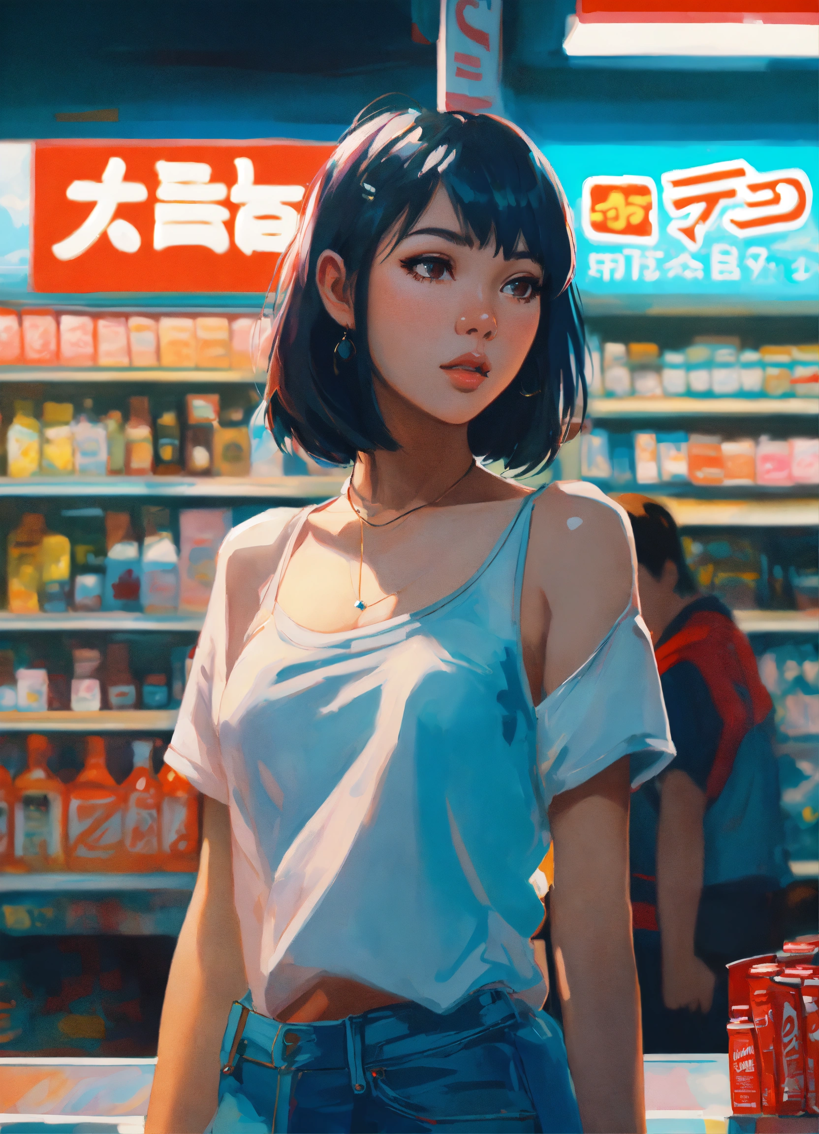 A ultradetailed beautiful panting of a stylish girl wearing extravagant streetwear in a convenience store, oil painting, by ilya kuvshinov, greg rutkowski and makoto shinkai, heavenly beauty, very barely dressed