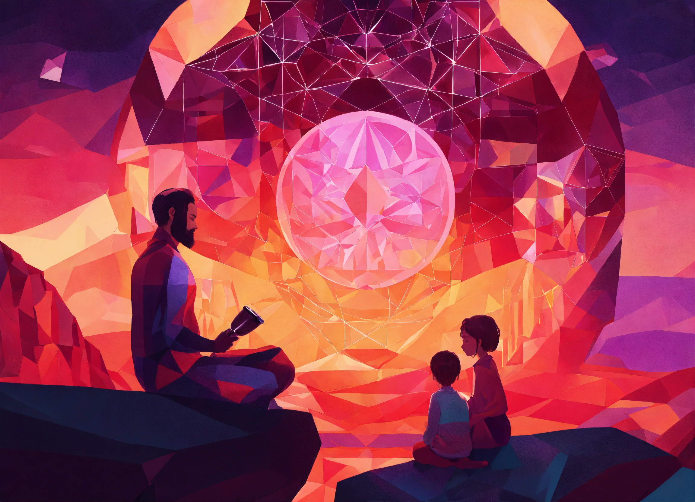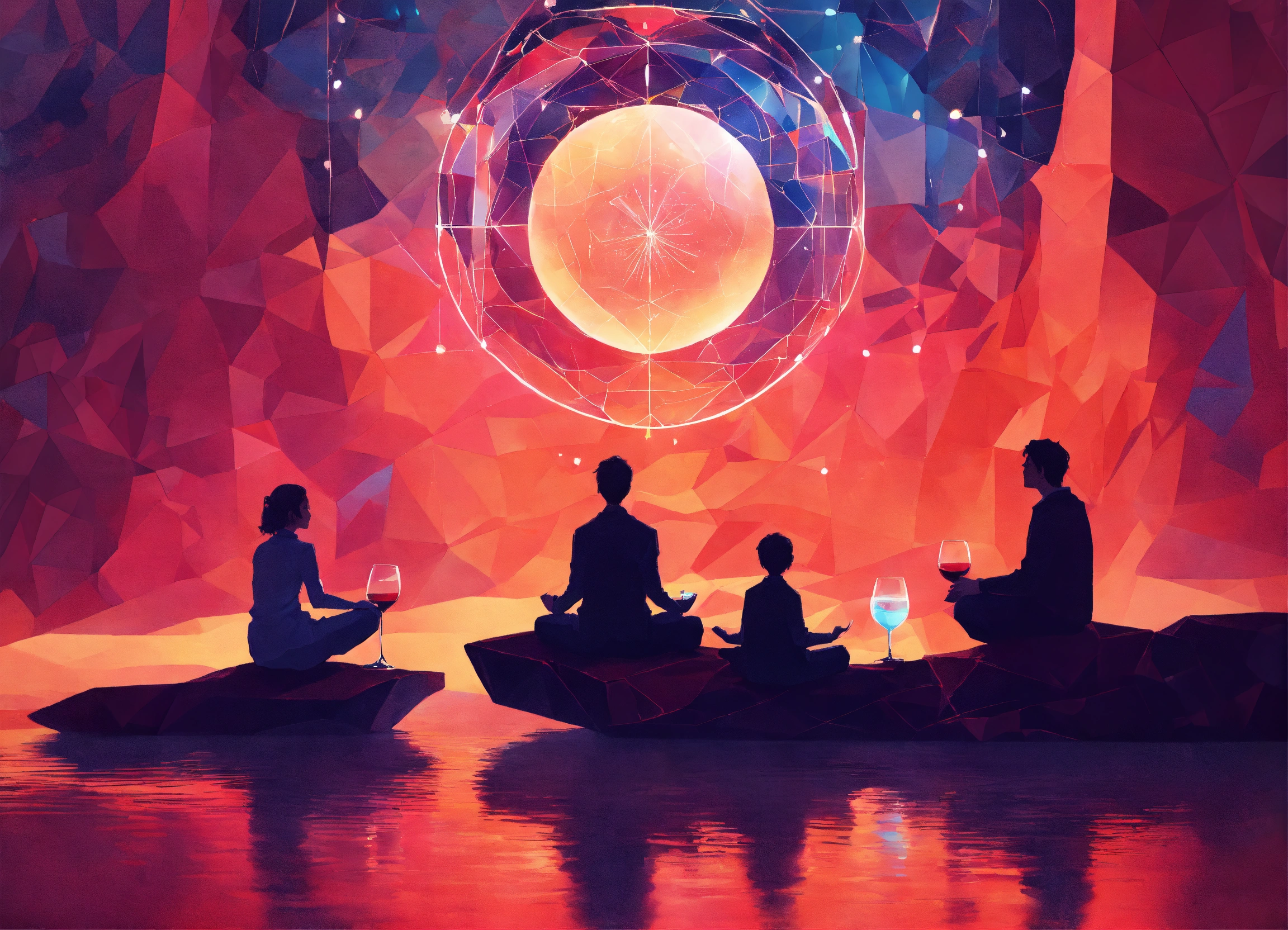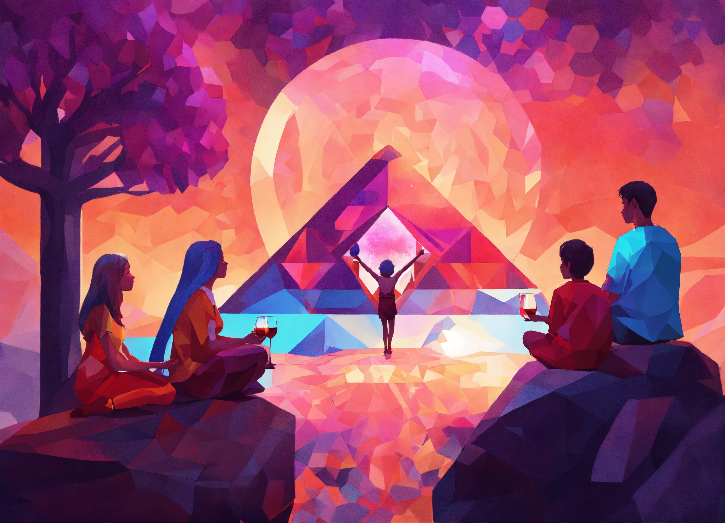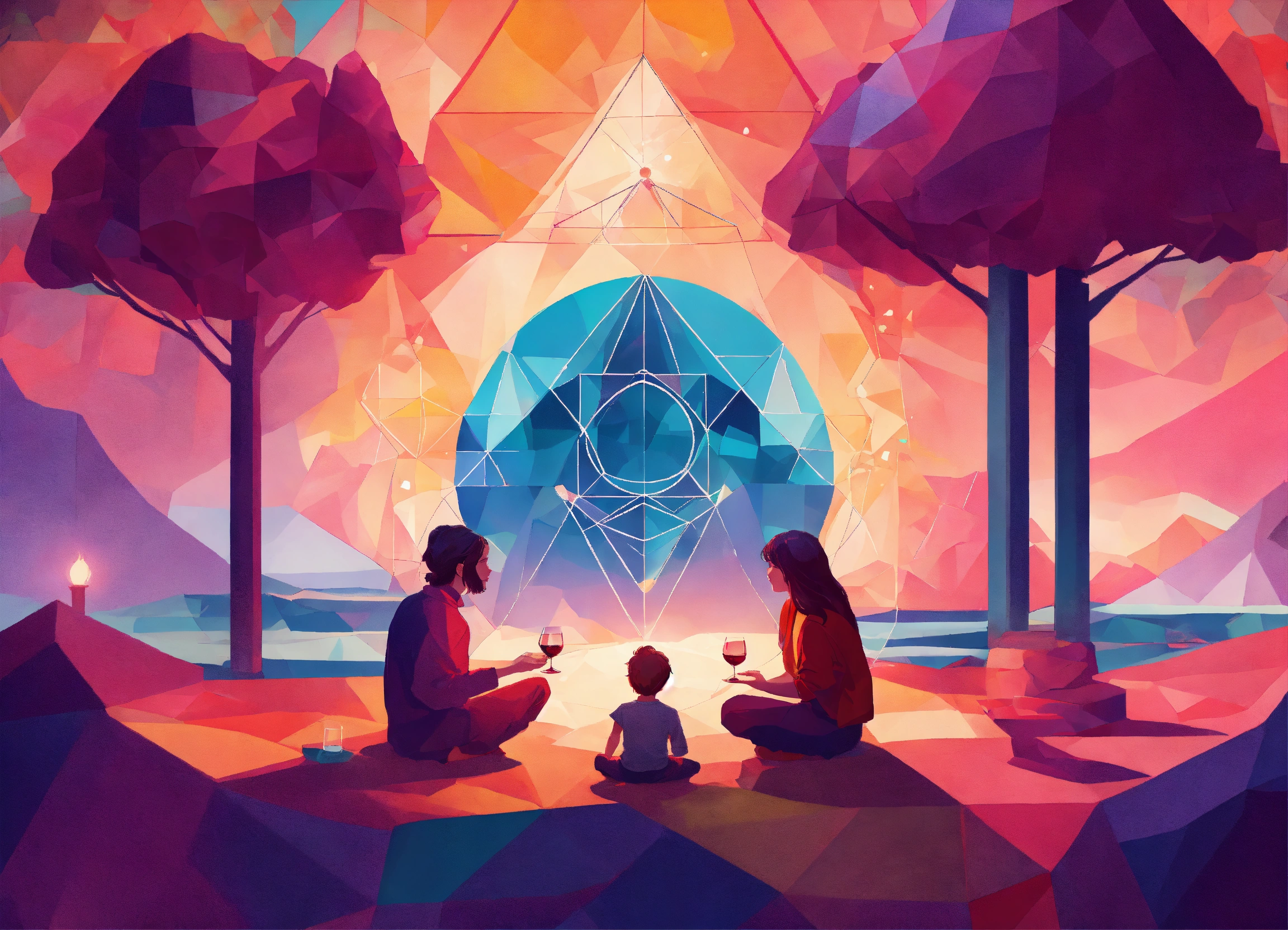 Fantasy art loved ones, illumination american family together. children, meditation, drink wine. person far over a rock meditating abstract geometric