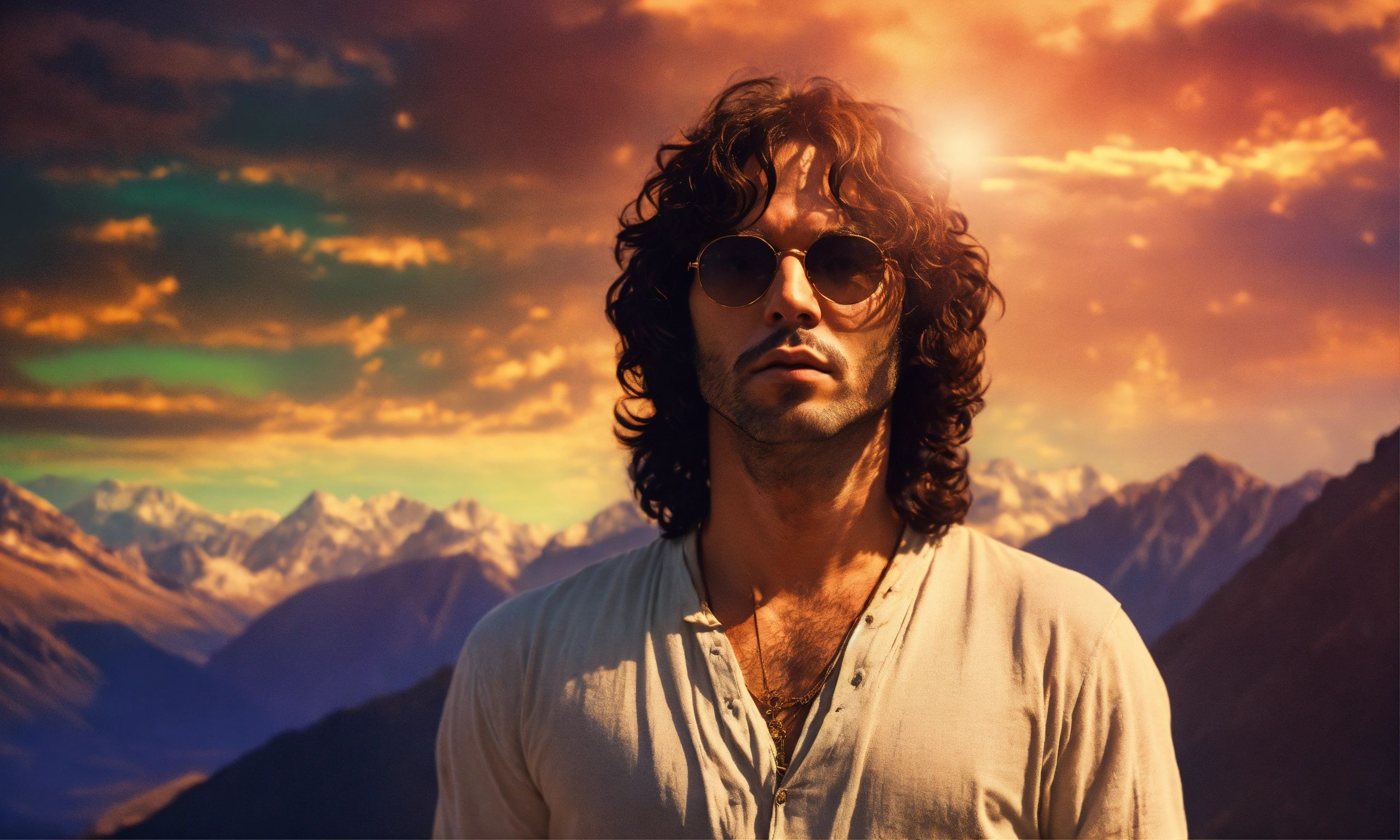 Blissful and calming aura brand logo, ultra high-definition, jim morrison, nostalgic image, illumination, beautiful cinematography, best chill music mix