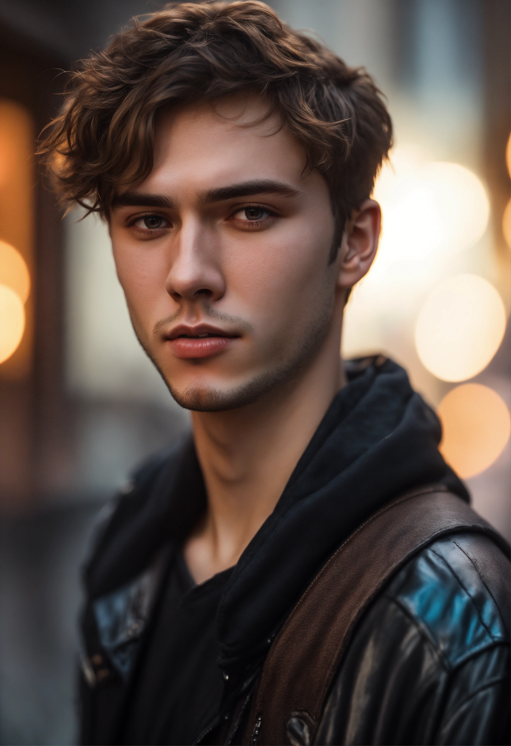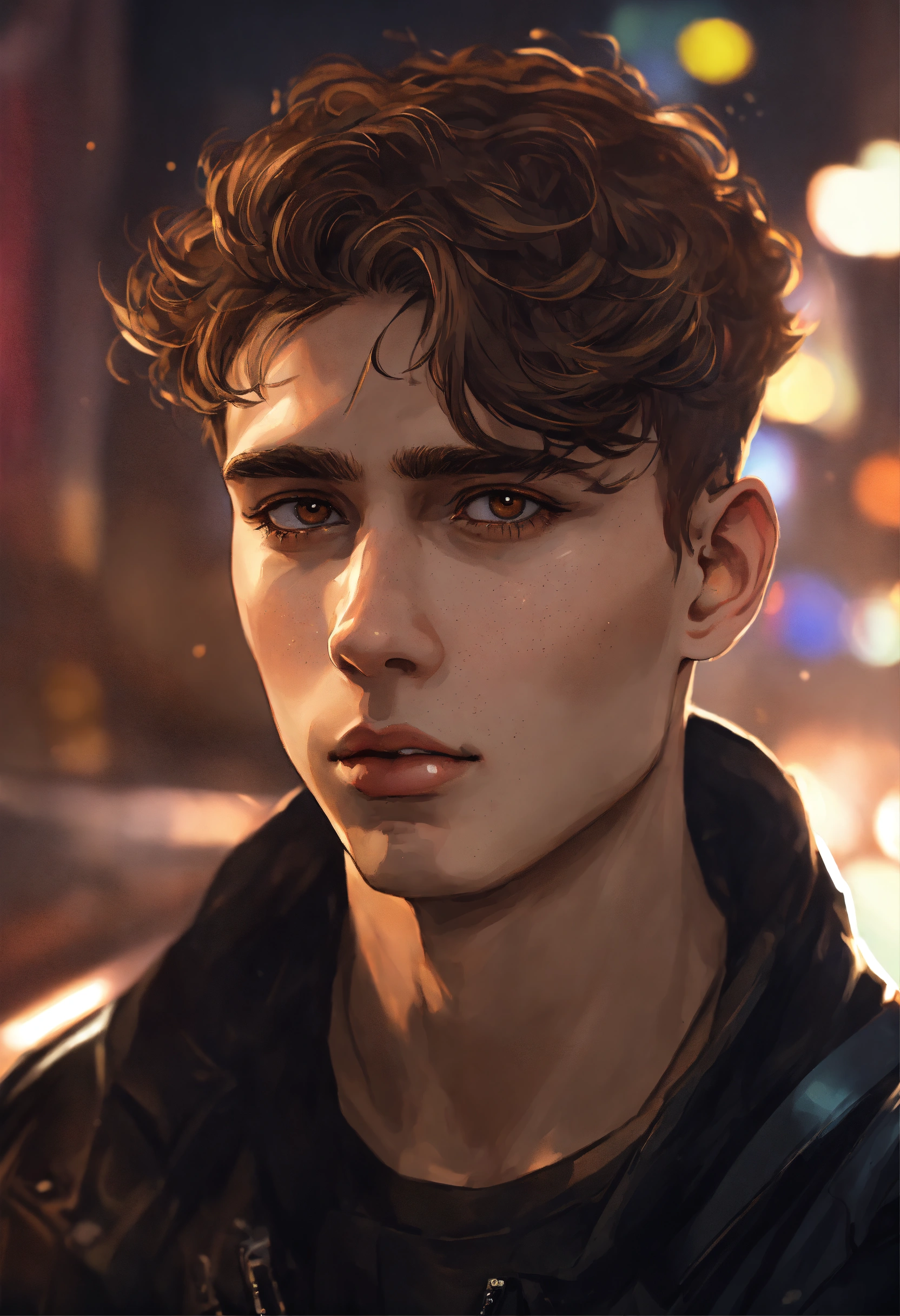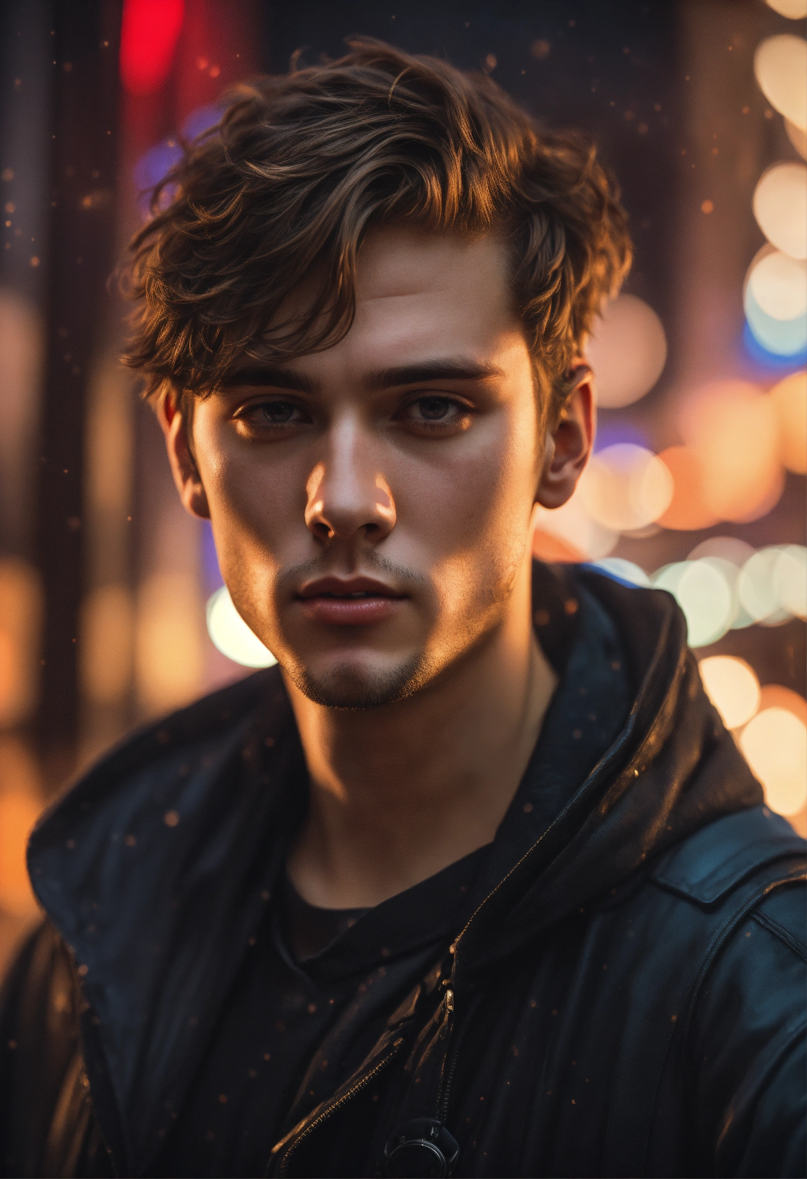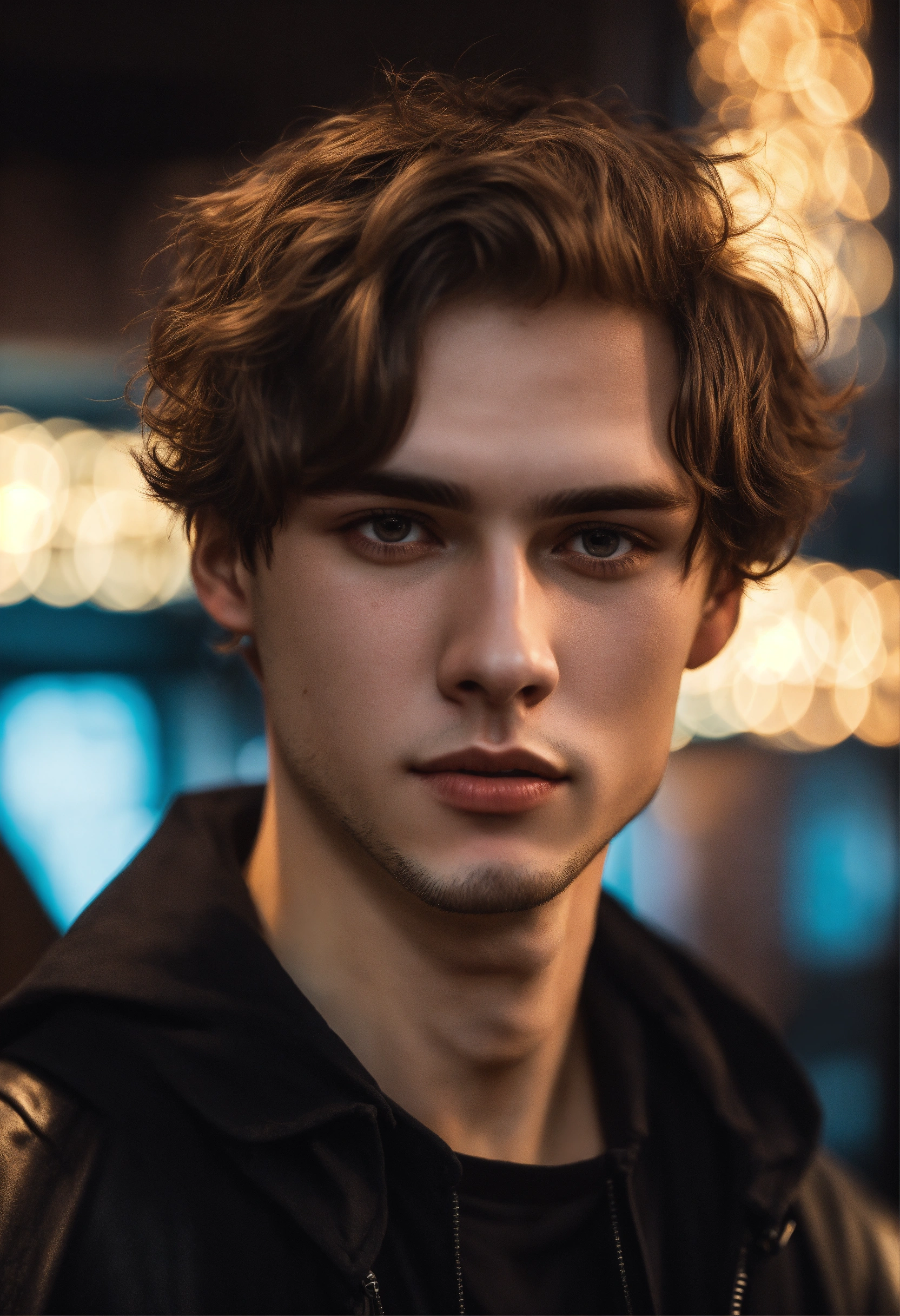 Highly detailed portrait of russian young man 25 years old, thin, brown short wavy hair, clean shaven, brown eyes, kind eyes, clean, handsome, cyberpunk, wearing black corpo clothes, cartoon realism, black, grunge aesthetic!!! bokeh
