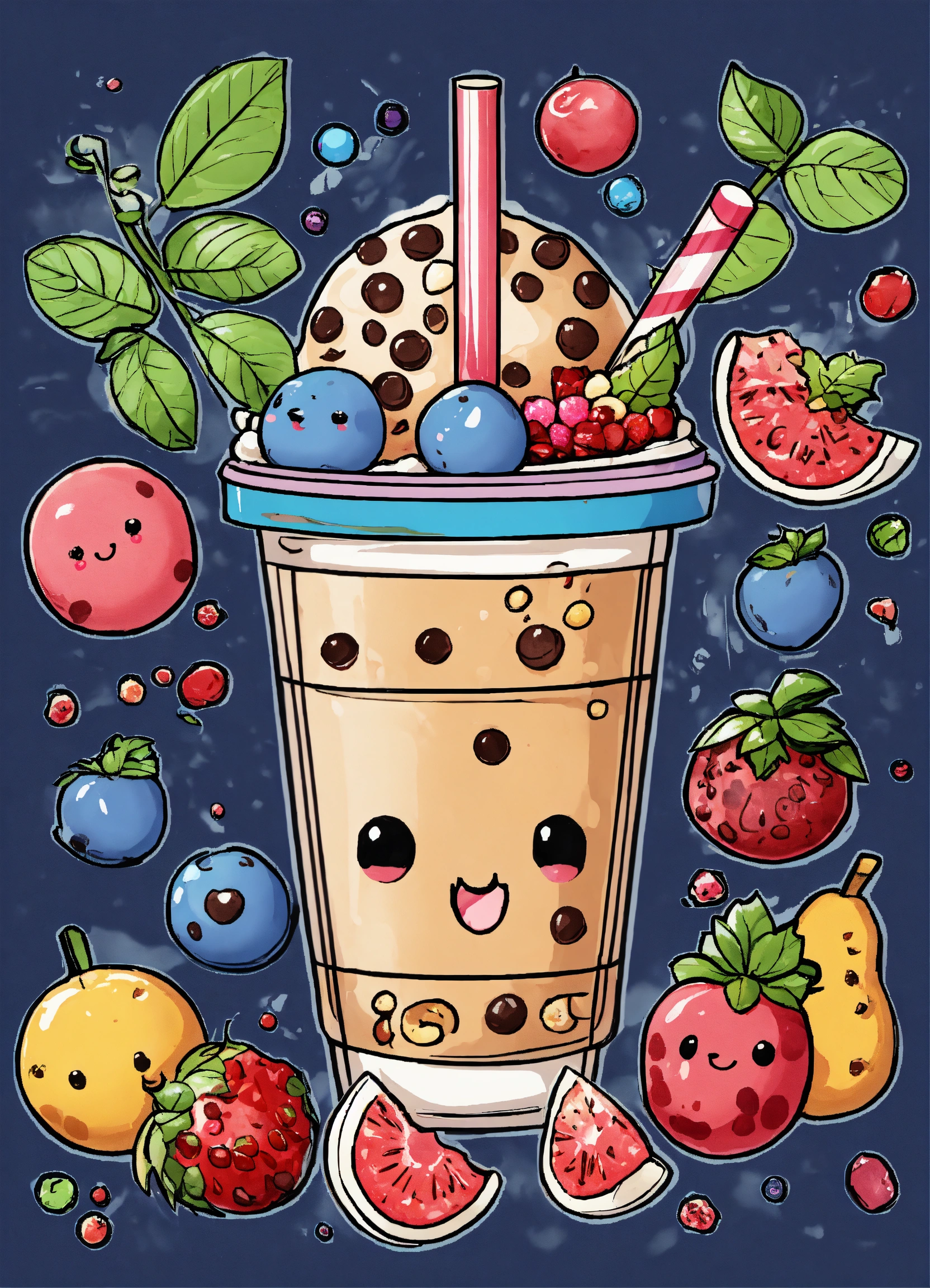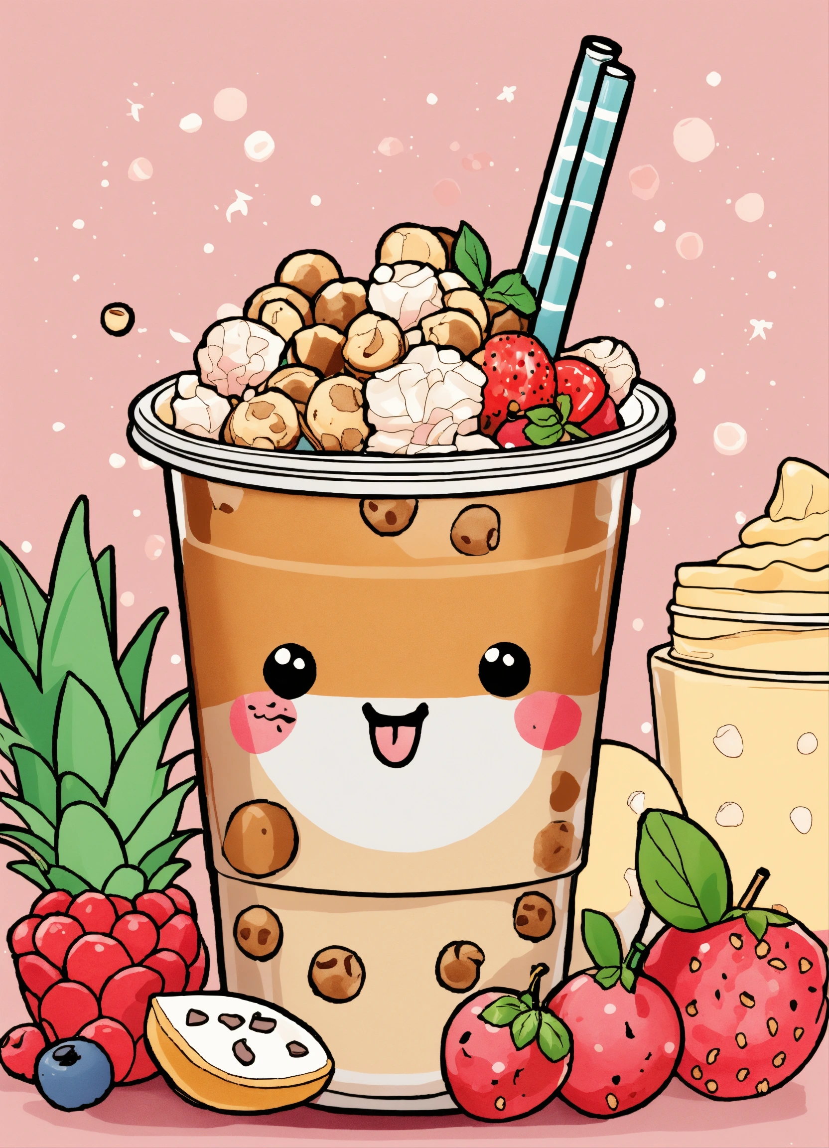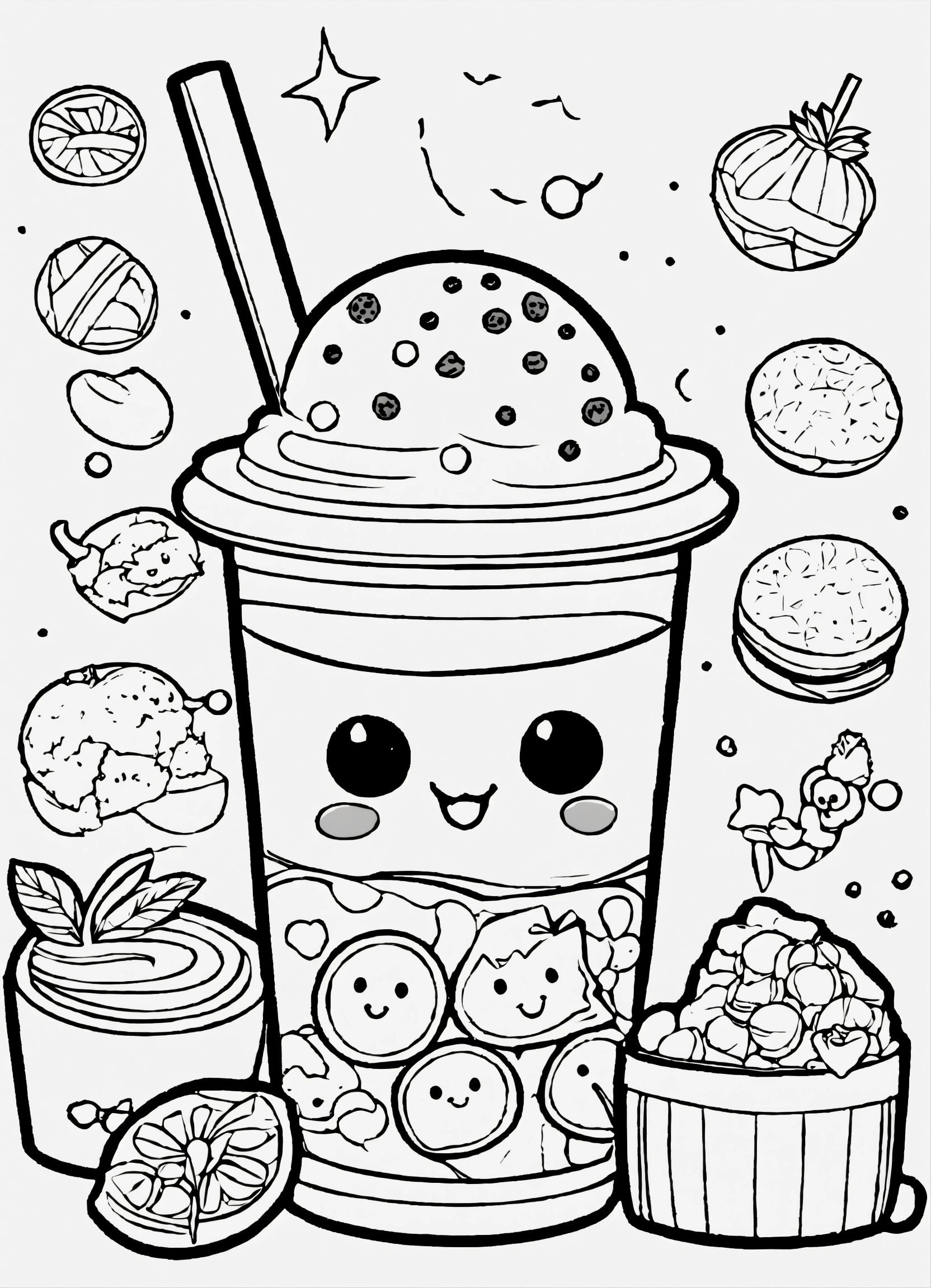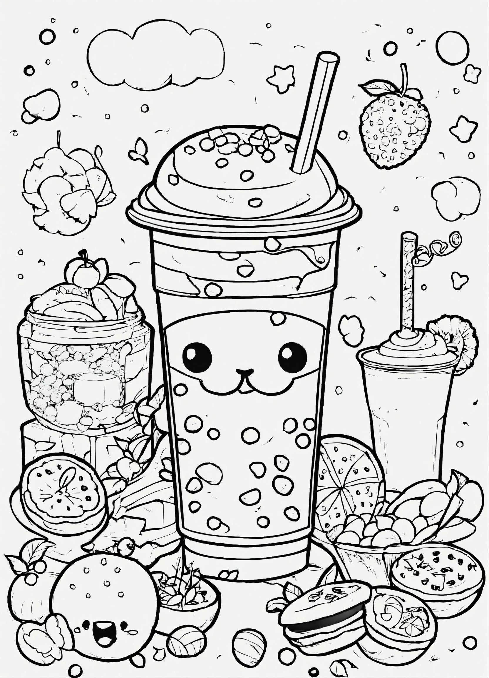 A cute bubble tea cup with kawaii fruits and sweets and cookies for coloring page
