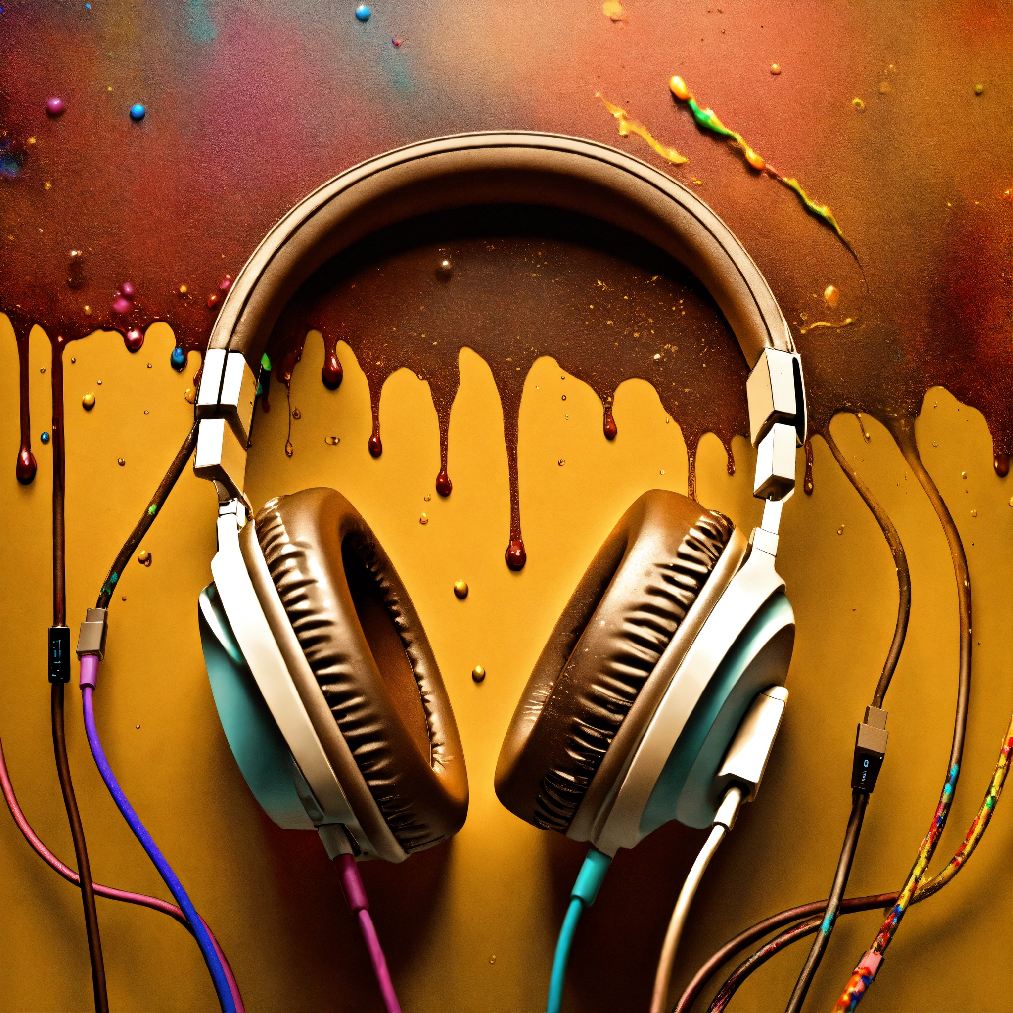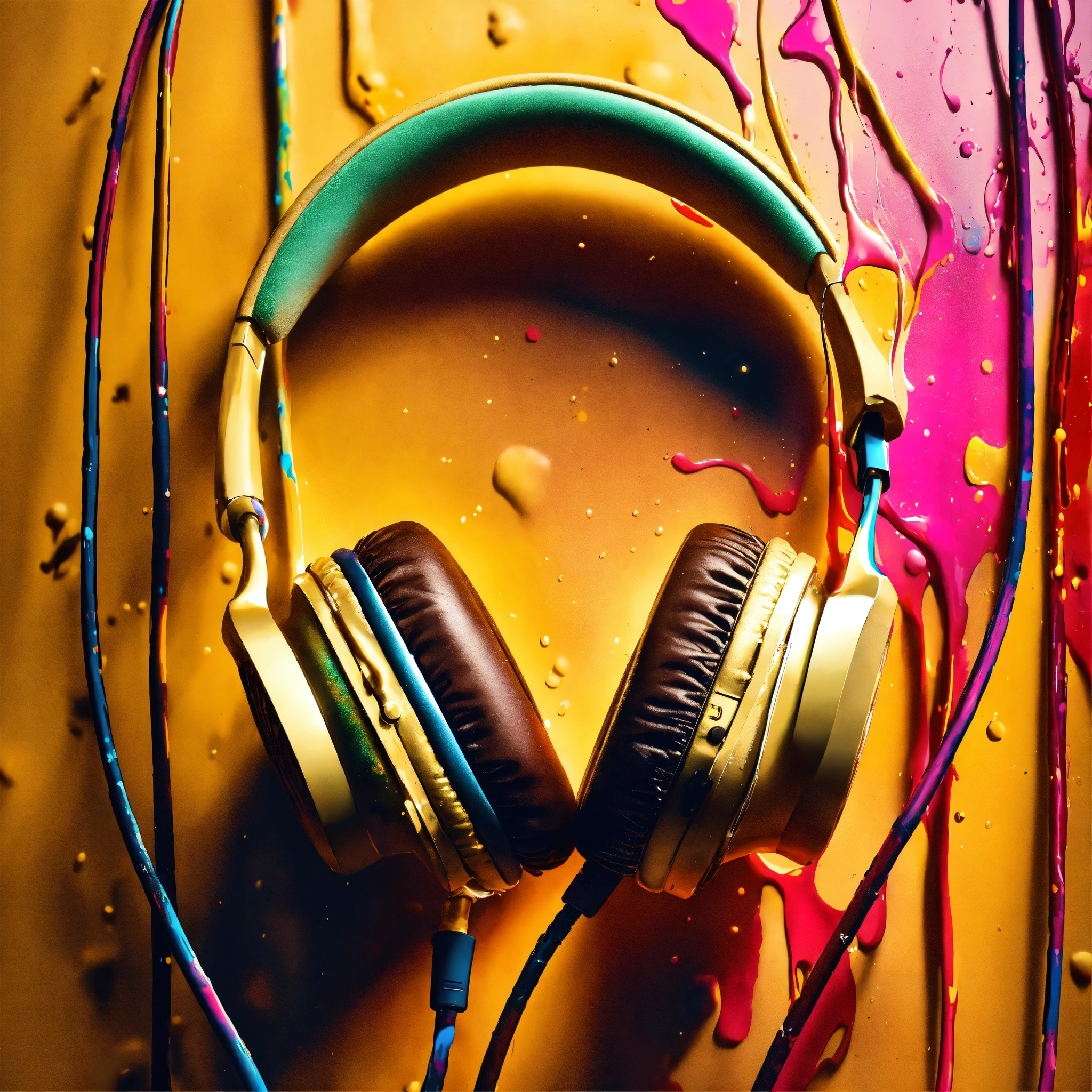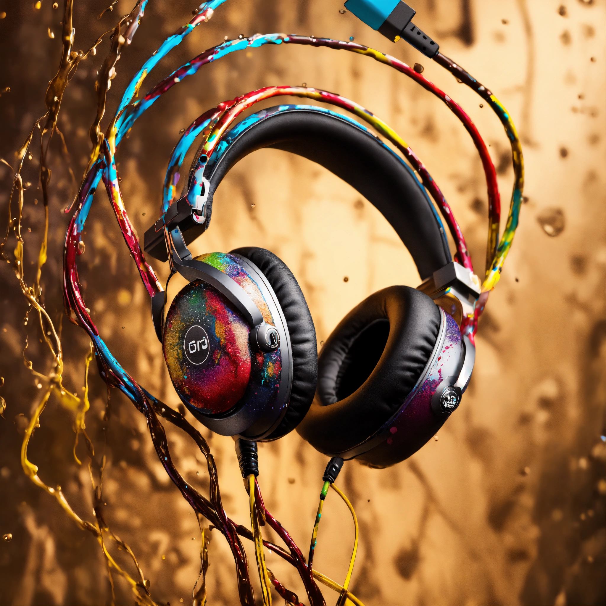 Drip paint headset. usb-c cables tangled with hdmi cables colorful brilliant tones. paint splatters in sepia toned background. water condensation effect, photograph, hyper realistic, intricate detail