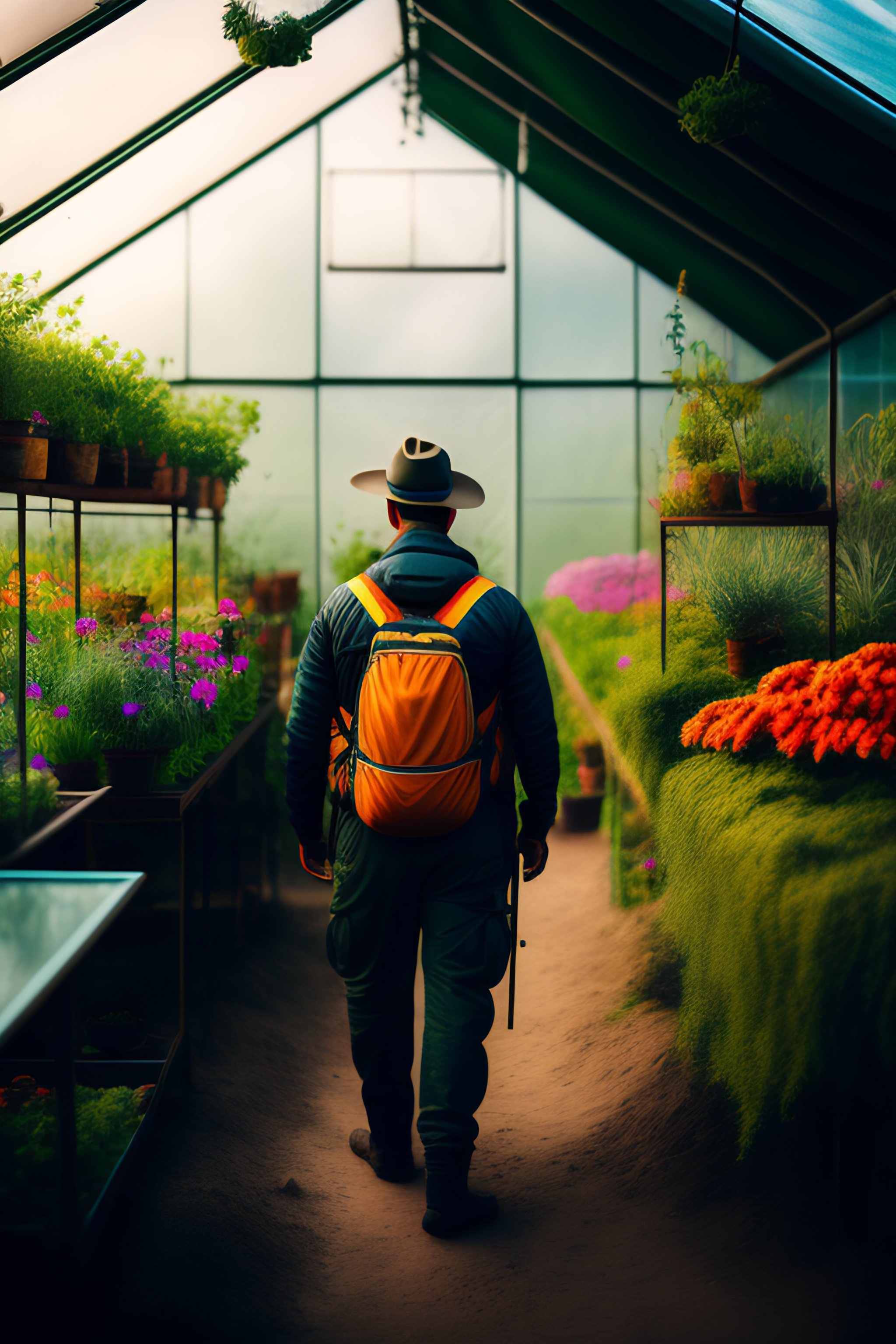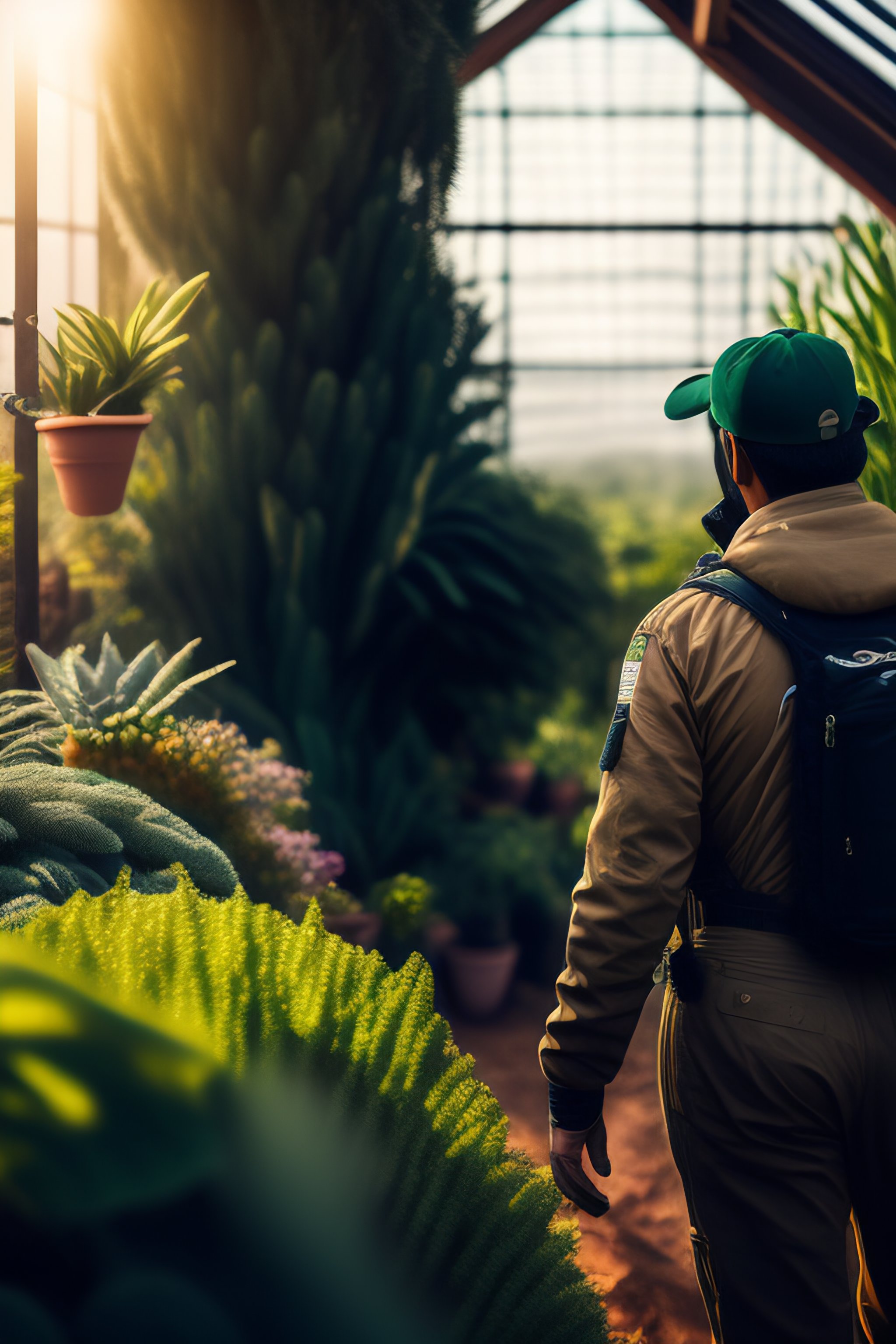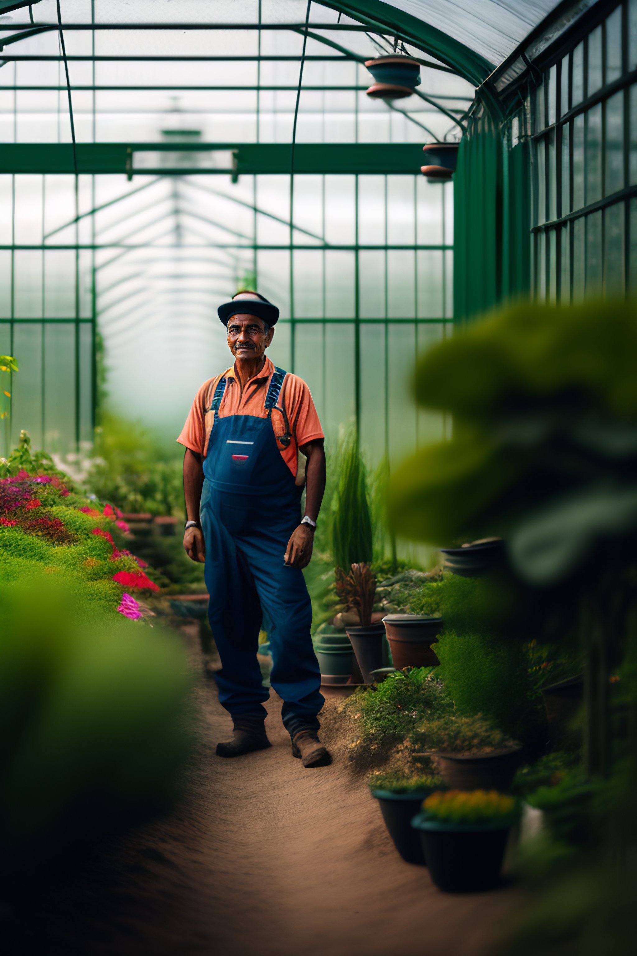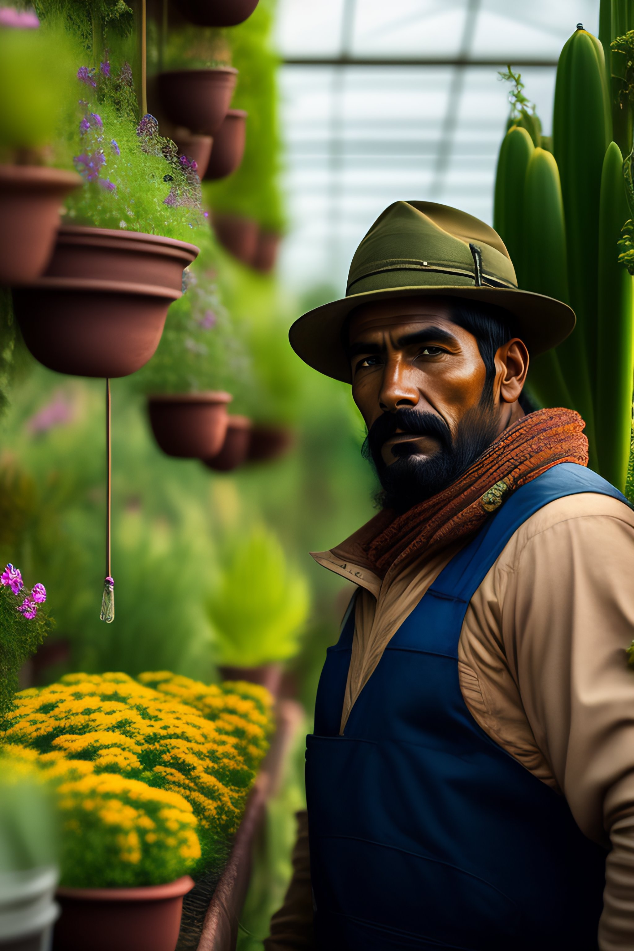 Portrait of a gardener in a greenhouse on a hill in mexico