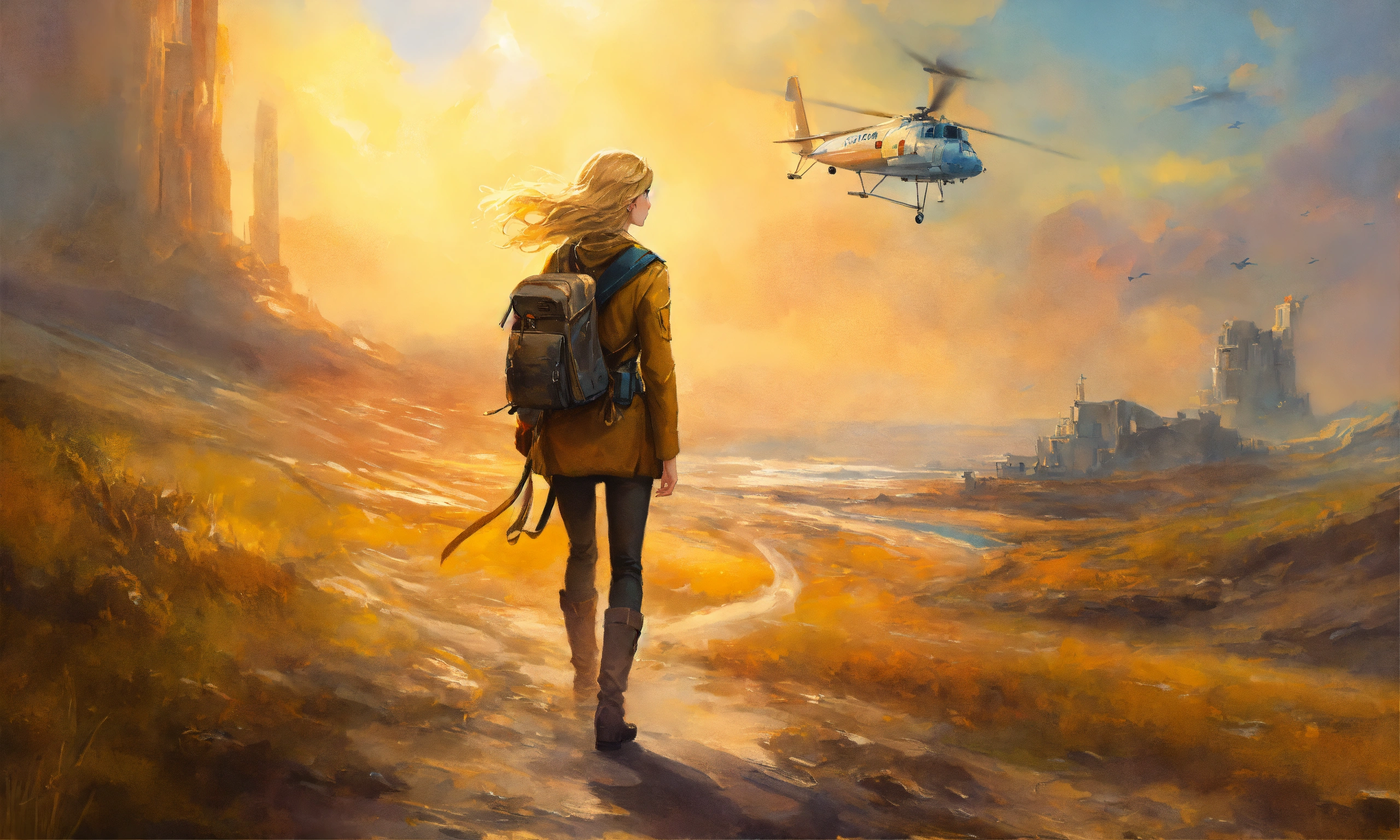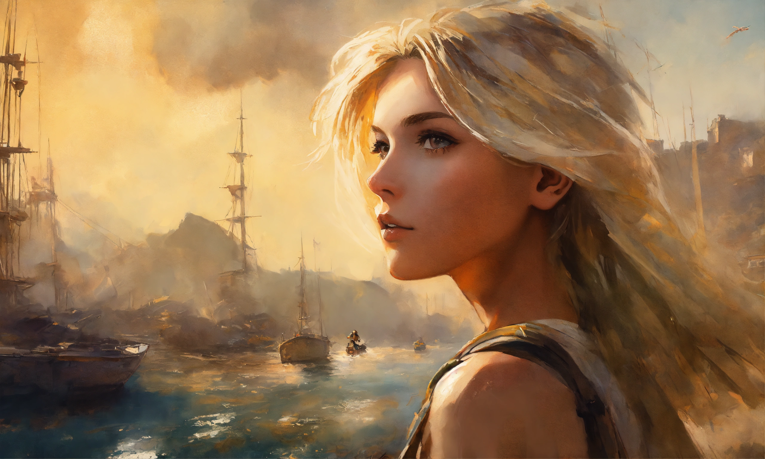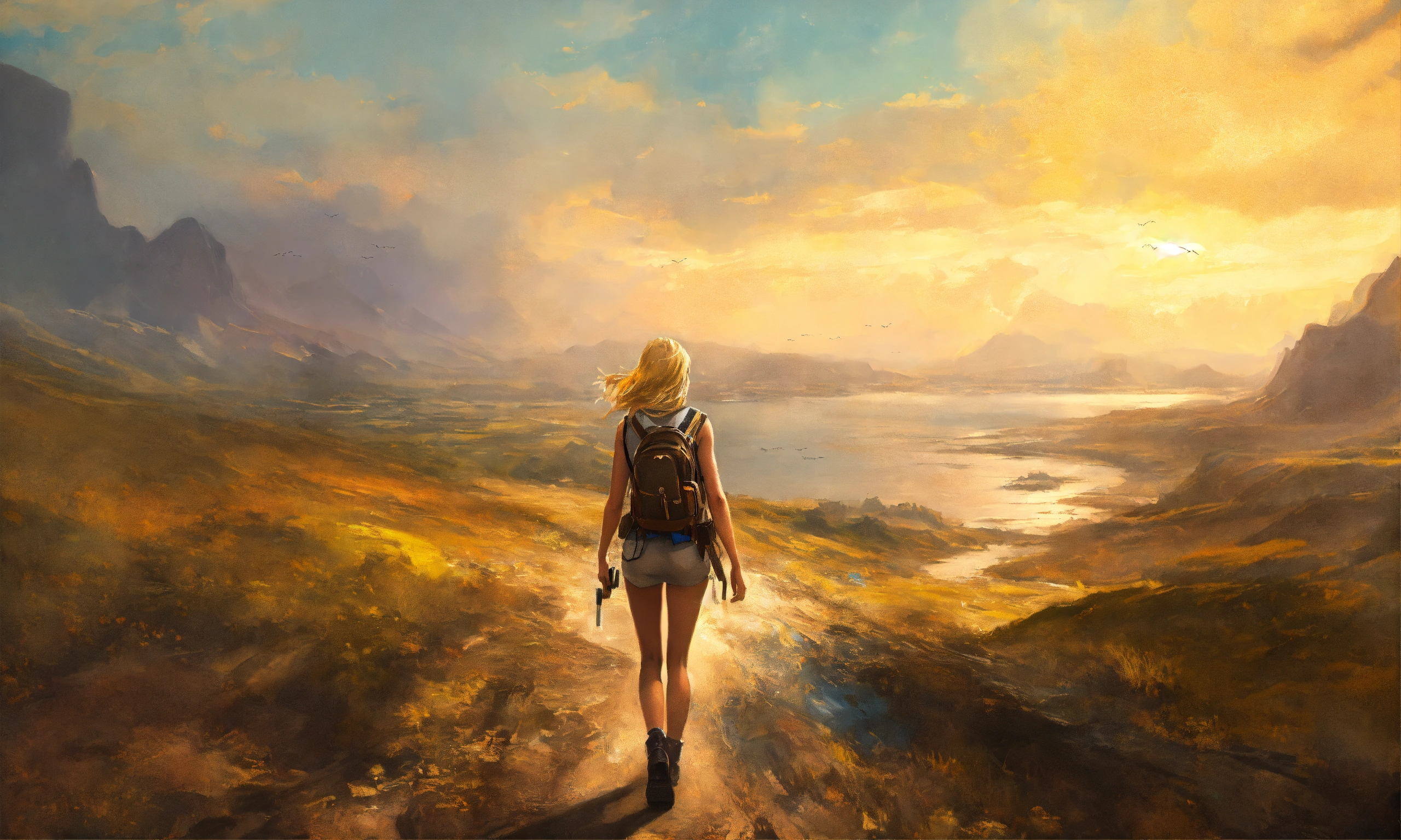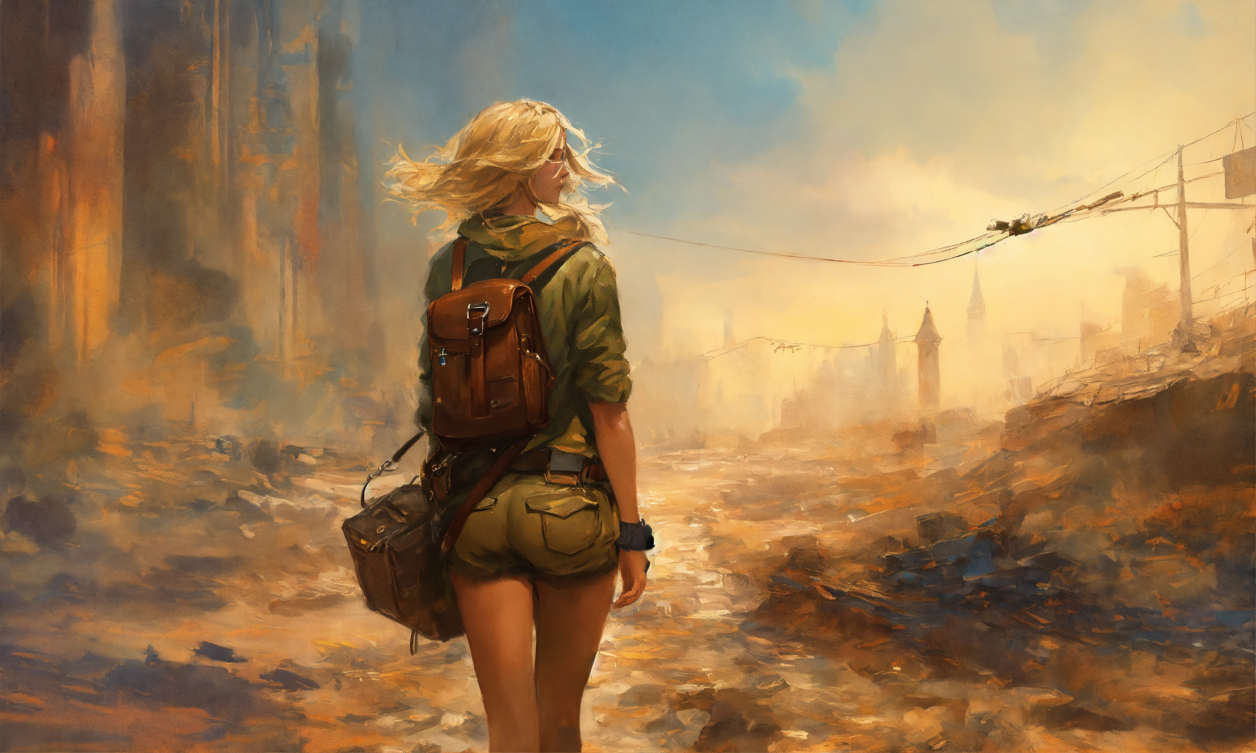Concept art of a dirty blonde young woman navigating the world, heroes journey, oil painting style, highly detailed, brush strokes, 8k