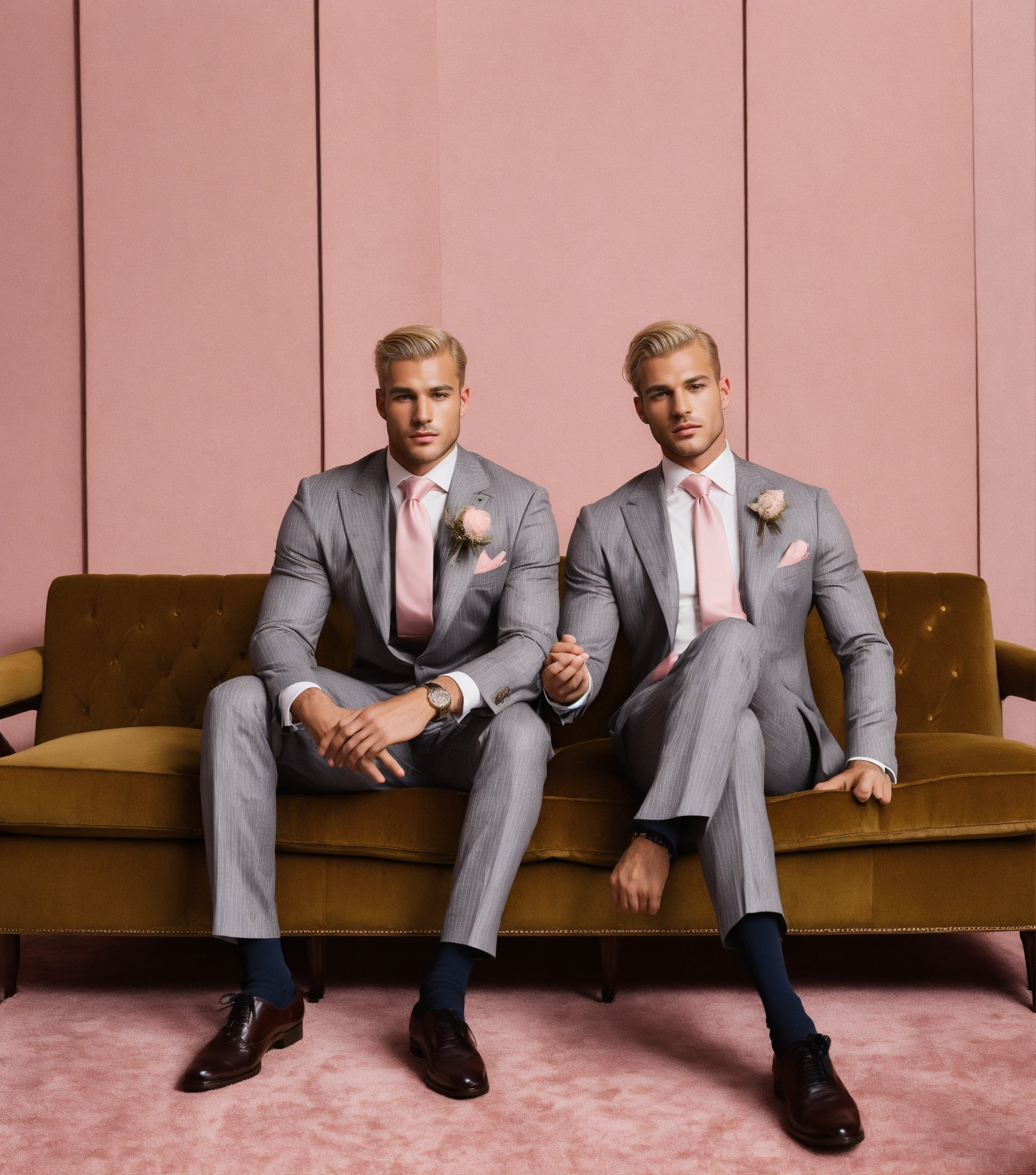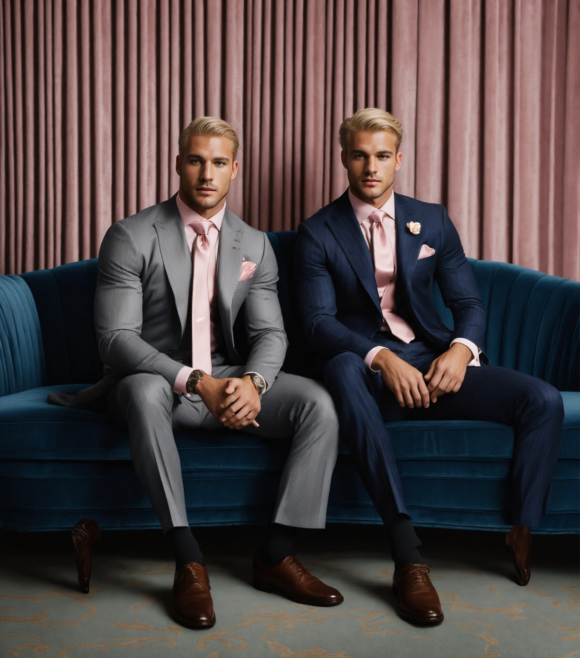 Two muscled gentlemen, in grey pinstripe vested suit, pale pink tie, blonde brushed hair, seating on a velvet sofa, embracing