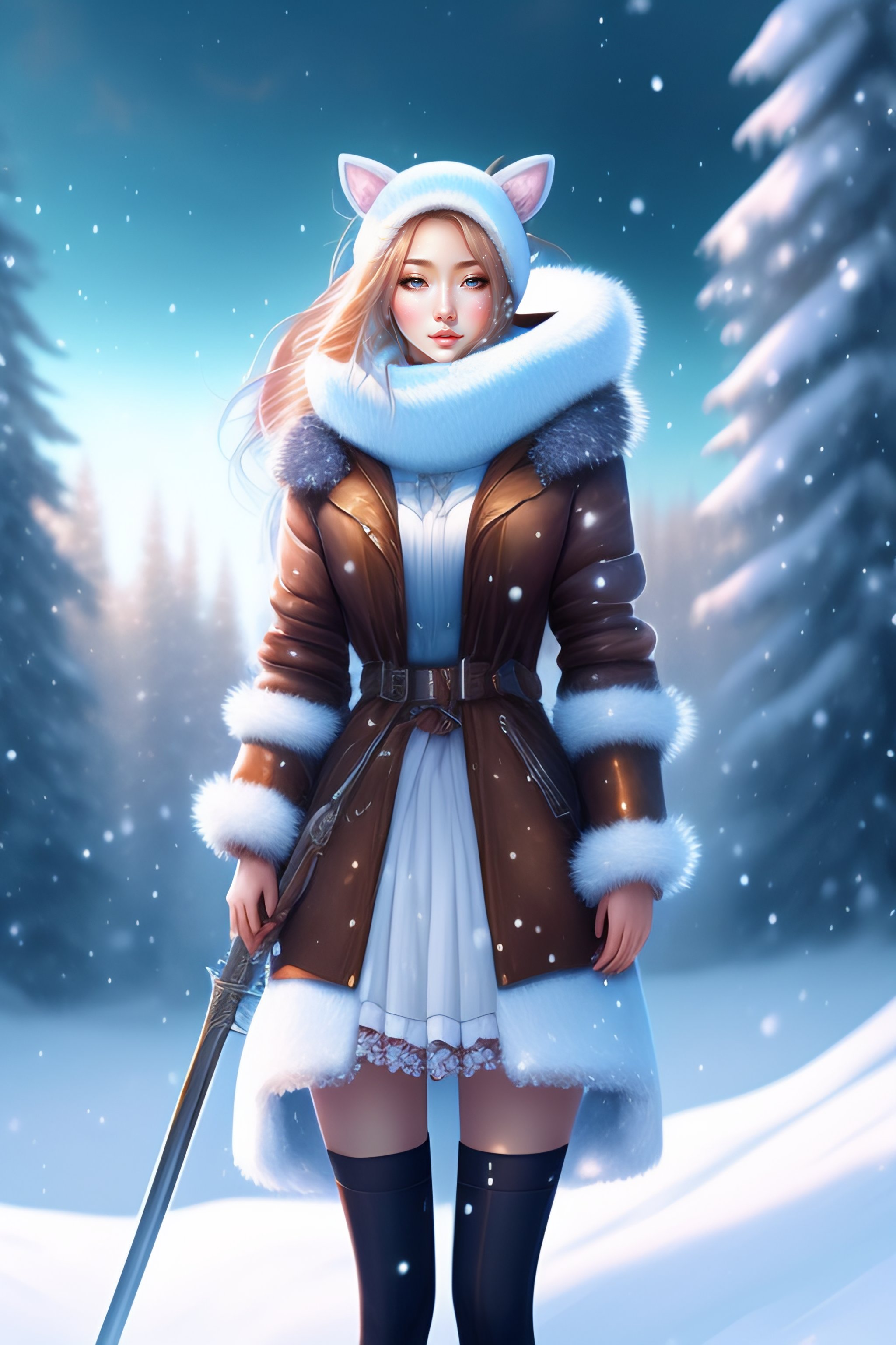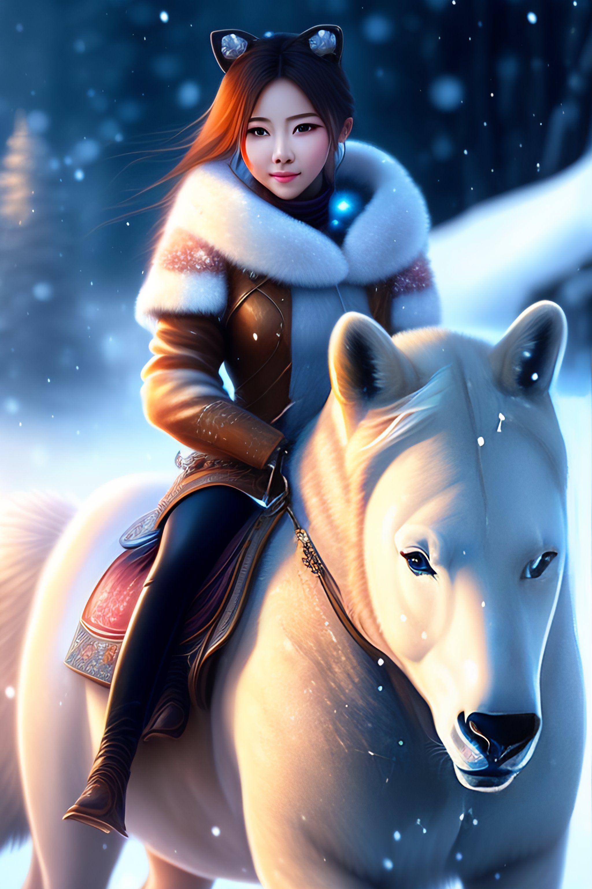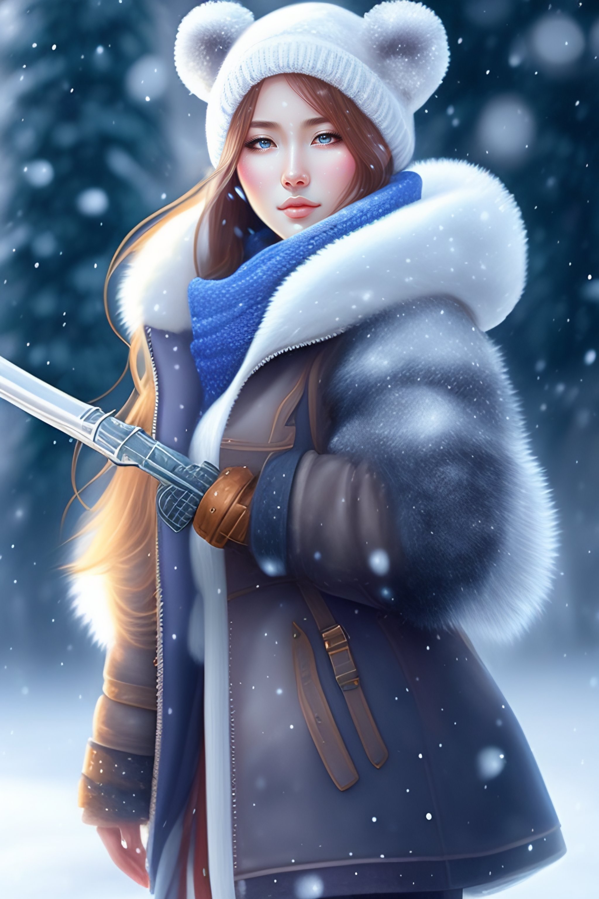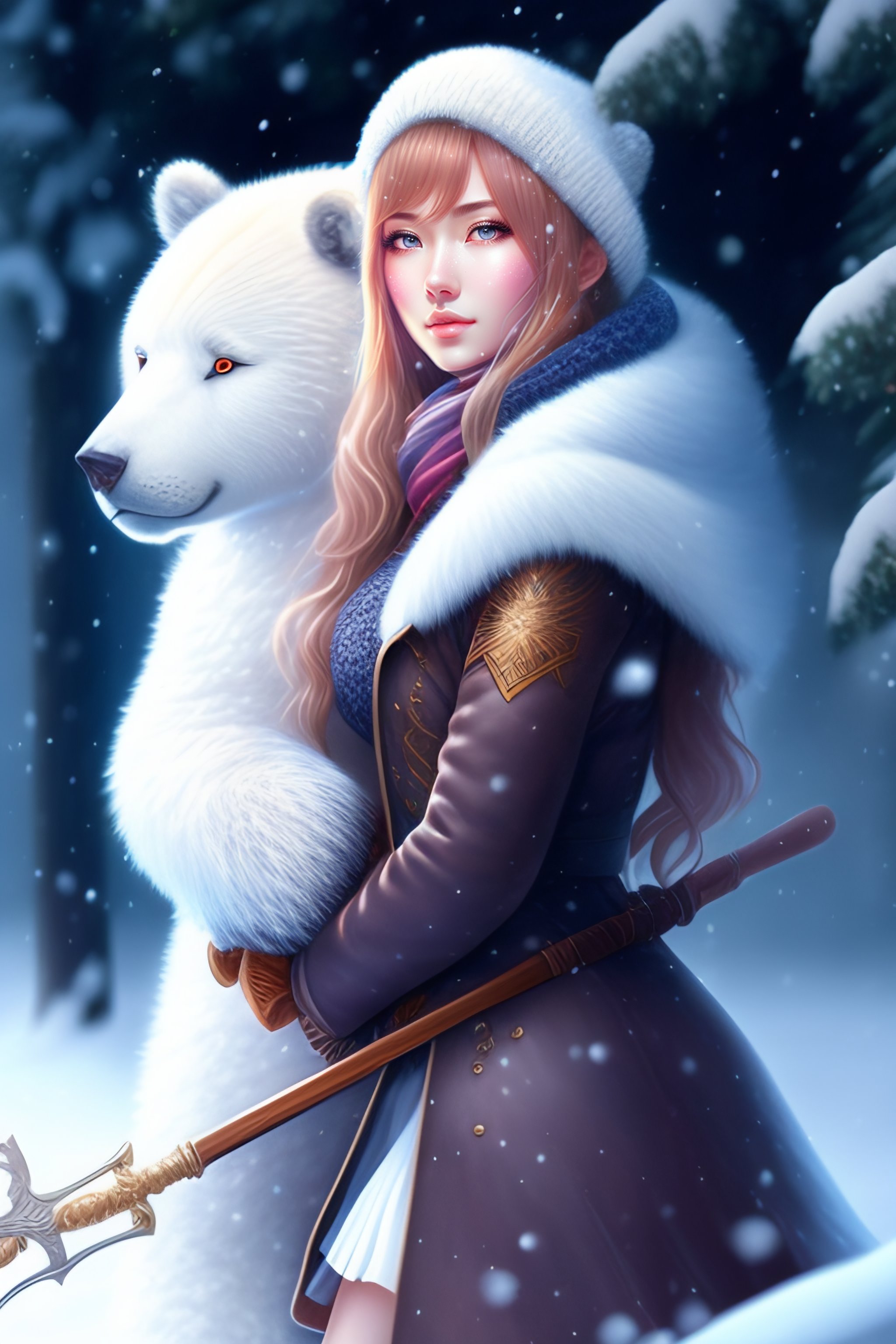 Anime girl with beauty, wearing jacket, riding on big white bear holding weapon, in winter snow falling, beautiful, fantasy world, 4k, hd realistic paintig