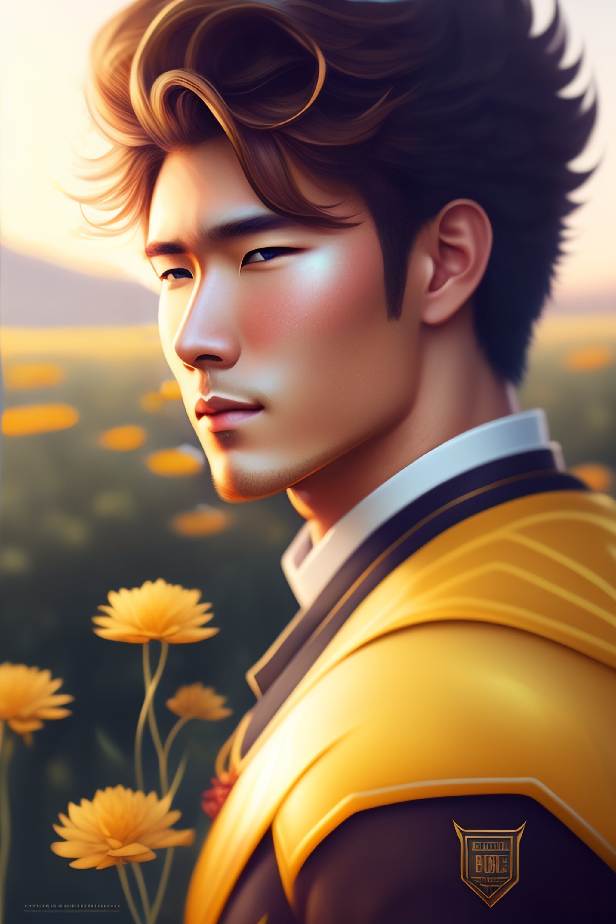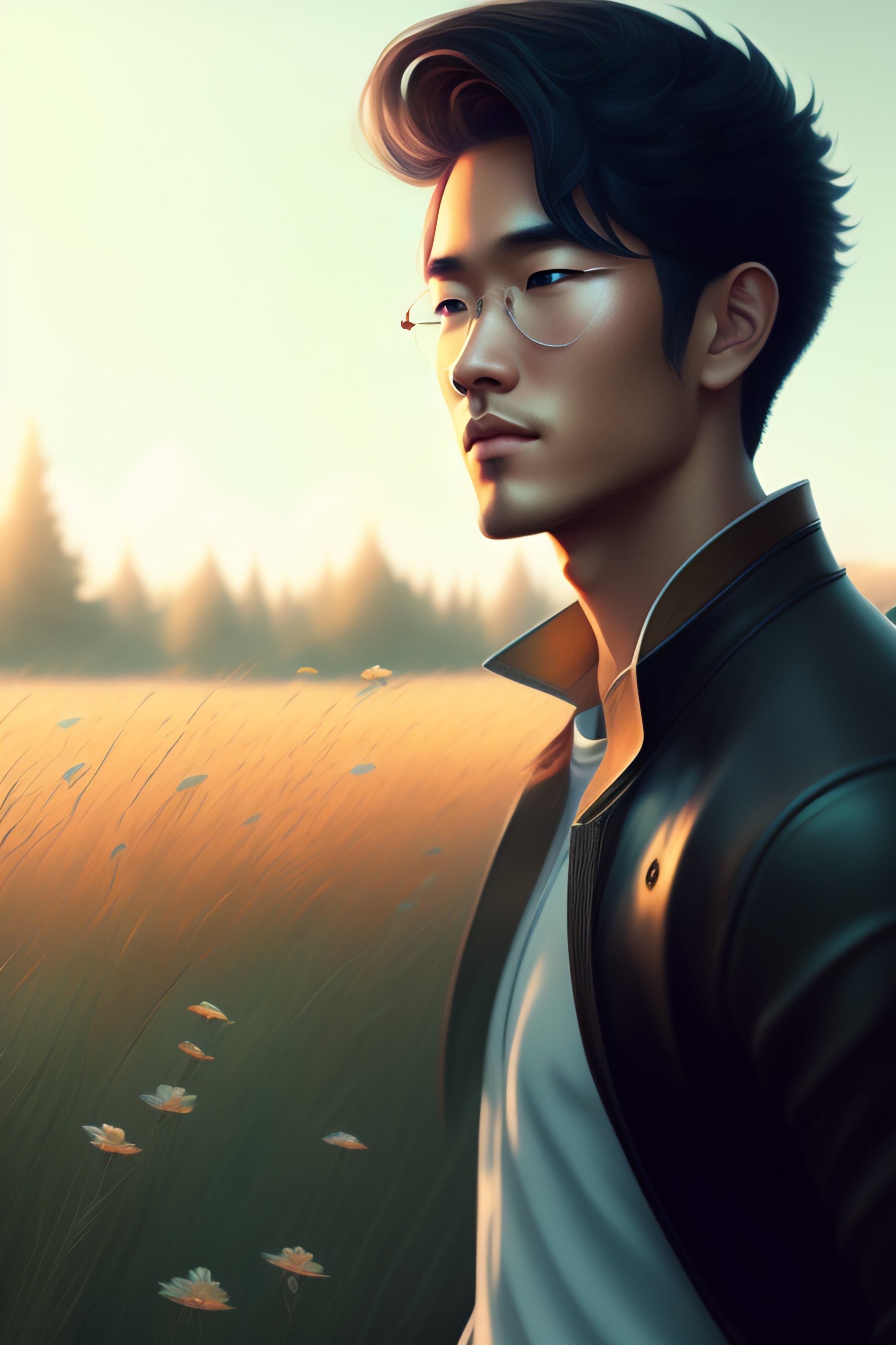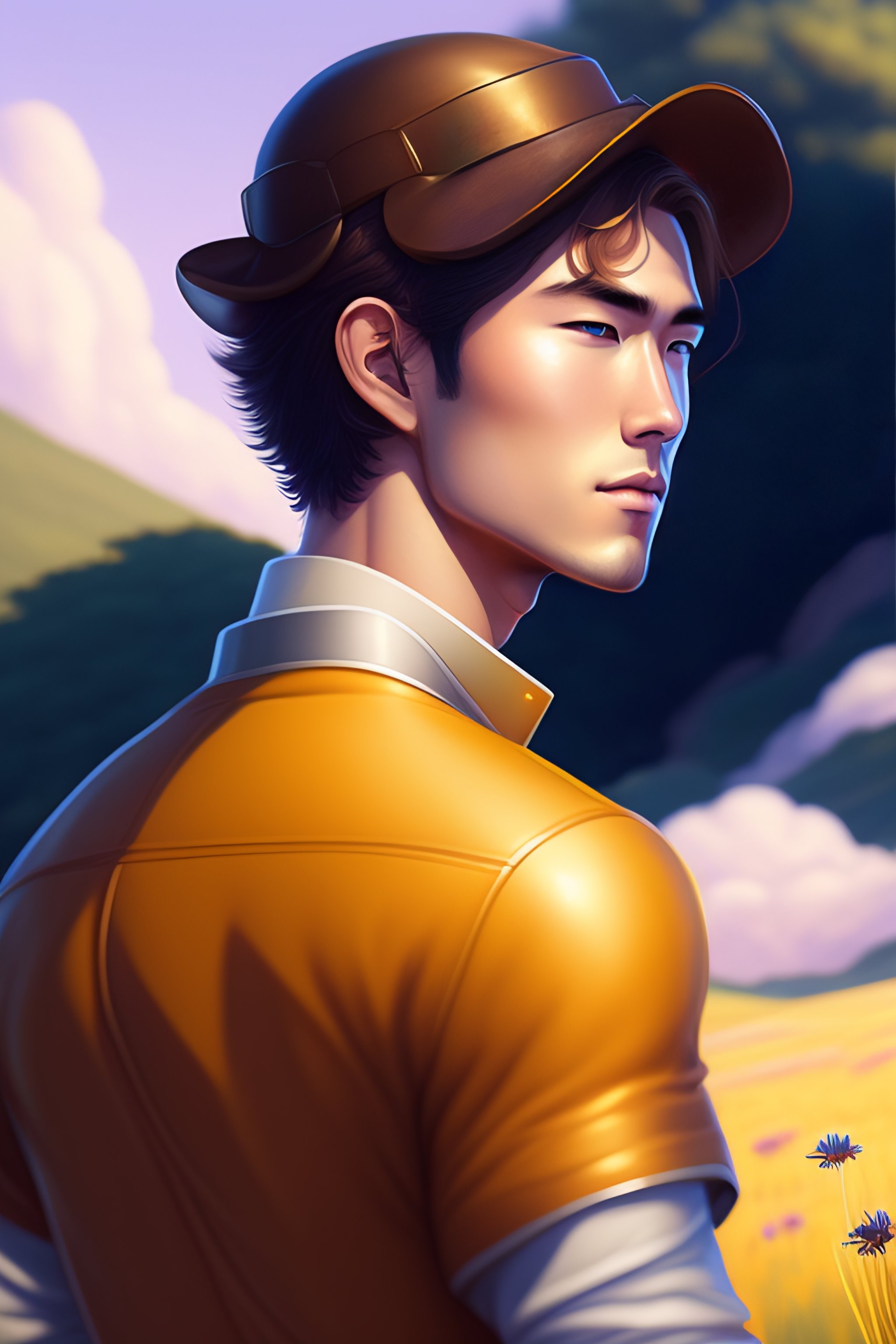 View of gorgeous meadow with hot young guy, pendleton ward, magali villeneuve, artgerm, rob rey and kentaro miura style, golden ratio, behance, trending on art station