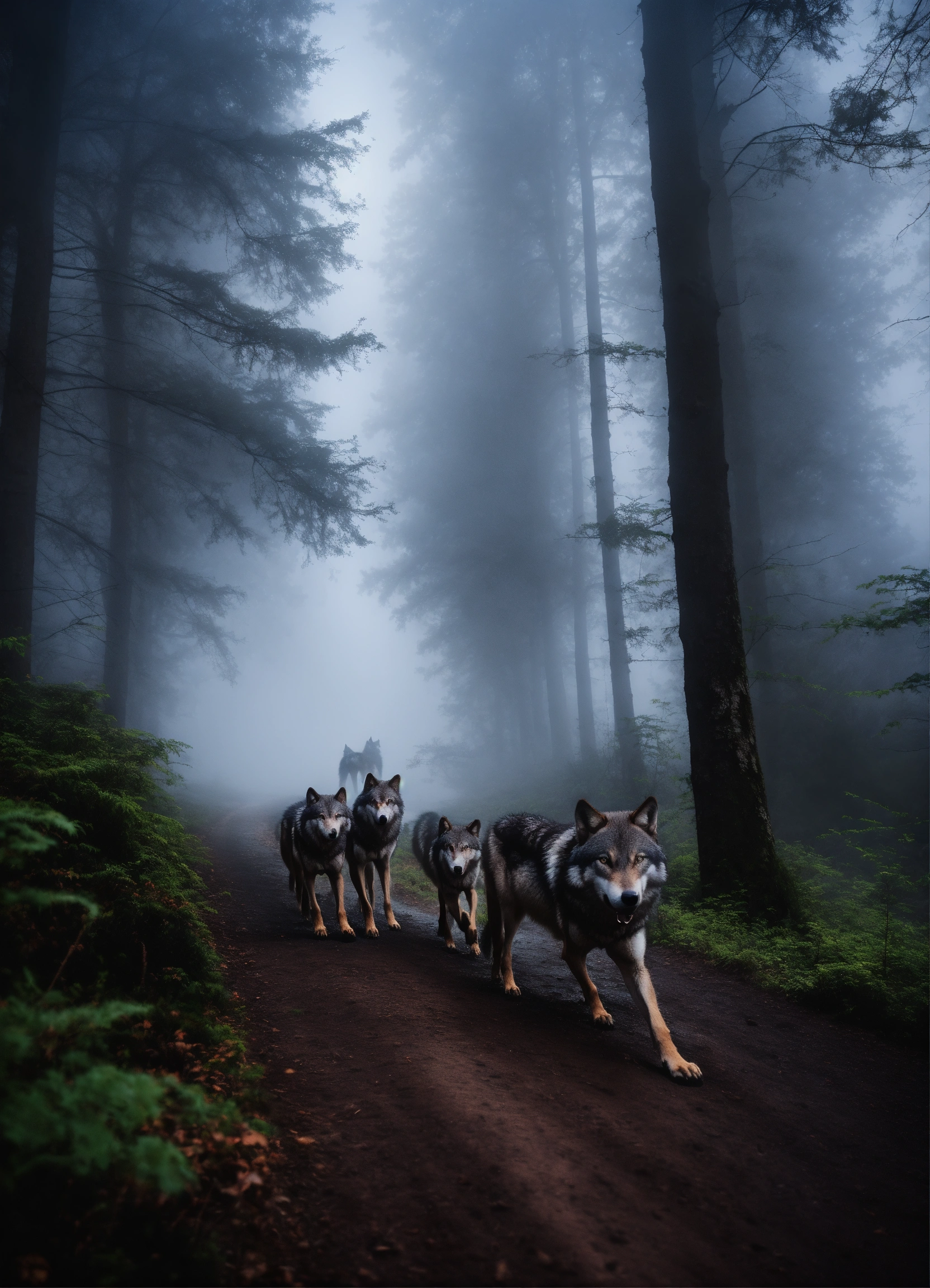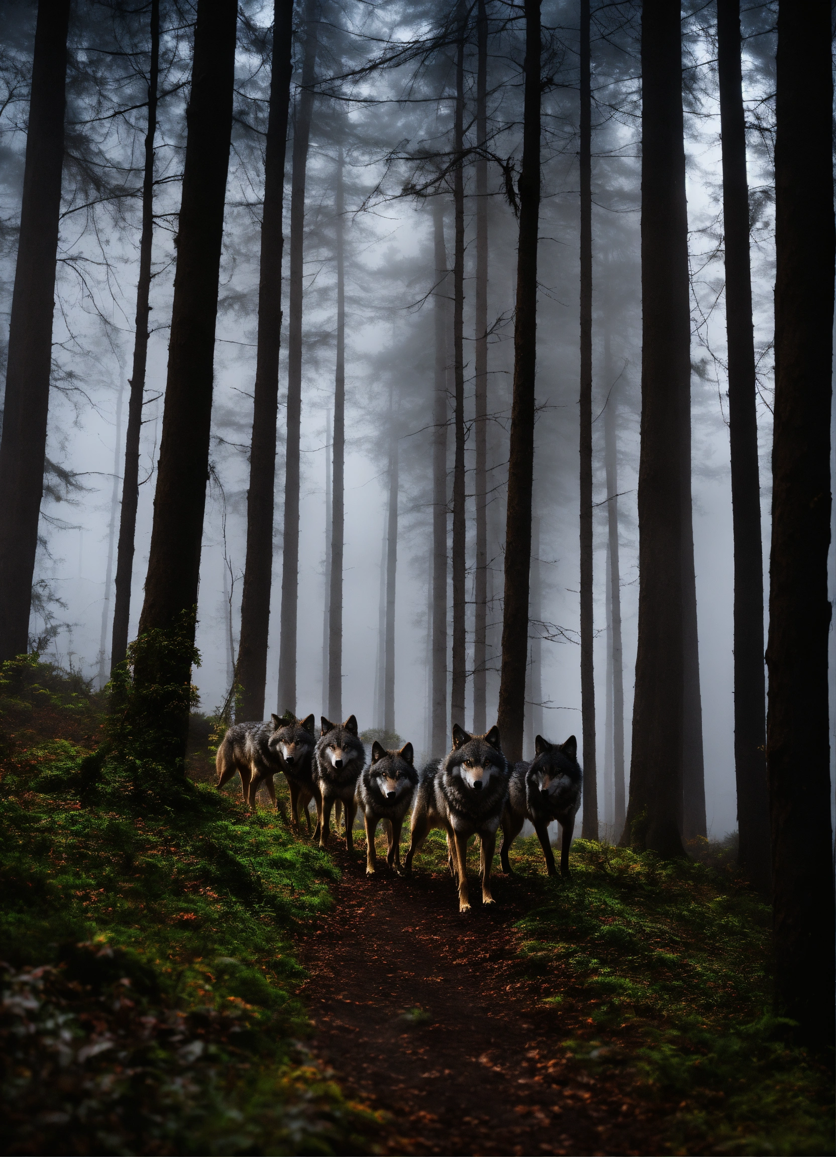 A wolf pack in a black forest