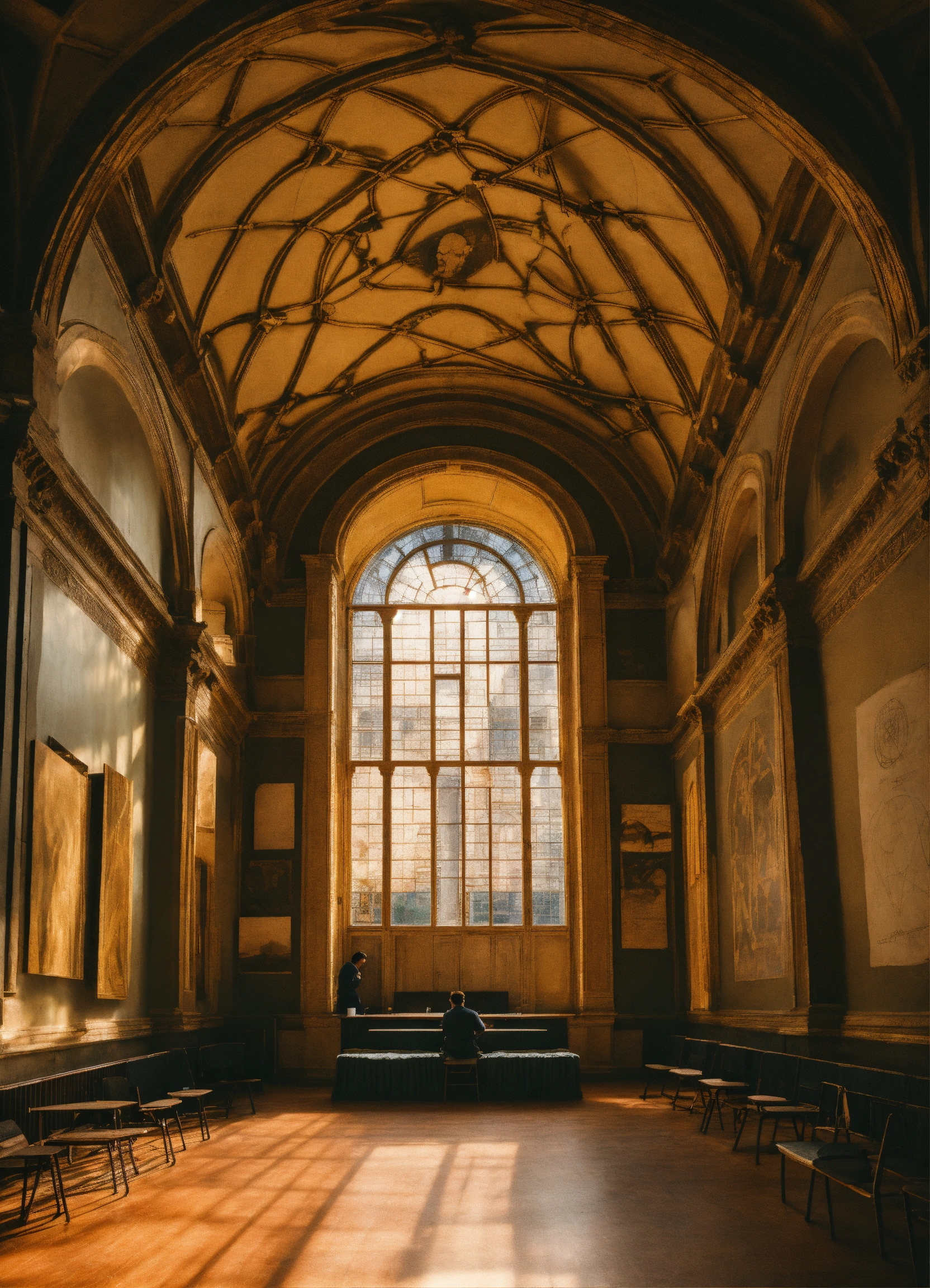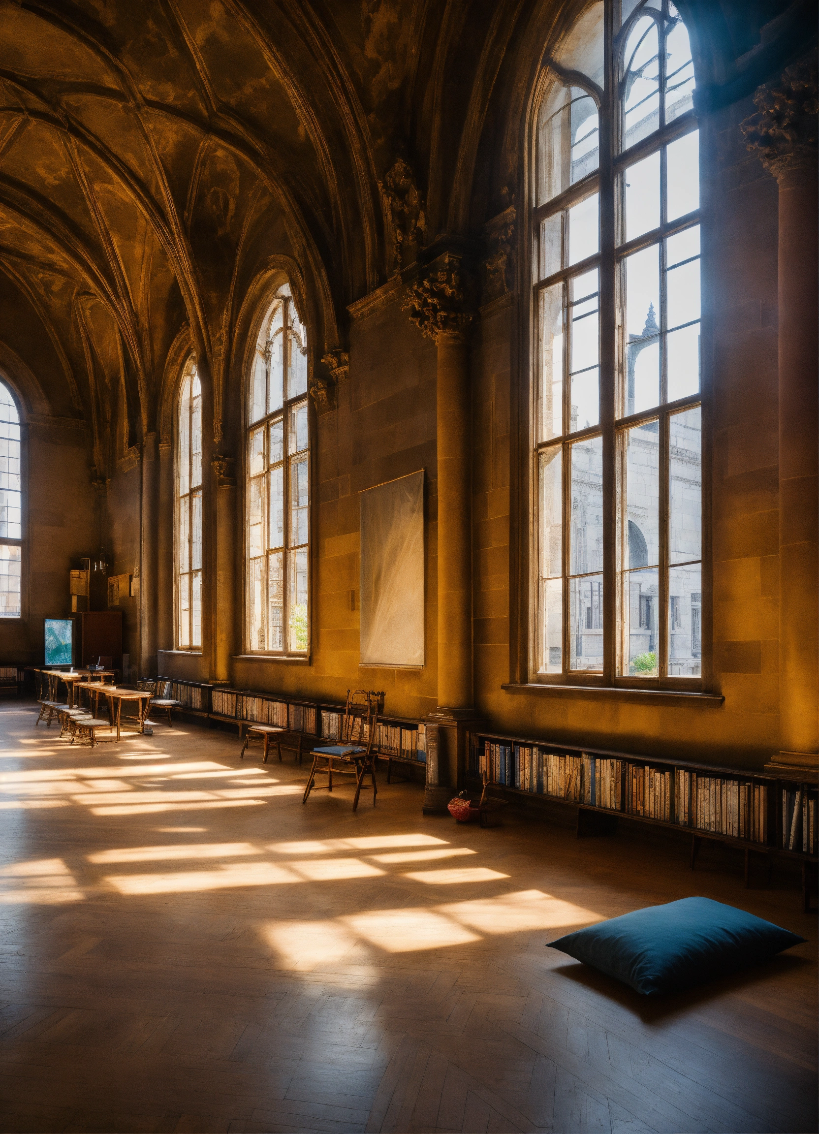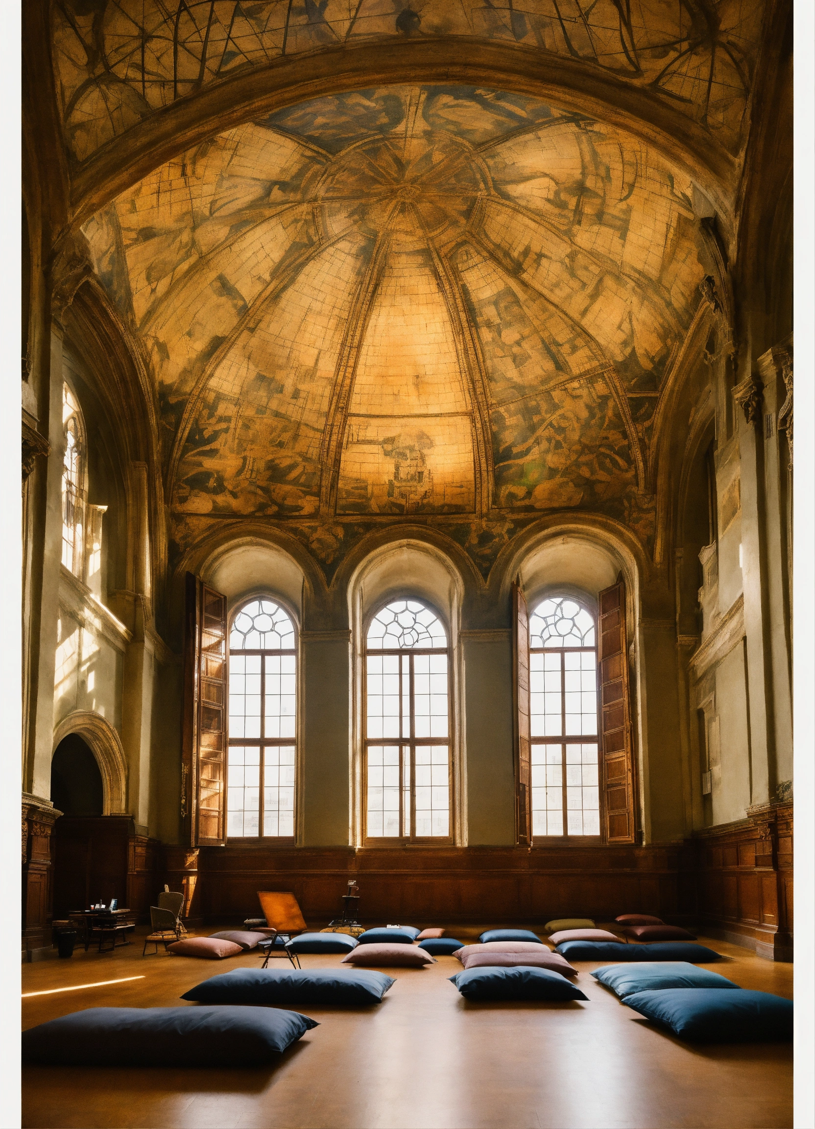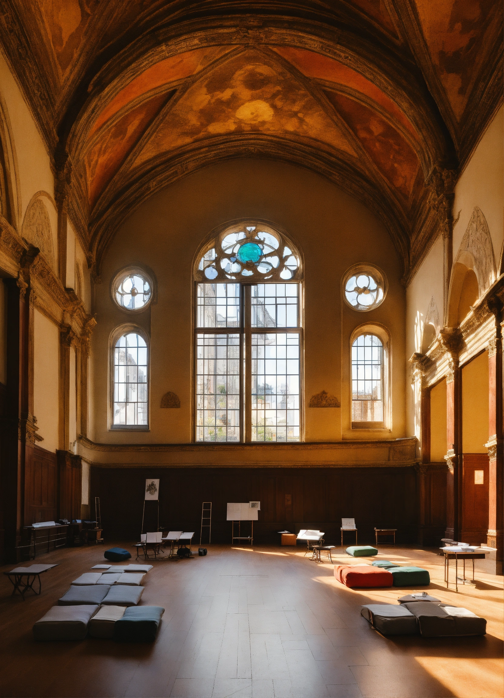 I'm in a large bright hall in a historical building with a beautiful vault and a view from the window, a lot of light, space, the group gathered for the morning session. open windows, air. big flipchart, drawings, skeleton, sacred geometry schemes. time for science and exploration offline. no chairs and tables. all sitting on the pillows on the floor.