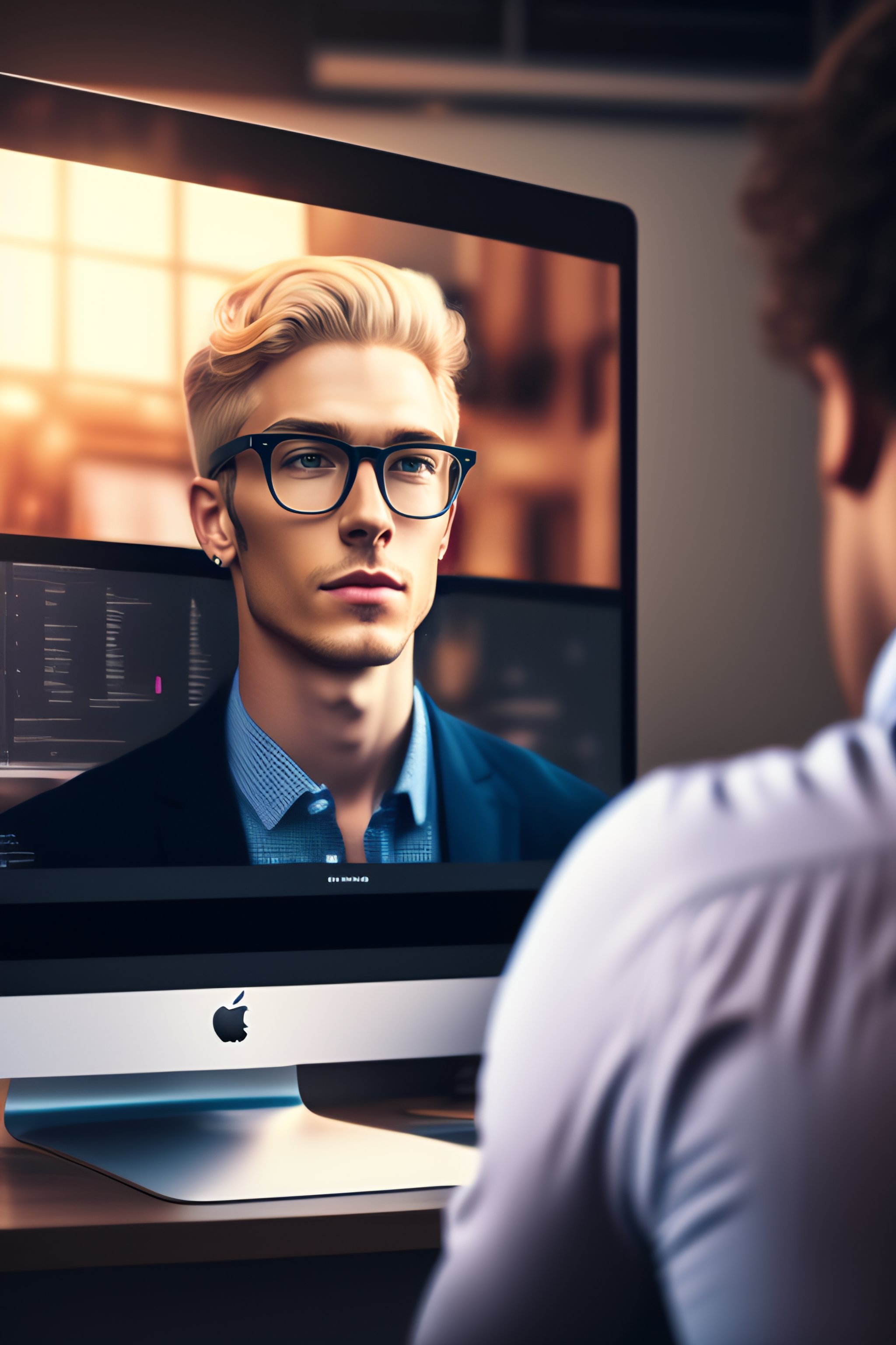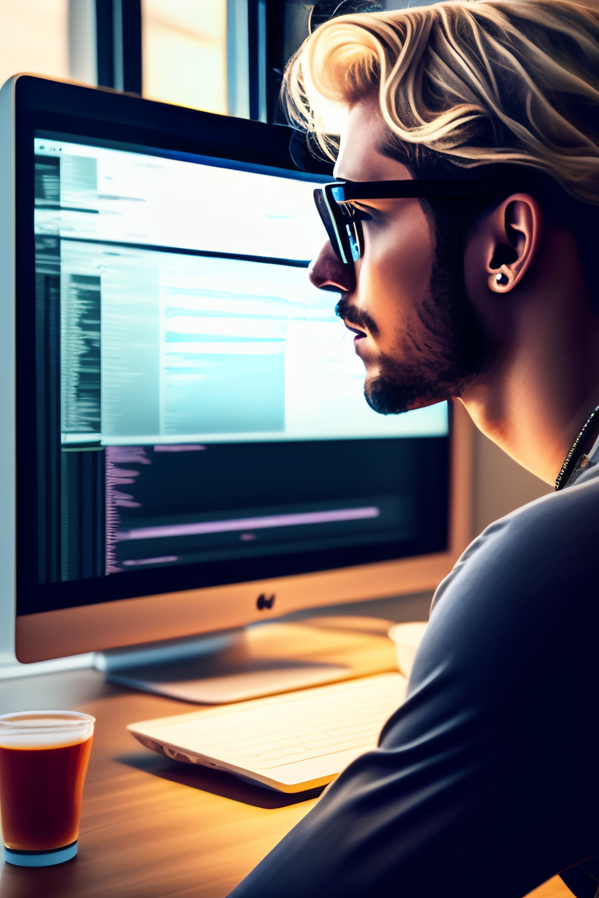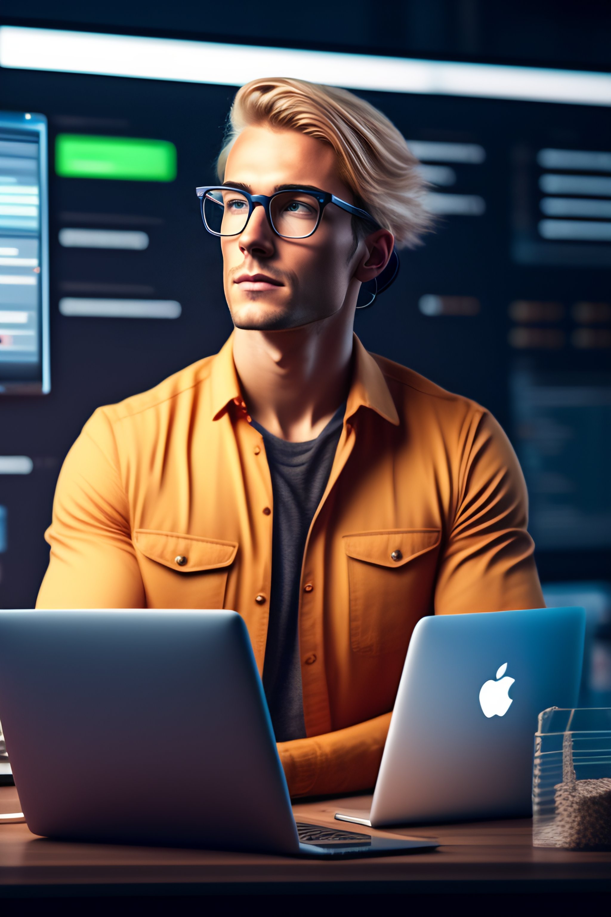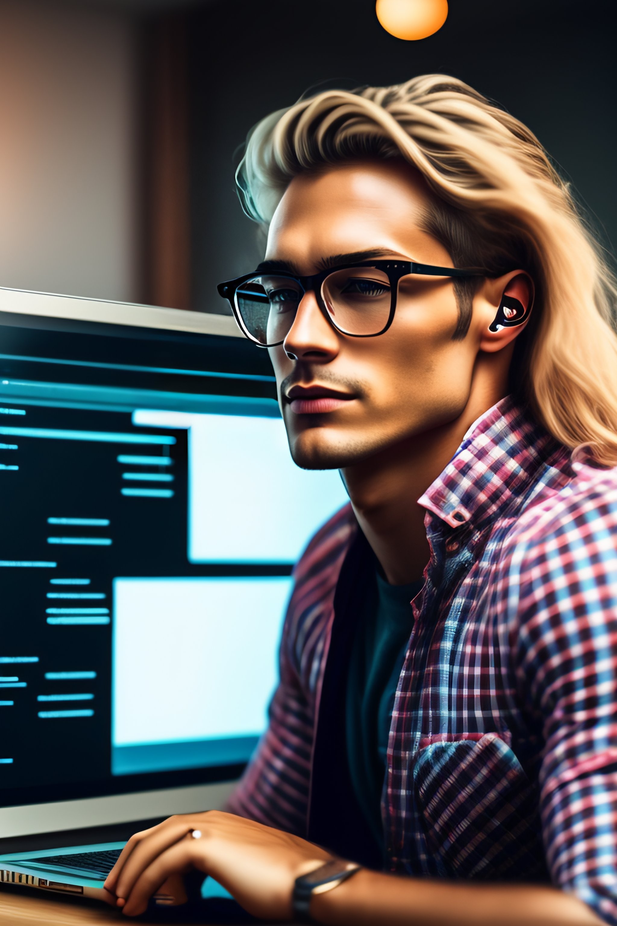 Hipster developer using a mac book to write code with a multi screen setup and air pods in ear, dirty blonde hair, round glasses, check shirt, man