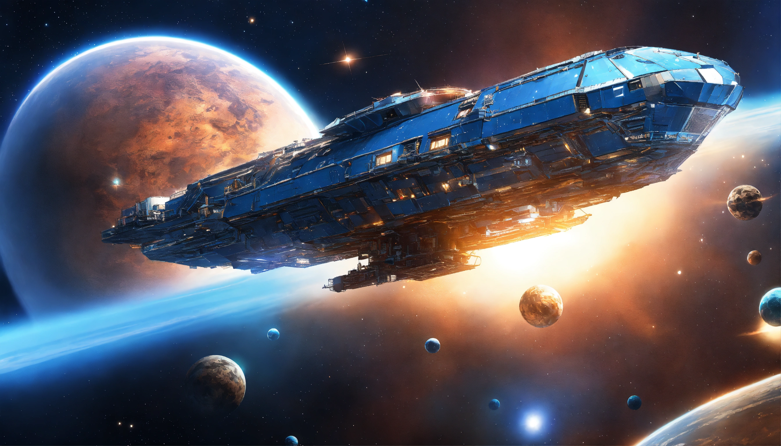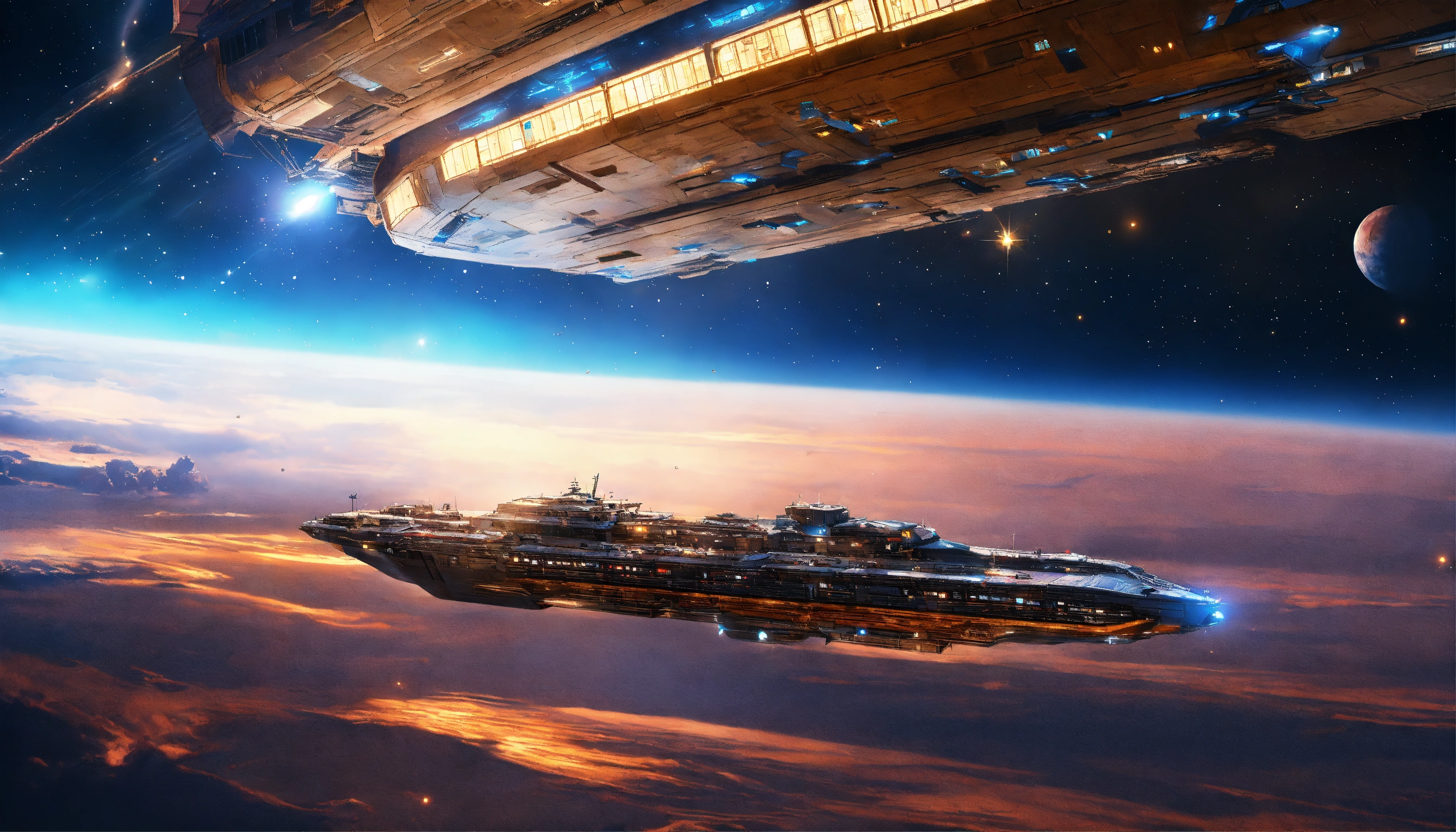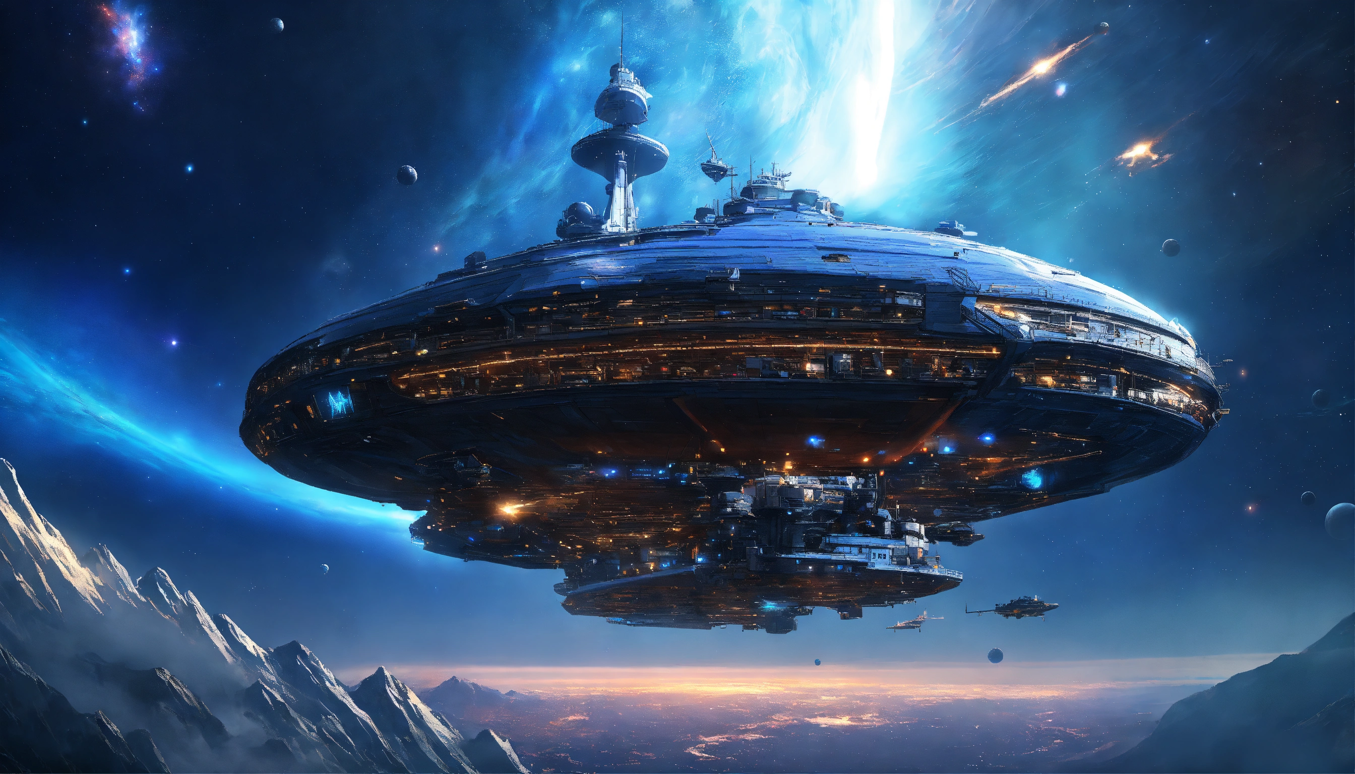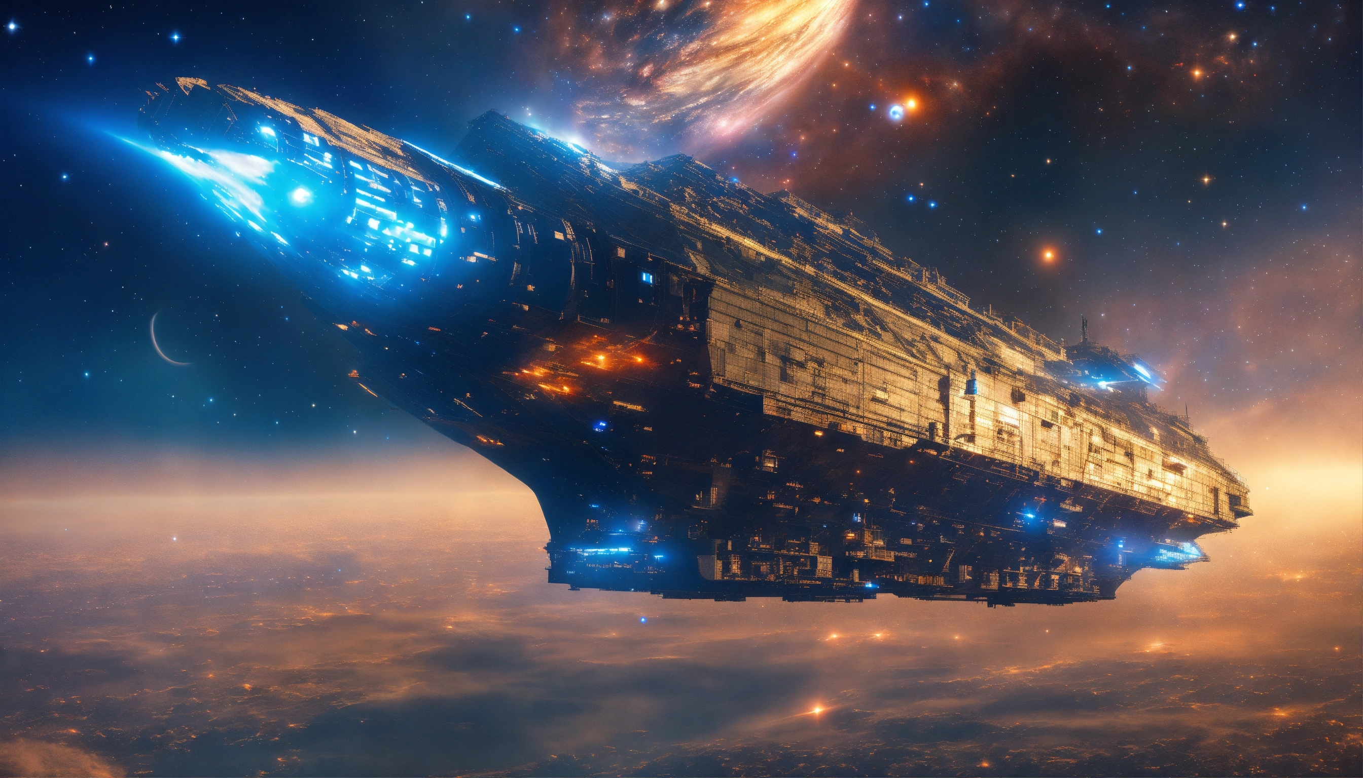 A blue and big métal csmic ship in, transparent above in the the galactic atmosphere, sky galaxies+ lightss, détails, hd