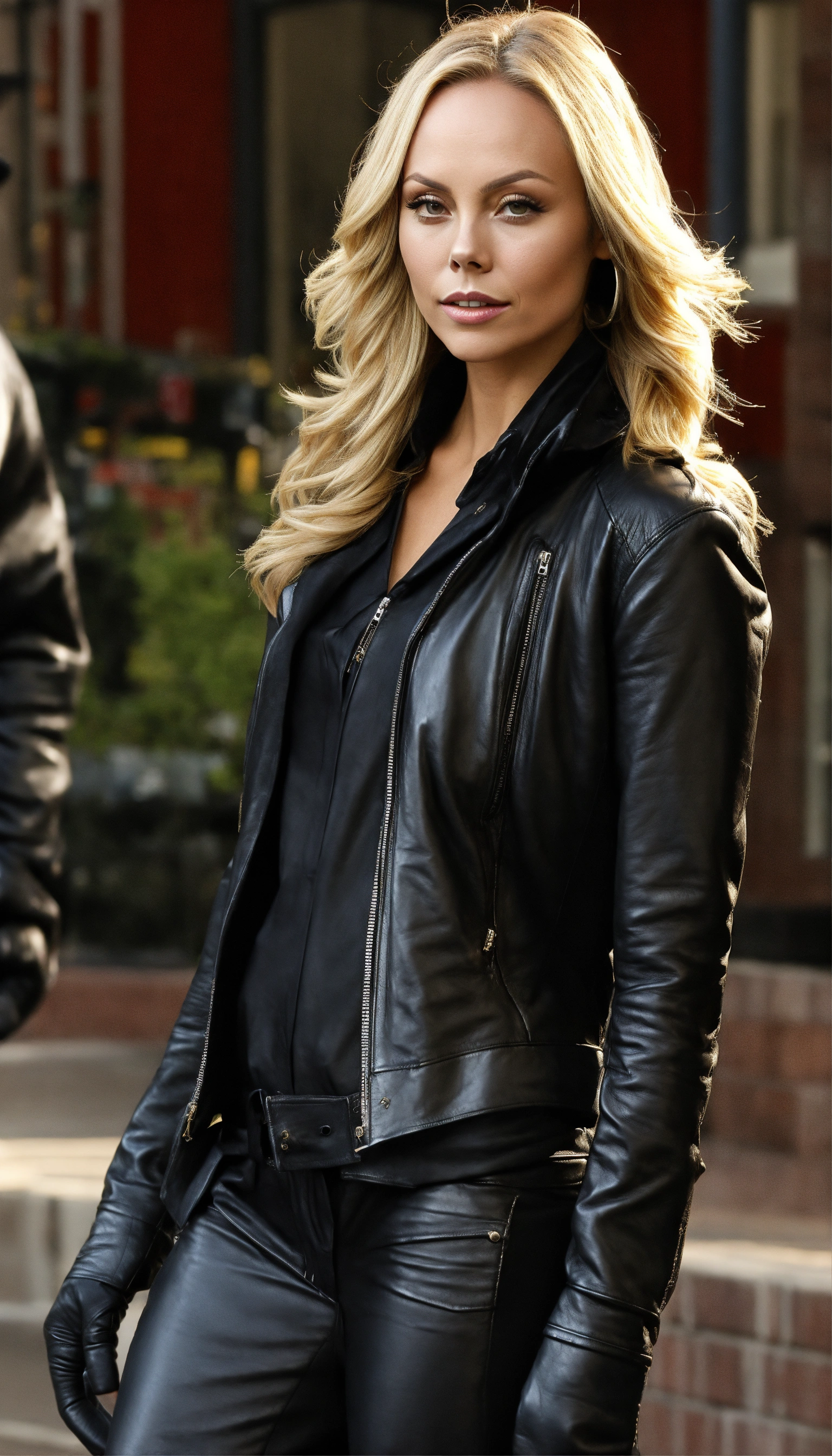 Laura vandervoort leather jacket and pants with black gloves for the city street