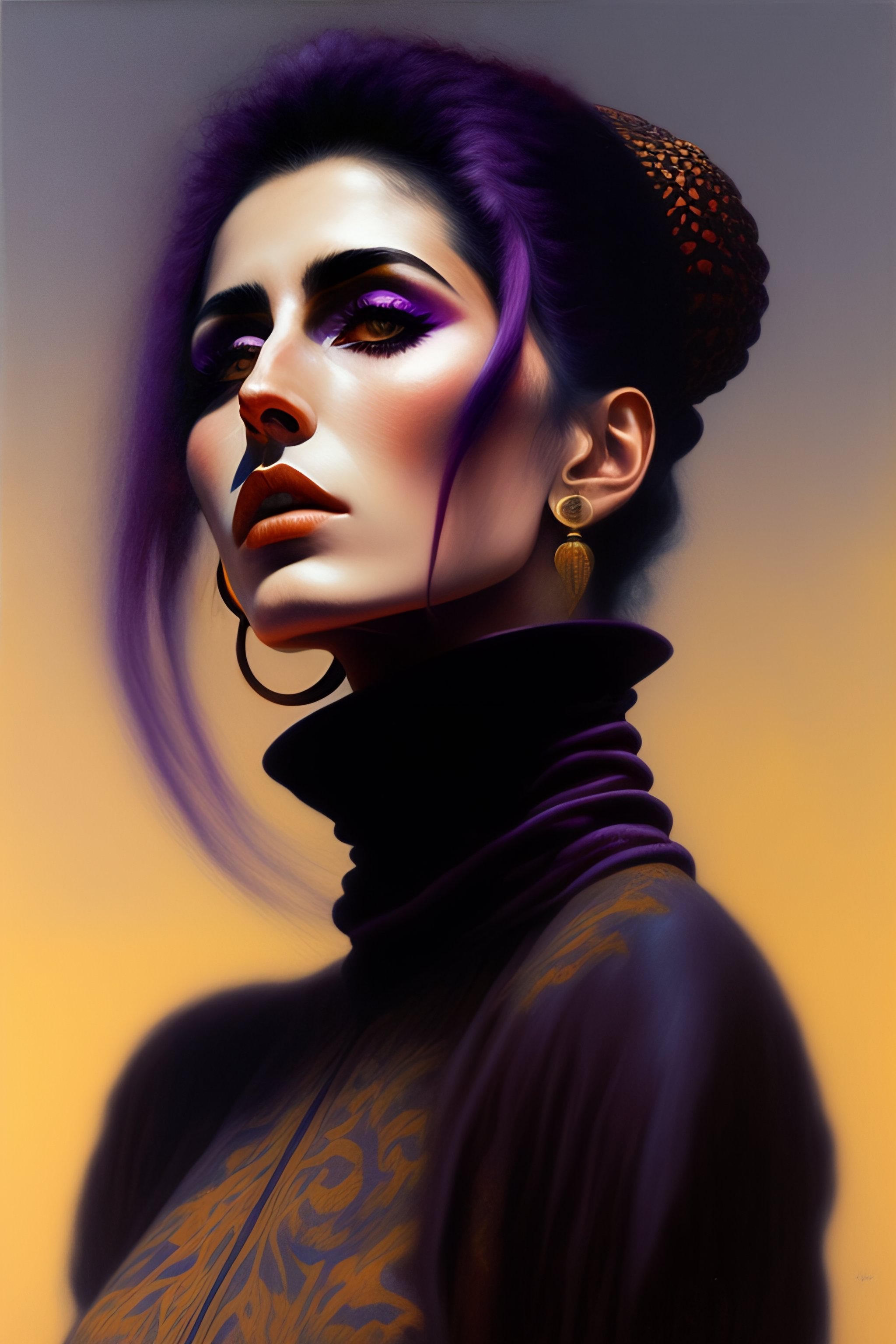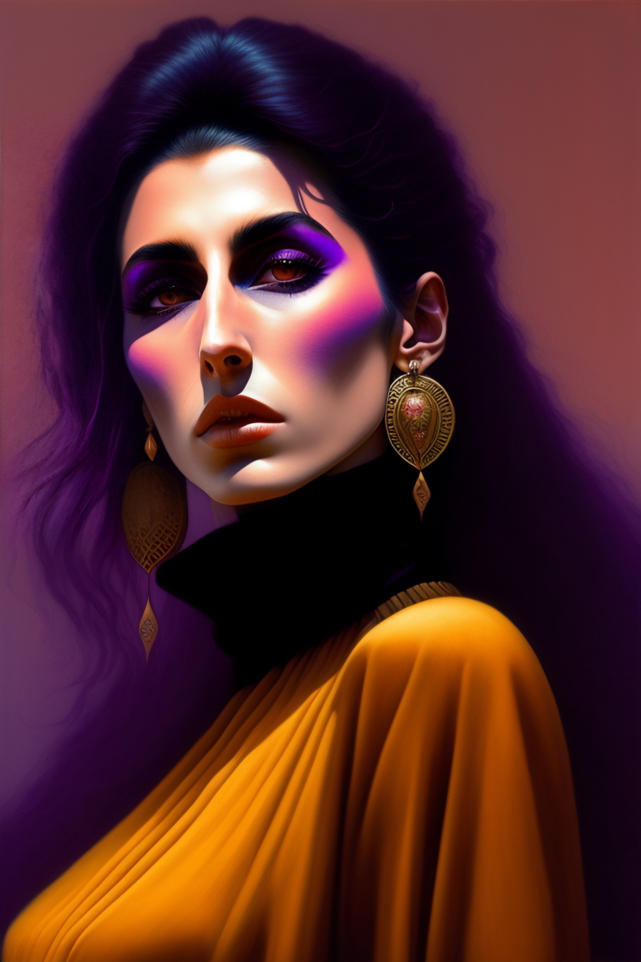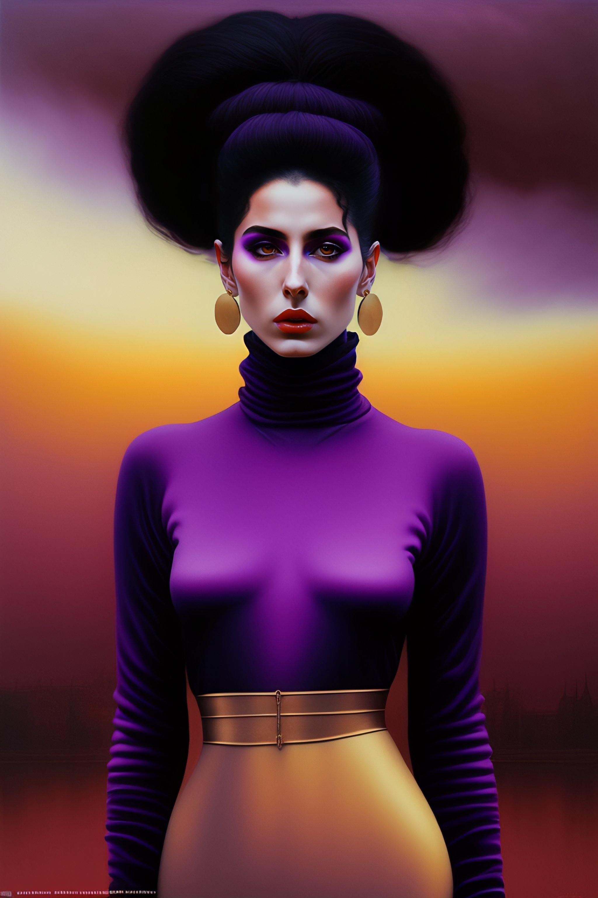 Beksinski mortal kombat full body dark purple female character with turtle neck black velvet shirt, bronze earrings, sad expression, inspired in amy winehouse, matte skin