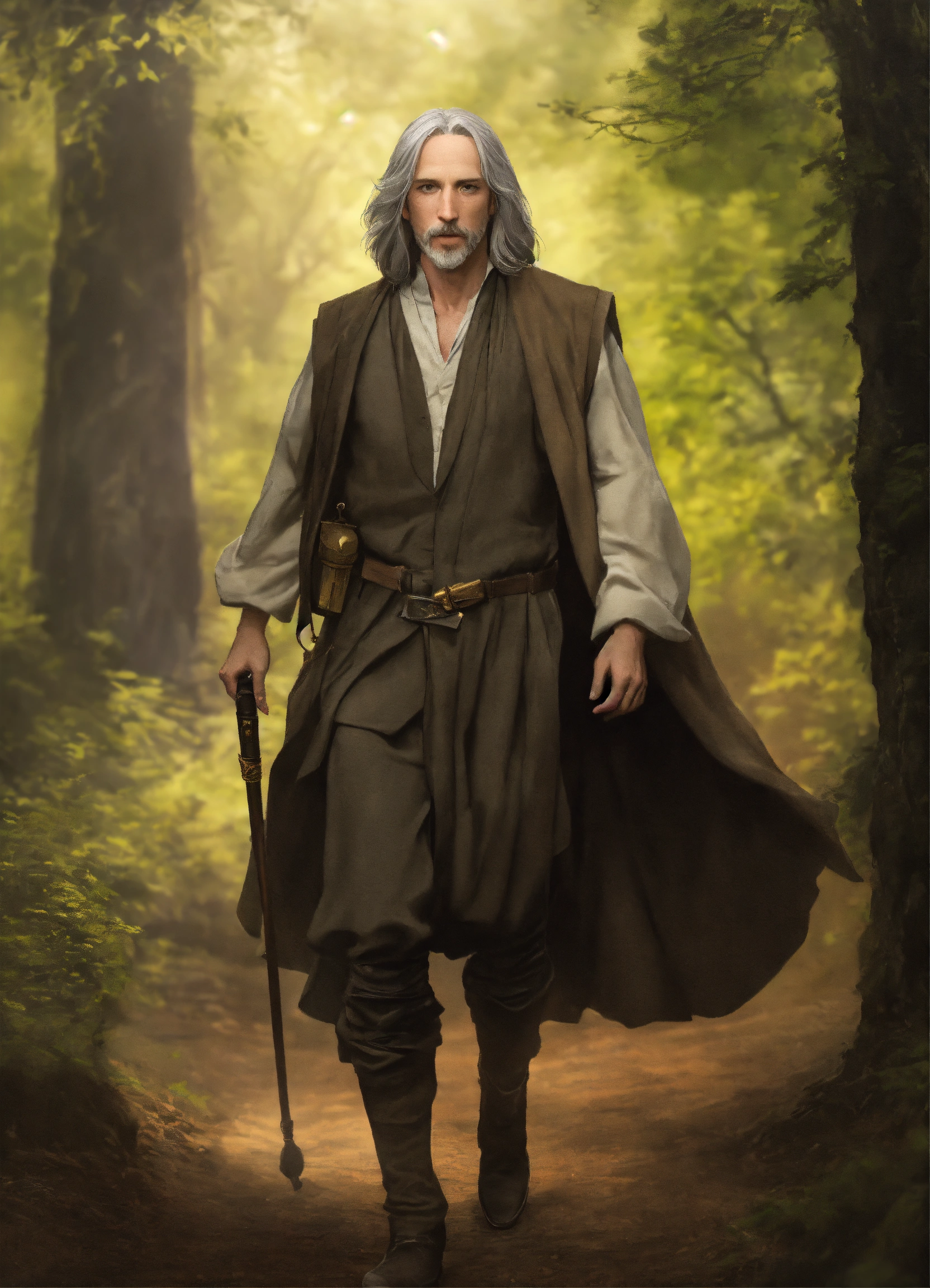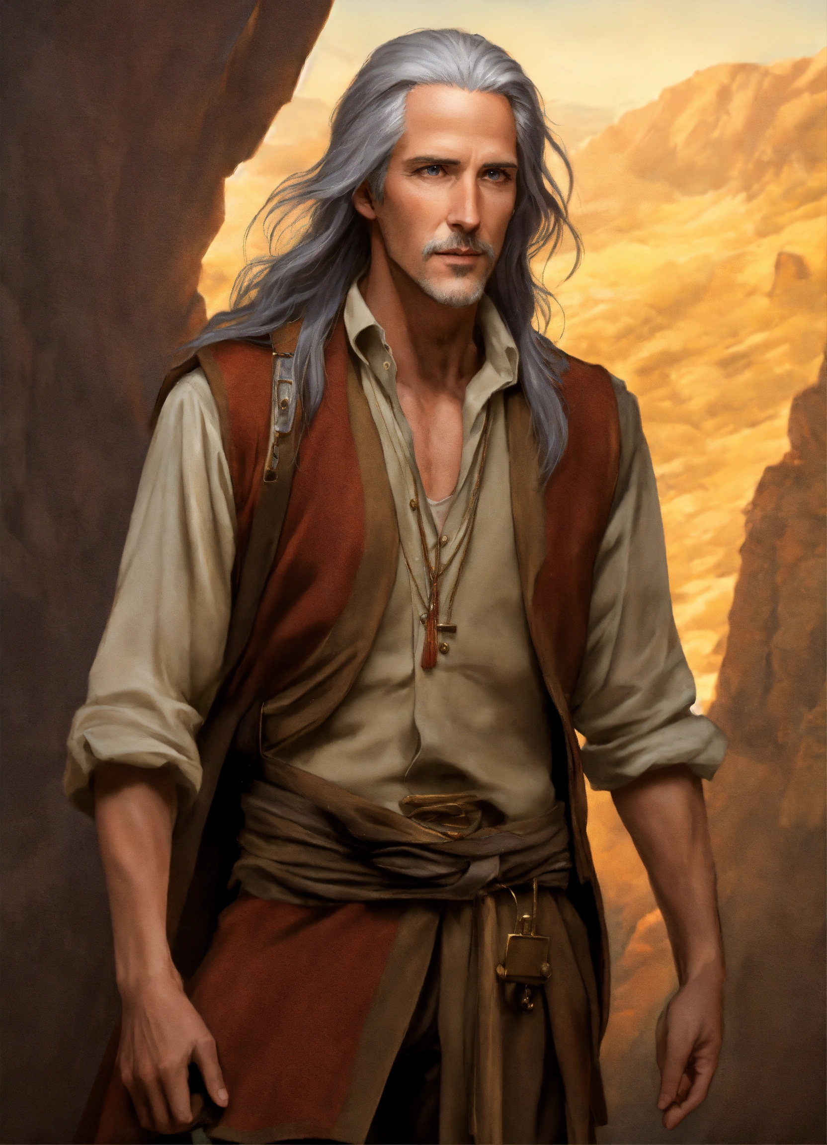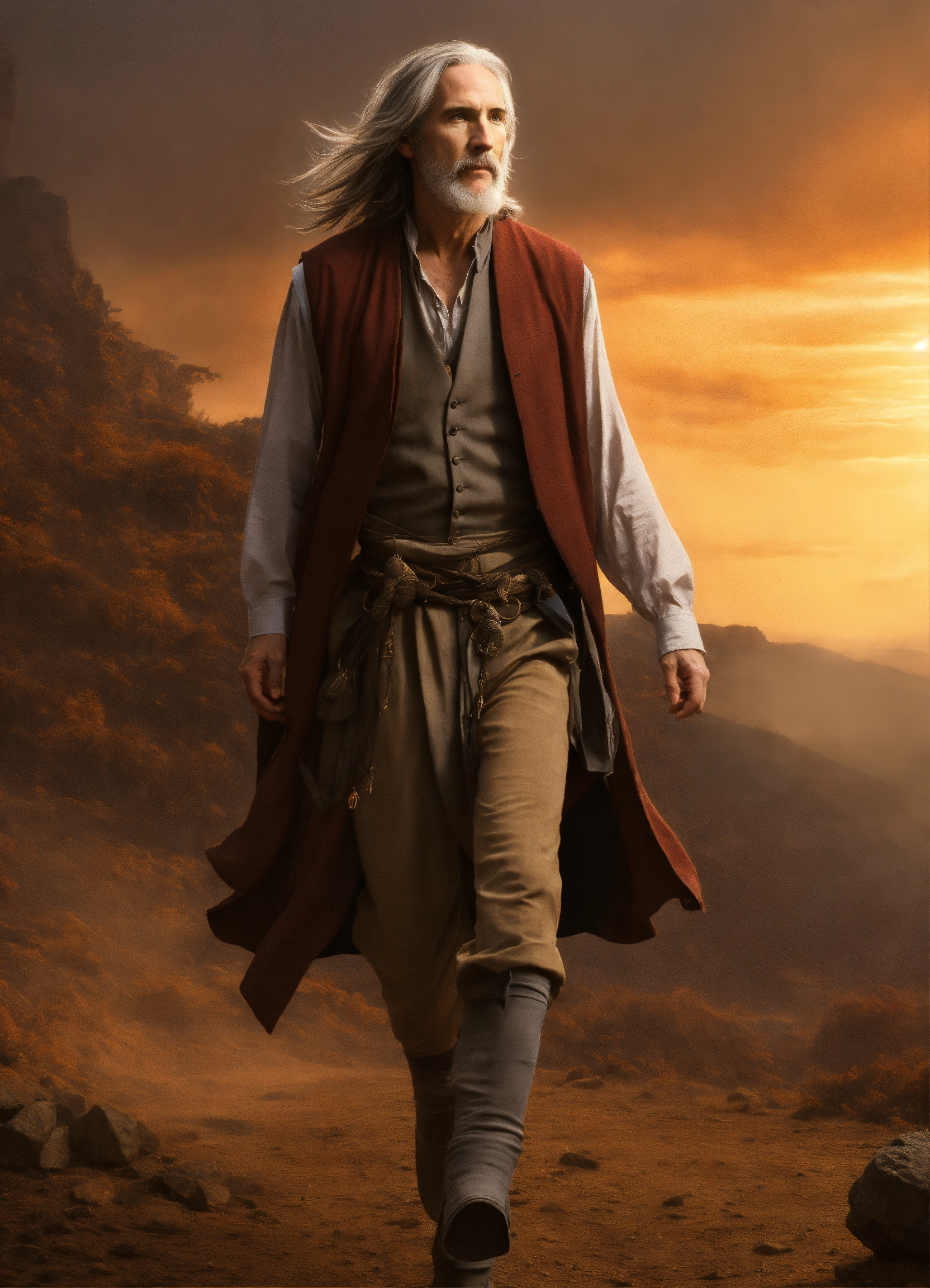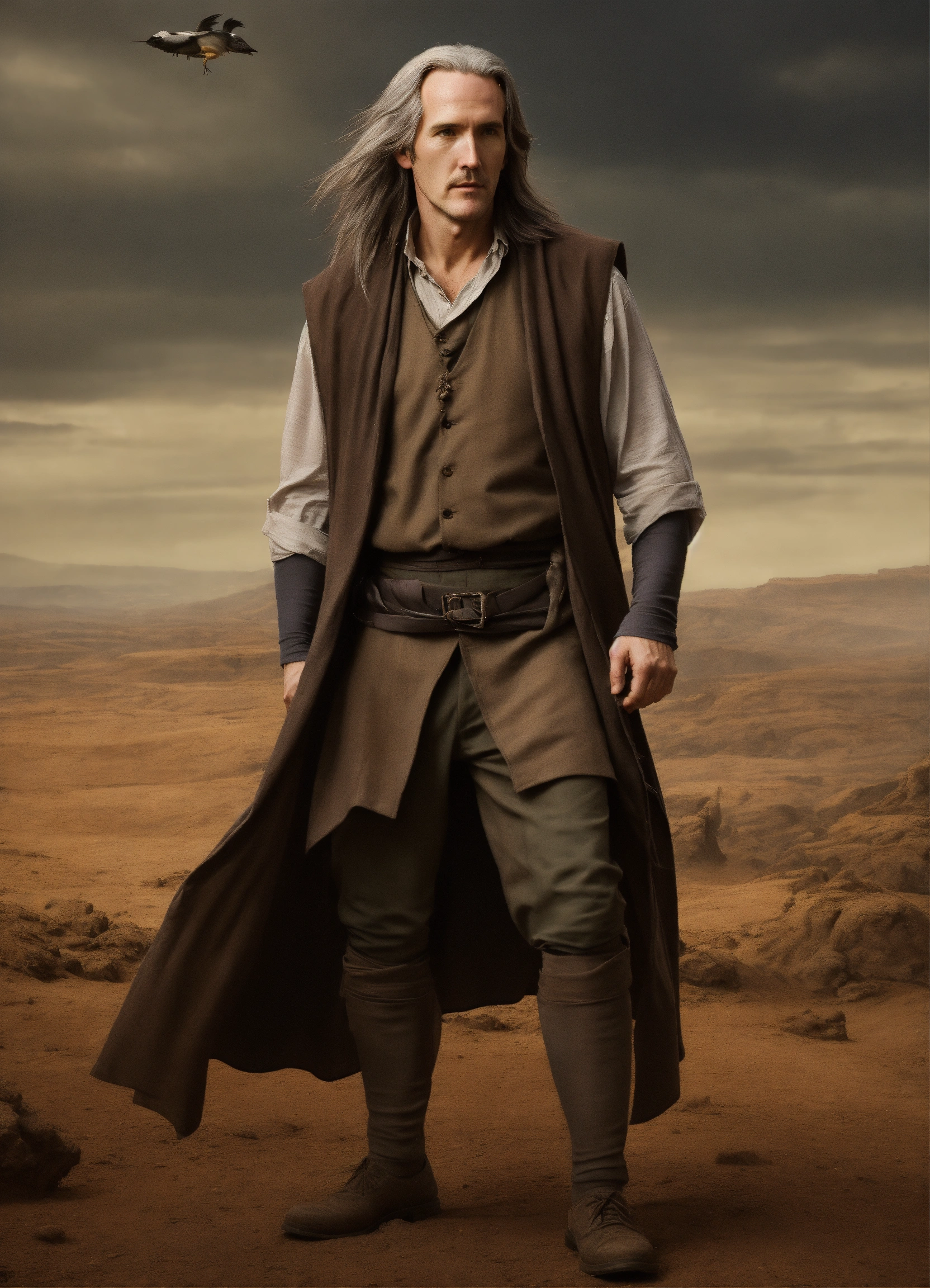 In photographic style matt mercer as a tall long distance runner with long straight gray hair as a hermit madman, matt mercer is older wrinkled now but still lithe elegant gaunt features, thin wiry arms, wide and deep long open collar sleeveless peasant vest