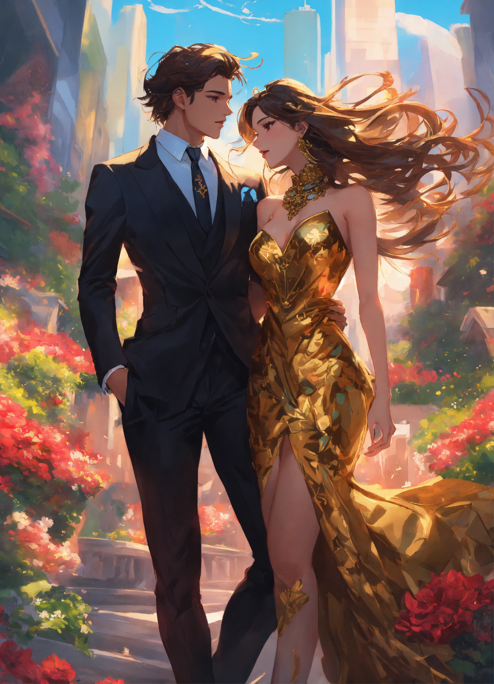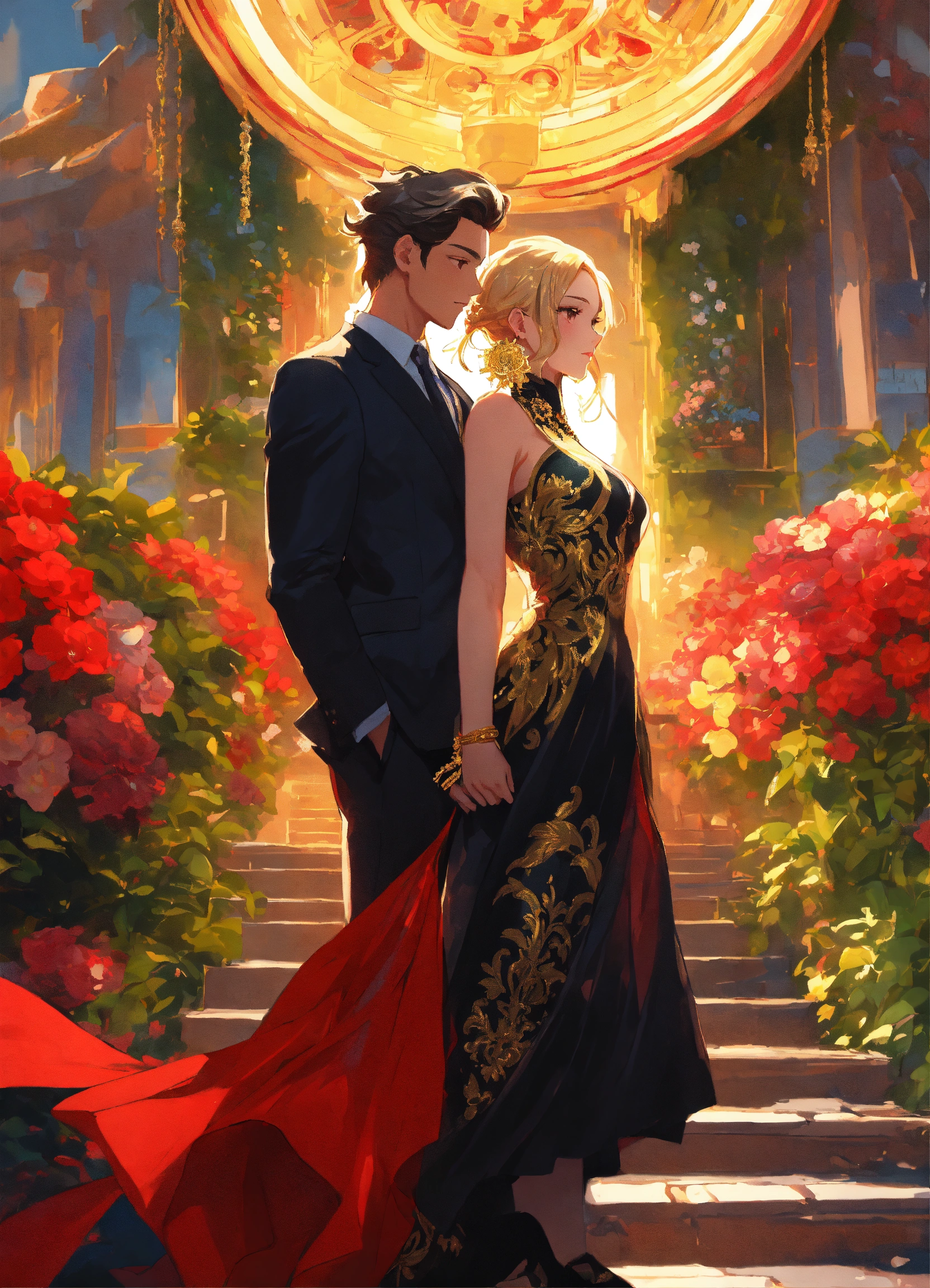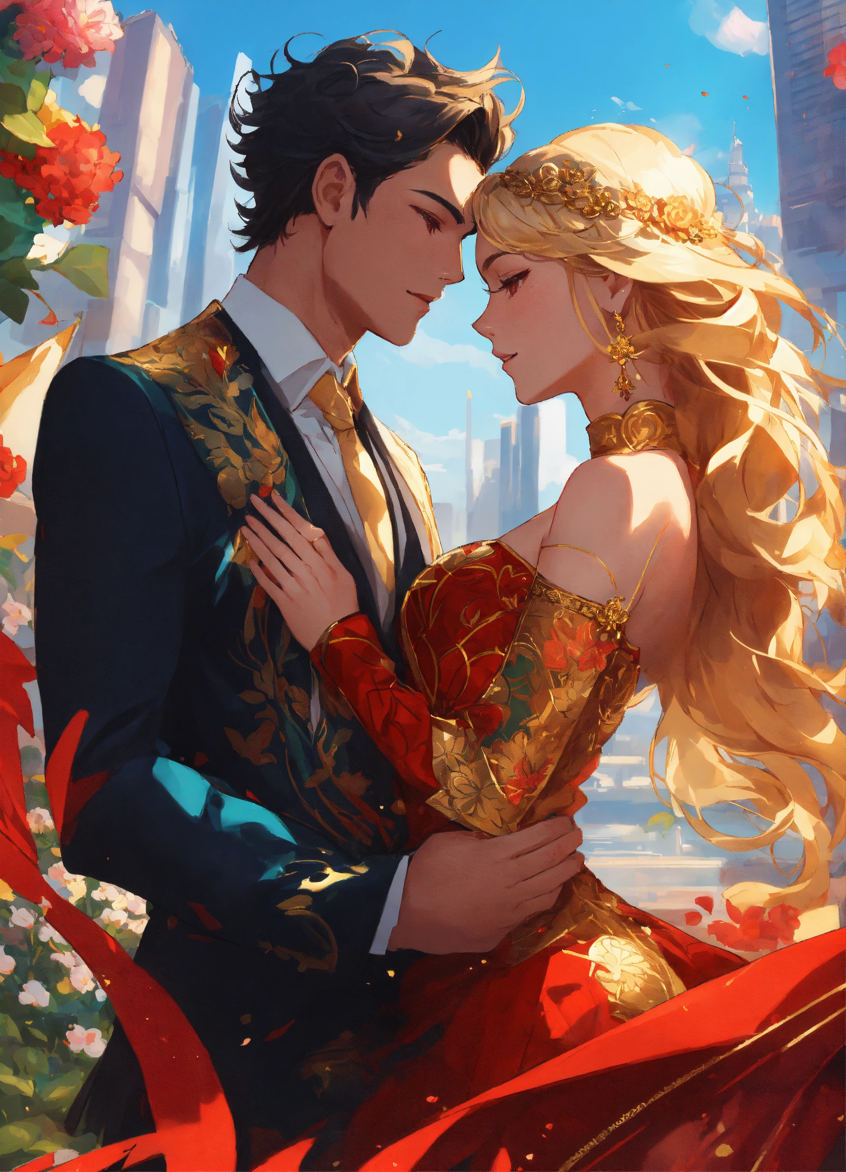 Illustration of beautiful city of towering skyscrapers, islands, vibrant colors, fair skin, the young man wears a intricate black suit with gold ornaments, has wavy black tousled hair, the golden haired woman wears a red intricate dress with gold adornments that shows legs, maximalist, 8k photo, animestyle, by artgerm, by rossdraws, trending on artstation, garden, windy, flowers, circular perspective, romantic, facing each other