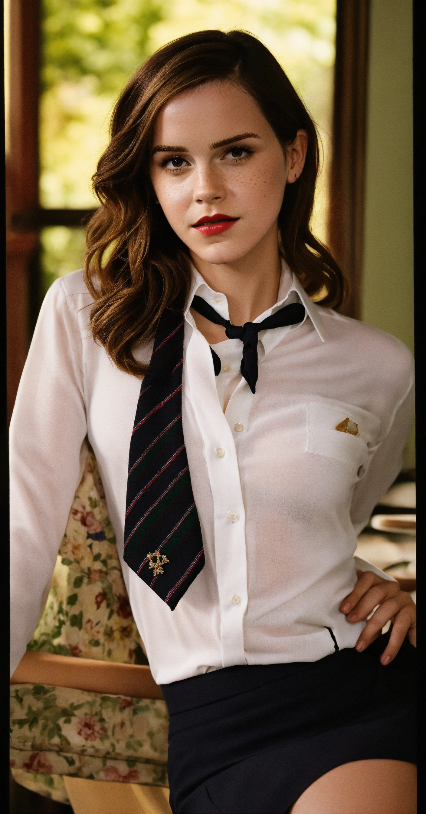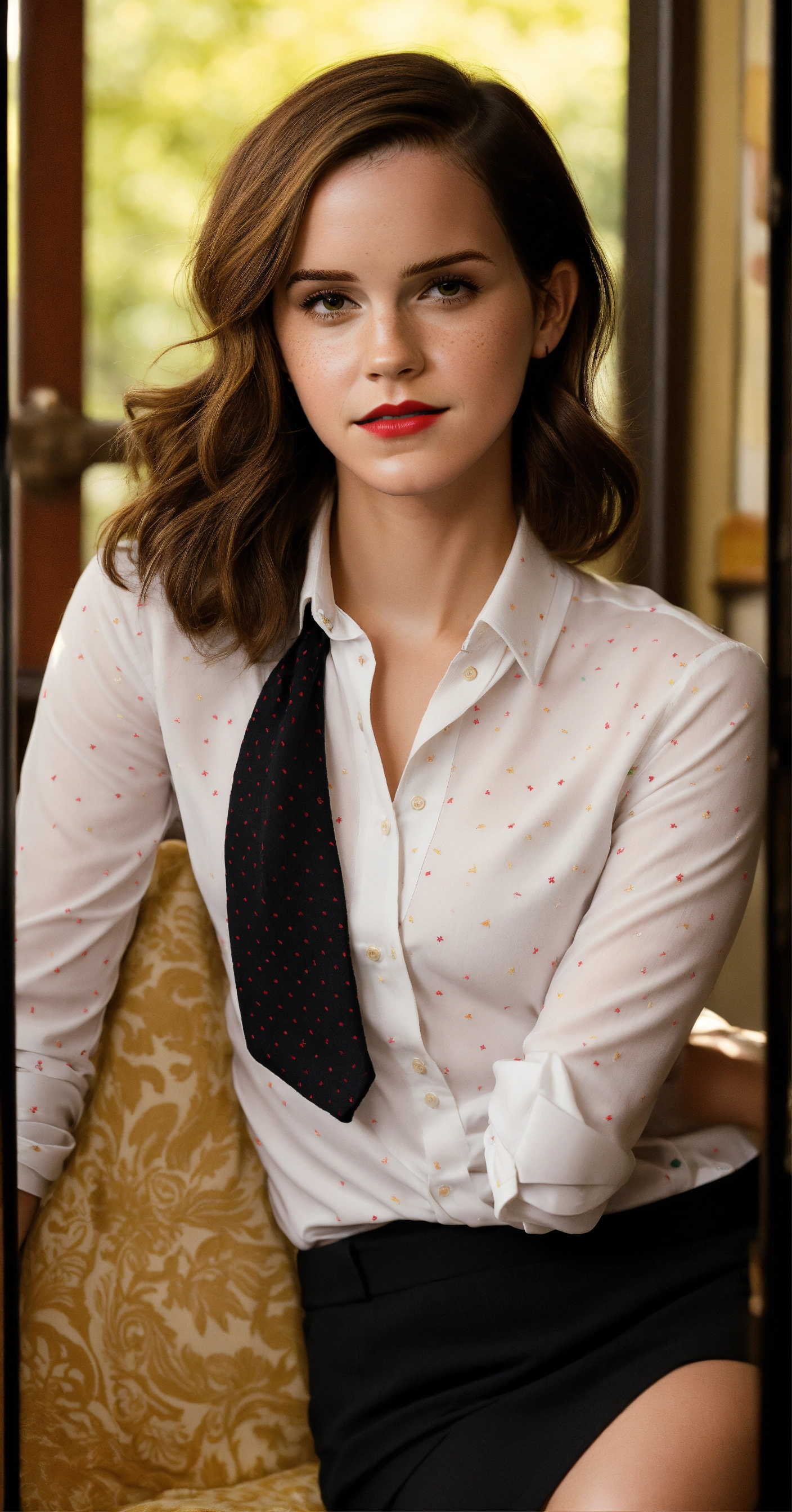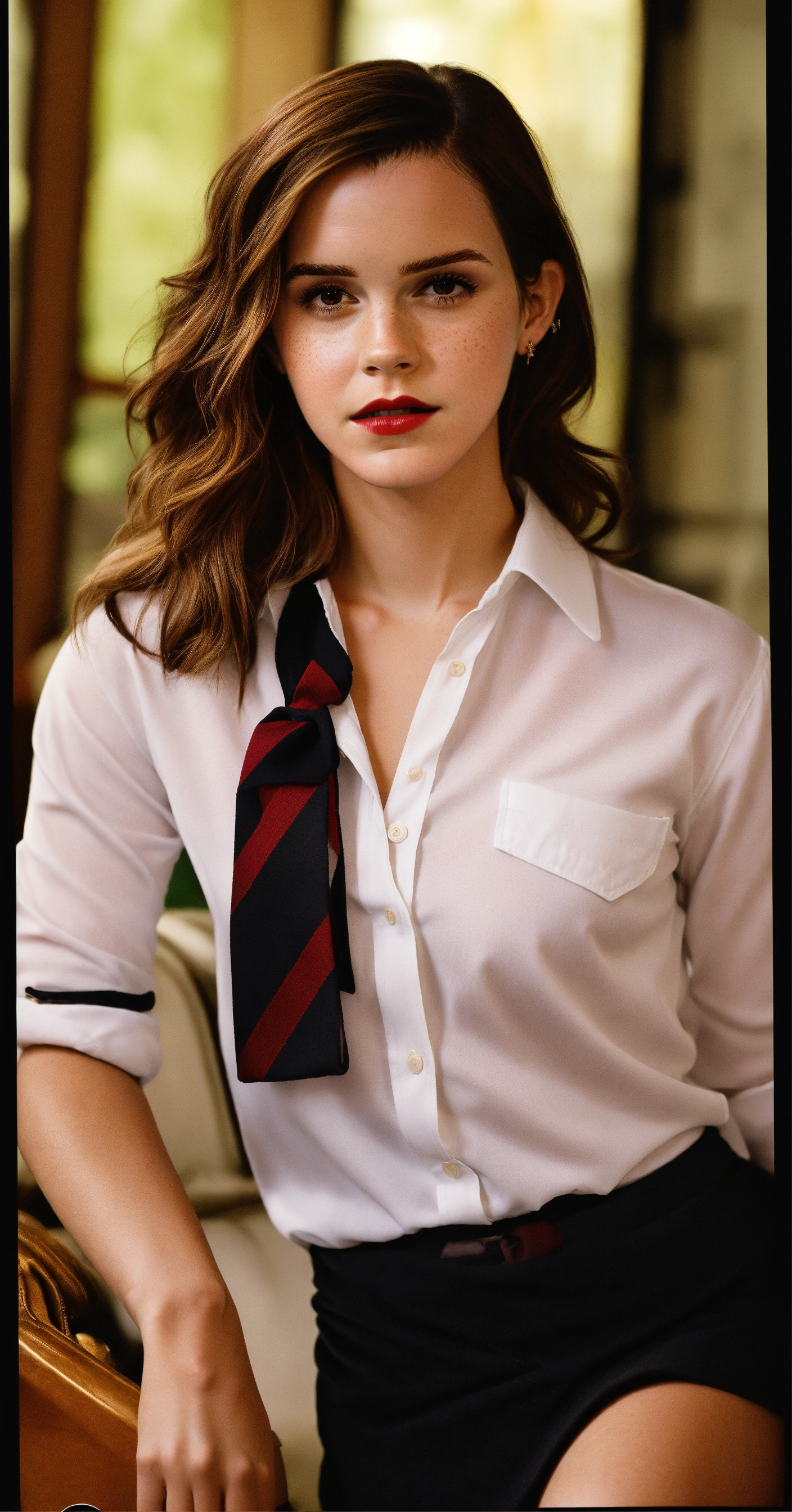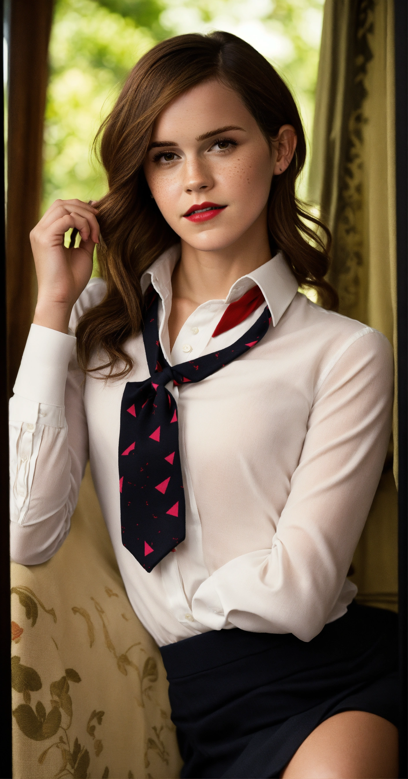 A photographic portrait of emma watson wearing skirt, socks, stockings, with neck lengthened, untied, greater bust, tight shirt, wide bust, she has green eyes, freckles on her face and red lipstick, form-fitting, curve-hugging, snug, tailored, close-cut, sculpted, defined, pronounced curves, shapely, casual, relaxed, laid-back, undone, informal, nonchalant, easygoing, disheveled, carefree, unbuttoned, unstructured, effortless, she wears a black suit jacket with a white shirt and black tie. her head is triangle shaped, preppy, elite, well-dressed, polished, sophisticated, form-fitting shirt, stylish, prestigious, private school attire, layered, hosiery, affluent, knee-high socks, upscale, traditional
