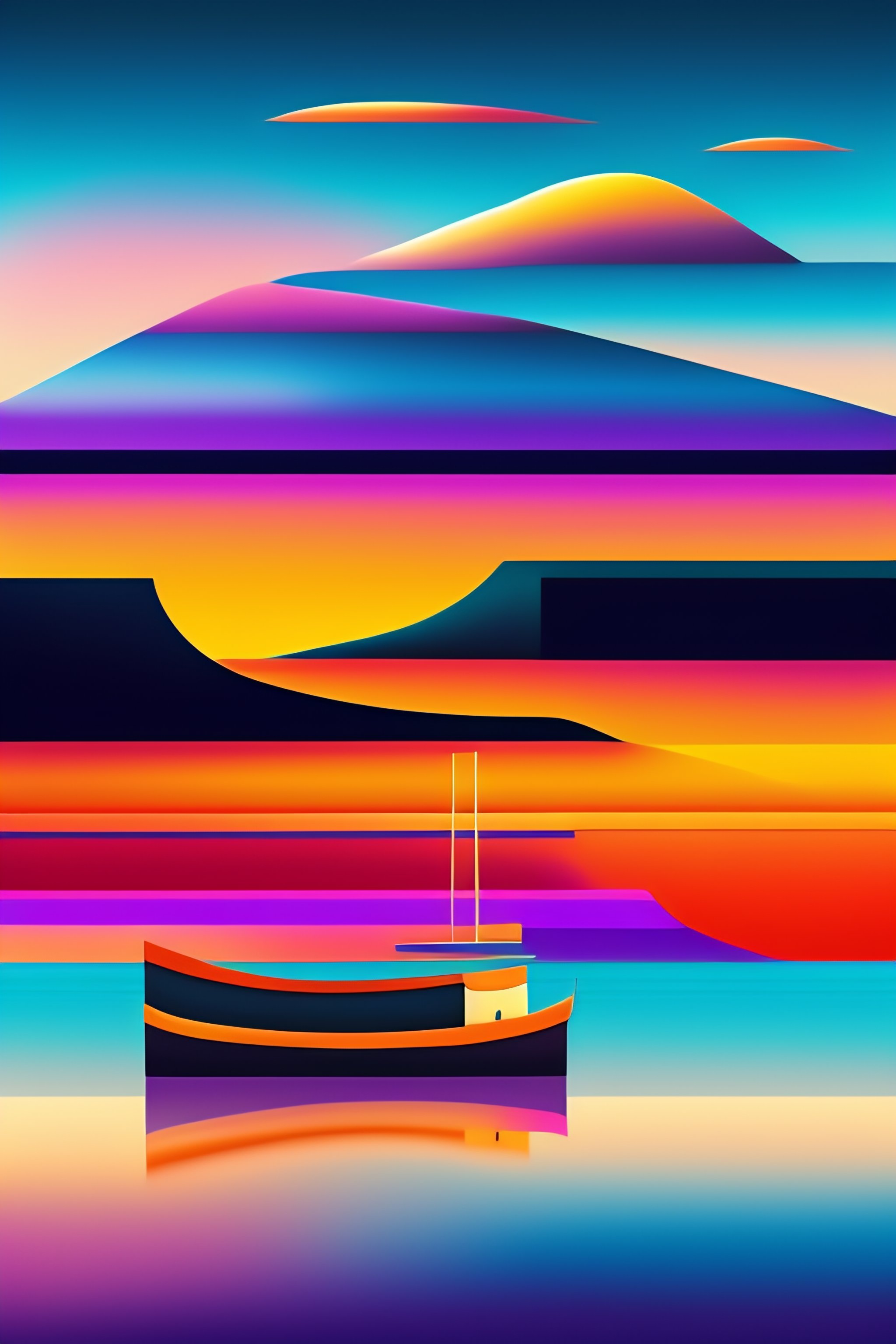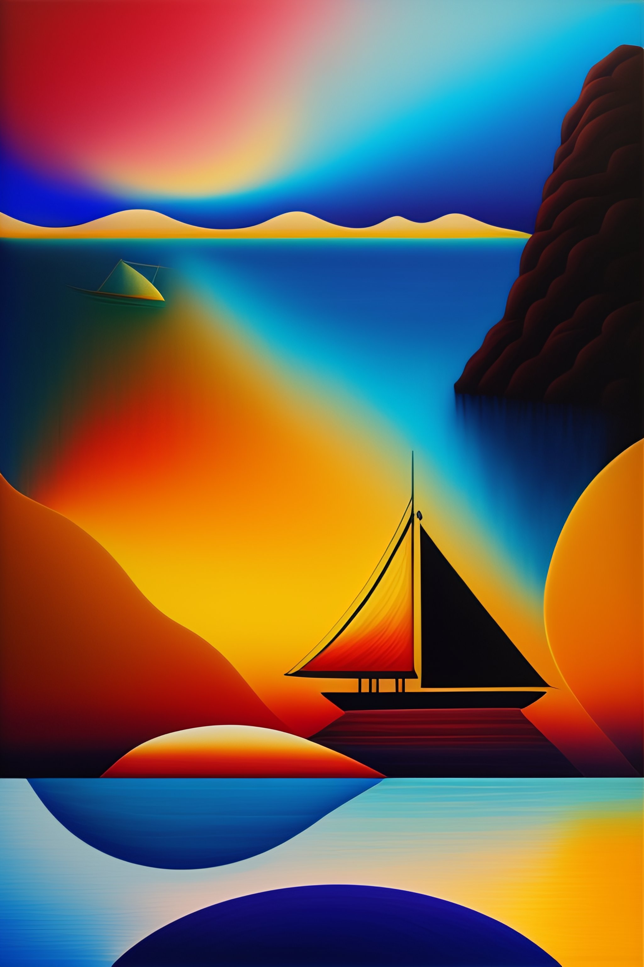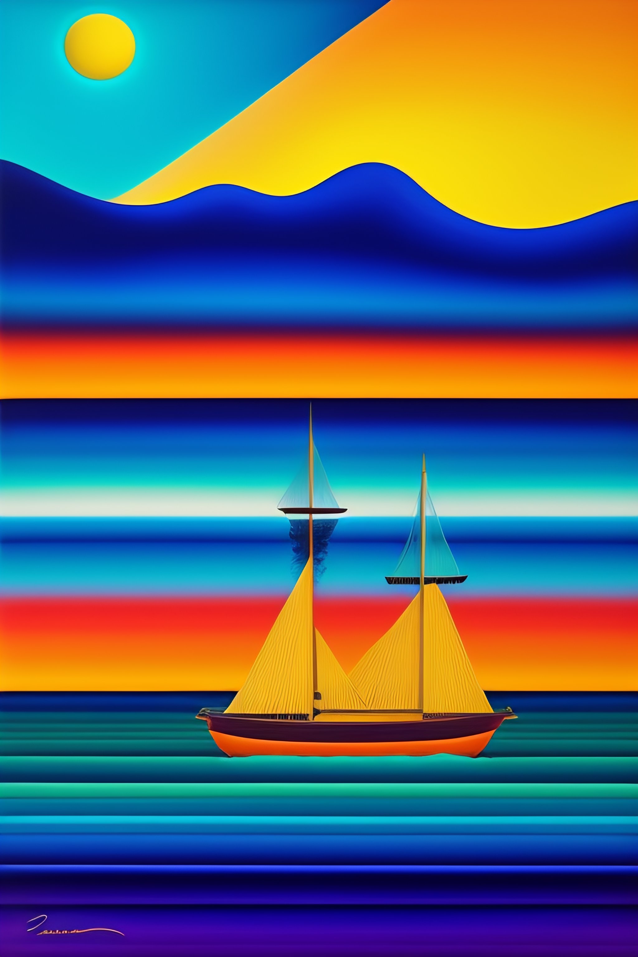 Imagen cubista abstracta y surrealista en forma de paisaje en el mar con barcos antiguos de colores oscuros