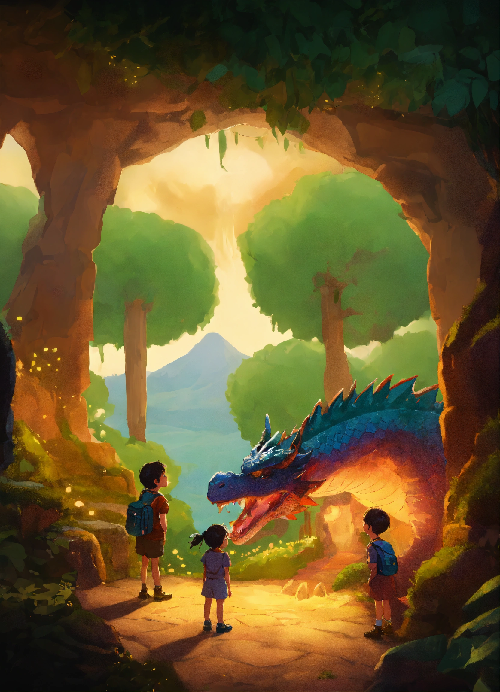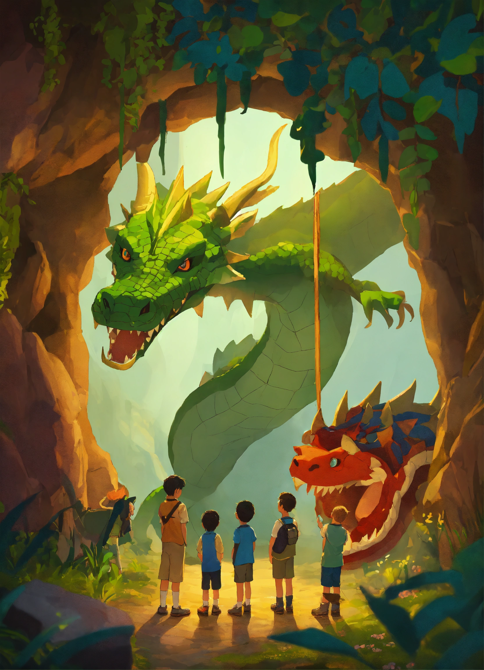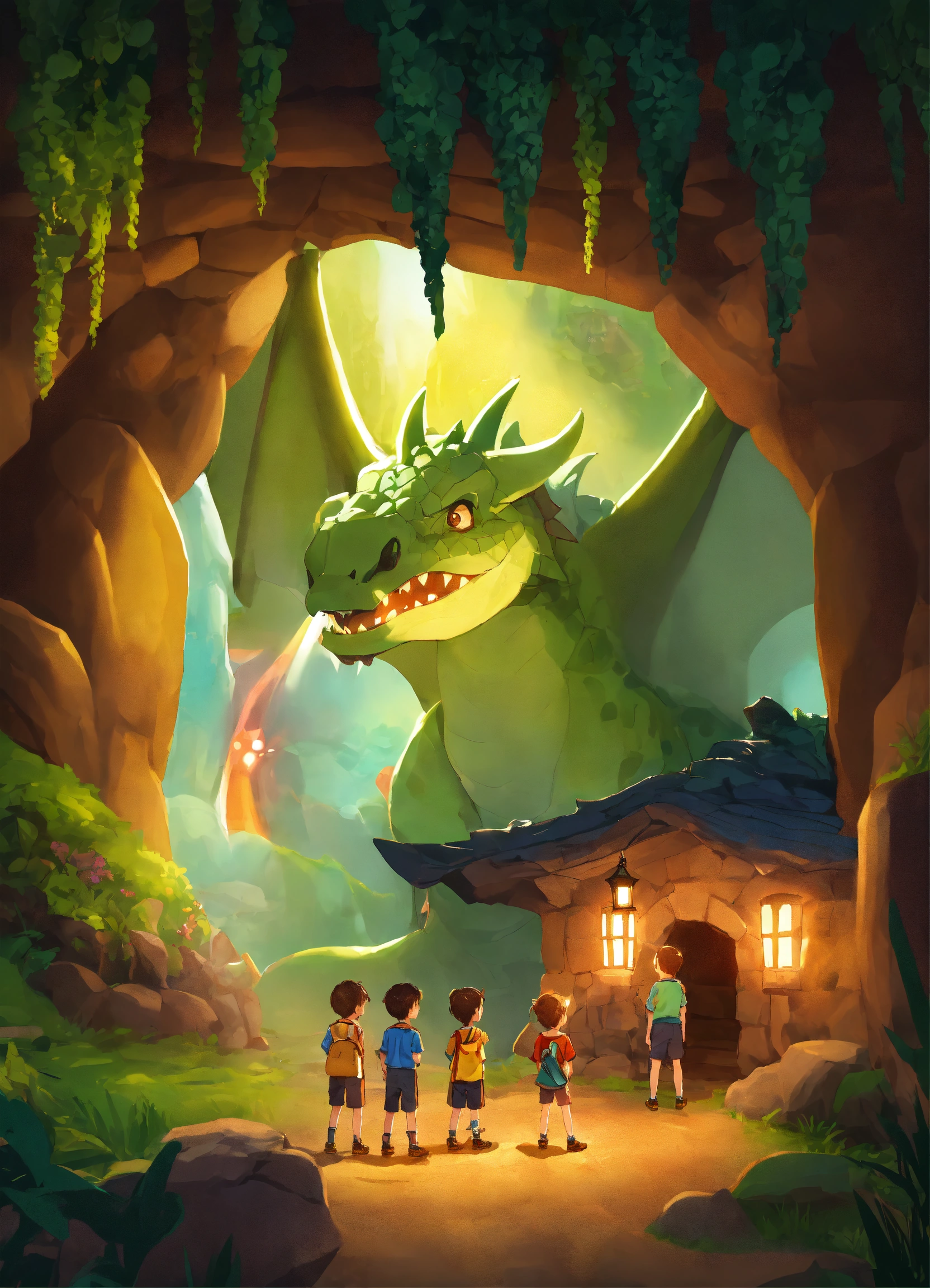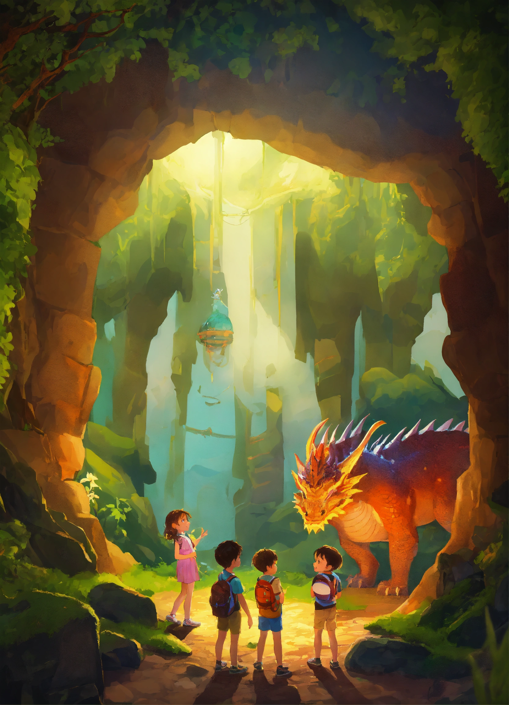 An image showing the children standing in amazement in front of the sleeping dragon in the dark cave