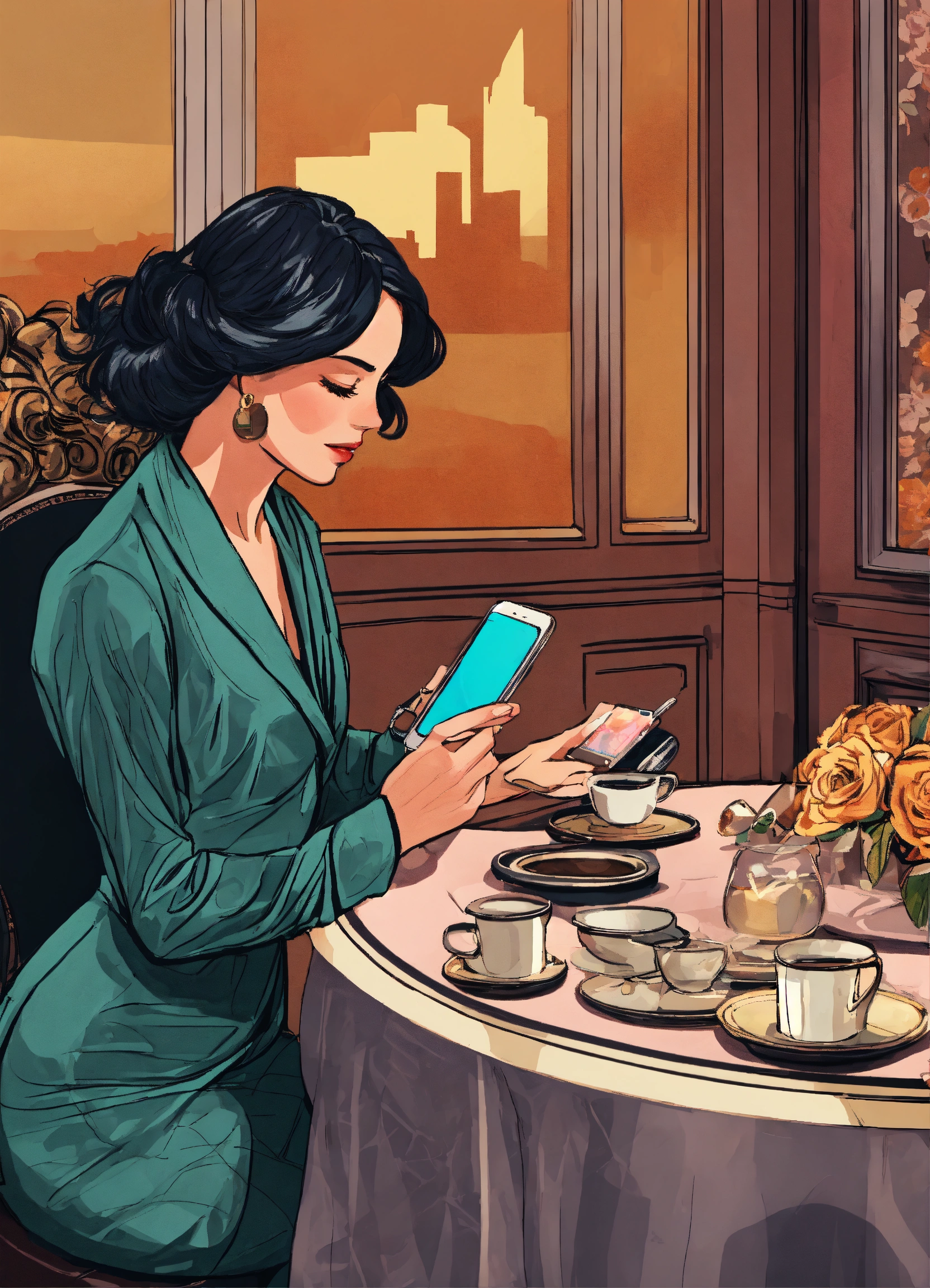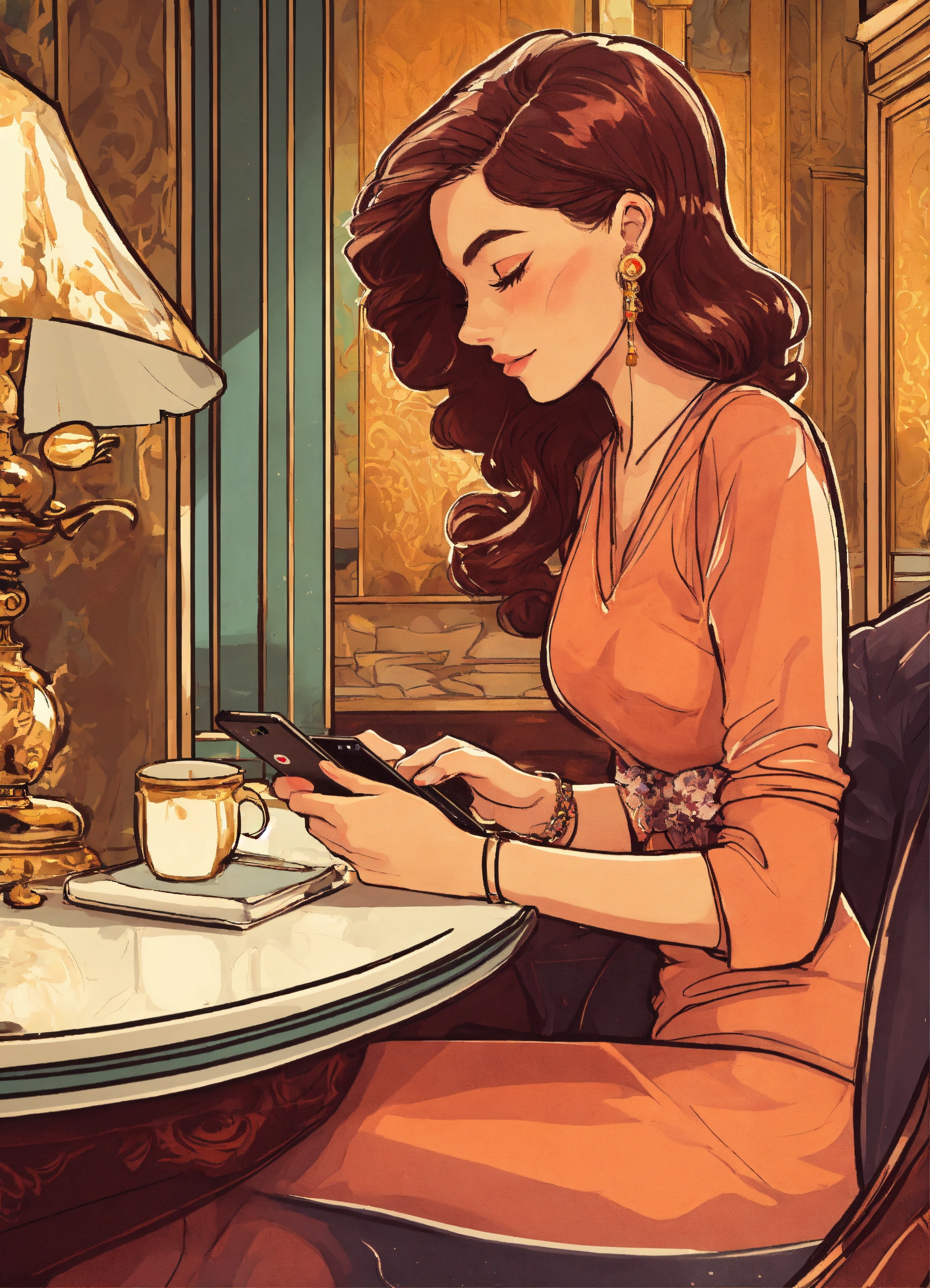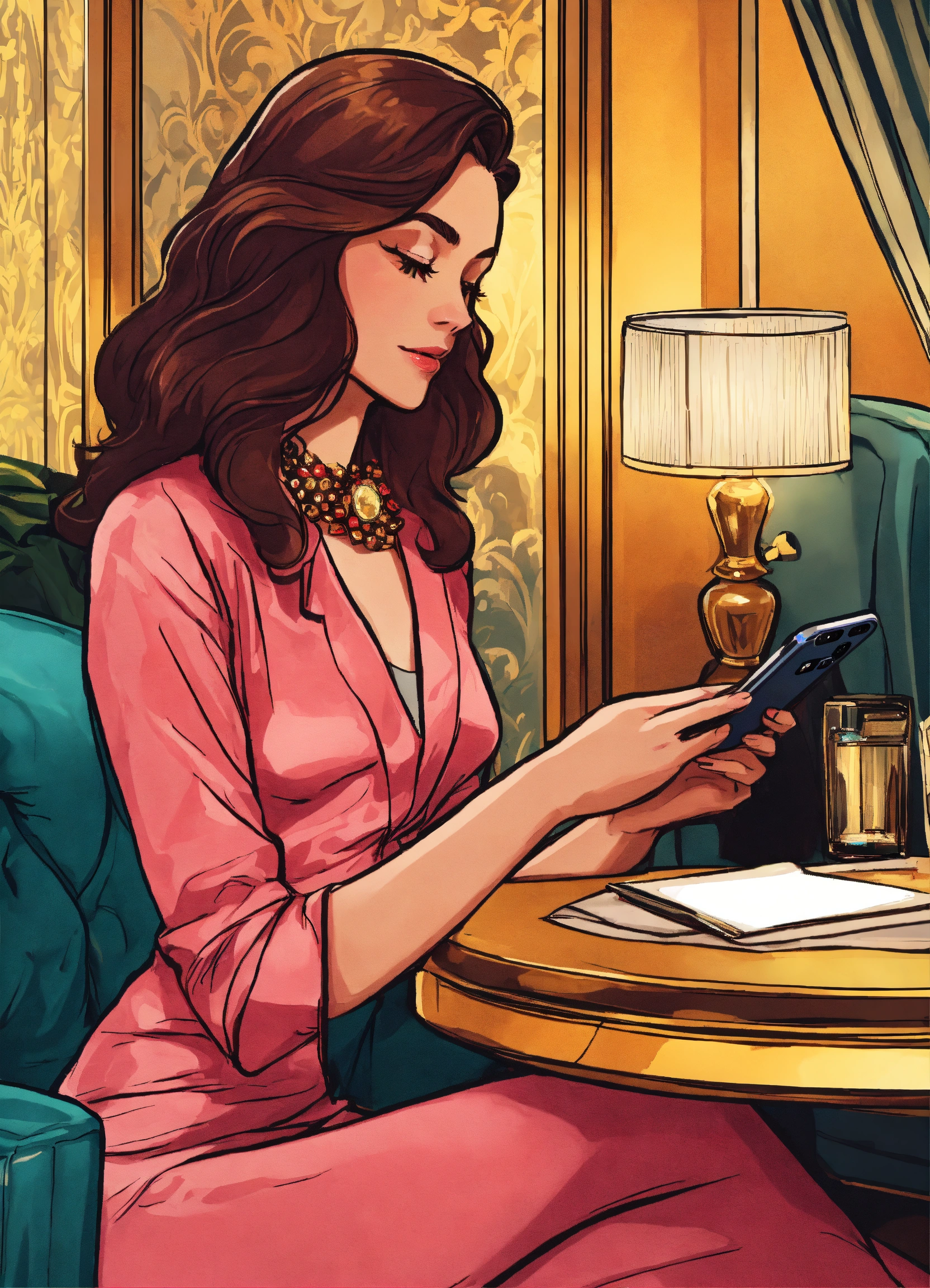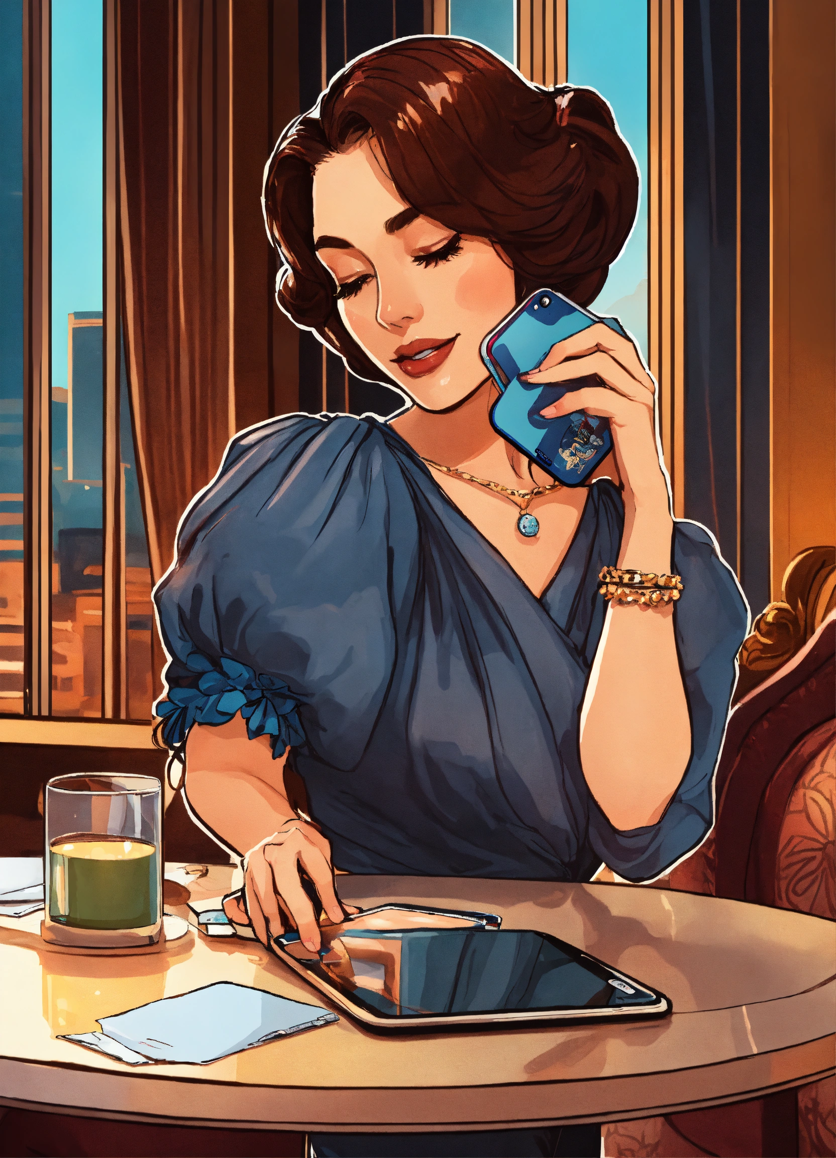 A close up of a woman touching her phone on a sticker on an opulent table in her hotel room, cartoon style