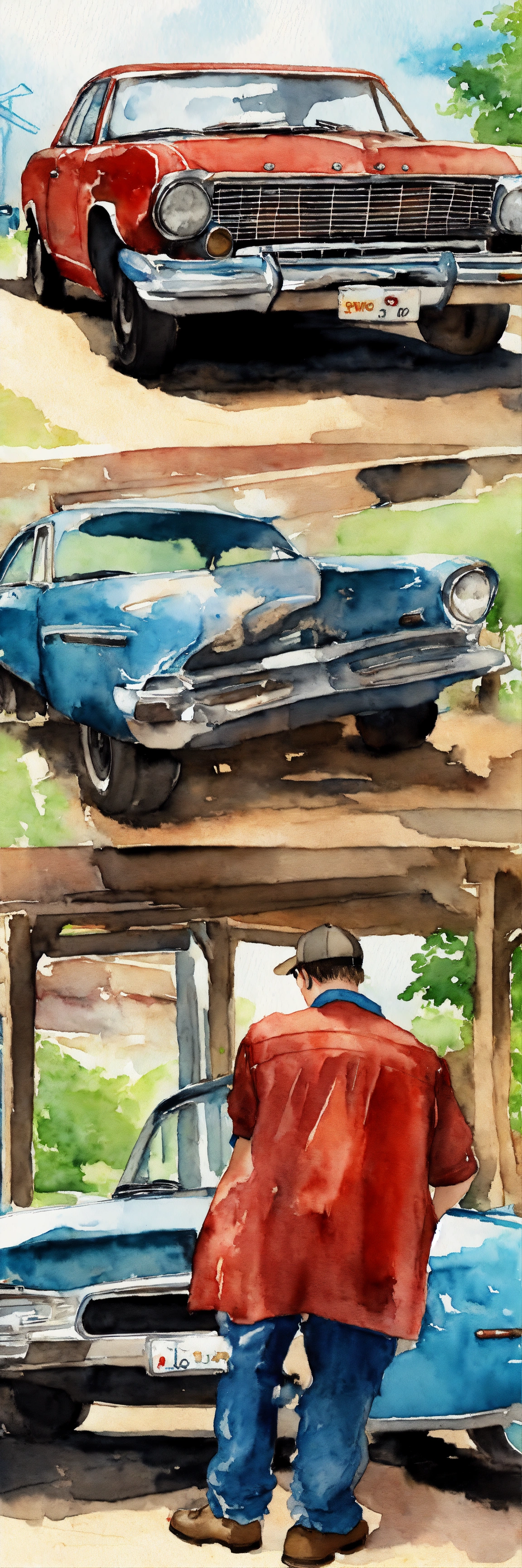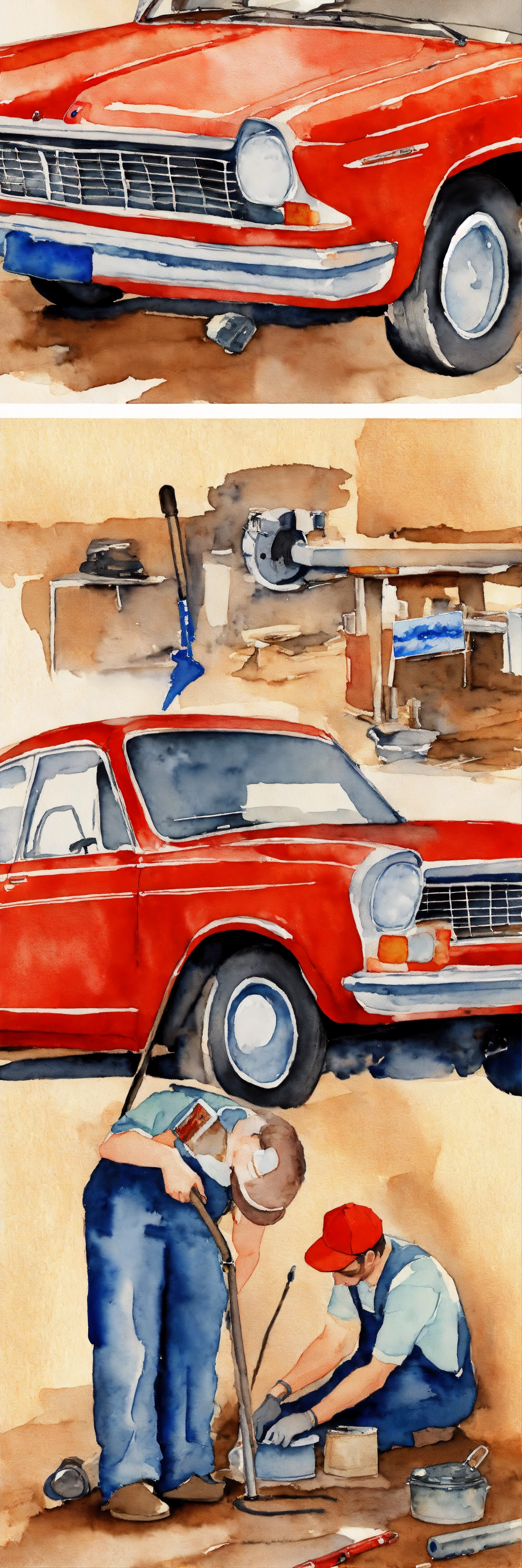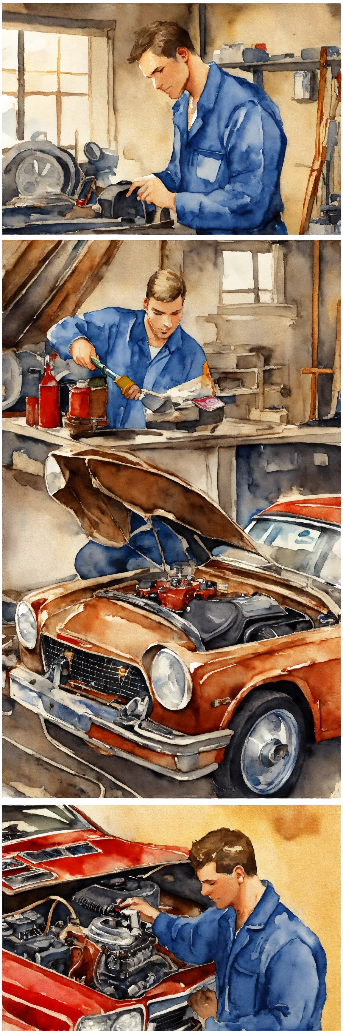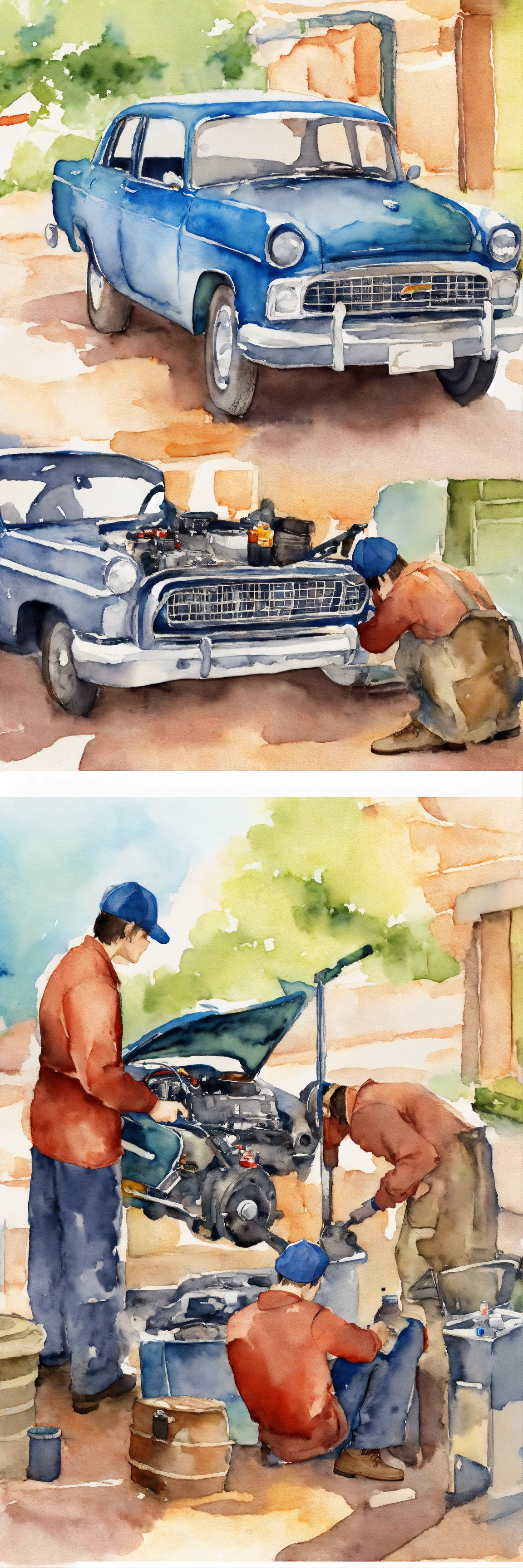 Watercolor working mechanic repairs car engine, clipart, card making, wall art decoration, automobile, printable digital