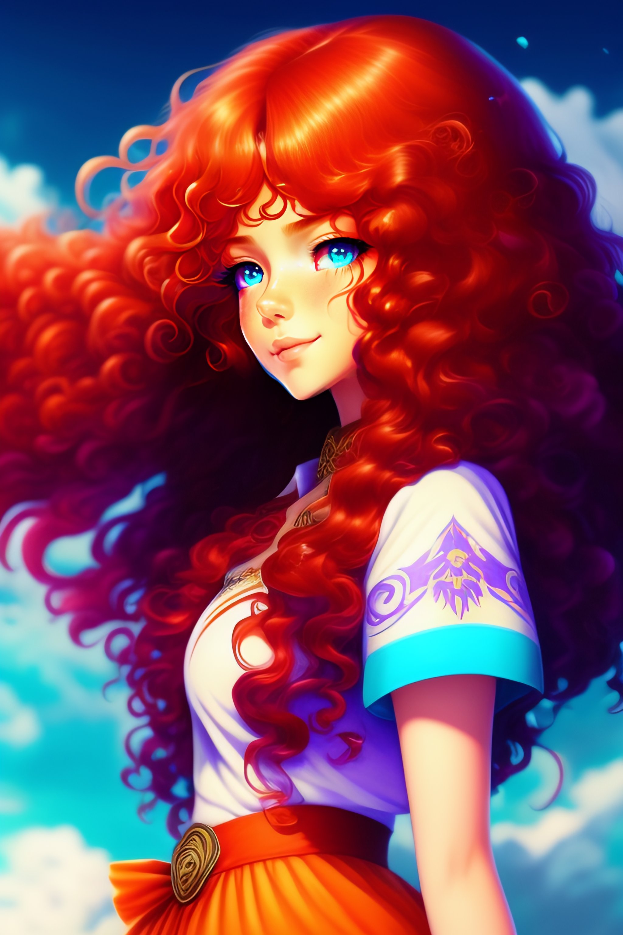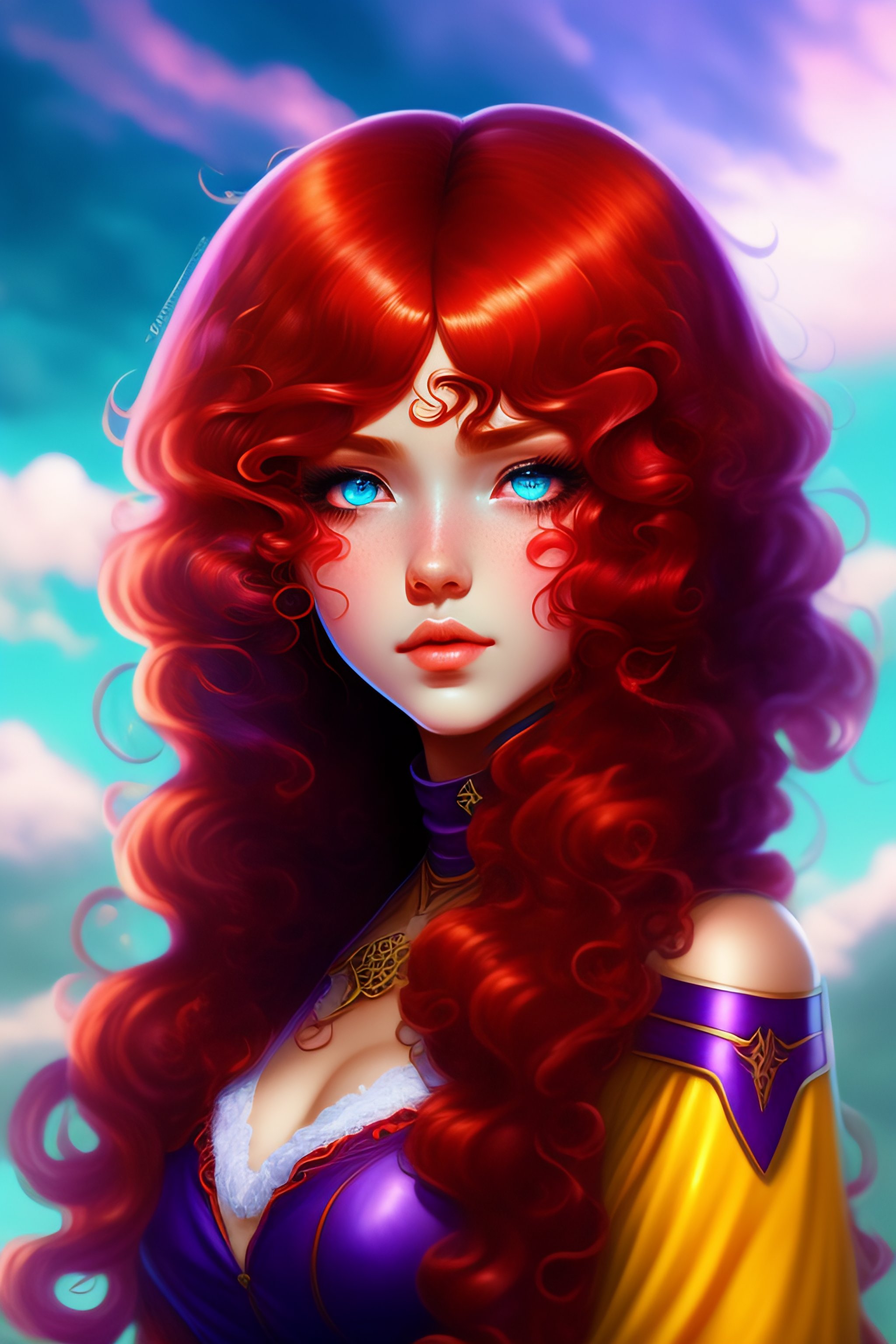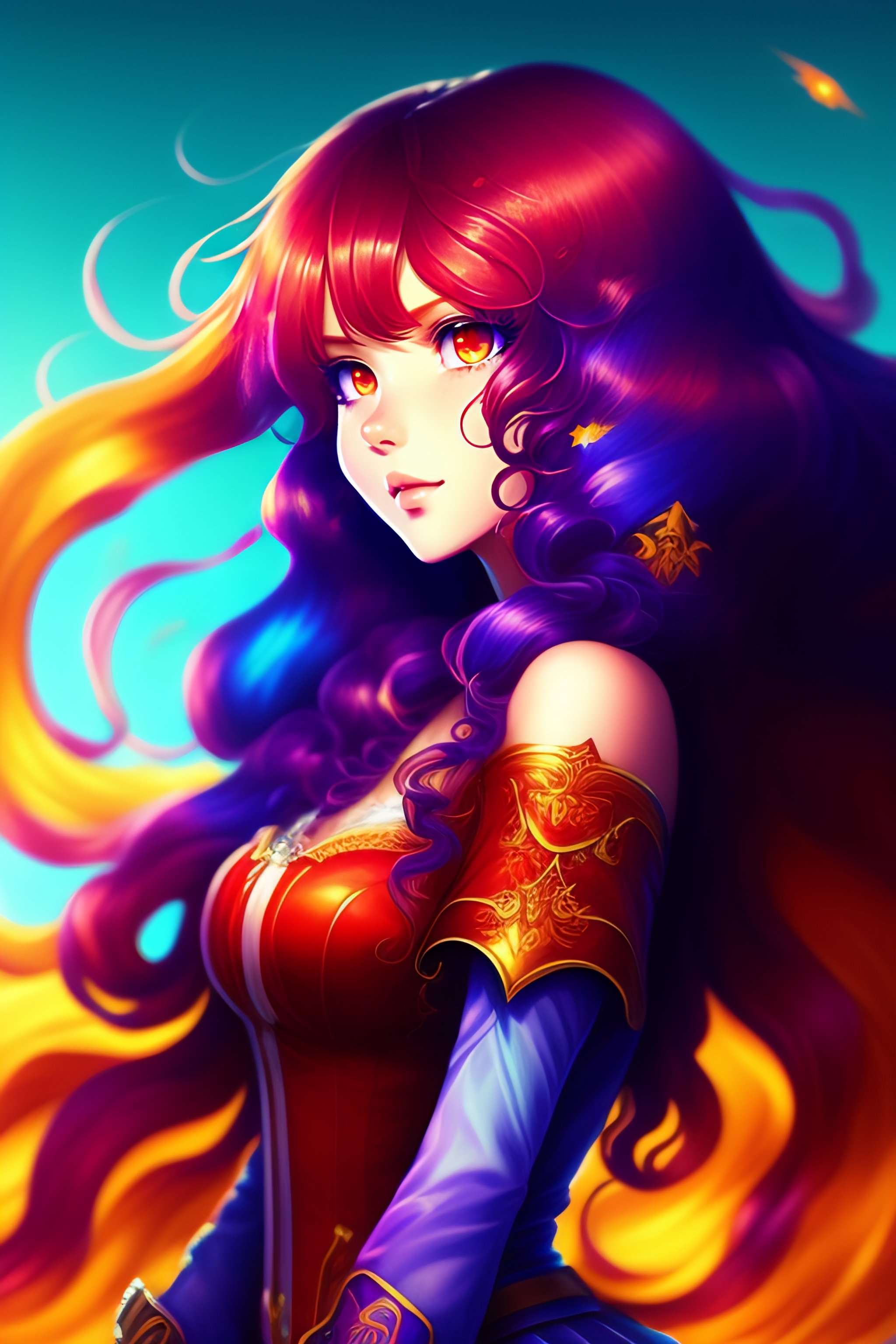 Reddish orange, long curly hair with cyan highlights, with vampire wings, brown eyes with blue and red with purple, blue with yellow clothes, girl, anime, coroa e cola roxo