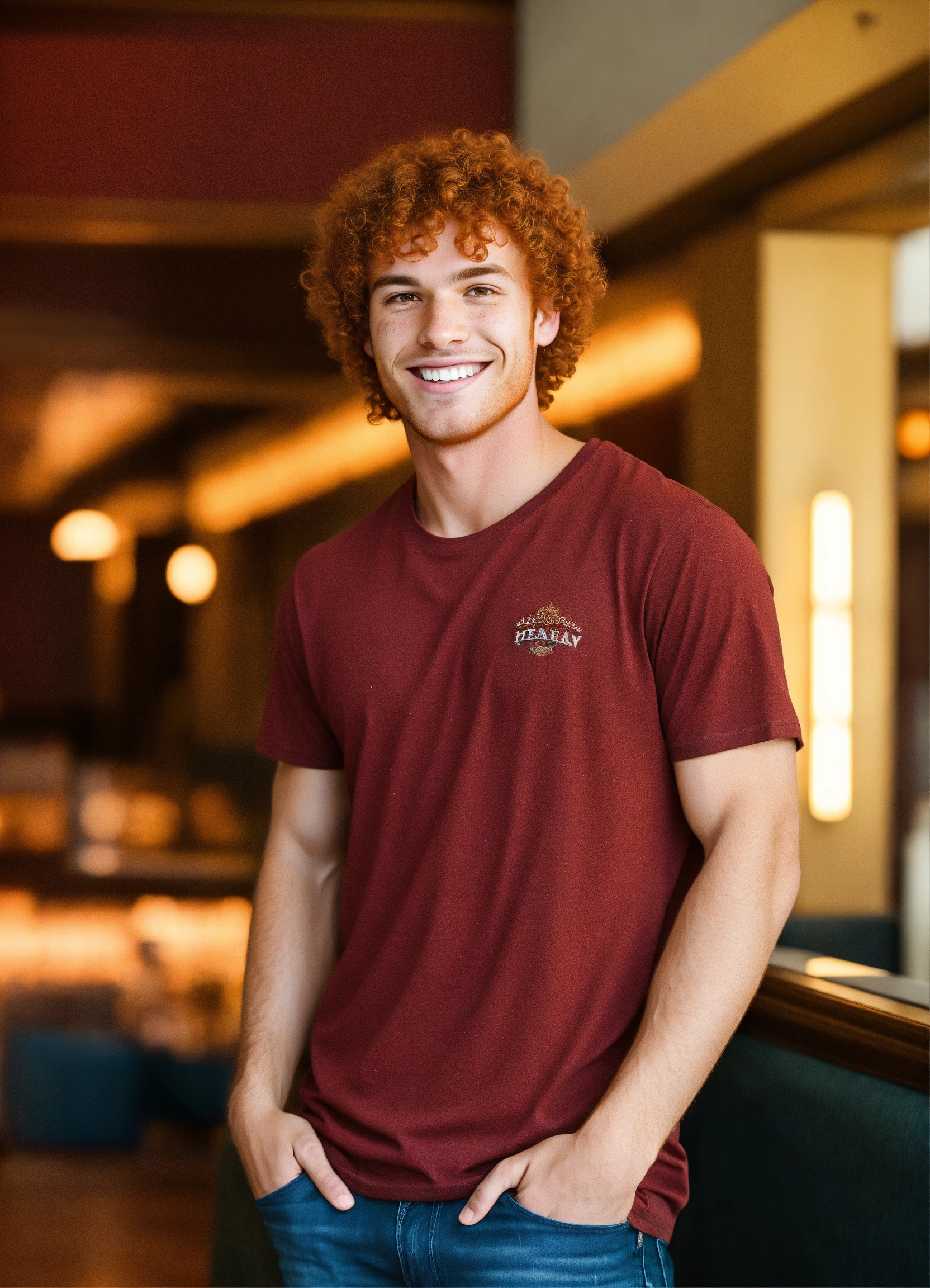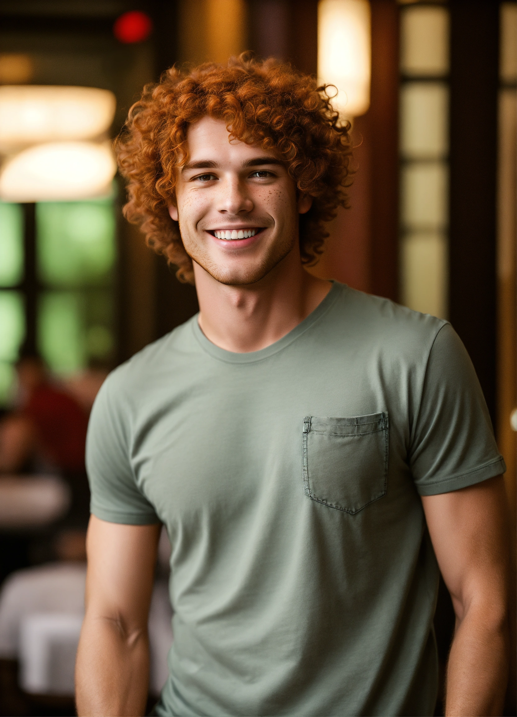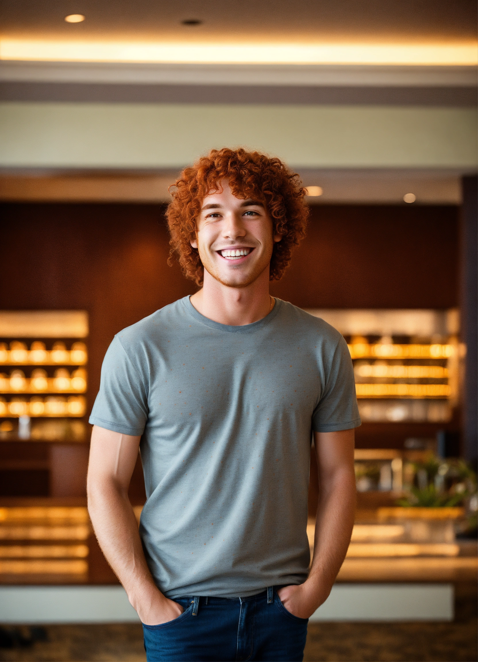 A college-aged male with red curly hair and large brown freckled skin is in a casual t-shirt and jeans, he is in an upscale hotel lobby and has an athletic frame and a happy persona