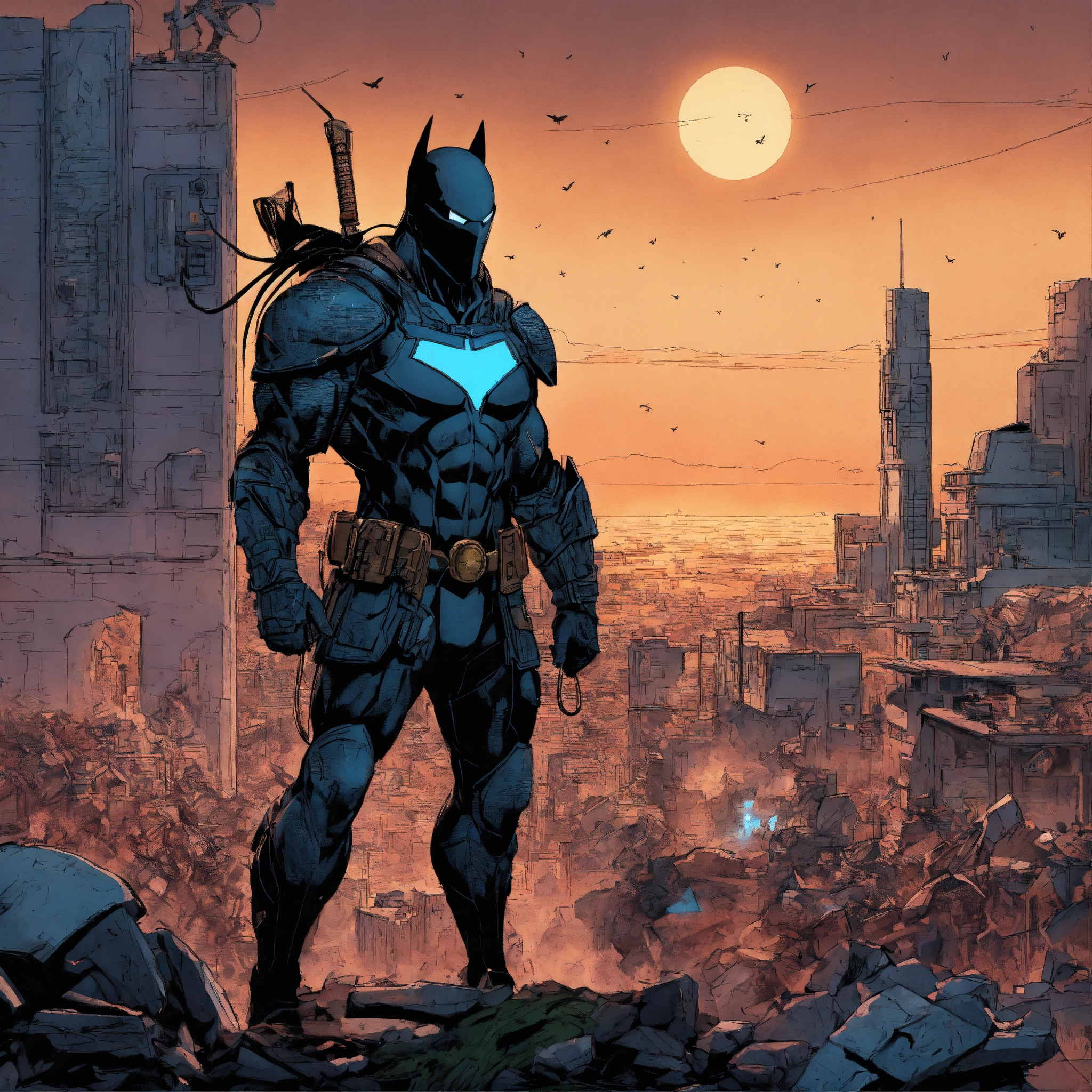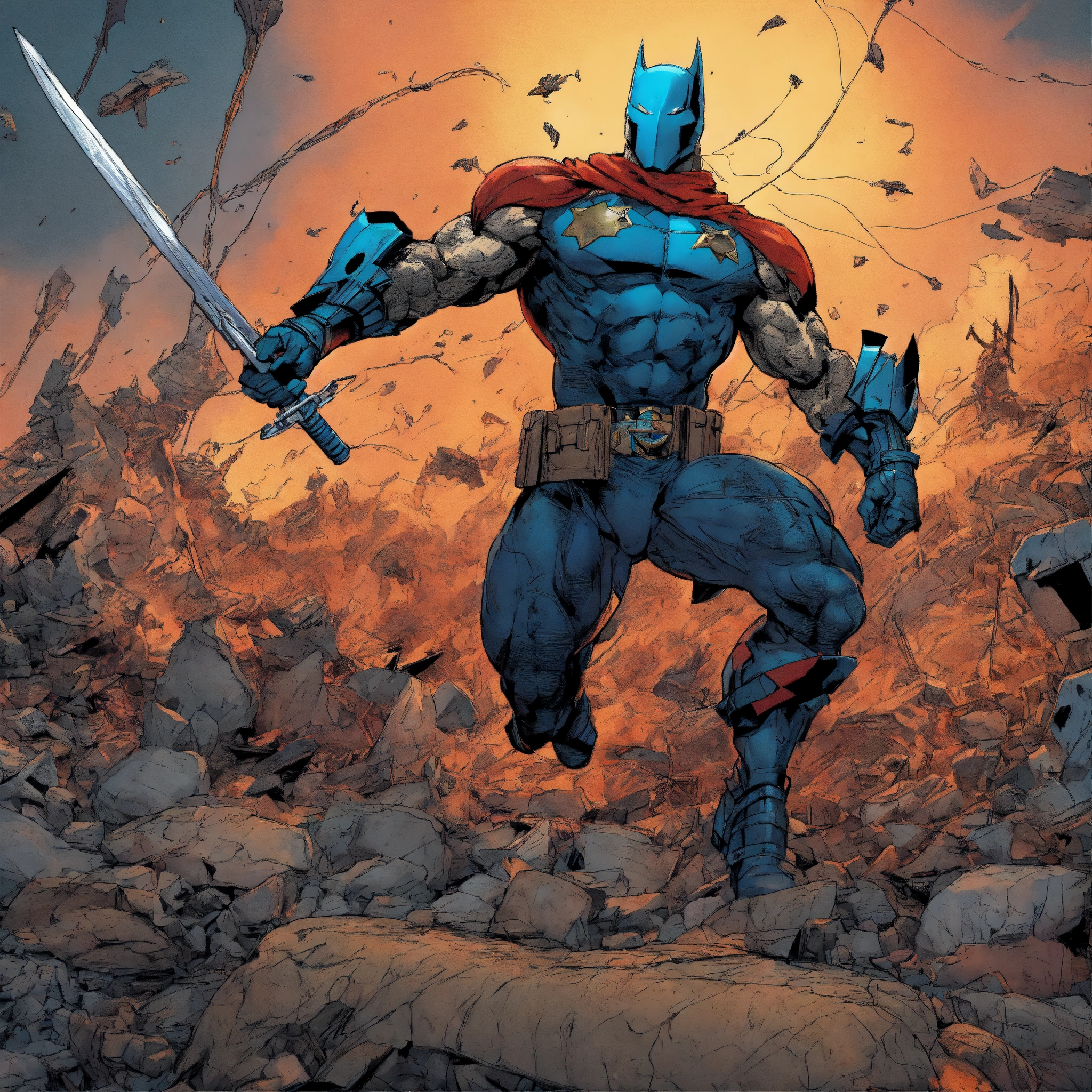 Imagine an anti-hero drawn in beautiful todd mcfarlane's minimalistic style. every muscle fiber, piece of armor, and surrounding environmental element is meticulously rendered. despite the chaos, the anti-hero exudes a calm and focused demeanor, ready to further disrupt order. the precise linework and overwhelming attention to detail create a visually stunning, immersive scene that invites viewers to explore every inch of the image. super clean style.
