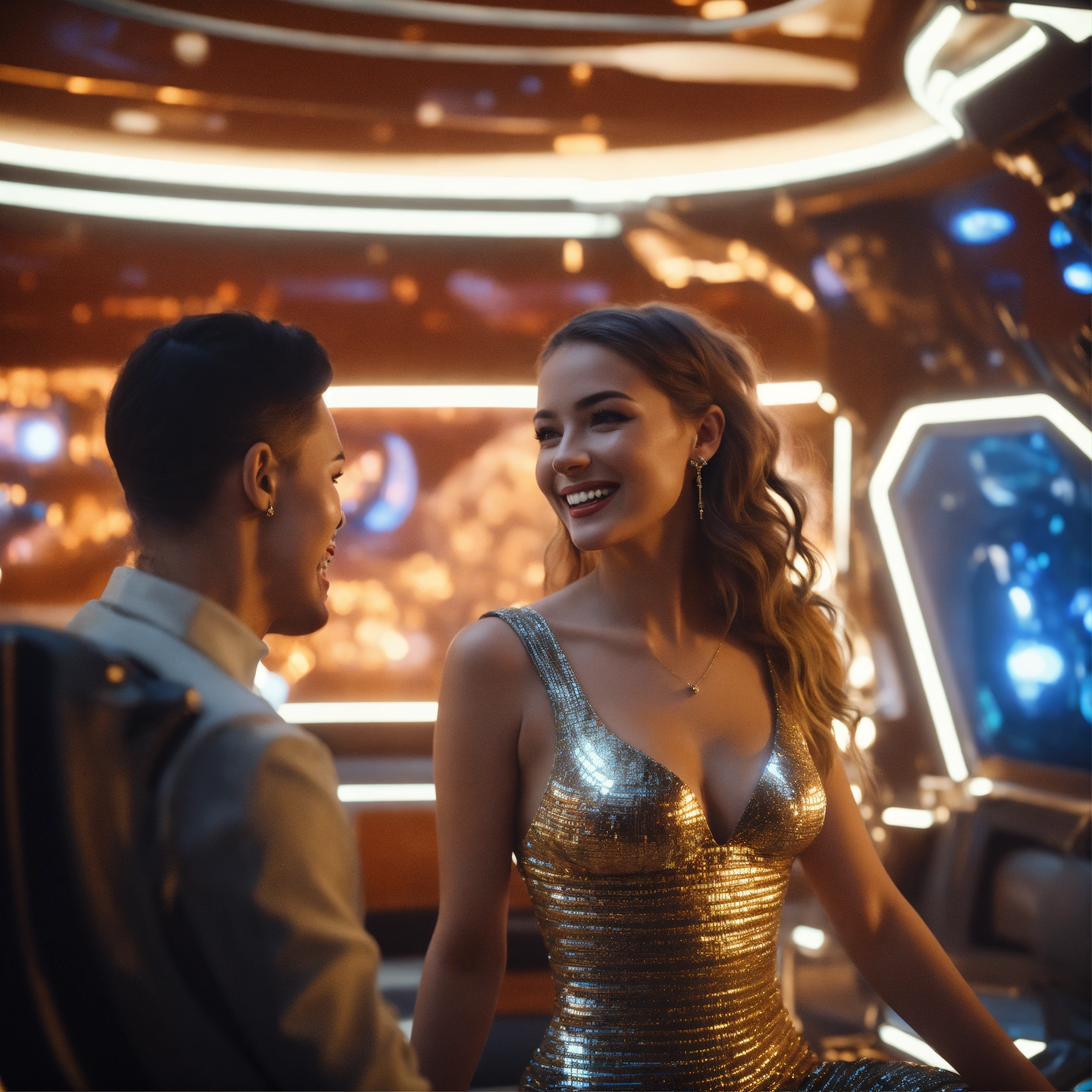 Zoom out from beautiful young babe wearing a fancy 38d space dress and expensive jewelry in a futuristic space hotel lounge laughing with a man, realistic, futuristic, sci-fi, 8k, unreal engine