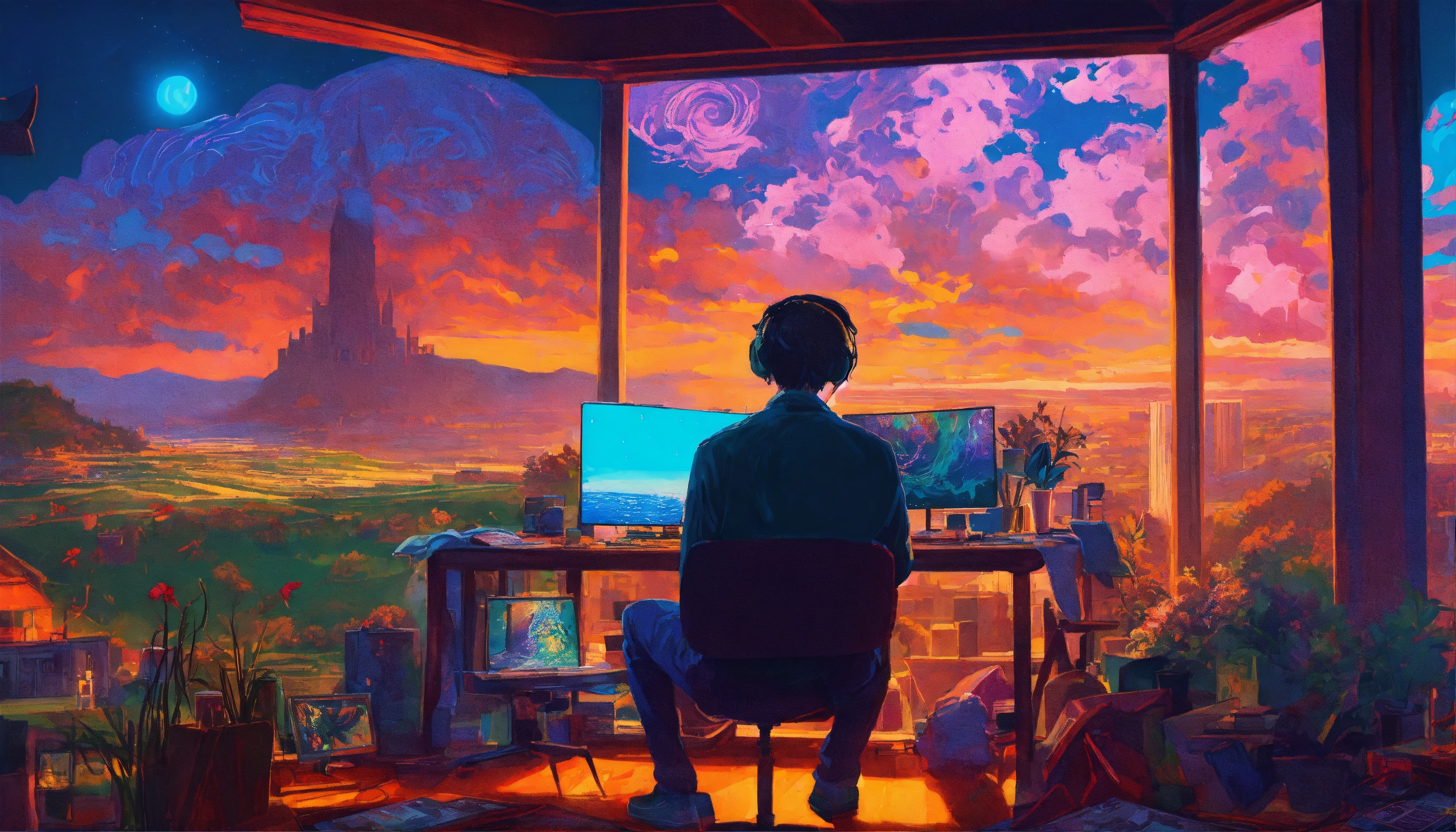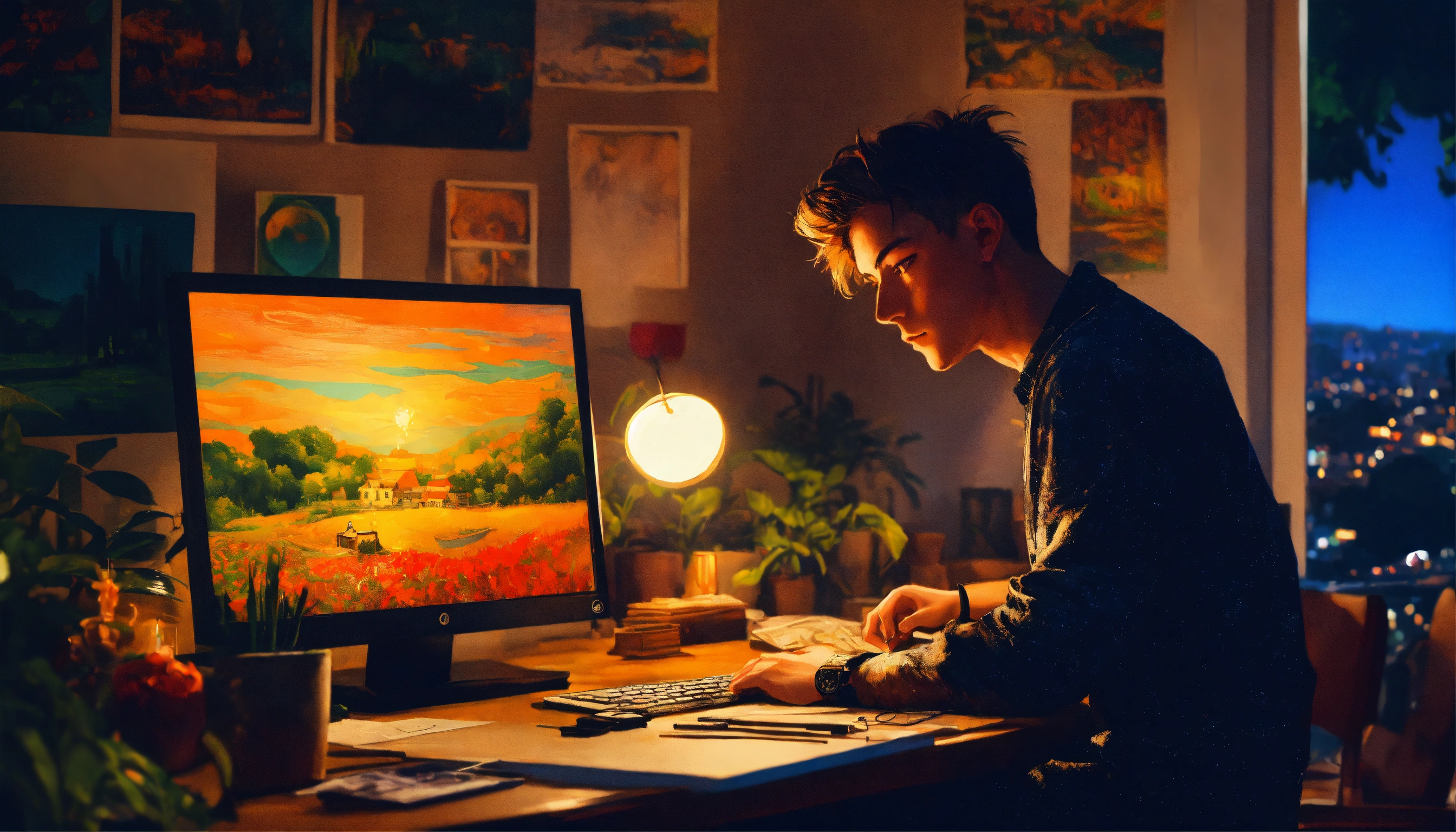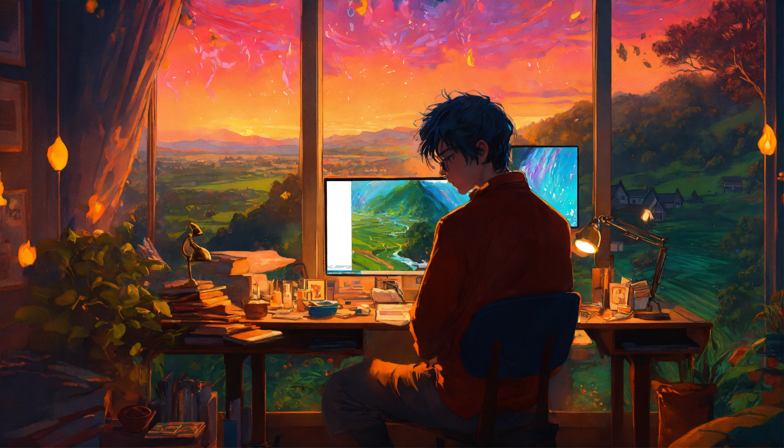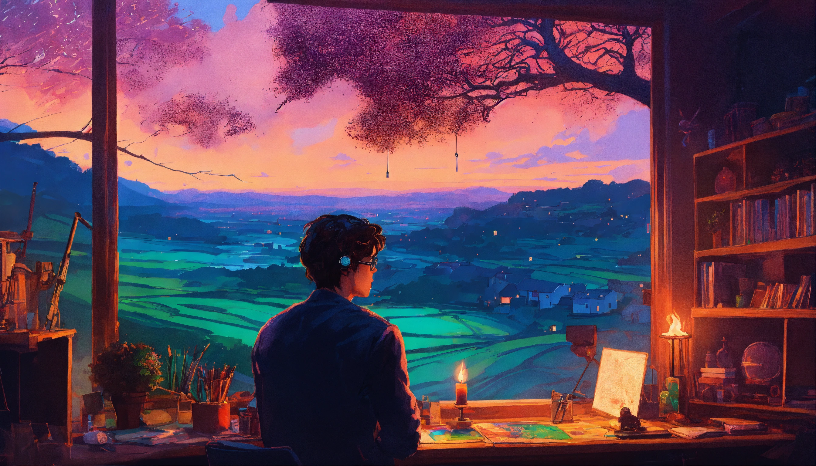 Young man at his desk at midnight in front of his computer, candle lit, dreaming of a lush english village landscape with a waterfall and wild animals, art by victor moscoso and bridget riley girl make it magical by carne griffiths fluid art, conrad roset ilya kuvshinov, mark fielding, tim burton, zwy studio high lights in eyes, salt, ultra detailed, cinematic.