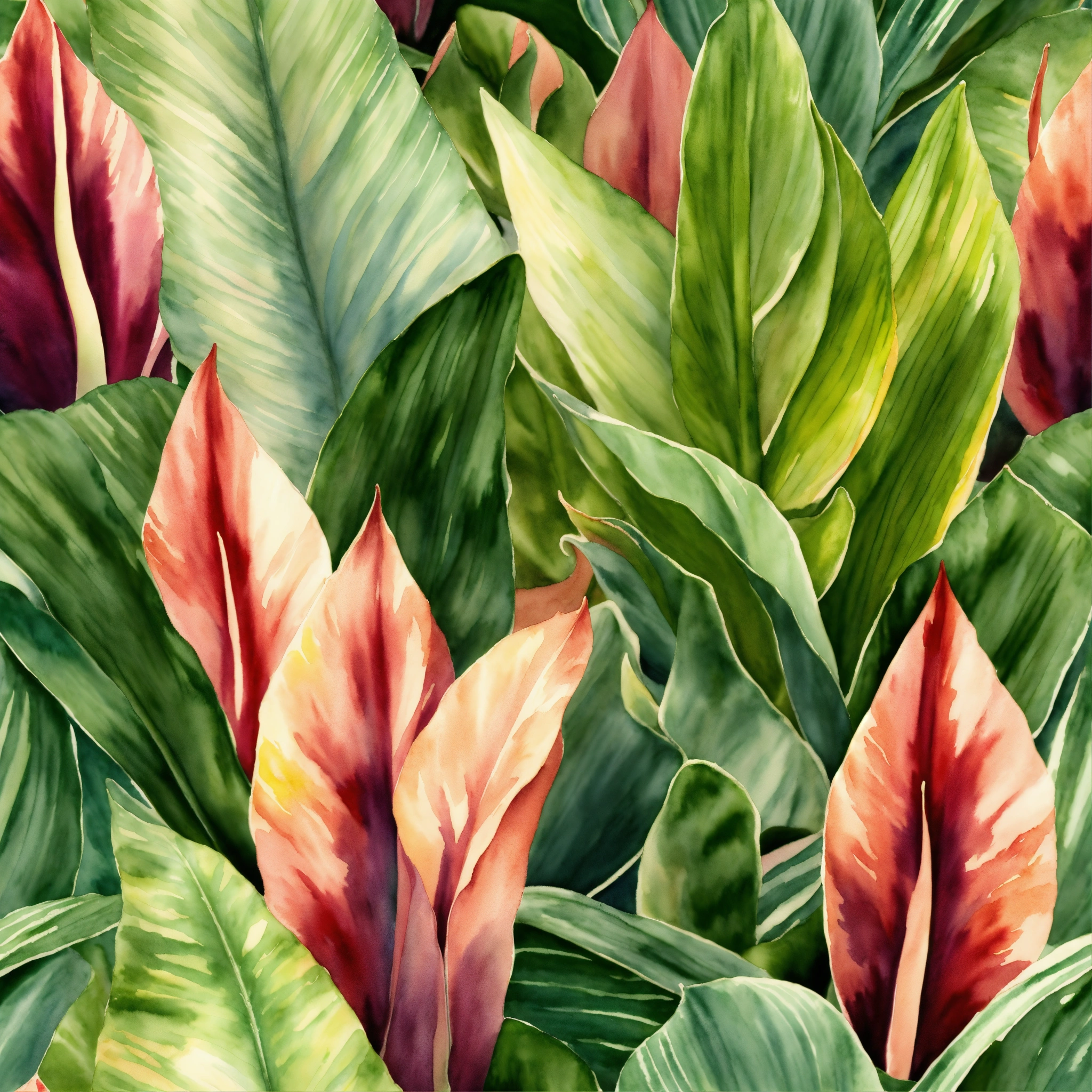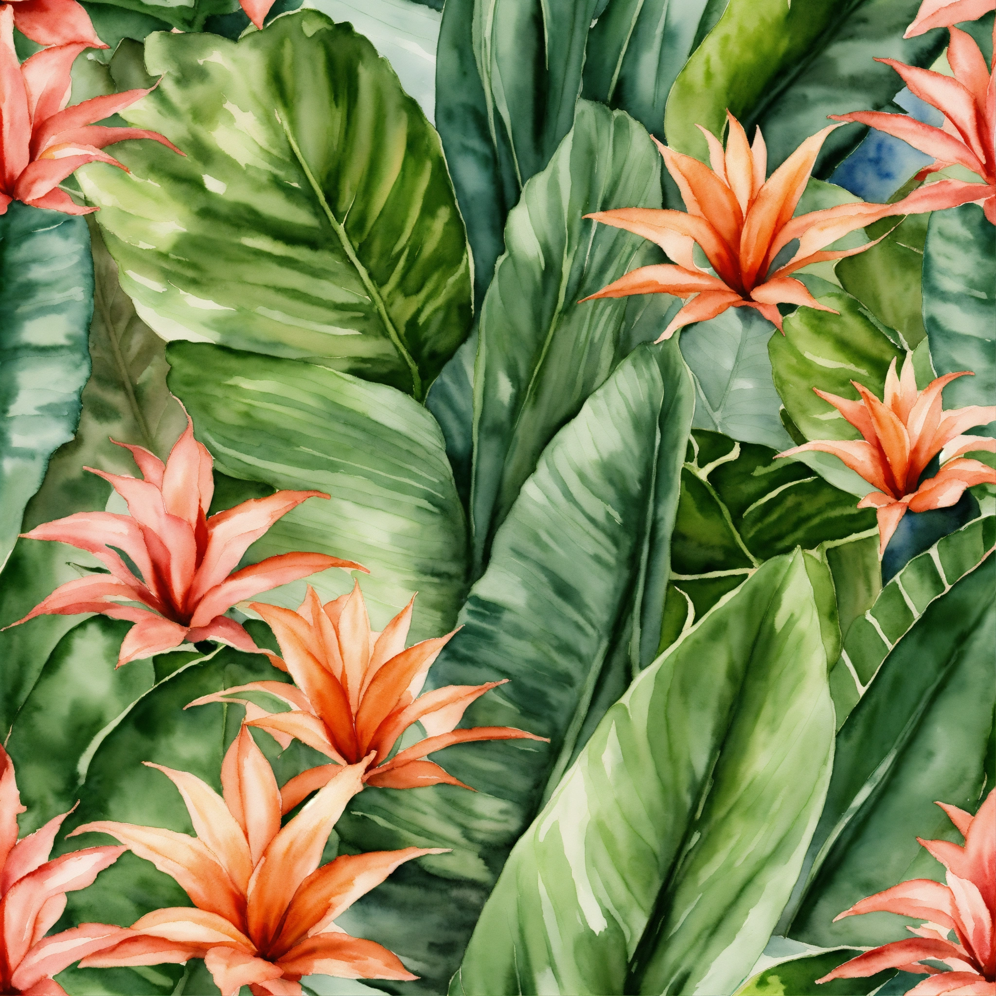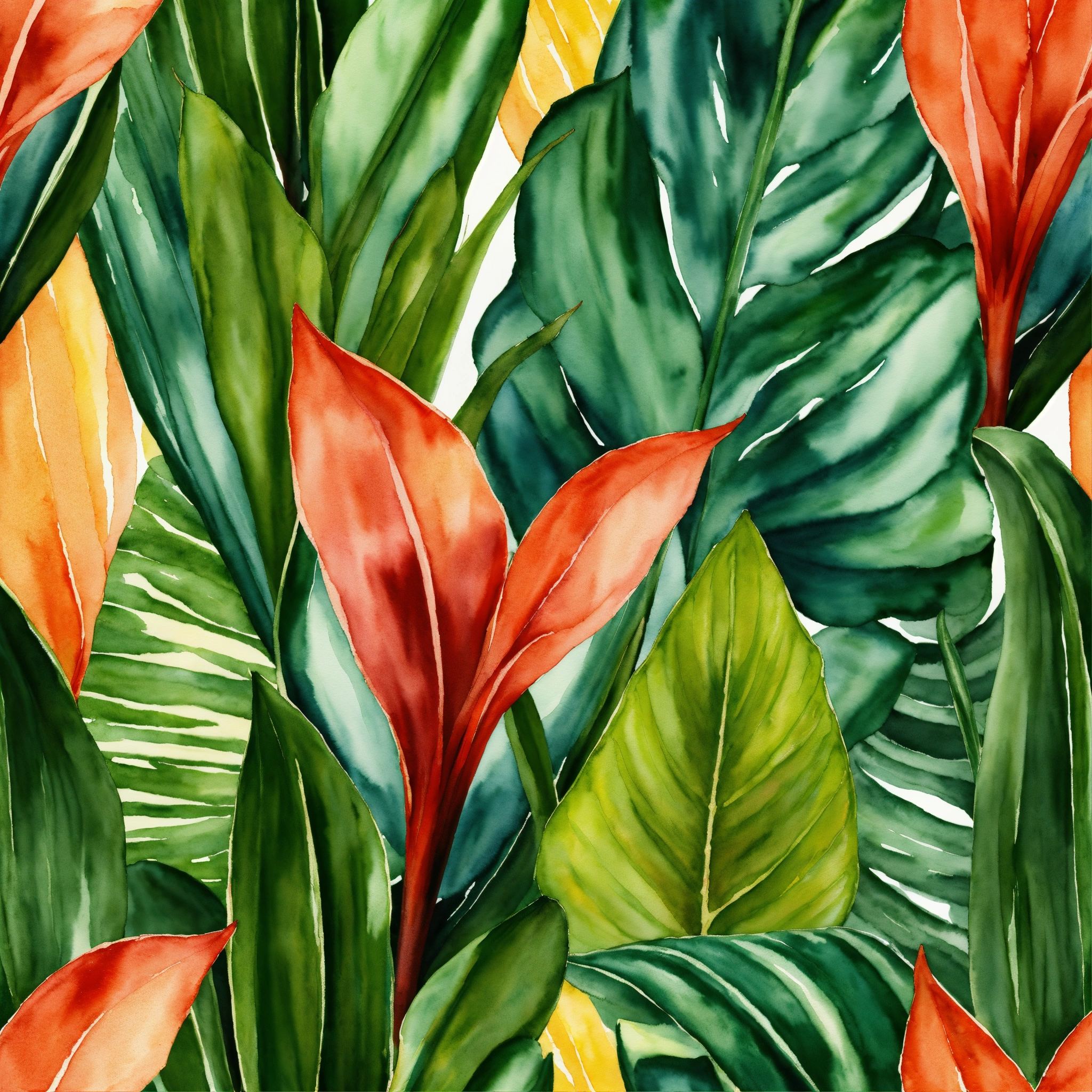 Pattern of large subtropical leaves and tropical plants and watercolor sansevieria flower, photorealistic with intense warm tones, 8k high resolution