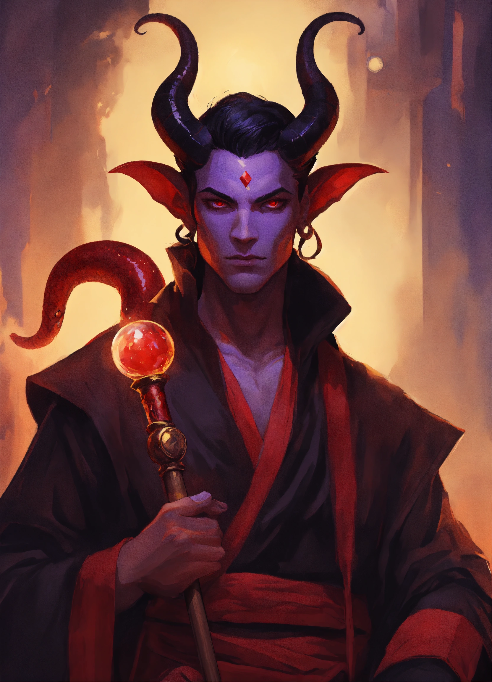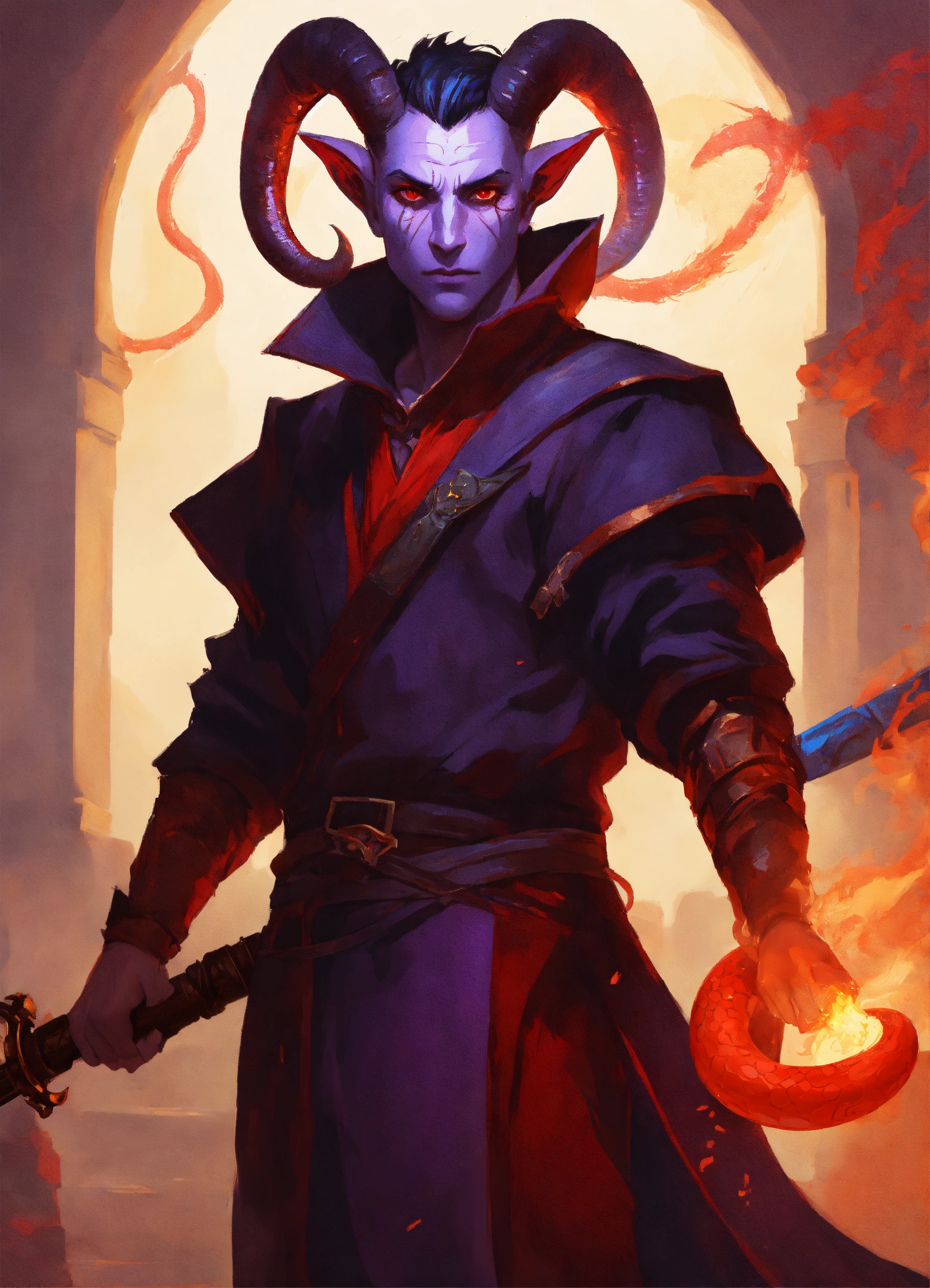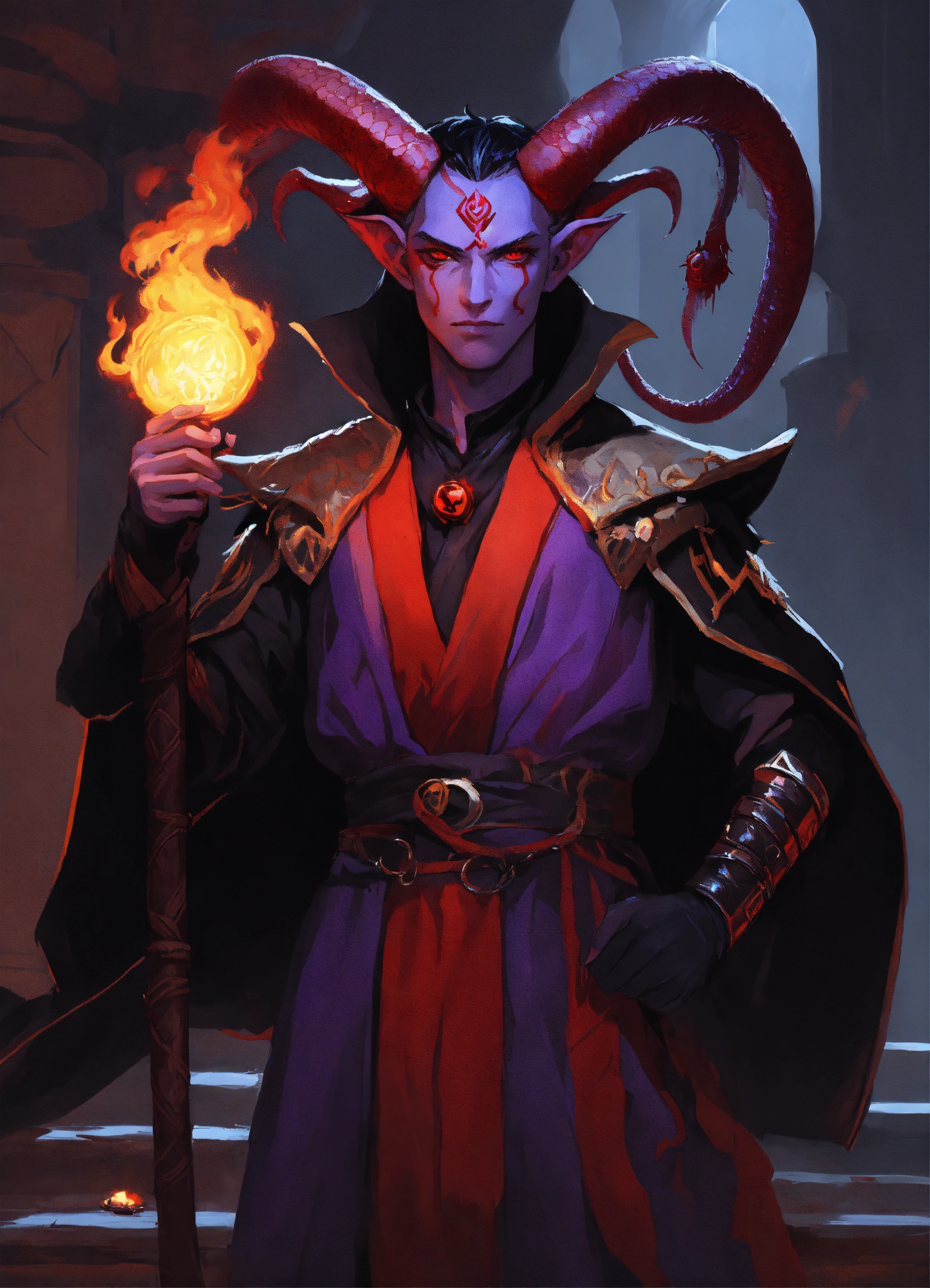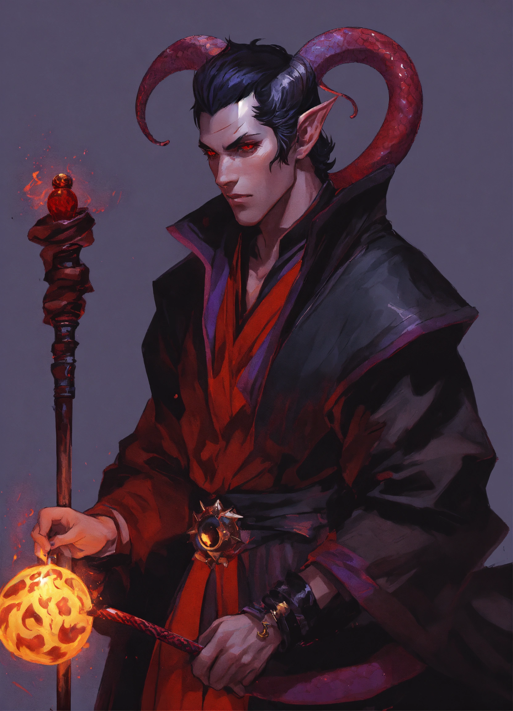 A d&d tiefling with pale red skin and red snake like eyes, he has black horns with one of them broken in half, he is wearing black robes with red and purple as secondary colours, he holds a small wooden wand about the length of half a forearm, in the other hand he holds a fireball, he has short black hair which reaches just above his shoulders