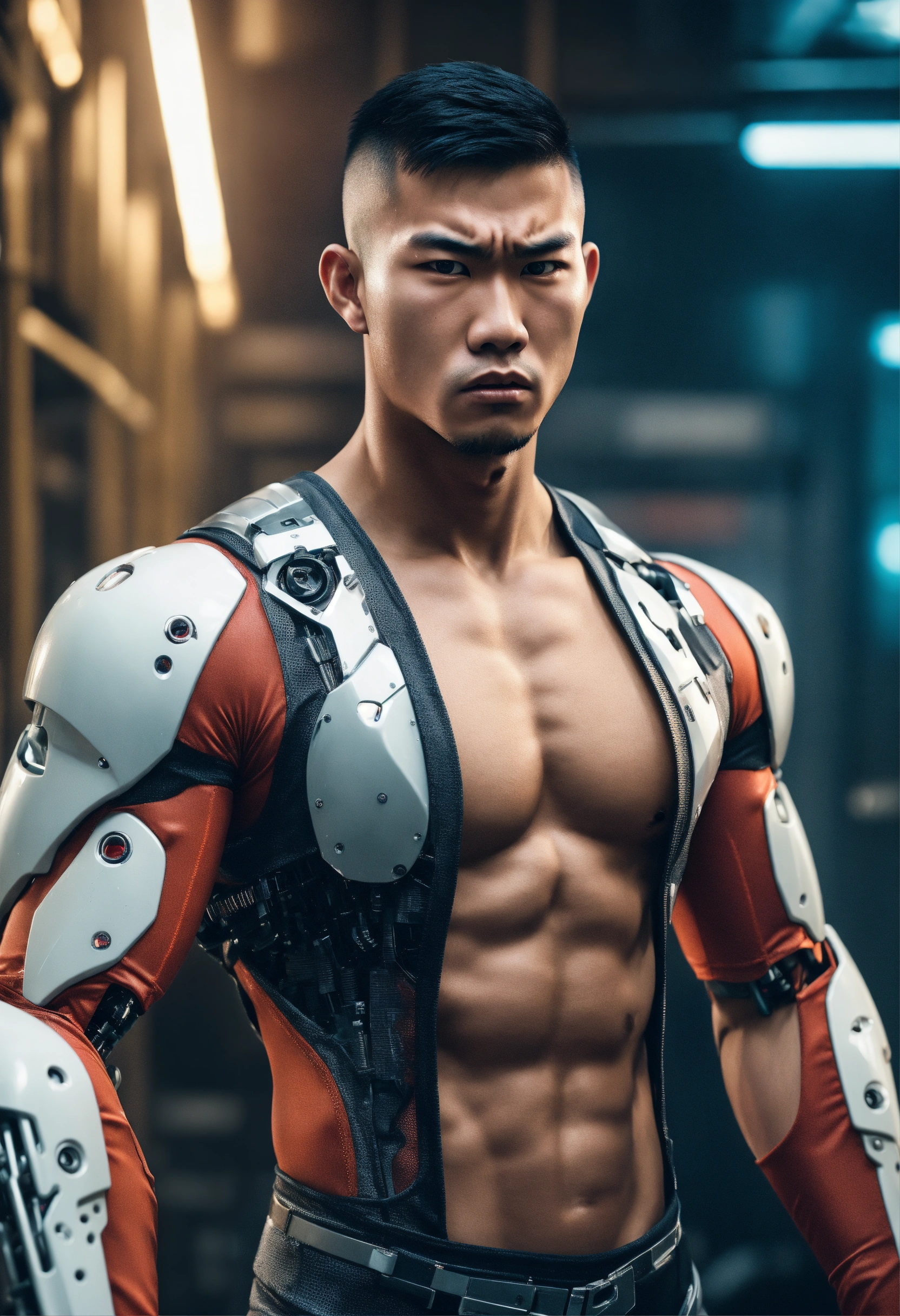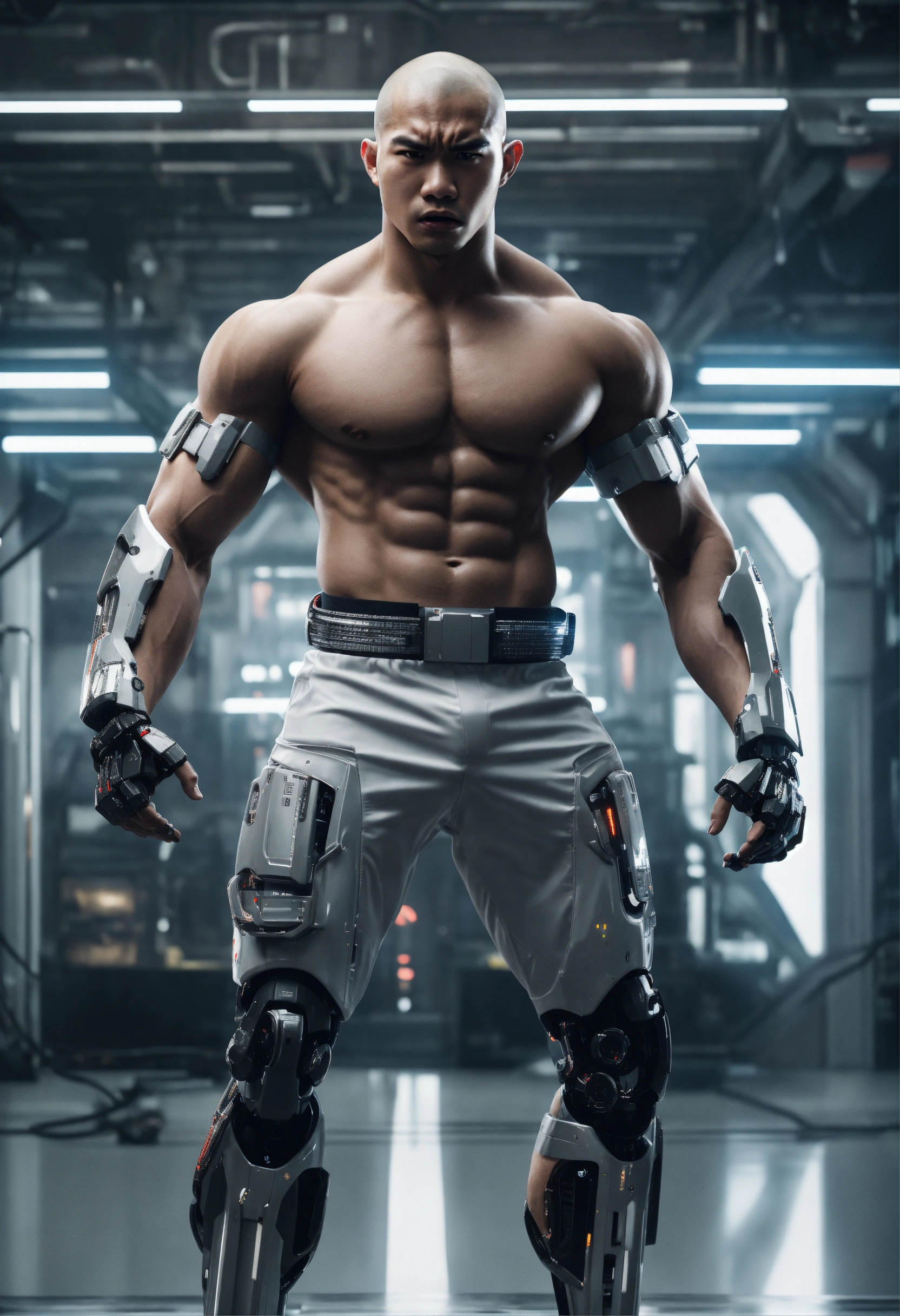 A realistic photo of an asian 20-year-old man with a very angry expression. very big muscled body, sharp nose, scary looking, completely shaved head, with only one robotic metal left arm, wearing futuristic training clothing in a white sci-fi background. ultrarealistic, ultradetailed, 8k