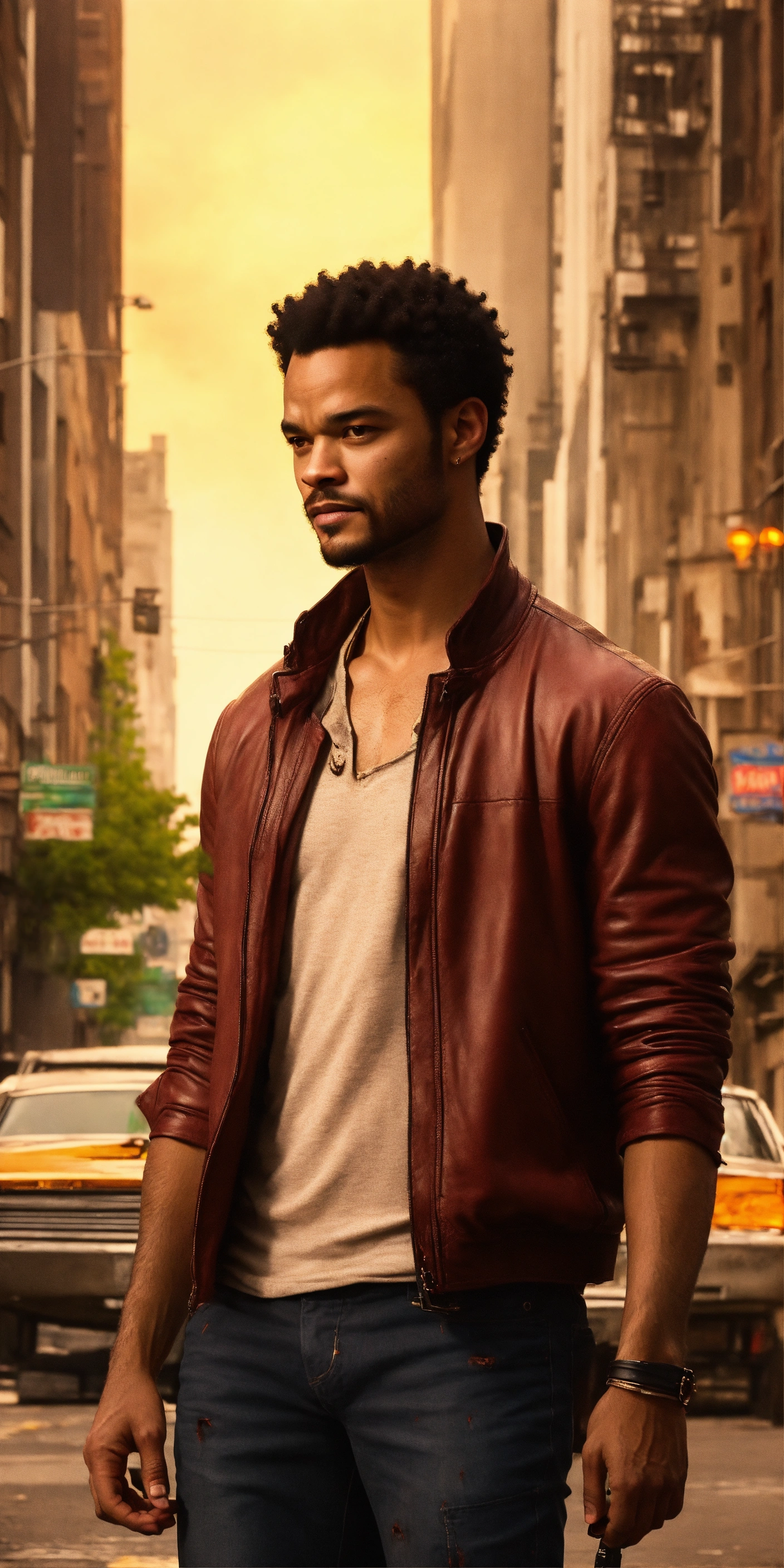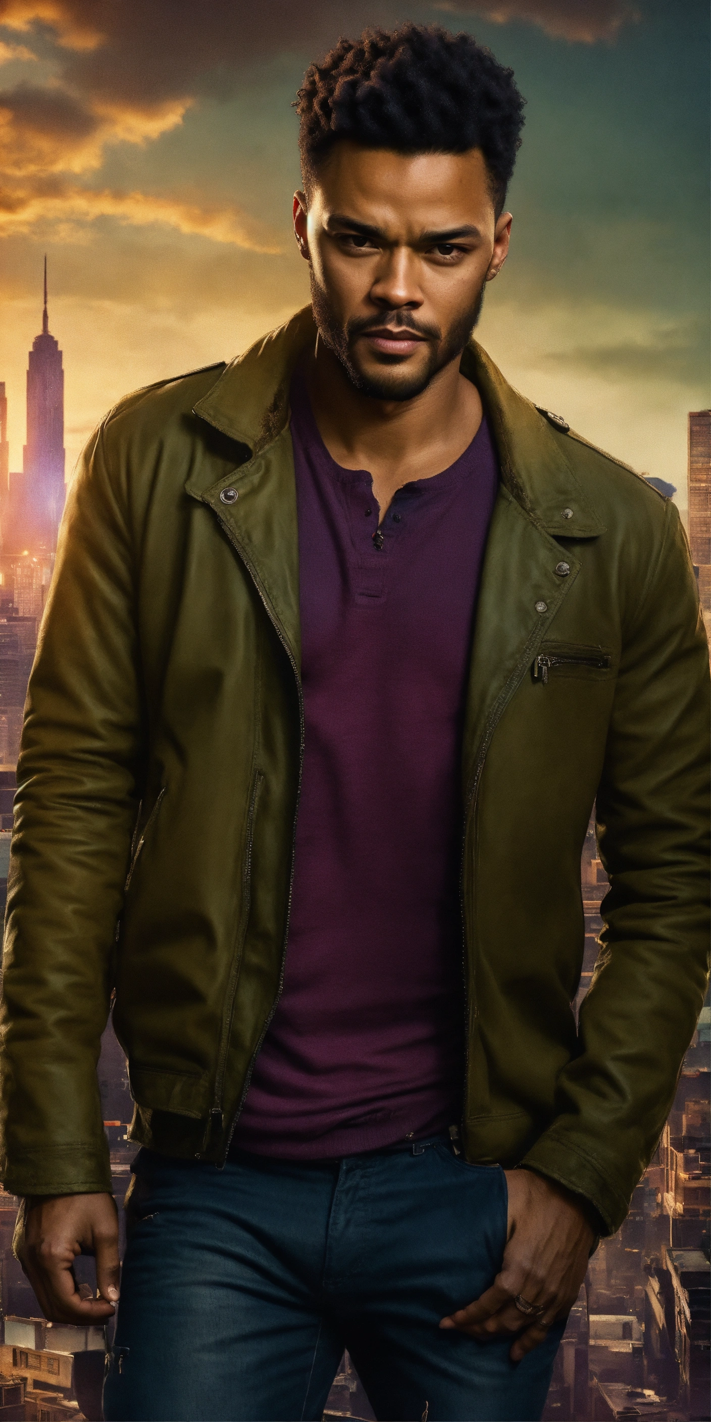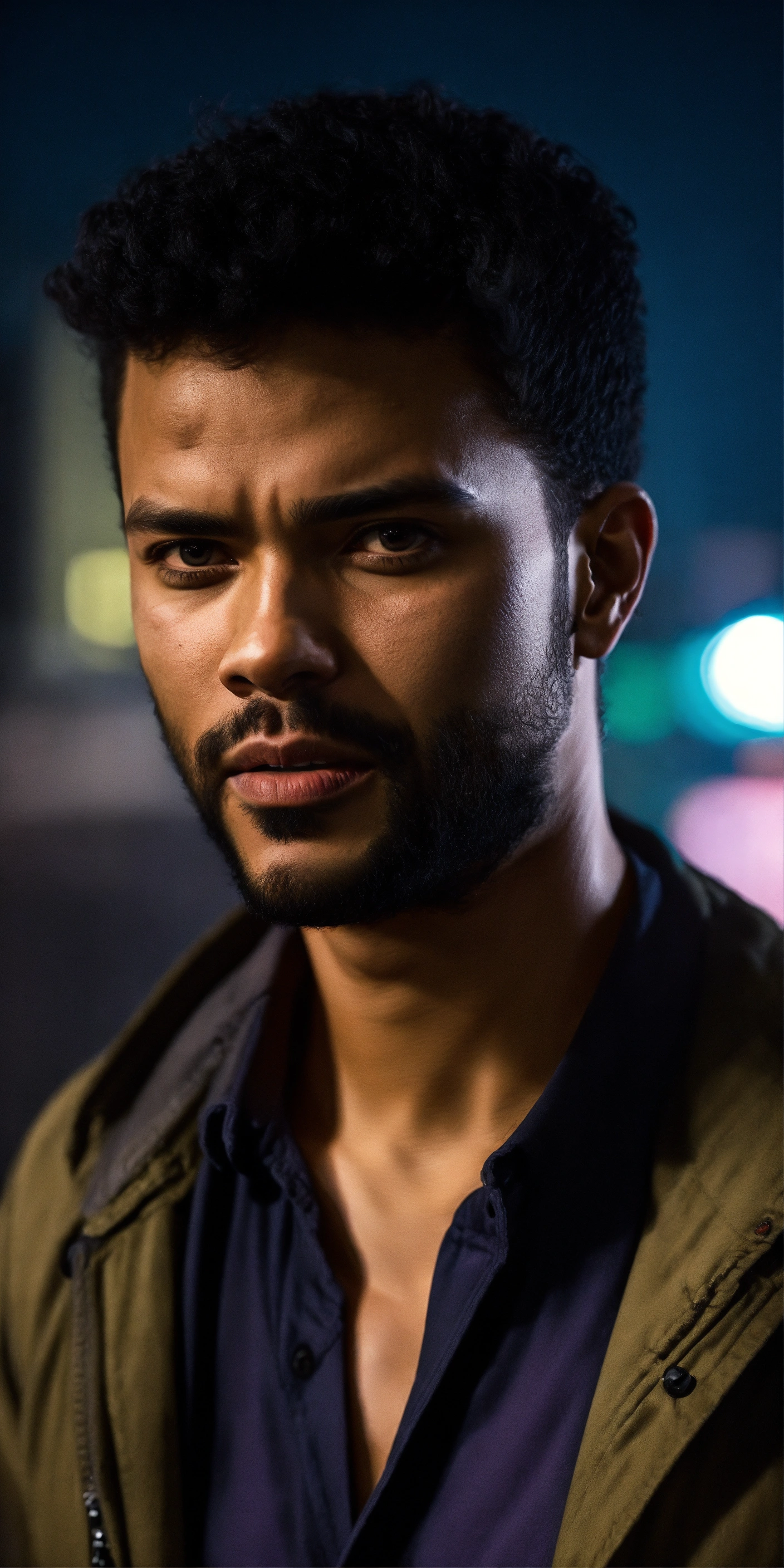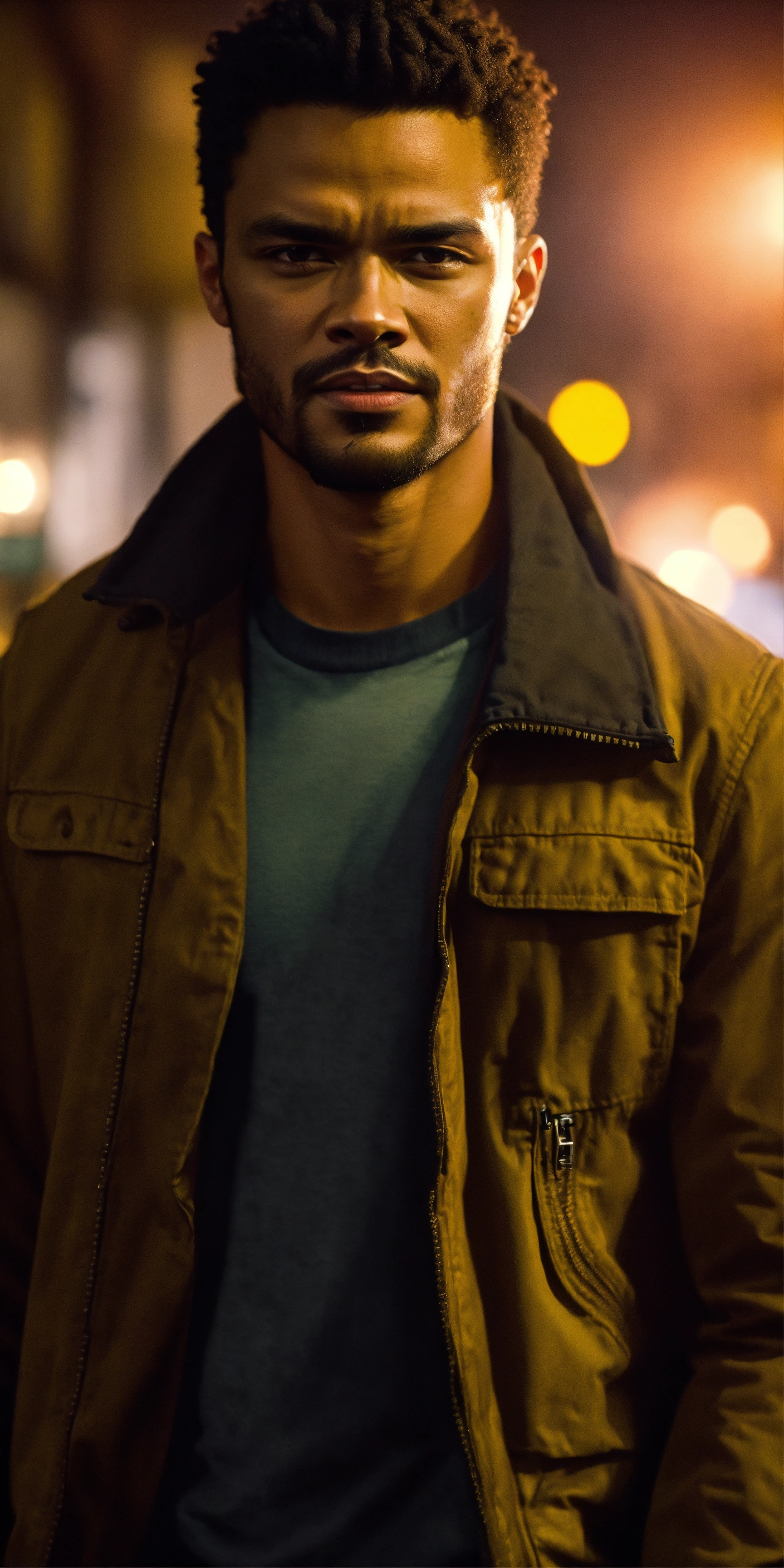 Handsome nice eka darville, zombie-infested city, dark, cinematic, jessica jones style, short hair, short temples, soft smile