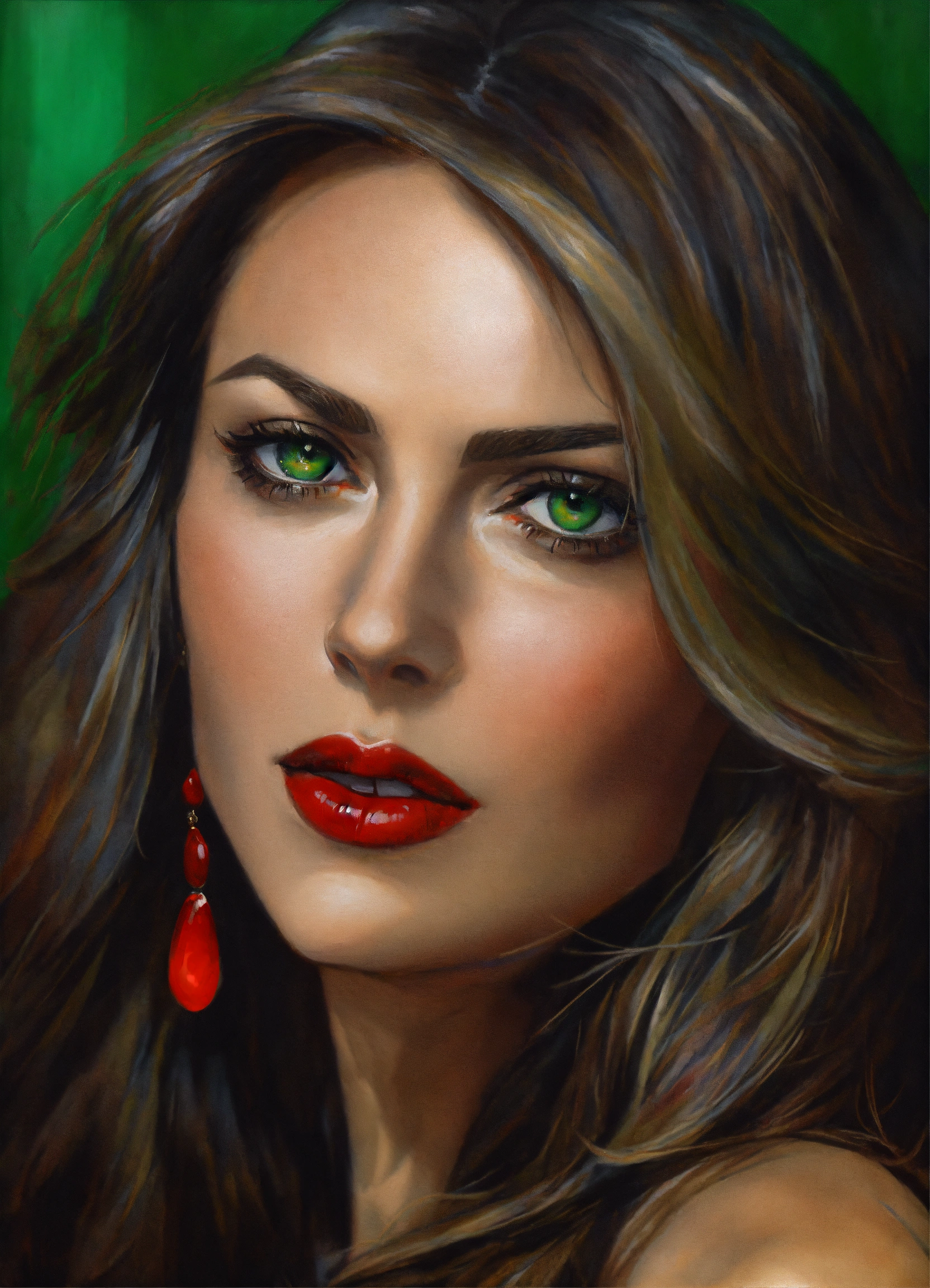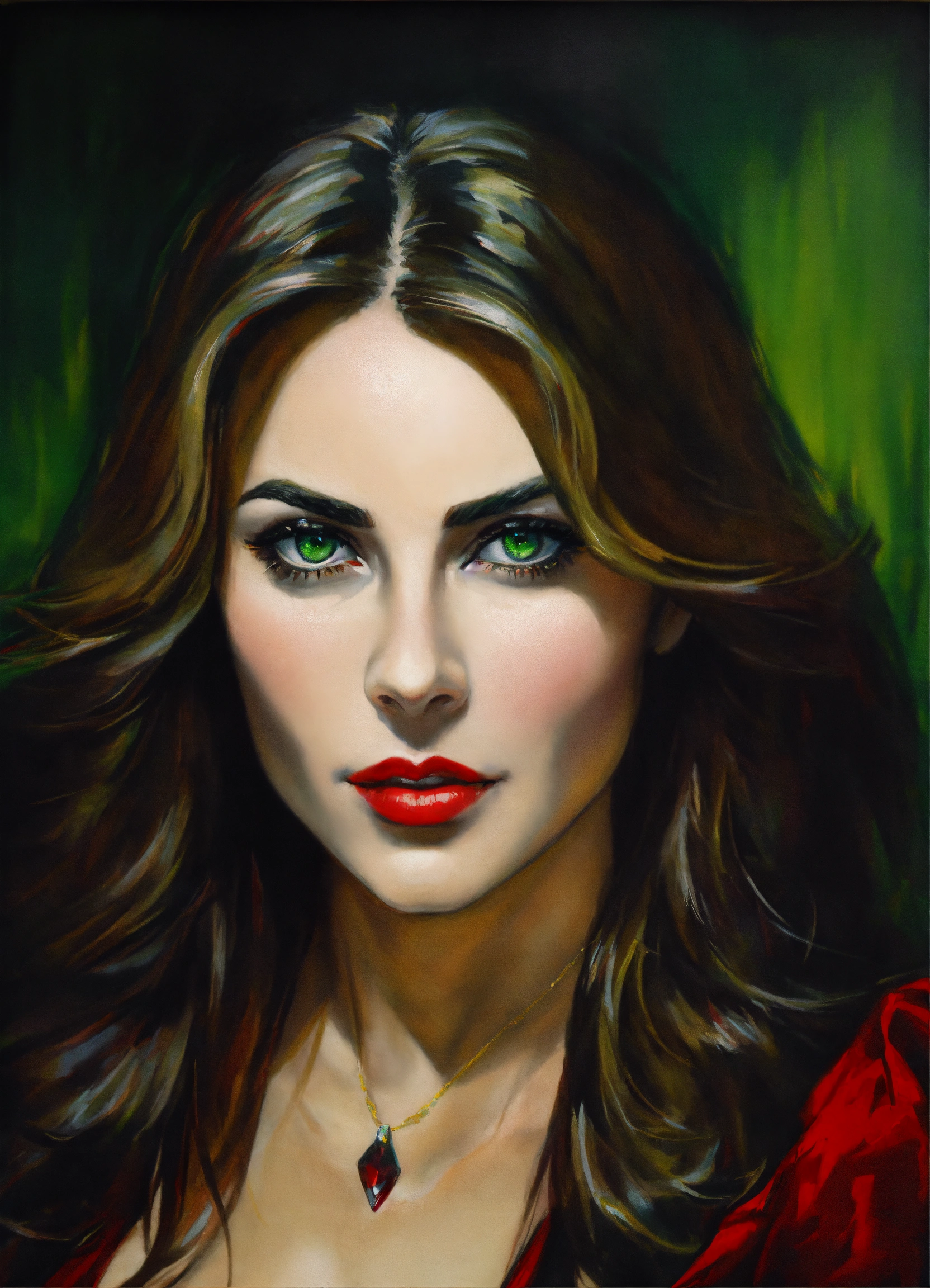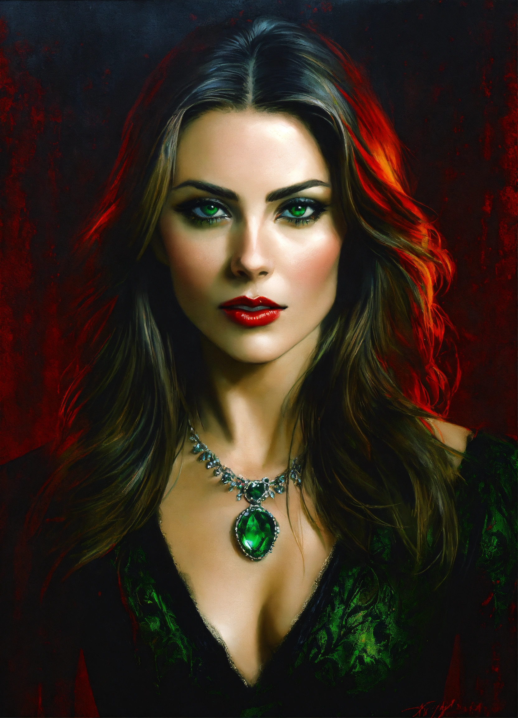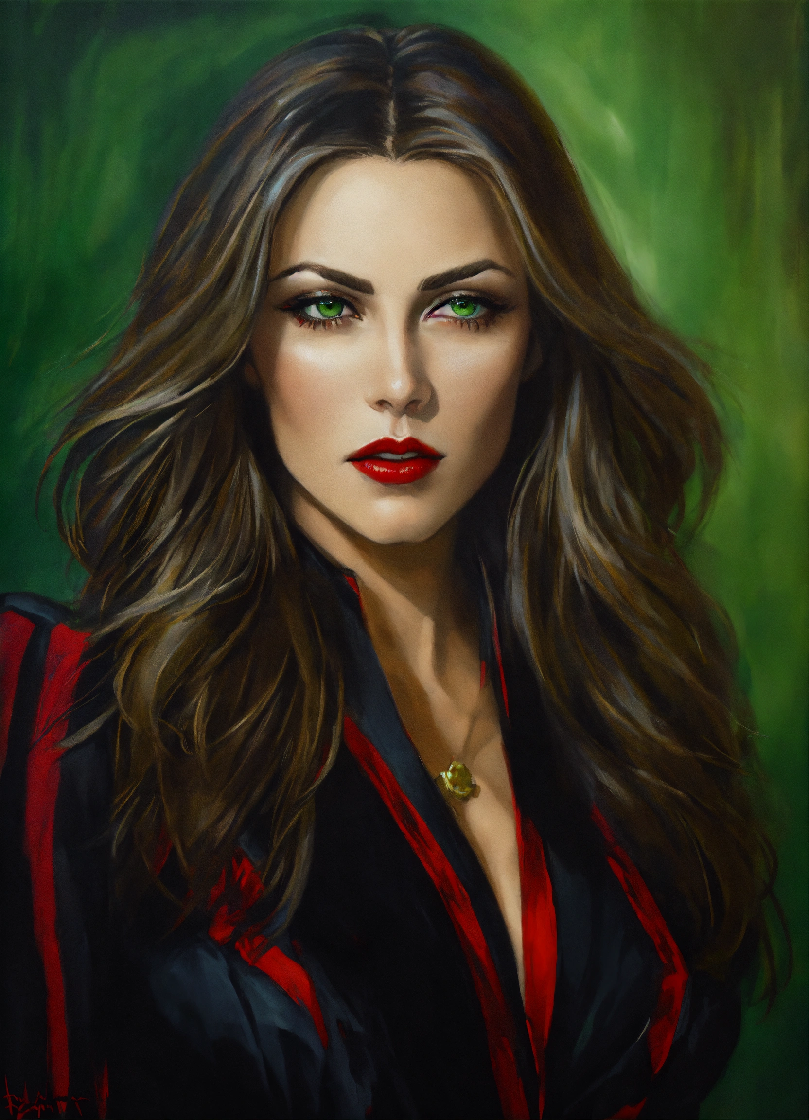 Portrait of elizabeth hurley as a dark vampire with red lips and green eyes
