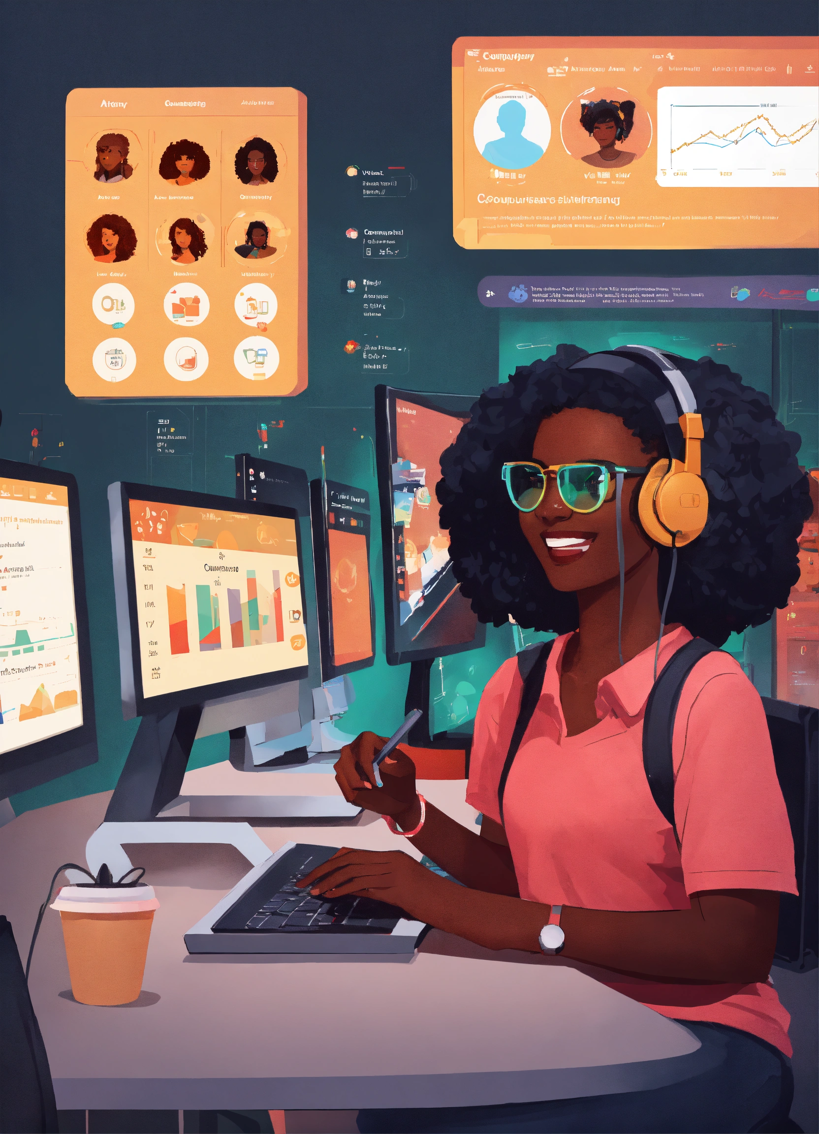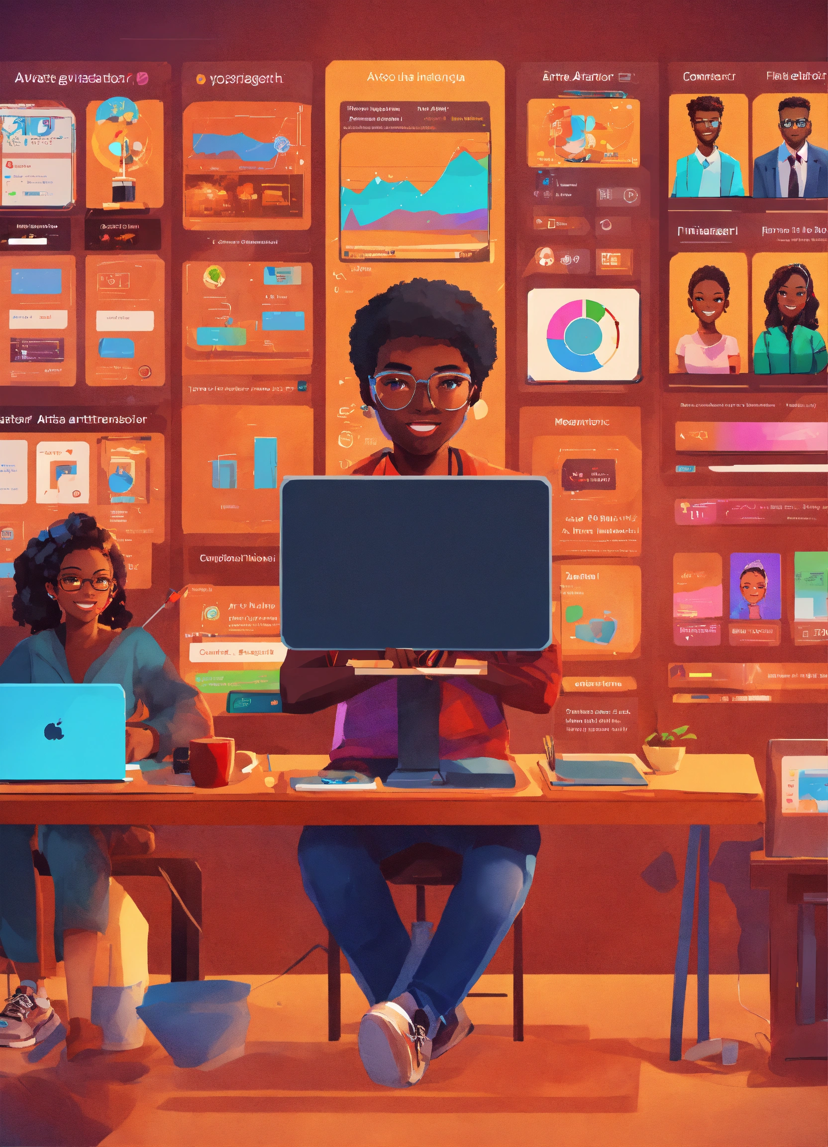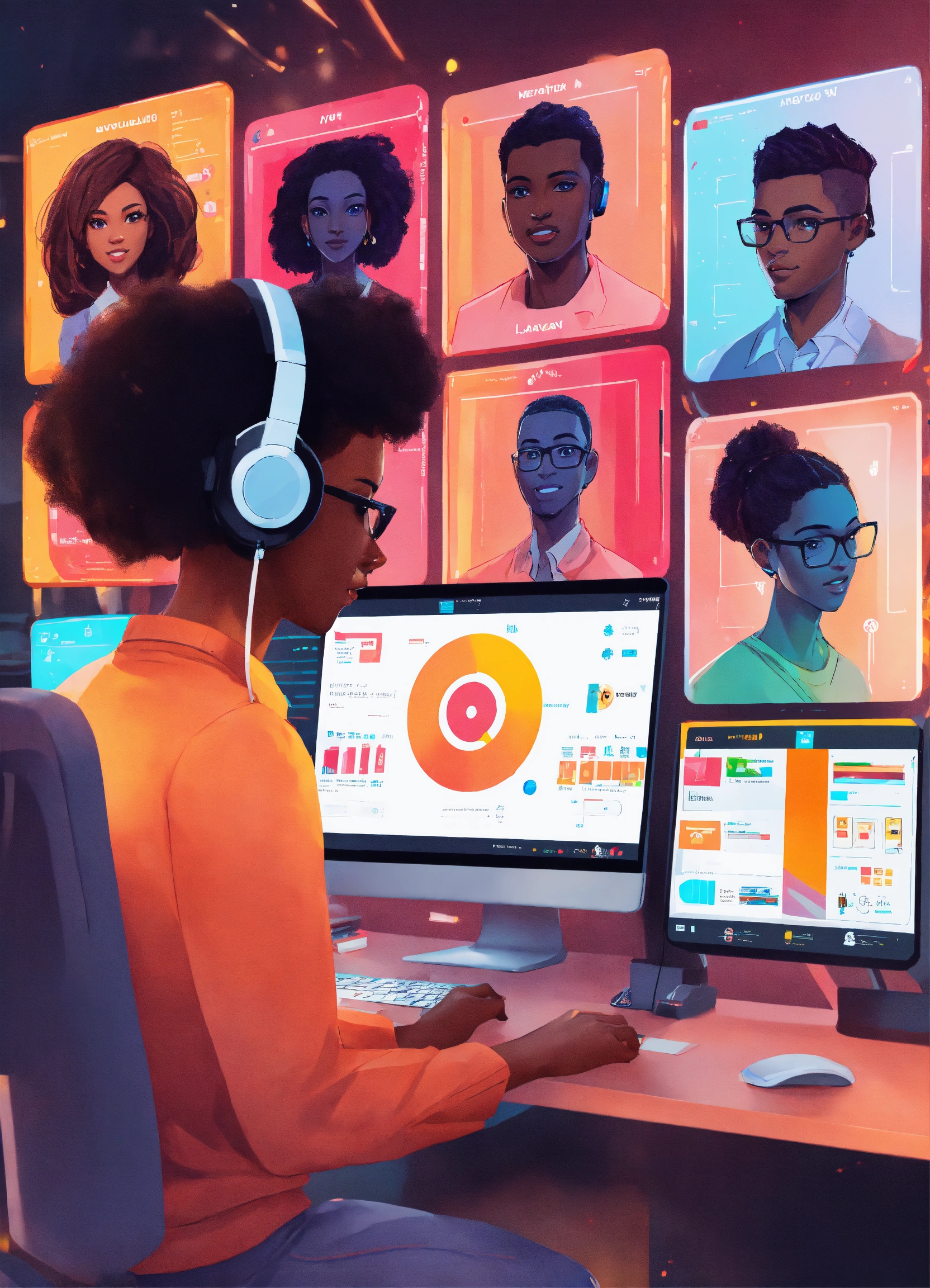 Trending on artstation, a virtual classroom with african student avatars behind computer screens. each avatar has an accompanying engagement meter or dashboard. algorithmic icons scan the meters, flagging or highlighting instances of low engagement or distraction with alert symbols.