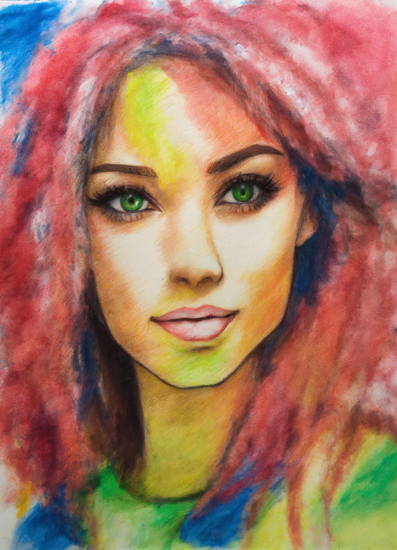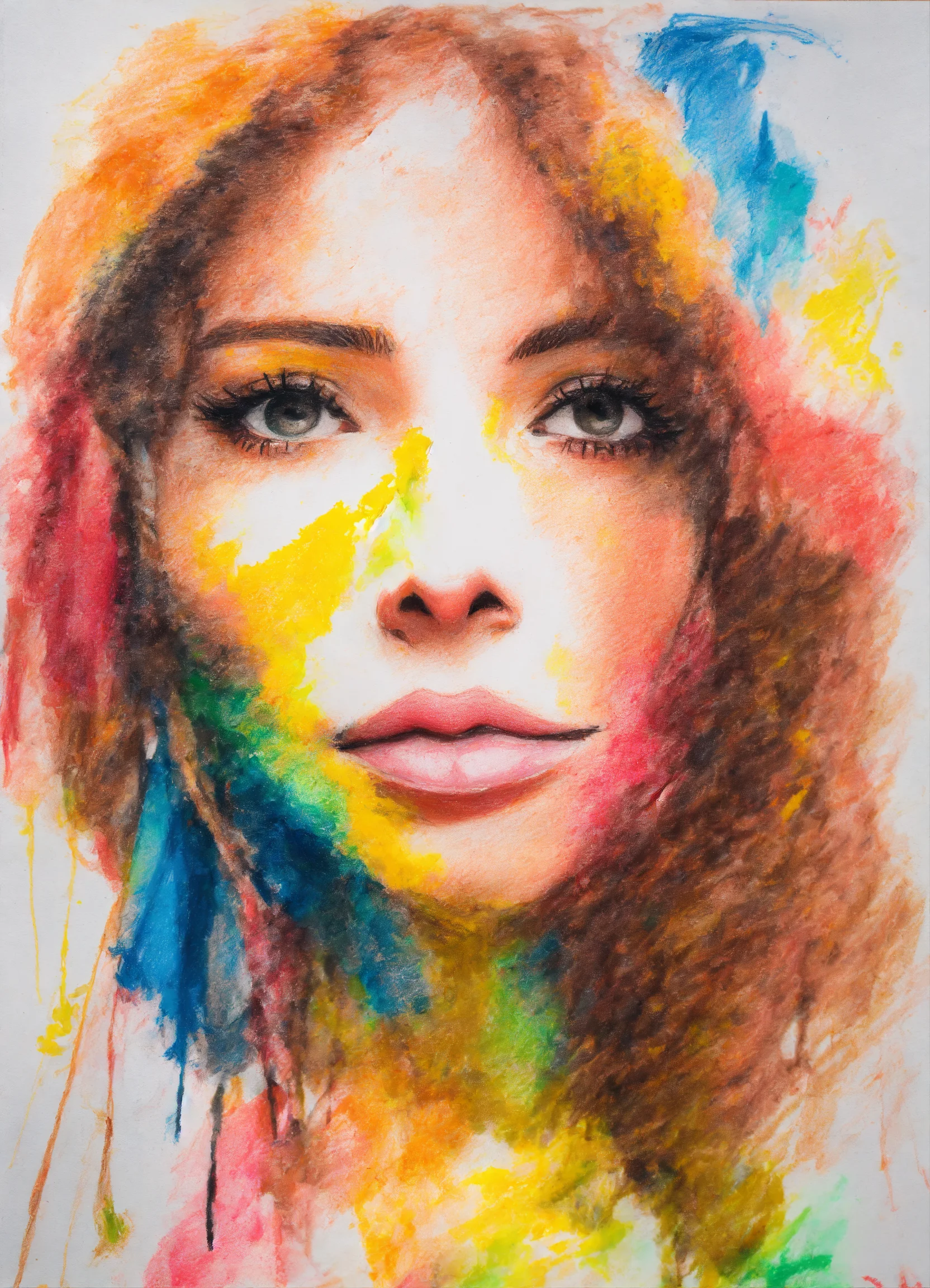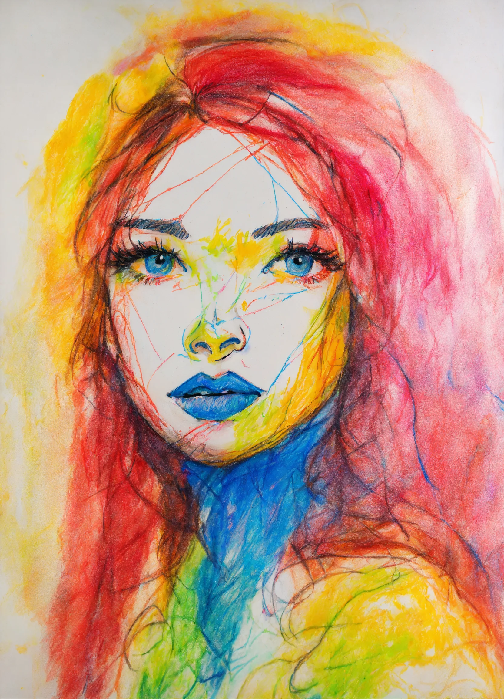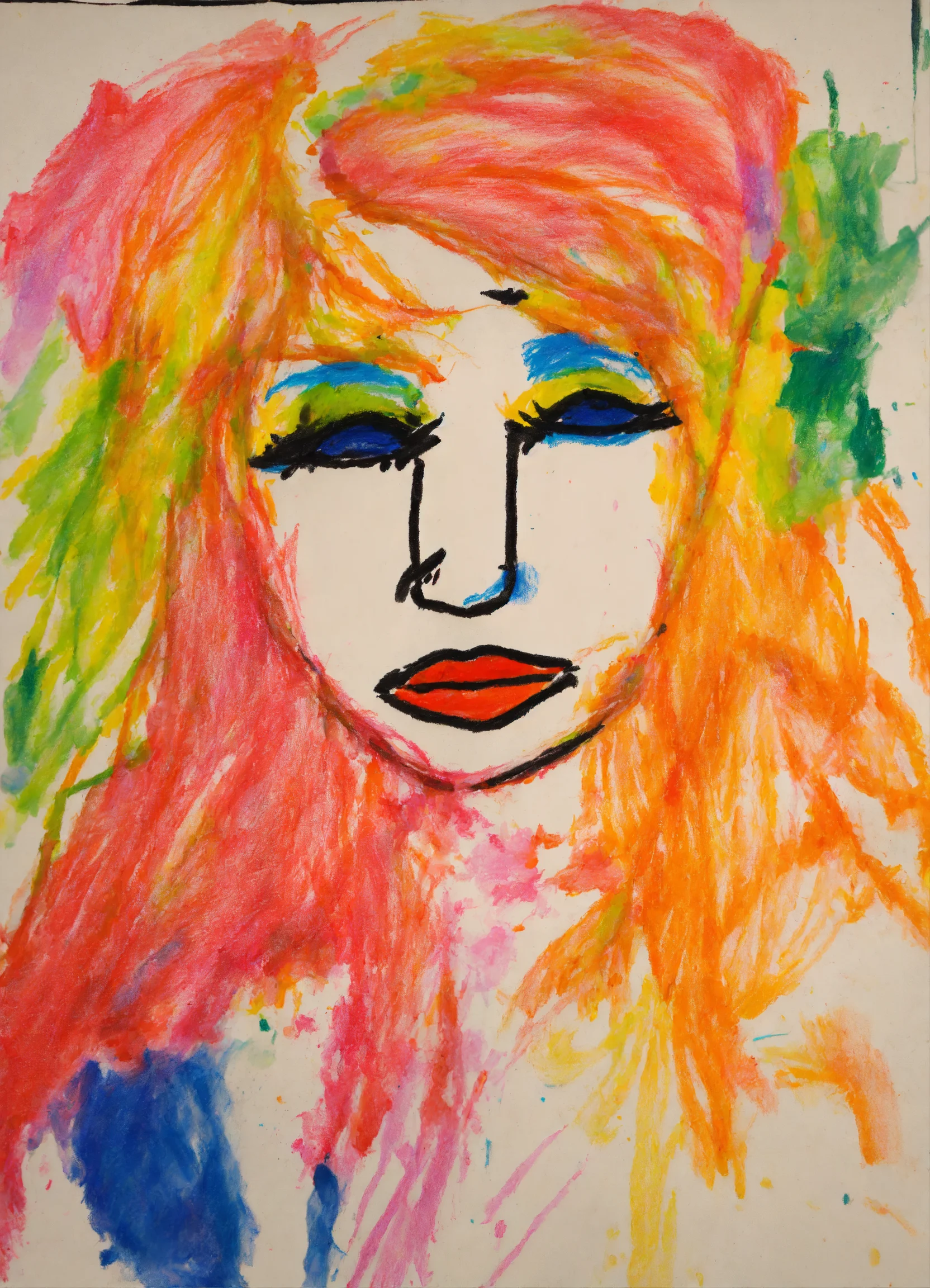 Messy ugly colorful crayon drawing of a pretty woman, done by a 3 year old on white construction paper.