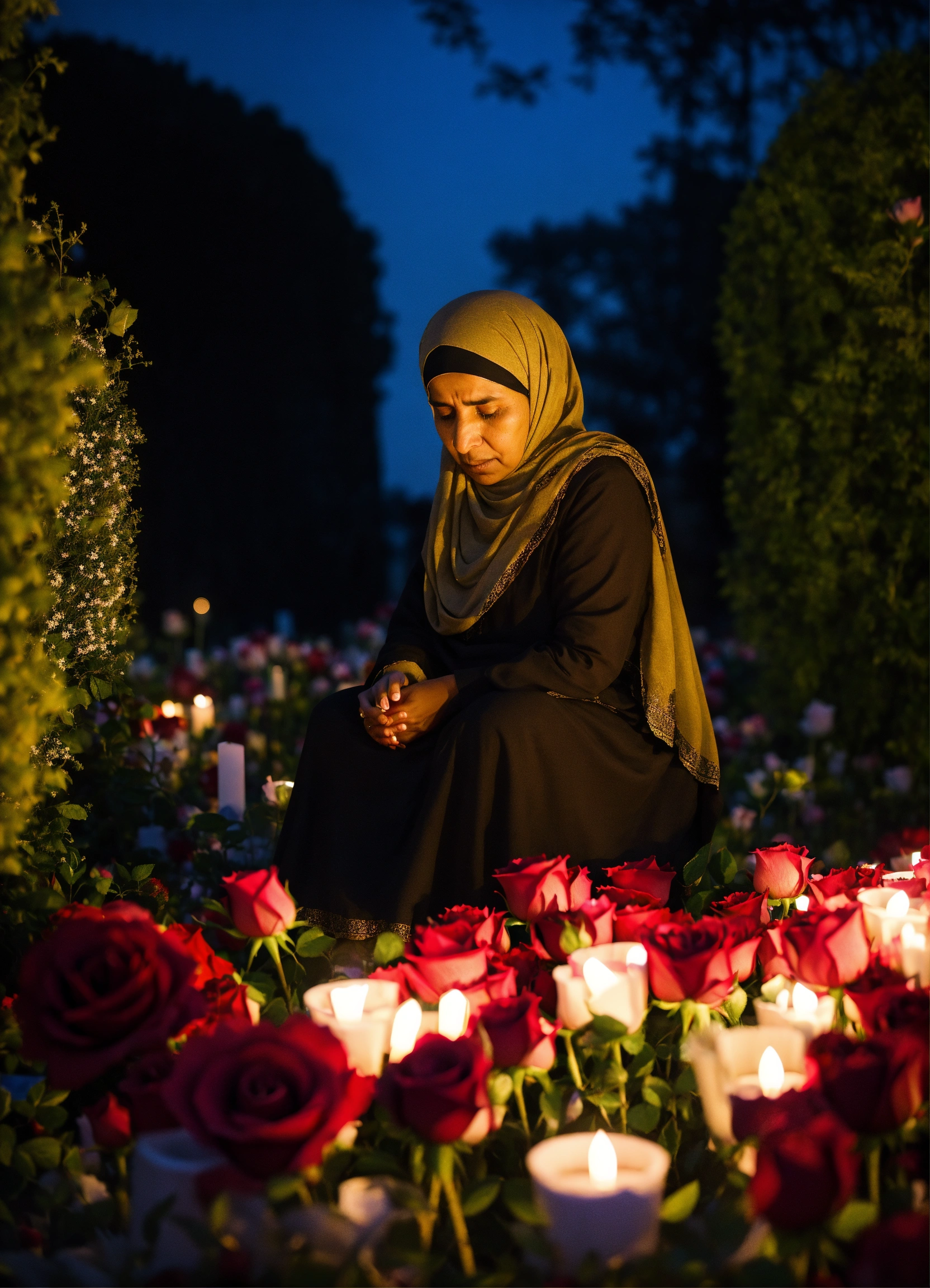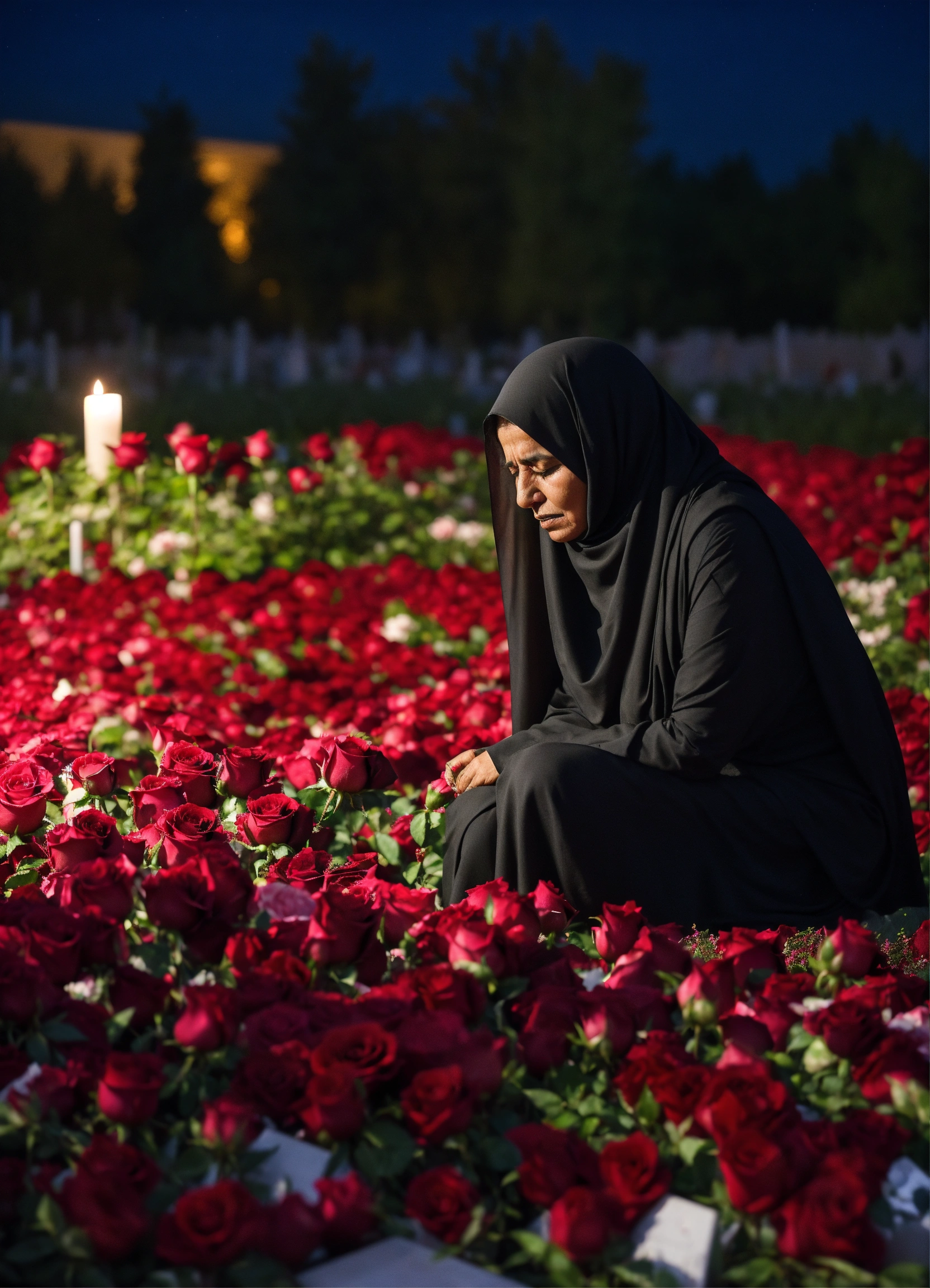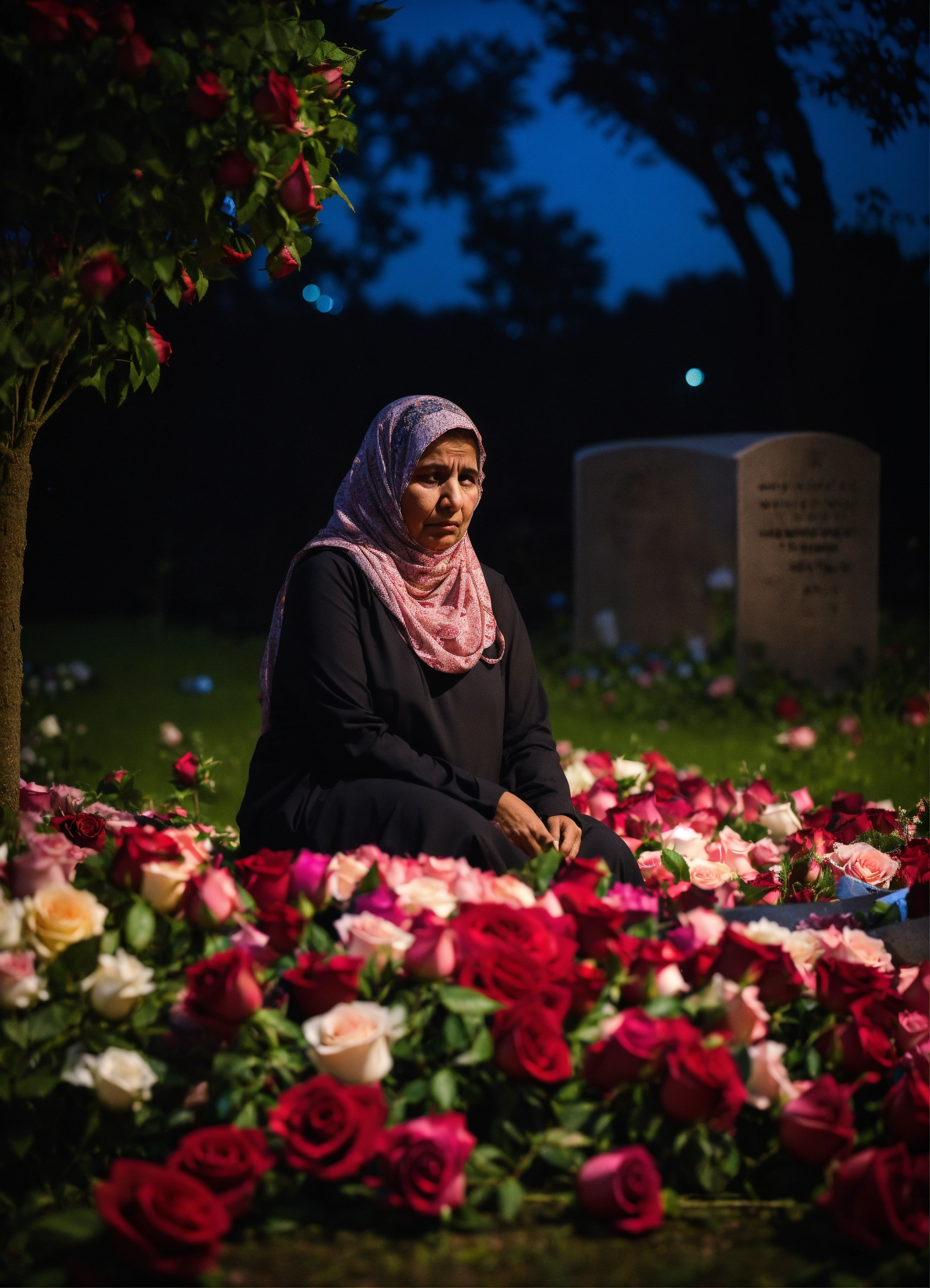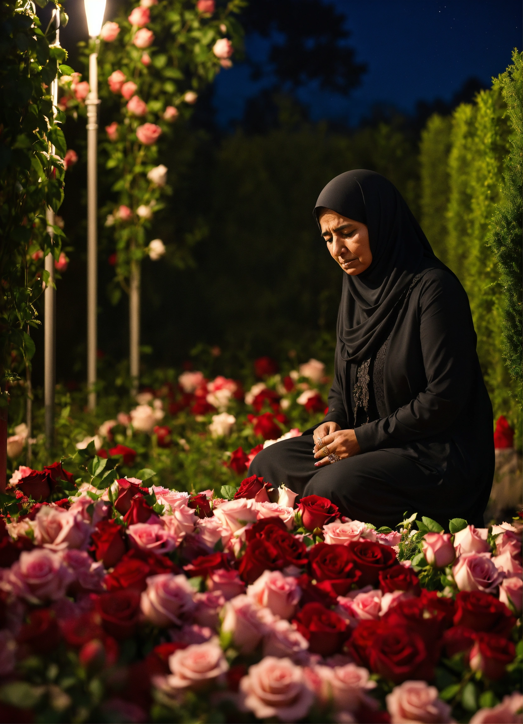 A heartbroken muslim aged mother visits her daughter's burial ground, surrounded by roses late at night.