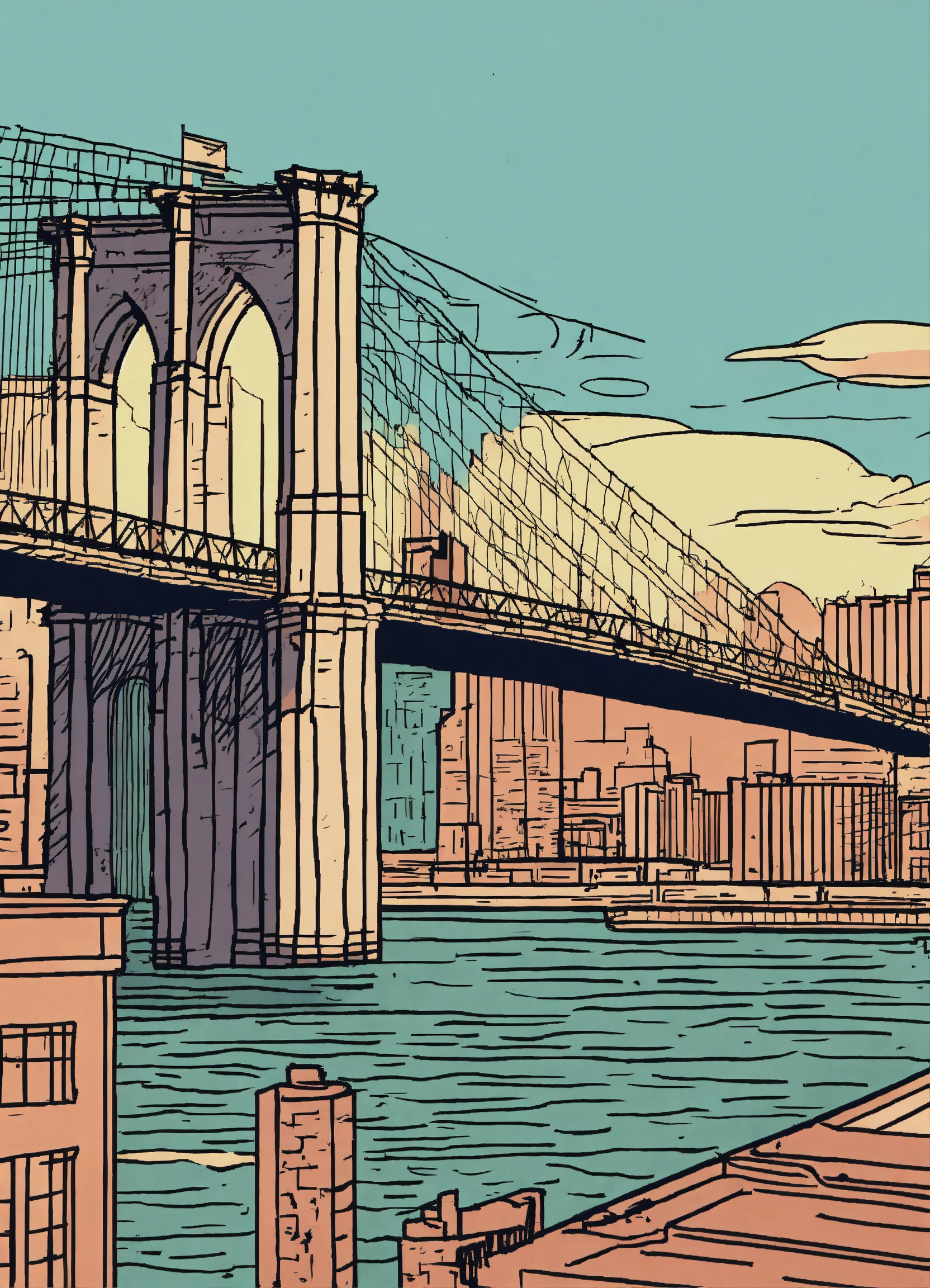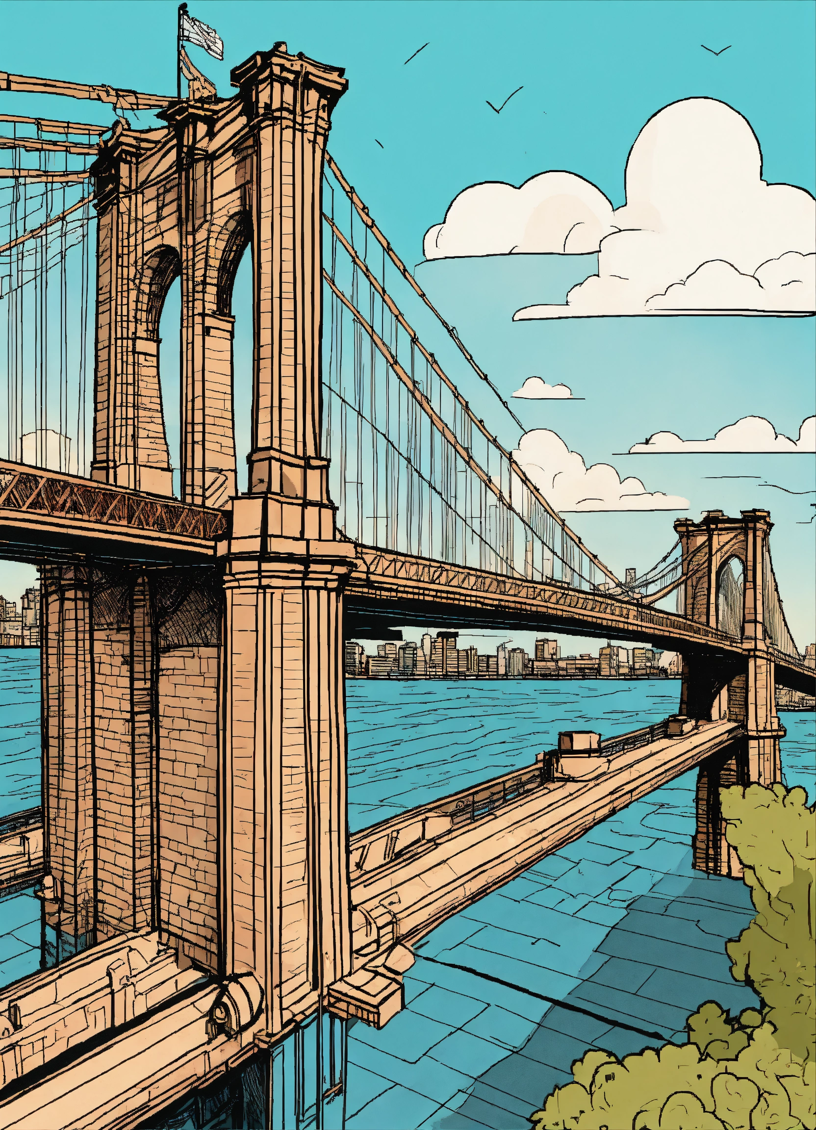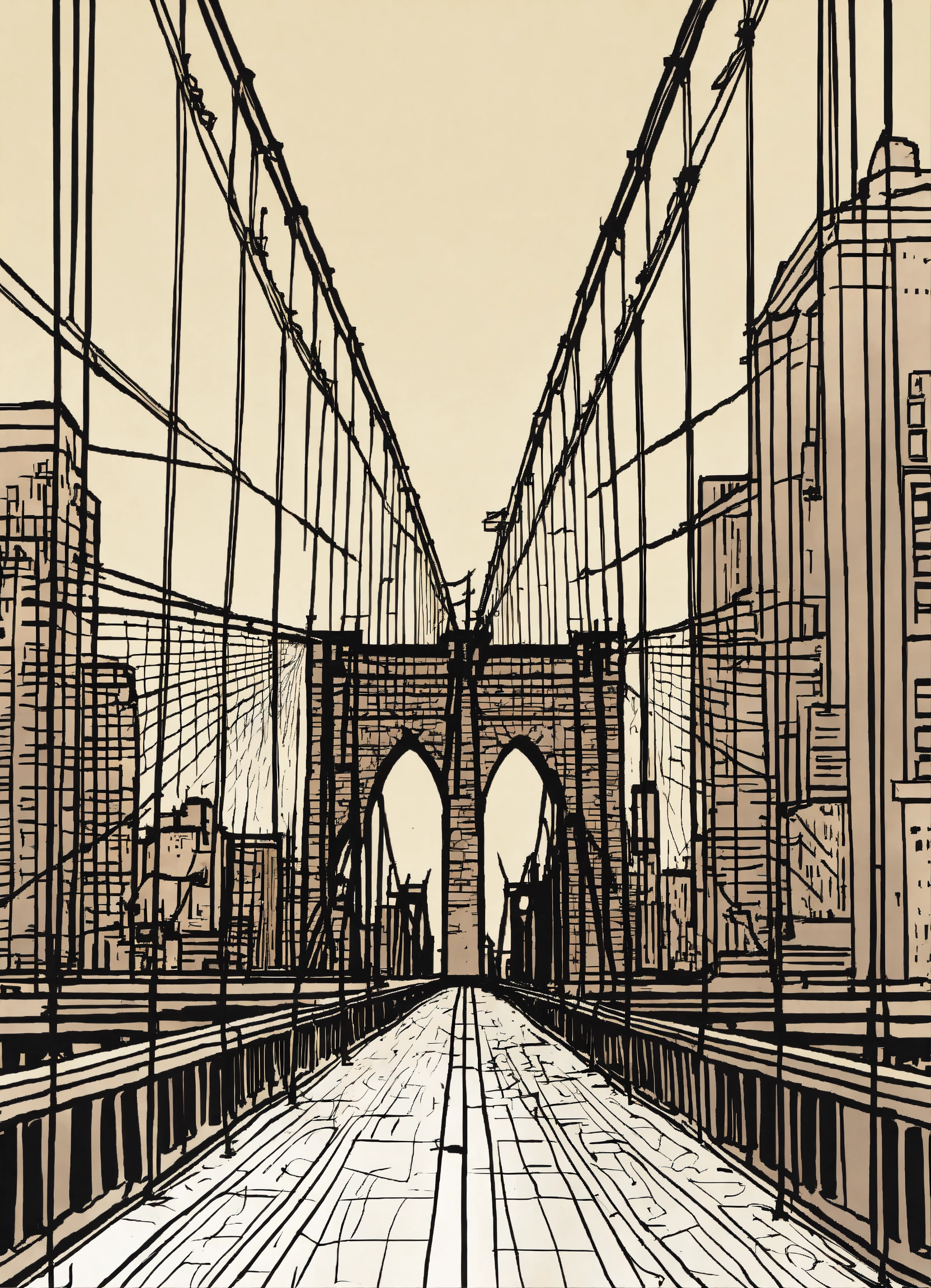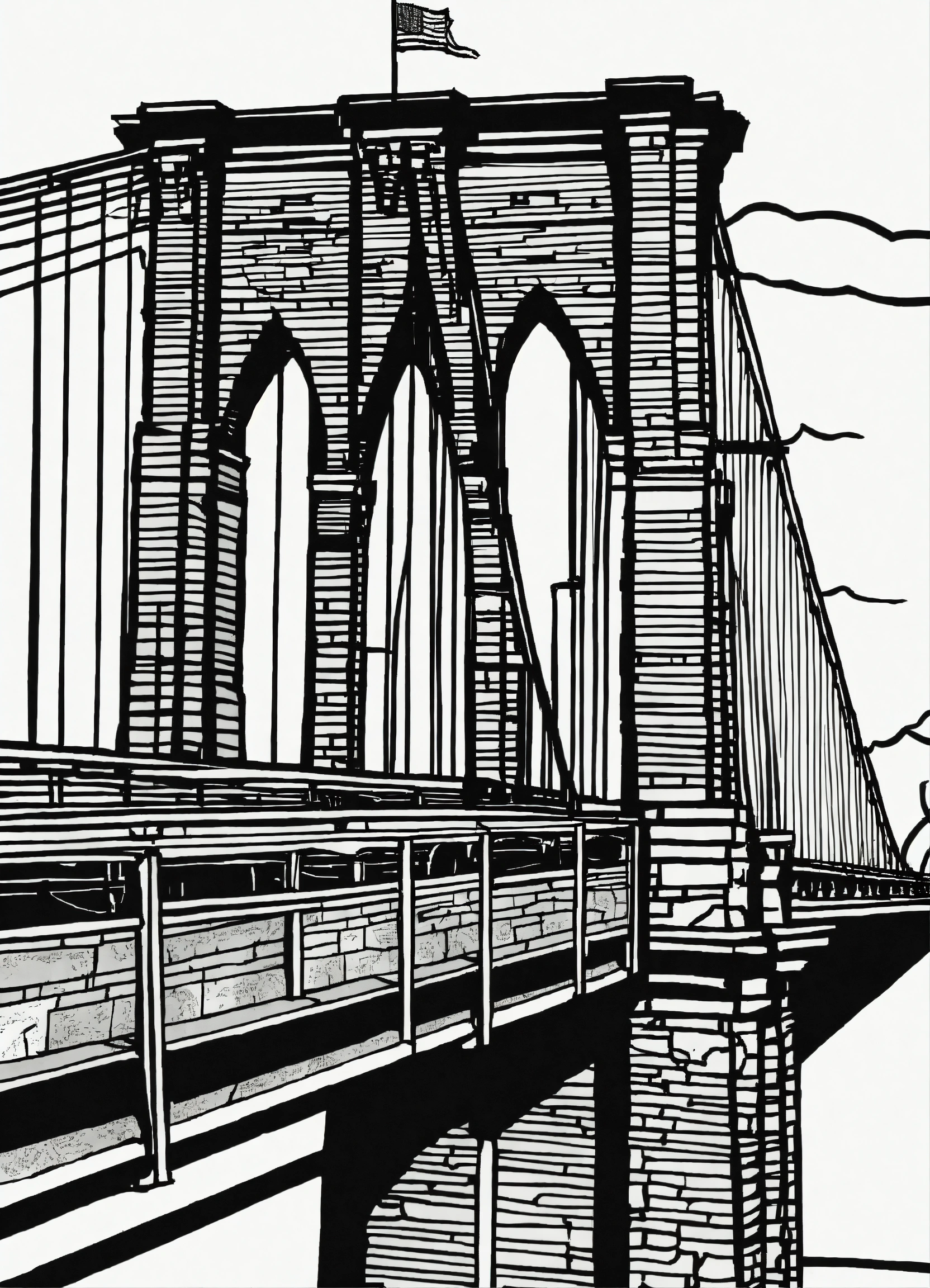 A 2d cartoon line art drawing of the brooklyn bridge from the side