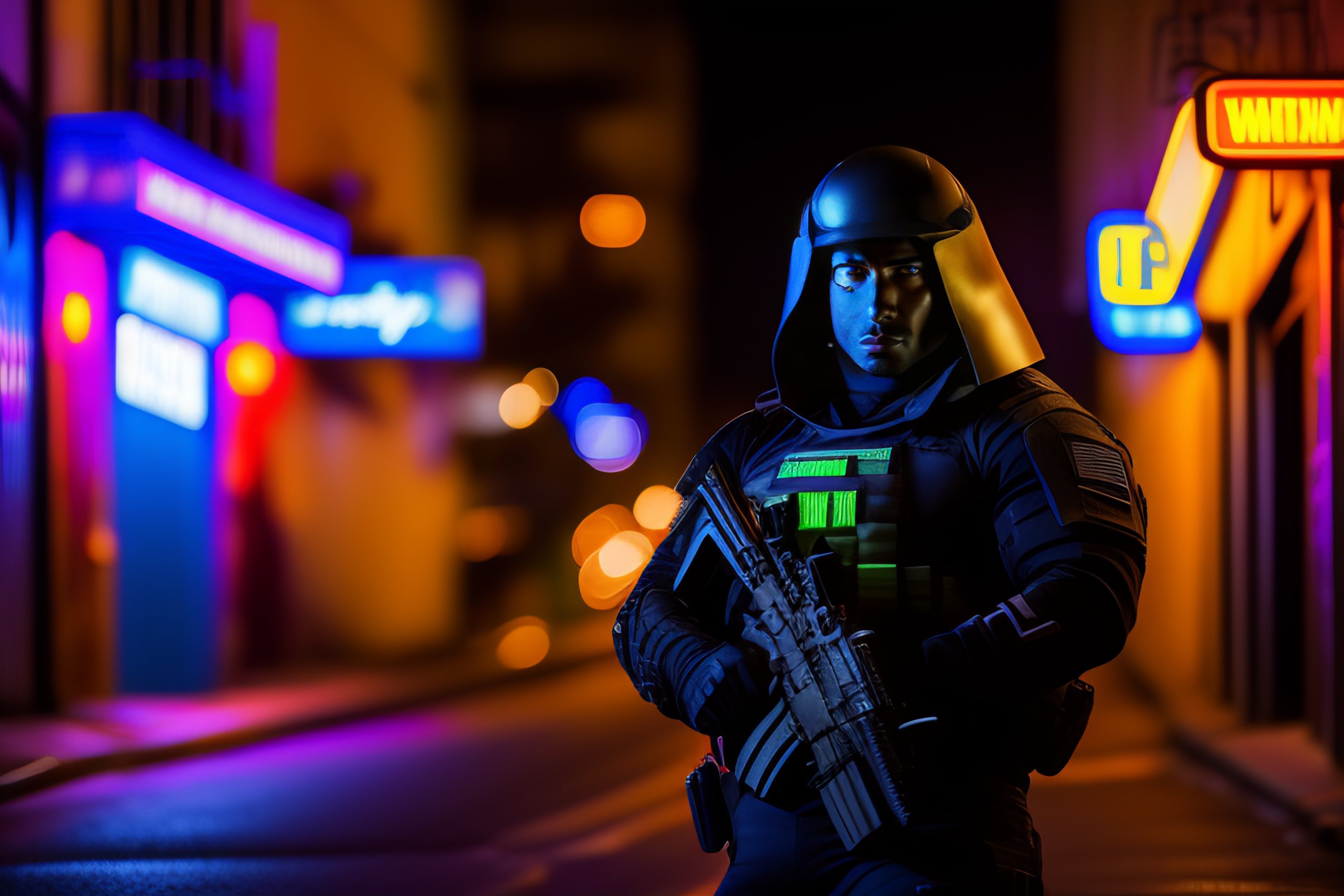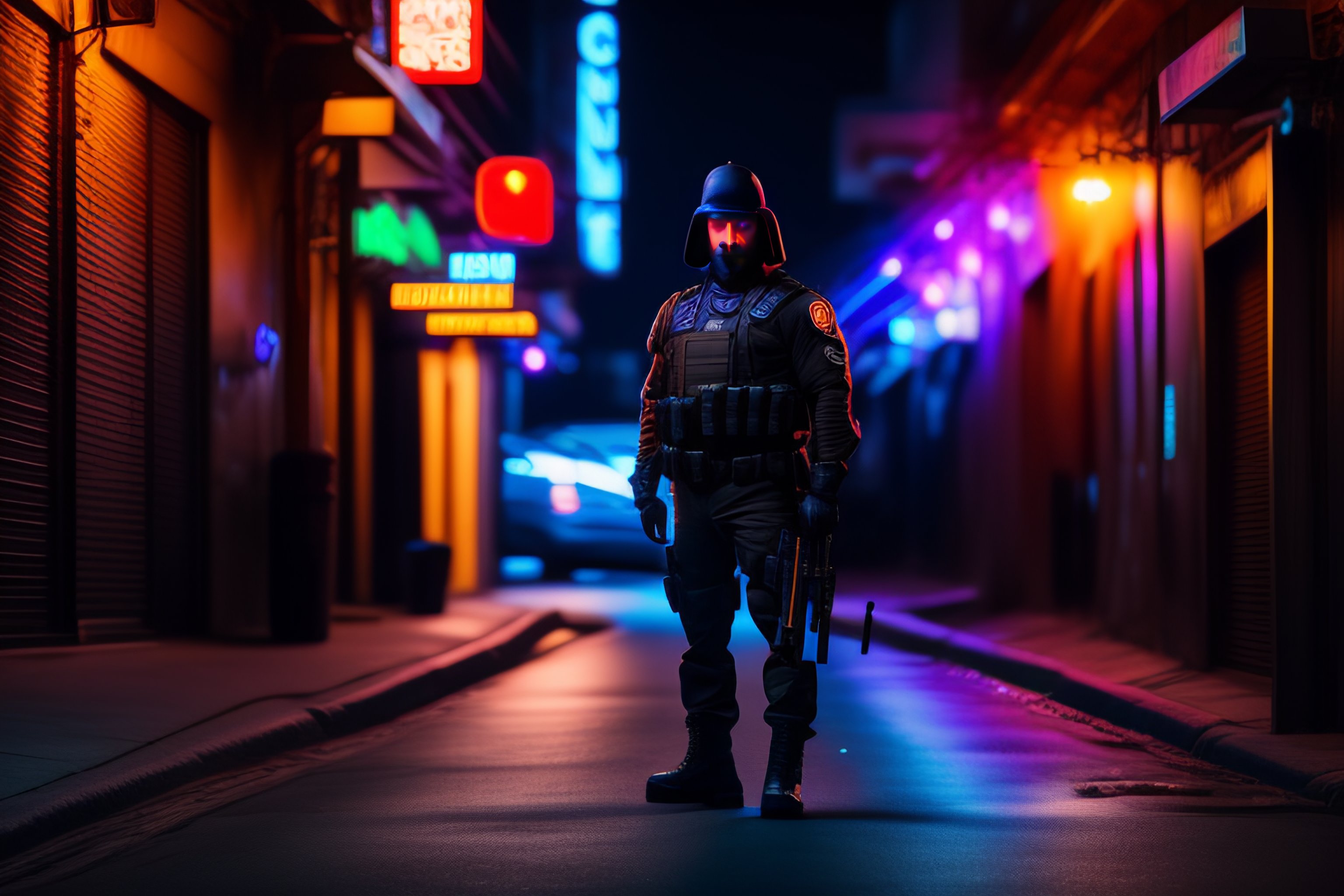 Manly dog humanoid in black swat suit holding a gun in an attractive manner under neon lights alleyway